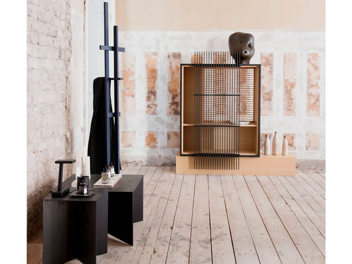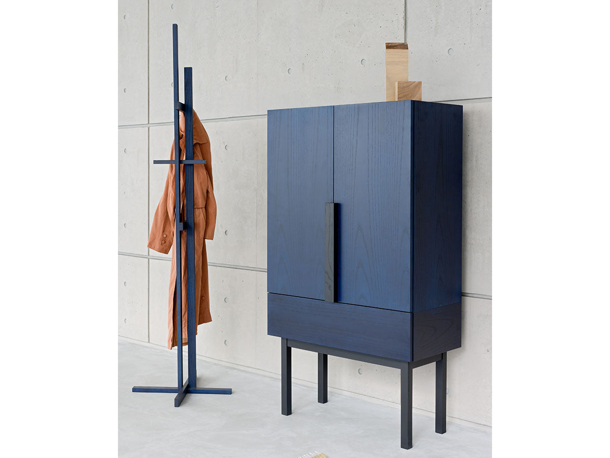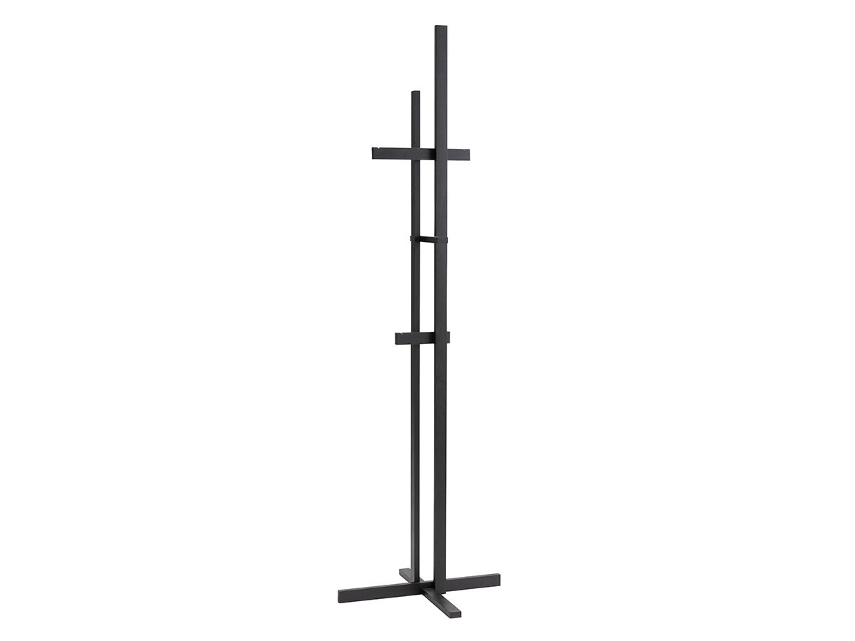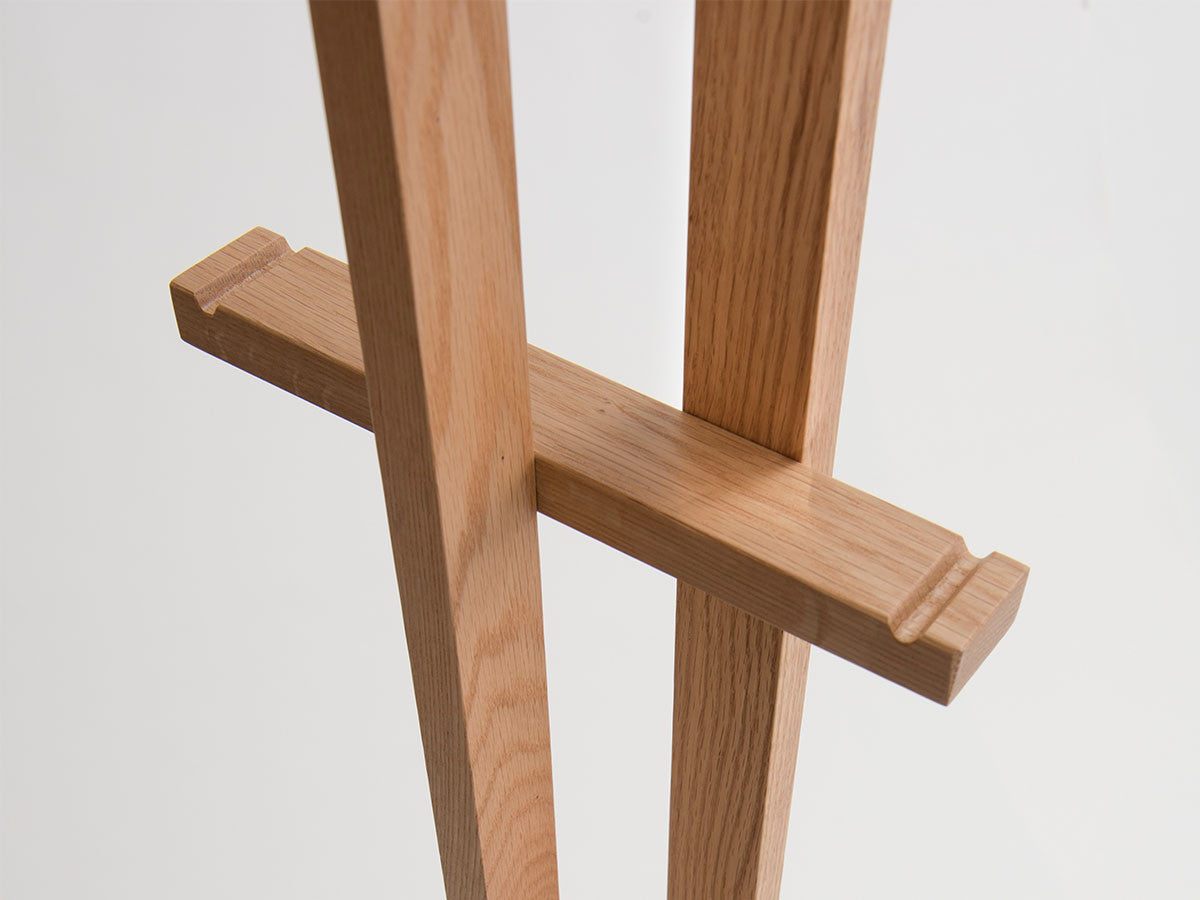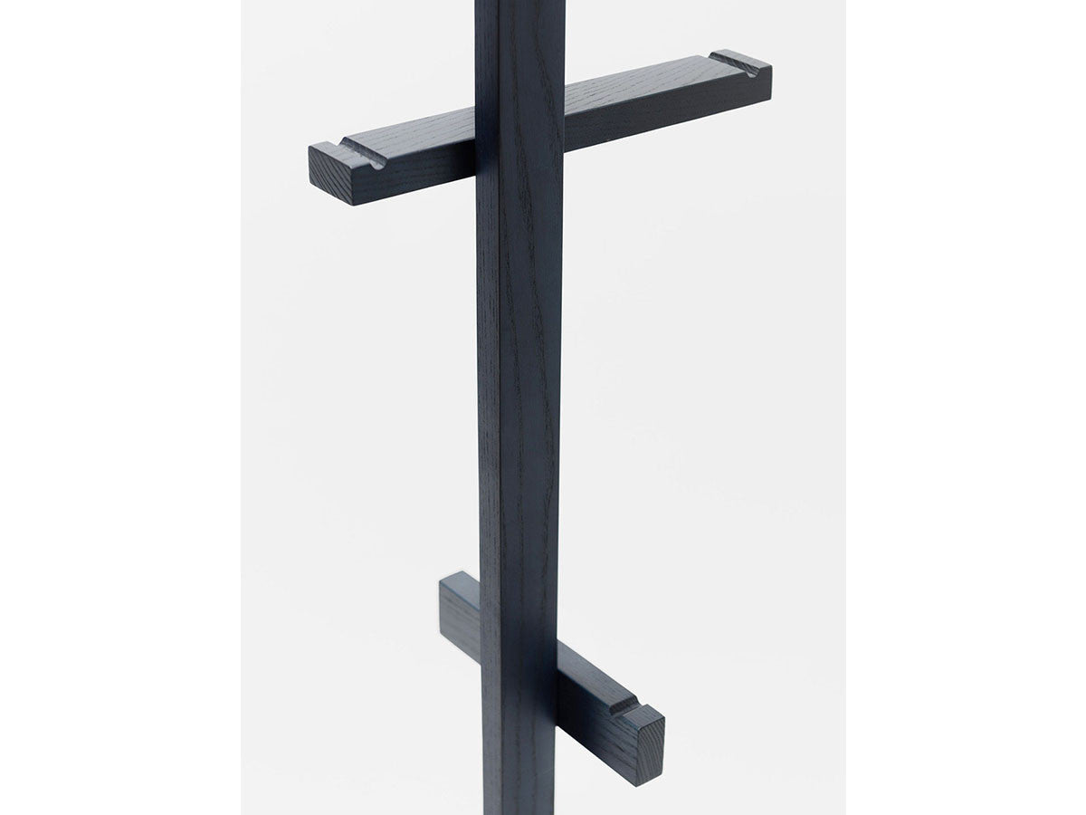 このコートスタンドは、機能的な彫刻としてデザインされました。木の構成部品は全て同じ材料で長さのみを変化させていますが、方向・場所・角度を変えて不均一に組み上げることにより、視点によって様々な表情を見せるデザインとなっています。また意図的に表裏面のある構成は、壁面傍に配置されることを意識し「よく使う側」と「そうでもない側」の違いを反映しています。This coat stand is a functional sculpture in a house. The construction elements are made of one type of timber in different lengths. As they are jointed together in different places with various angles and directions, the object changes its character according to the side where it is looked at. The design has the face side which hangs more clothes and the back side with less hanging space which is designed to be facing the wall.
