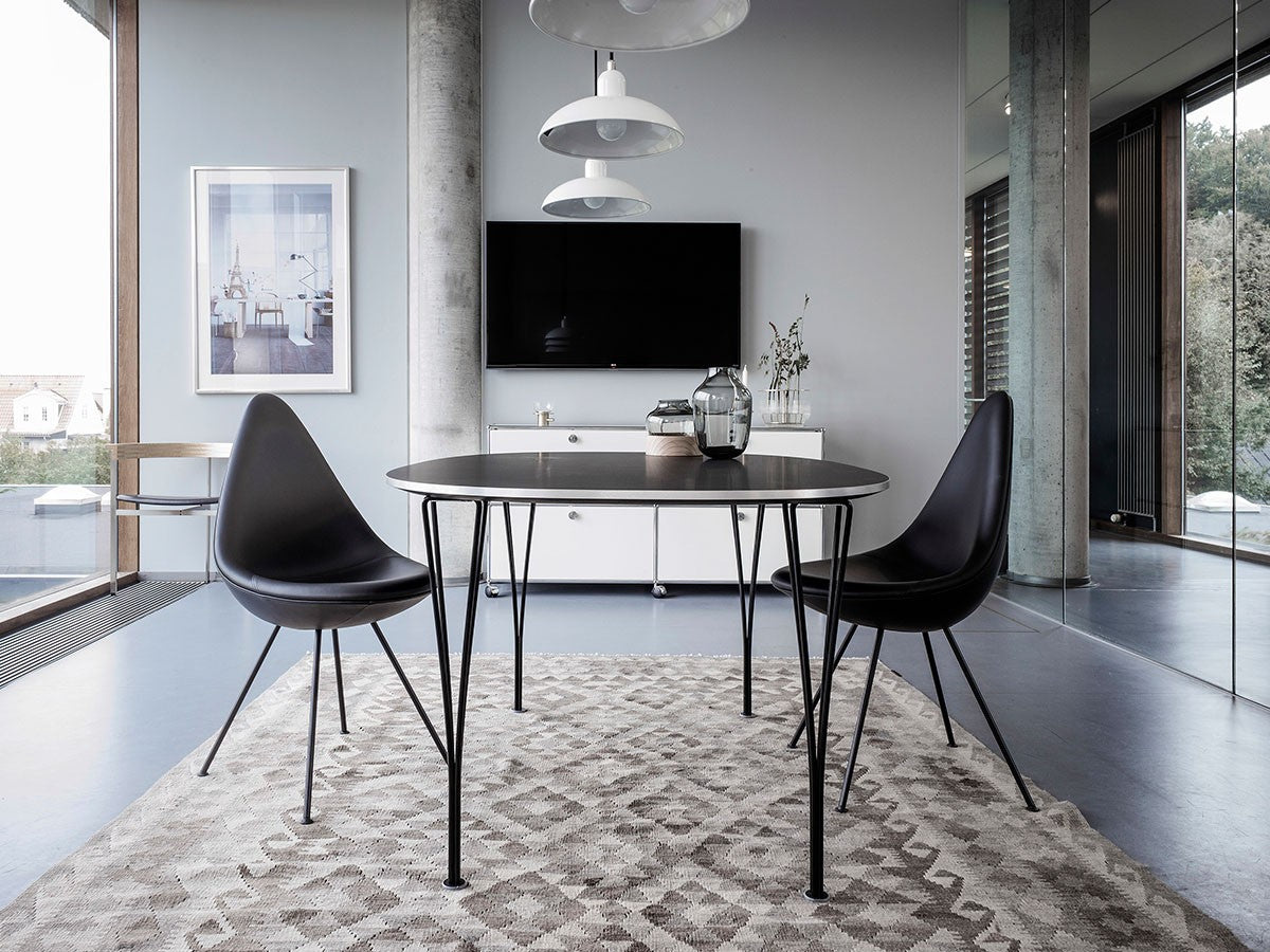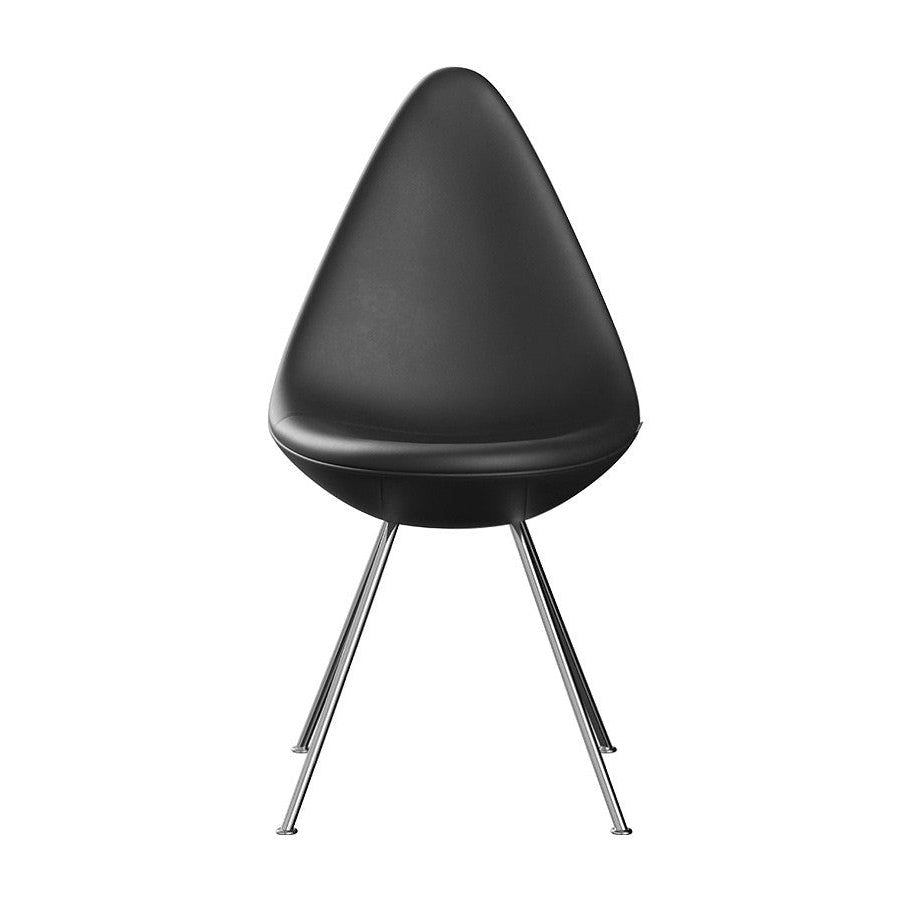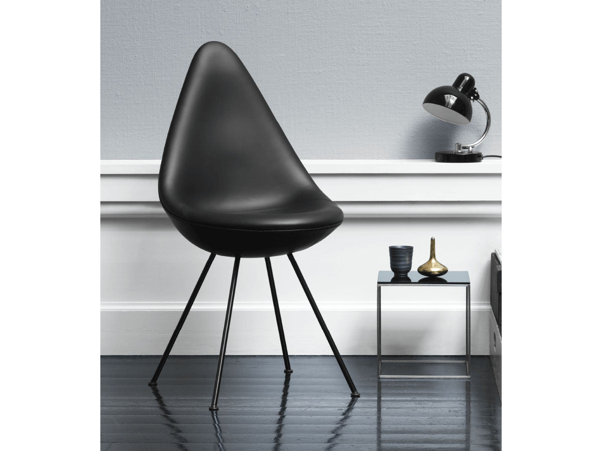 ドロップは大きな個性を持つ小さなチェアです。フルパディング仕様のドロップは様々な空間に溶け込み、優れたデザインの家具はその存在感と美しさで空間自体に影響を及ぼすことを示しています。アルネ・ヤコブセンは、自身の最高傑作である伝説的なコペンハーゲンのSASロイヤルホテル(現ラディソン・ブル・ロイヤルホテル)の一部として、ドロップチェアをデザインしました。スワンチェアやエッグチェアと共に製造されたものの、同ホテルのためだけにデザインされたドロップの製造数は限られたものでした。50年を超える時の眠りから目覚め、ドロップは2014年に再登場を果たしました。美しい背もたれを持つ丸みを帯びたこの椅子は、アルネ・ヤコブセン自身のお気に入りの作品でした。ブラックレザードロップは、ブラックのエッセンシャルレザーと、クローム仕上げまたは粉体塗装仕上げのスチール製レッグを組み合わせています。ダブルパイピングにより仕上げられています。
