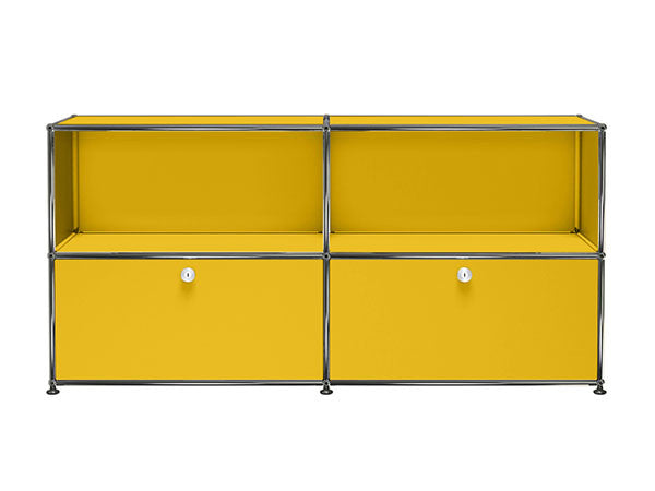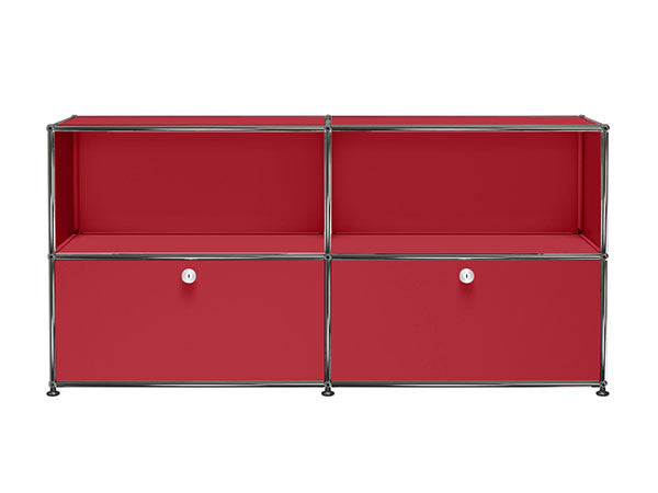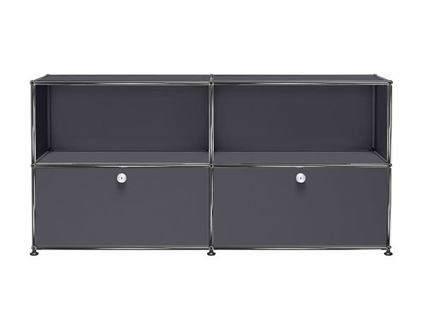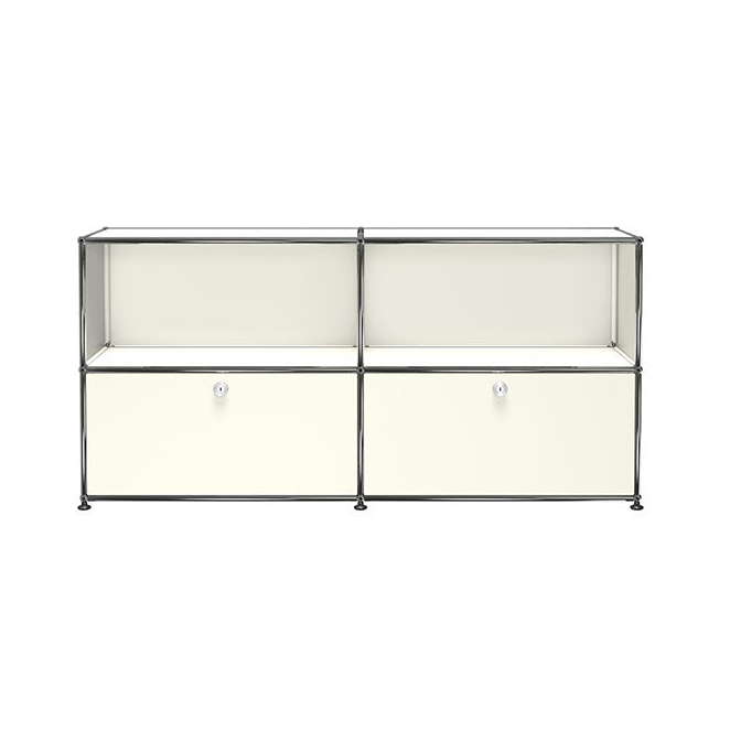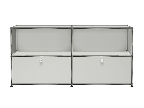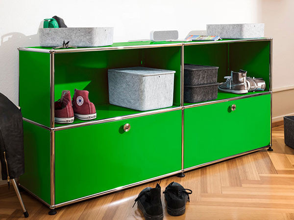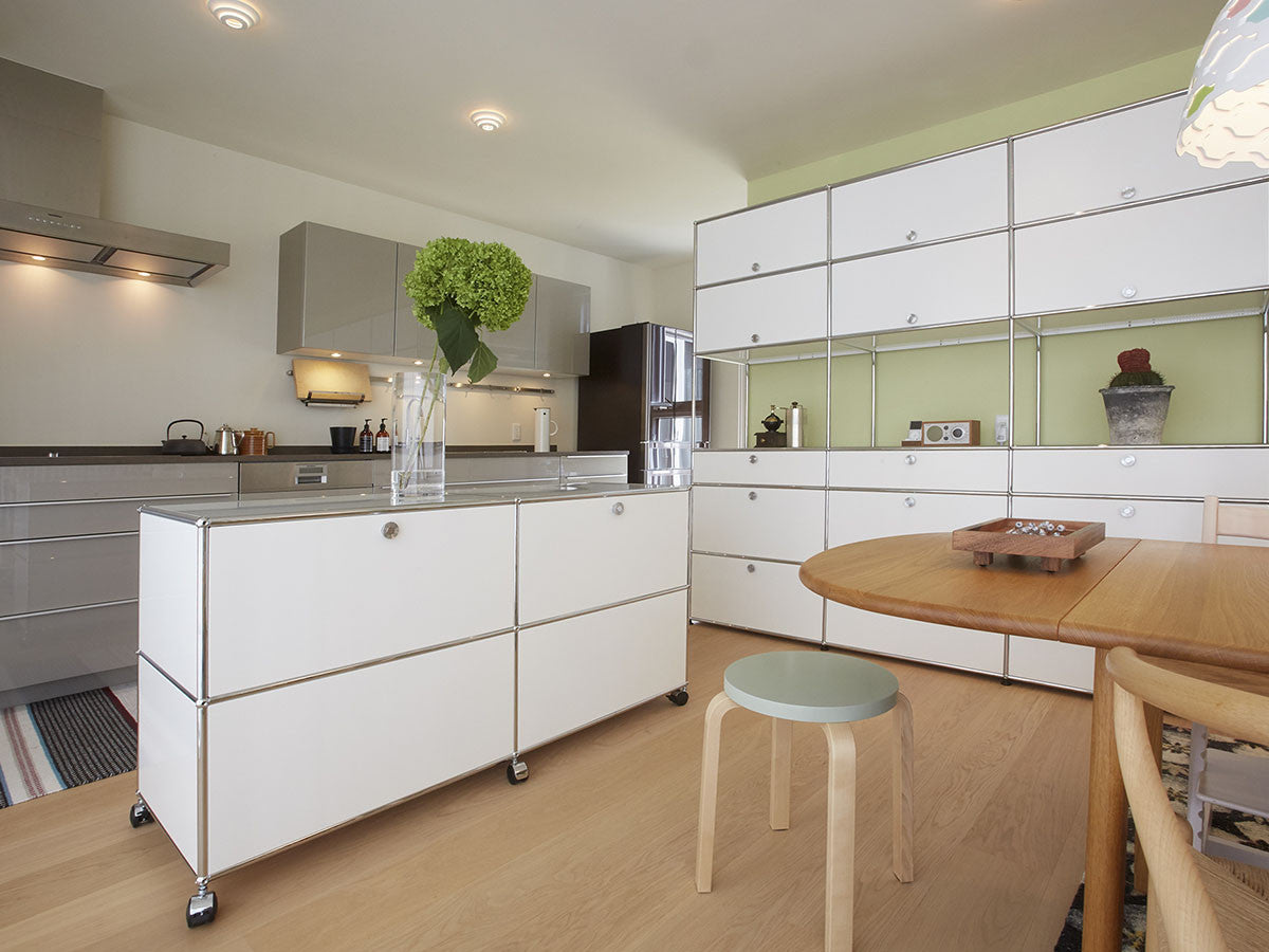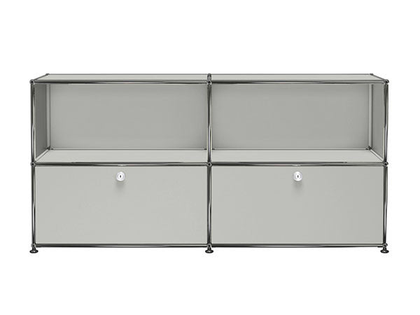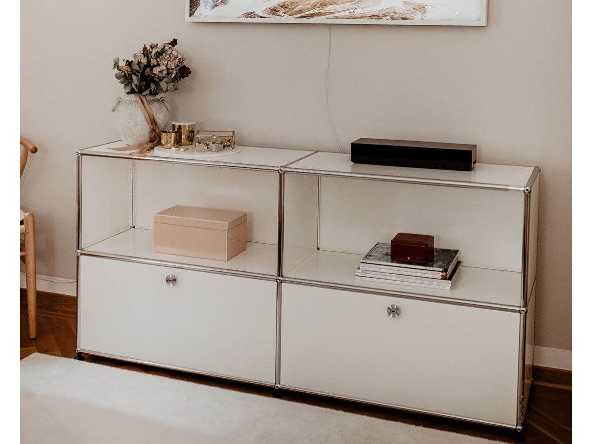 オープンとクローズド、2タイプの収納をバランス良く備えた使い勝手の良いサイドボードです。上段のオープン棚は、収納を兼ねたディスプレイスペースとしたり、強度があるため本棚としても活用できます。下段の扉は下方向に開き、扉を閉めると生活感を隠してすっきりとした印象でお使いいただけます。収納スペース一枠に、A4ファイルなら横に3つ並べて置くことができ、立てた状態でも収納可能。市販のボックスを併用した小物収納も便利です。リビングからワークスペース、子供部屋、さらにはオフィスやクリニックまで、あらゆる空間で、様々な用途の収納に対応します。USMモジュラーファニチャーは、リビングルームやオフィスを機能美あふれる空間に仕立てるオーダーメイドのシステムファニチャーです。時代と共に変化するユーザーのニーズにも対応できるシンプルかつ柔軟なデザインは普及のデザインとして認められ、2001年にニューヨーク近代美術館の永久コレクションとなりました。販売から50年を経過した今では、世界40か国以上で愛用されています。パネルには裏表がないため、360度どの角度から見ても美しく、壁面に寄せて設置するだけでなく自由な配置が可能なため、空間の仕切りとしての役割も果たします。家族構成や生活スタイルの変化、オフィスのレイアウト変更など、その時々のニーズに合わせて、設置場所を変更するだけでなく、新たなモジュールとの組み換えも可能。多目的かつタイムレスにお使いいただけます。