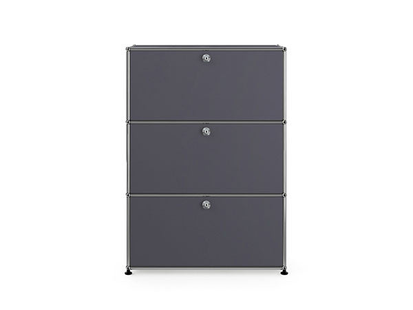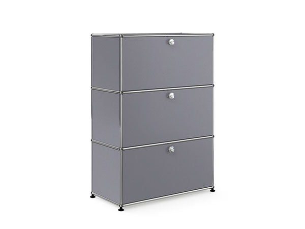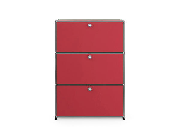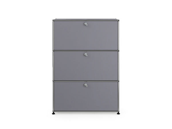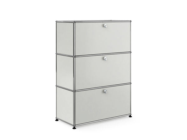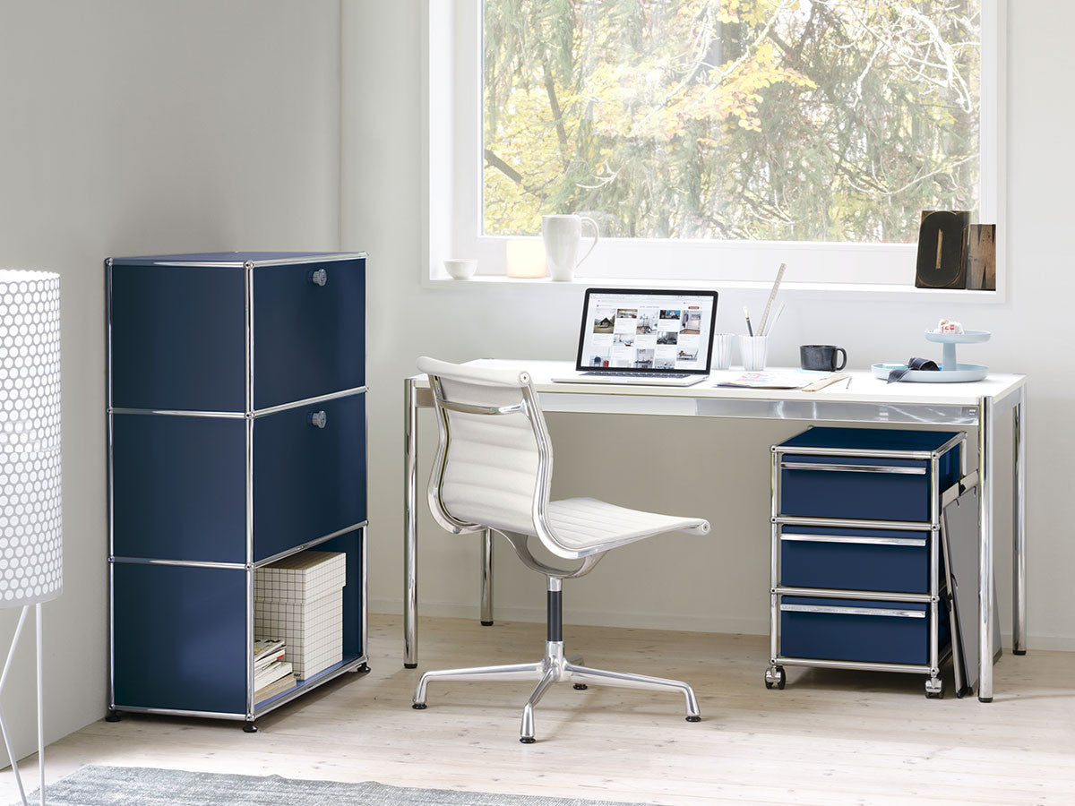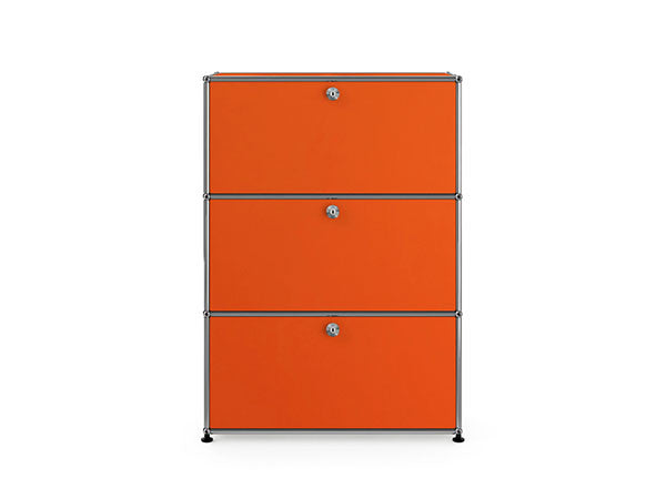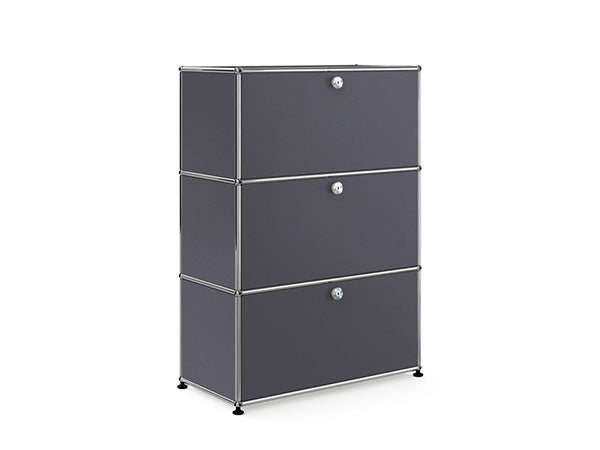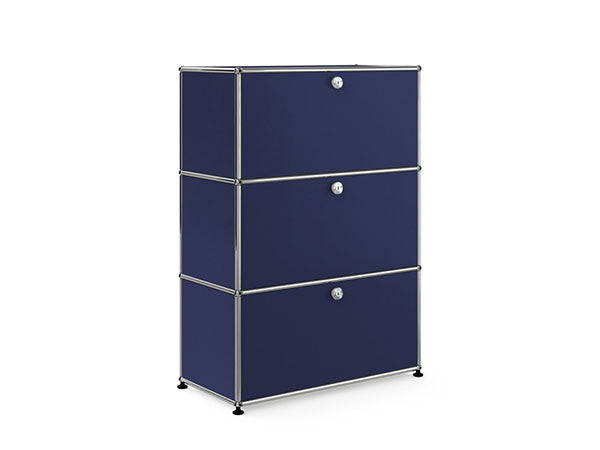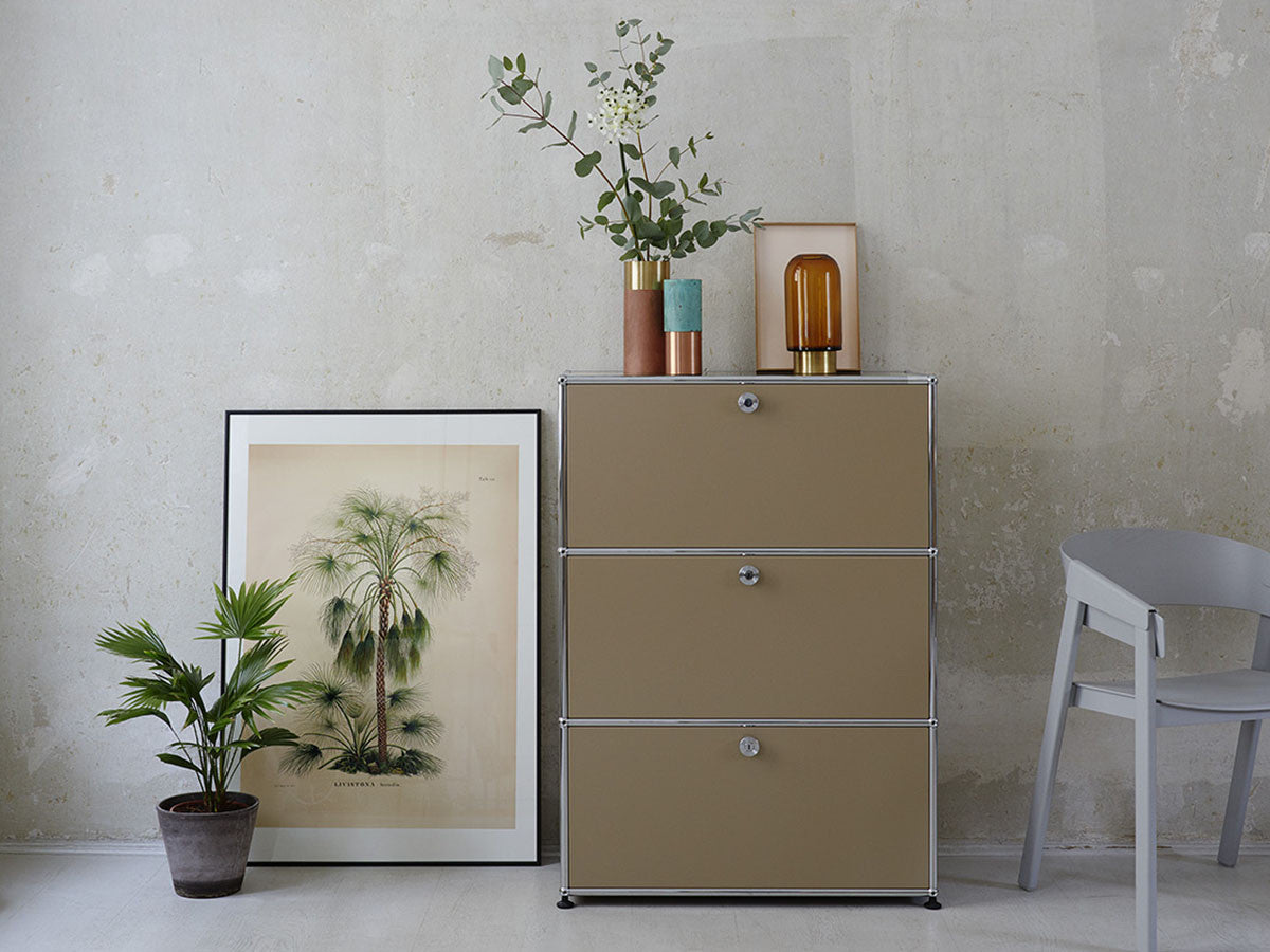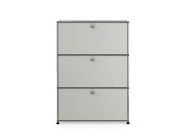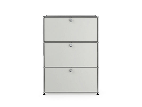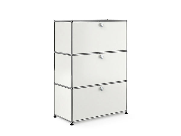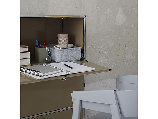 リビングからワークスペース、子供部屋、さらにはオフィスやクリニックまで、あらゆる空間で様々な用途にお使いいただける多目的キャビネット。上段と中段は下方向に開くドロップダウン扉。上段のドアを開いた状態で椅子を合わせれば、簡易デスクとしても使うことができます。上・中段それぞれにA4ファイルなら横に3つ並べて置くことができ、立てた状態でも収納可能。市販のボックスを併用した小物収納も便利です。扉を閉めると生活感を隠してすっきりとした印象でお使いいただけます。最下段は引出し収納になっていますので、書籍や書類ファイルなど重量のあるものを収納しても楽に開閉することができます。どこに置いても使い勝手の良い万能キャビネットです。USMモジュラーファニチャーは、リビングルームやオフィスを機能美あふれる空間に仕立てるオーダーメイドのシステムファニチャーです。時代と共に変化するユーザーのニーズにも対応できるシンプルかつ柔軟なデザインは普及のデザインとして認められ、2001年にニューヨーク近代美術館の永久コレクションとなりました。販売から50年を経過した今では、世界40か国以上で愛用されています。パネルには裏表がないため、360度どの角度から見ても美しく、壁面に寄せて設置するだけでなく自由な配置が可能なため、空間の仕切りとしての役割も果たします。家族構成や生活スタイルの変化、オフィスのレイアウト変更など、その時々のニーズに合わせて、設置場所を変更するだけでなく、新たなモジュールとの組み換えも可能。多目的かつタイムレスにお使いいただけます。