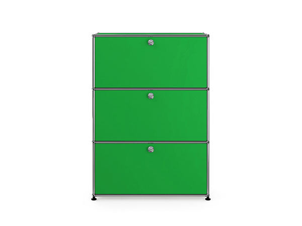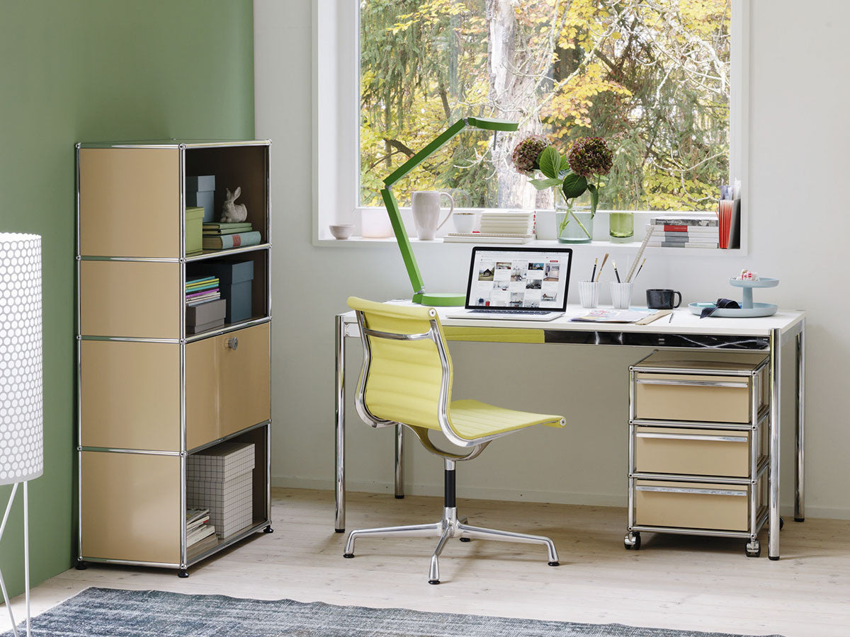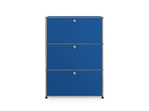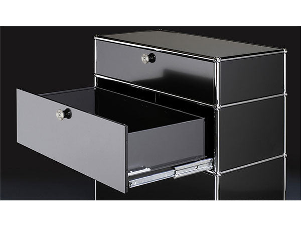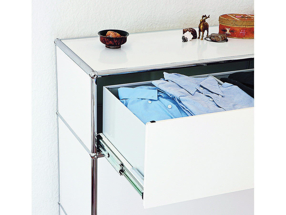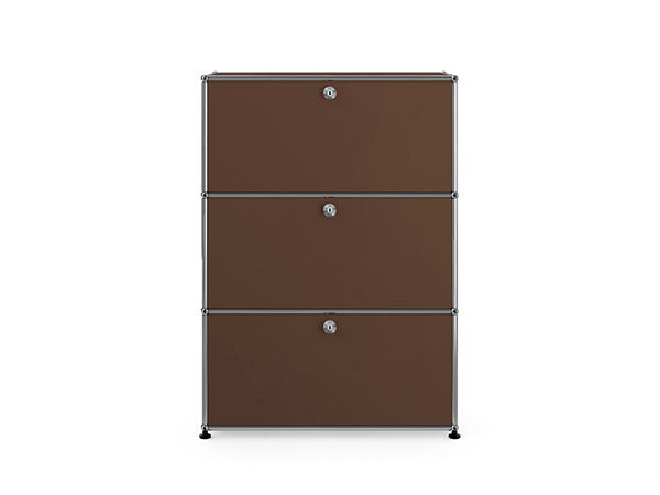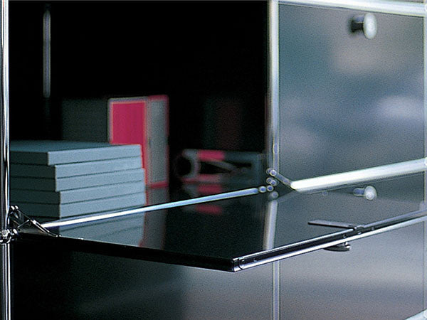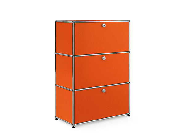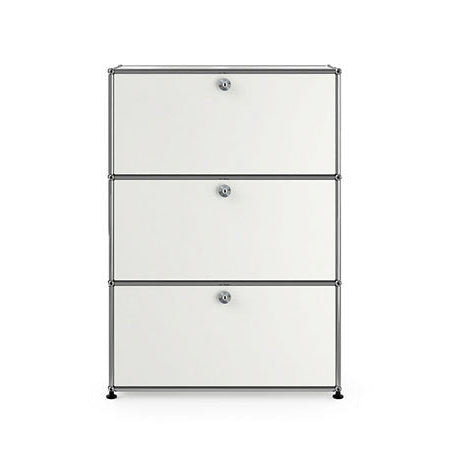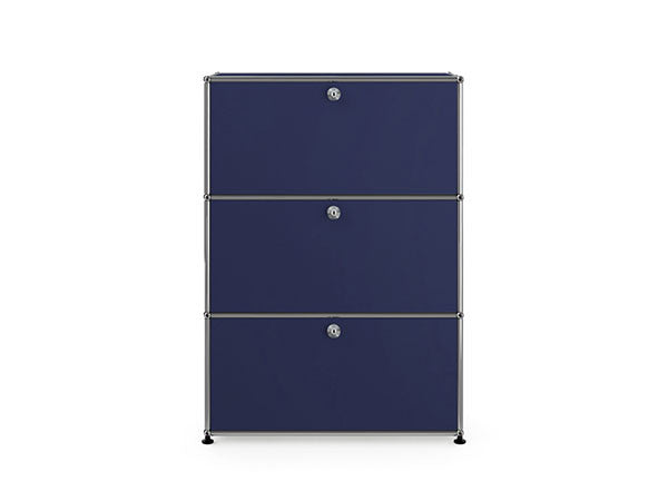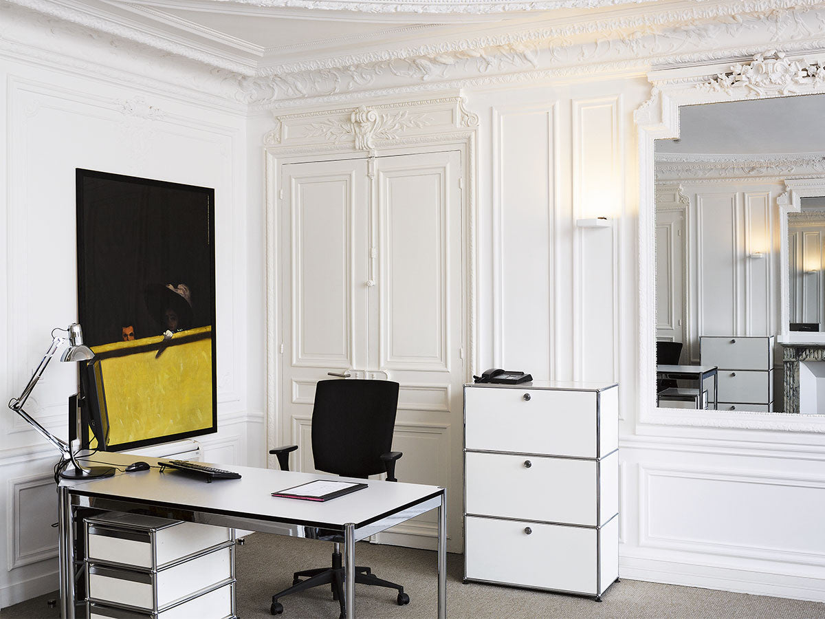 リビングからワークスペース、子供部屋、さらにはオフィスやクリニックまで、あらゆる空間で様々な用途にお使いいただける多目的キャビネット。上段と中段は下方向に開くドロップダウン扉。上段のドアを開いた状態で椅子を合わせれば、簡易デスクとしても使うことができます。上・中段それぞれにA4ファイルなら横に3つ並べて置くことができ、立てた状態でも収納可能。市販のボックスを併用した小物収納も便利です。扉を閉めると生活感を隠してすっきりとした印象でお使いいただけます。最下段は引出し収納になっていますので、書籍や書類ファイルなど重量のあるものを収納しても楽に開閉することができます。どこに置いても使い勝手の良い万能キャビネットです。USMモジュラーファニチャーは、リビングルームやオフィスを機能美あふれる空間に仕立てるオーダーメイドのシステムファニチャーです。時代と共に変化するユーザーのニーズにも対応できるシンプルかつ柔軟なデザインは普及のデザインとして認められ、2001年にニューヨーク近代美術館の永久コレクションとなりました。販売から50年を経過した今では、世界40か国以上で愛用されています。パネルには裏表がないため、360度どの角度から見ても美しく、壁面に寄せて設置するだけでなく自由な配置が可能なため、空間の仕切りとしての役割も果たします。家族構成や生活スタイルの変化、オフィスのレイアウト変更など、その時々のニーズに合わせて、設置場所を変更するだけでなく、新たなモジュールとの組み換えも可能。多目的かつタイムレスにお使いいただけます。