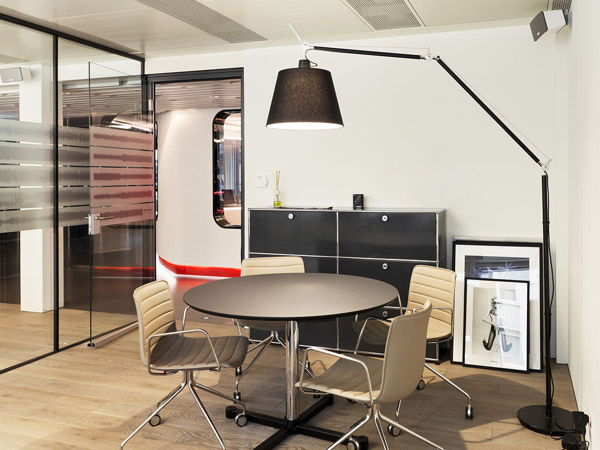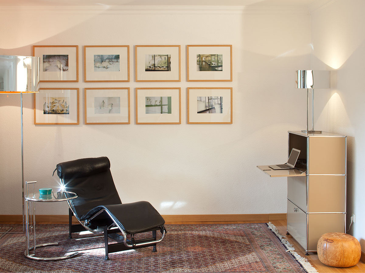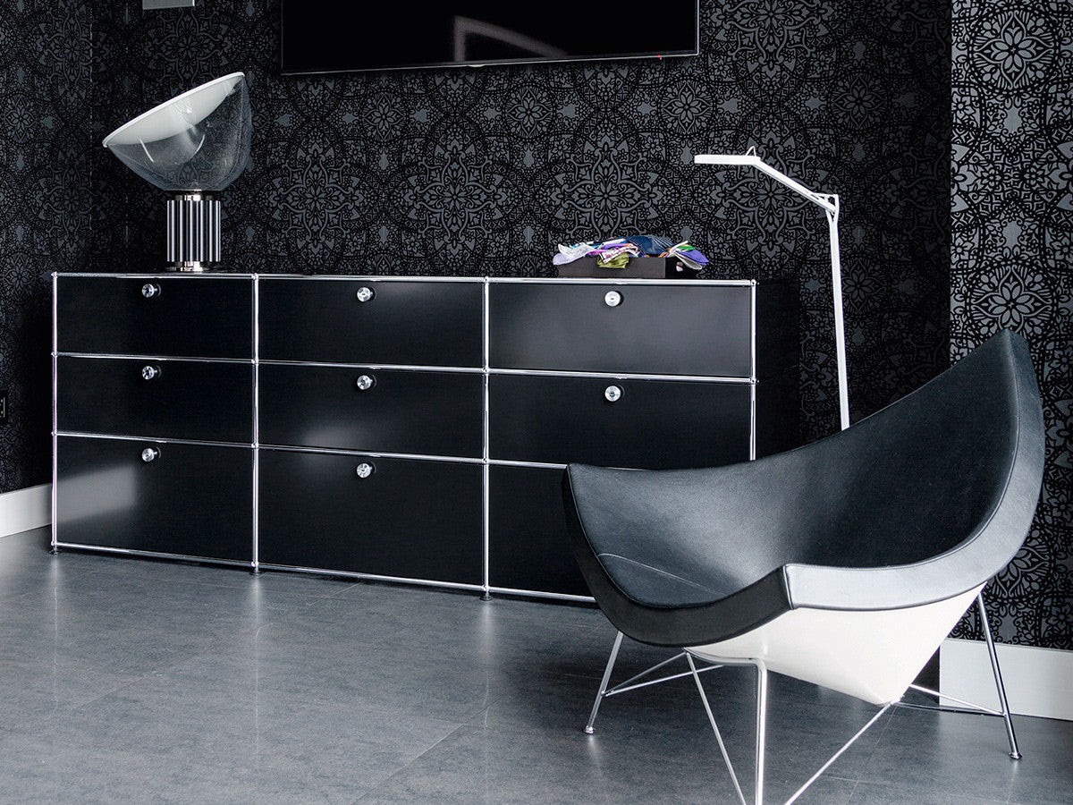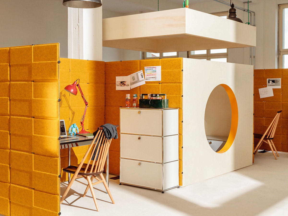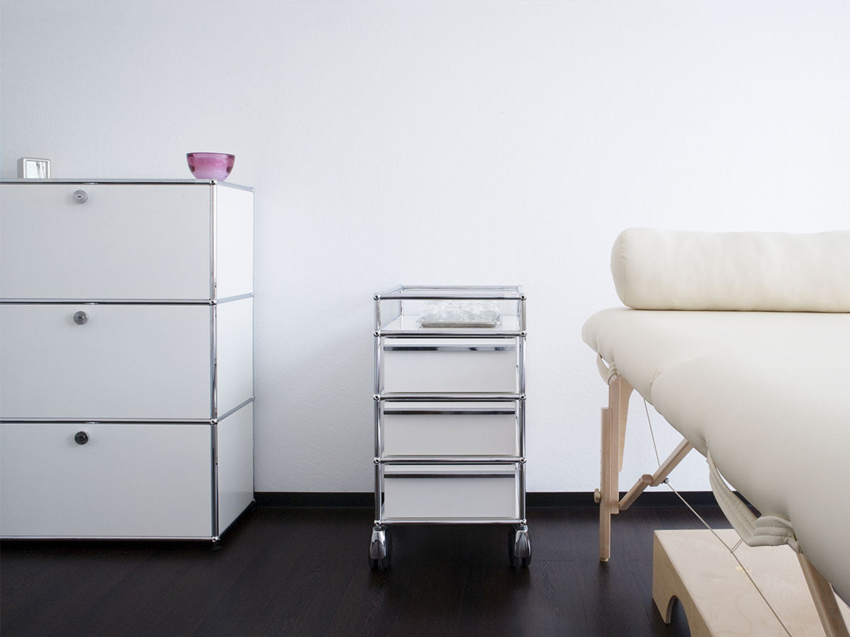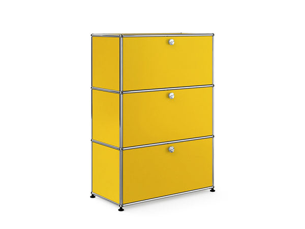リビングからワークスペース、子供部屋、さらにはオフィスやクリニックまで、あらゆる空間で様々な用途にお使いいただける多目的キャビネット。上段と中段は下方向に開くドロップダウン扉。上段のドアを開いた状態で椅子を合わせれば、簡易デスクとしても使うことができます。上・中段それぞれにA4ファイルなら横に3つ並べて置くことができ、立てた状態でも収納可能。市販のボックスを併用した小物収納も便利です。扉を閉めると生活感を隠してすっきりとした印象でお使いいただけます。最下段は引出し収納になっていますので、書籍や書類ファイルなど重量のあるものを収納しても楽に開閉することができます。どこに置いても使い勝手の良い万能キャビネットです。USMモジュラーファニチャーは、リビングルームやオフィスを機能美あふれる空間に仕立てるオーダーメイドのシステムファニチャーです。時代と共に変化するユーザーのニーズにも対応できるシンプルかつ柔軟なデザインは普及のデザインとして認められ、2001年にニューヨーク近代美術館の永久コレクションとなりました。販売から50年を経過した今では、世界40か国以上で愛用されています。パネルには裏表がないため、360度どの角度から見ても美しく、壁面に寄せて設置するだけでなく自由な配置が可能なため、空間の仕切りとしての役割も果たします。家族構成や生活スタイルの変化、オフィスのレイアウト変更など、その時々のニーズに合わせて、設置場所を変更するだけでなく、新たなモジュールとの組み換えも可能。多目的かつタイムレスにお使いいただけます。