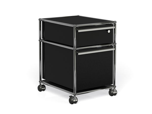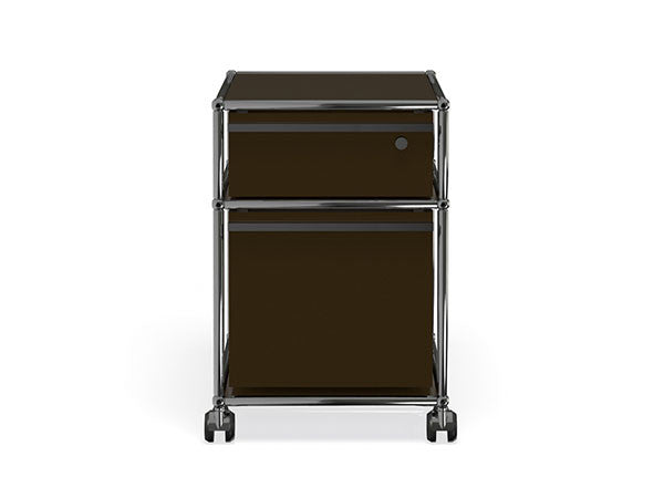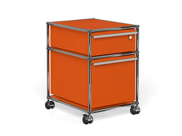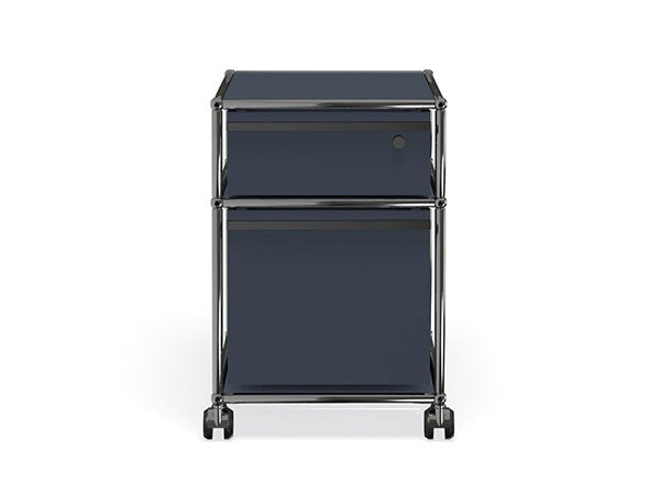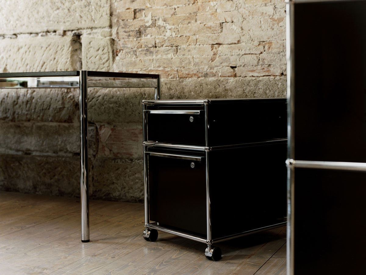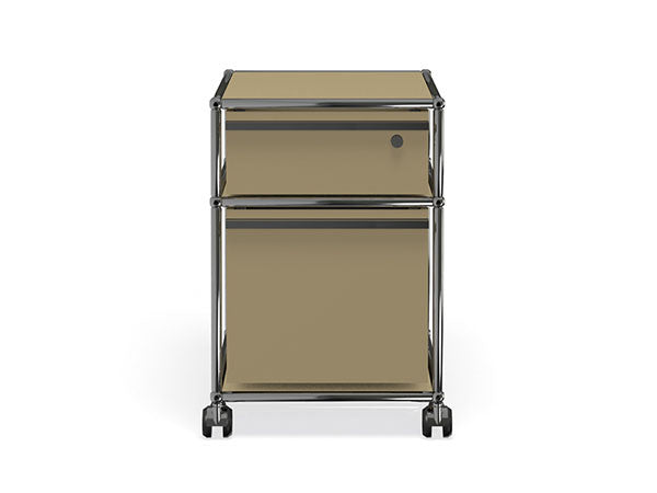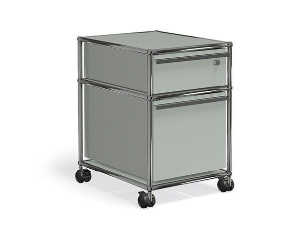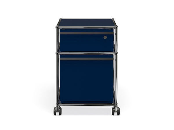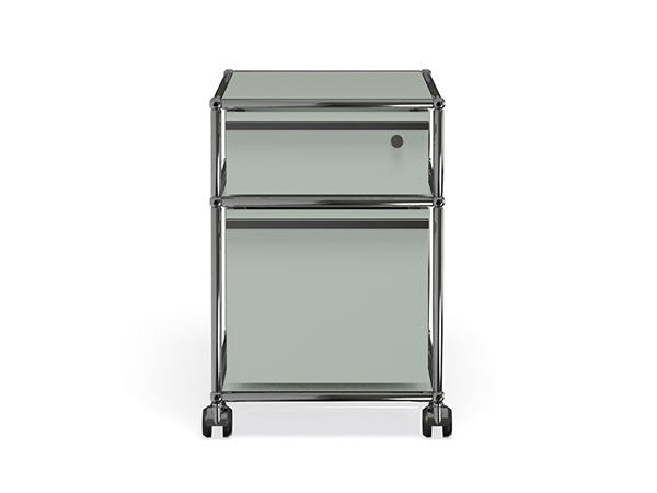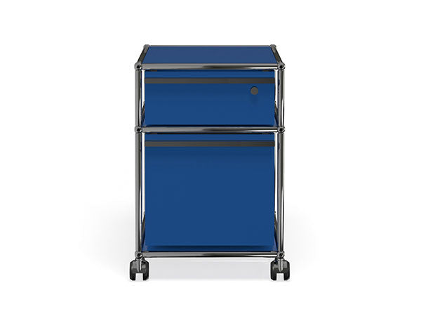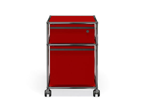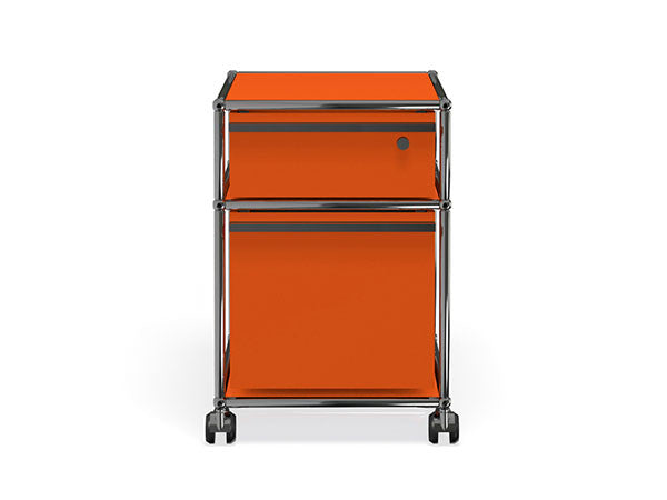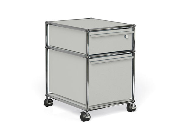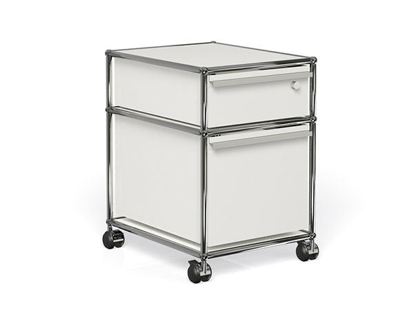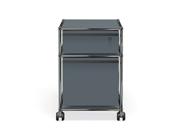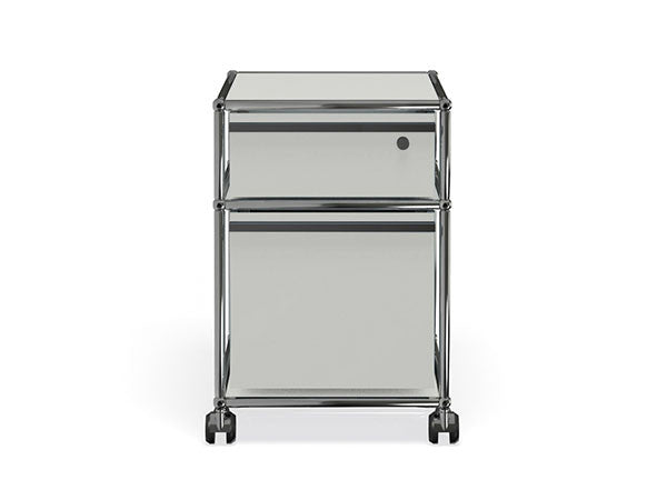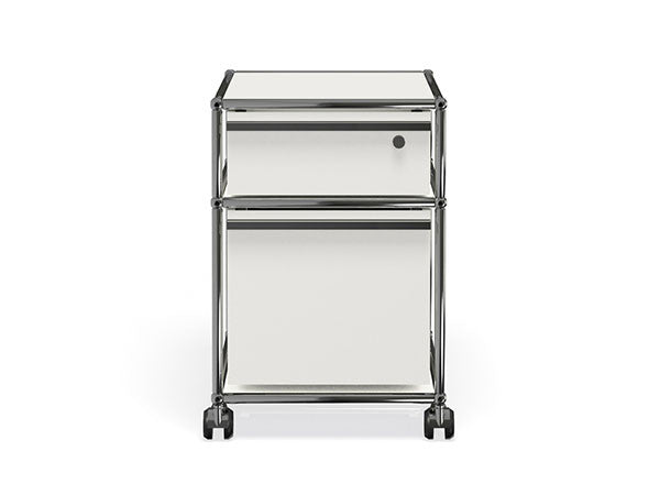 キャスター付きの2段ワゴン。デスク横に一台置くだけで、ワークスペースを機能的にするアイテムです。上段にはステーショナリーや小物類を整理して収納できる便利なトレーが付属します。下段はA4ファイルを横向きで収めることができ、ご自宅の書類収納庫としても便利です。ご自宅からオフィス空間、あるいはクリニックなどのバックオフィスまで、あらゆるワークスペースで活躍します。本商品は上段のみ鍵付きです。USMモジュラーファニチャーは、リビングルームやオフィスを機能美あふれる空間に仕立てるオーダーメイドのシステムファニチャーです。時代と共に変化するユーザーのニーズにも対応できるシンプルかつ柔軟なデザインは普及のデザインとして認められ、2001年にニューヨーク近代美術館の永久コレクションとなりました。販売から50年を経過した今では、世界40か国以上で愛用されています。