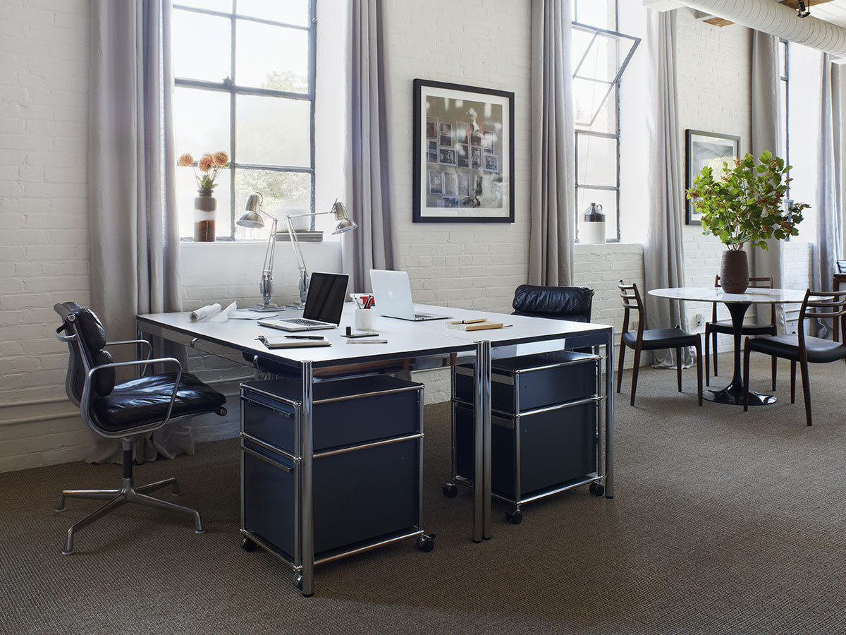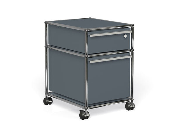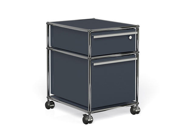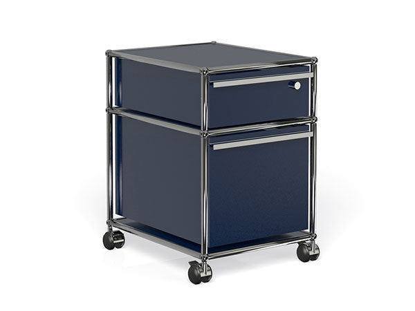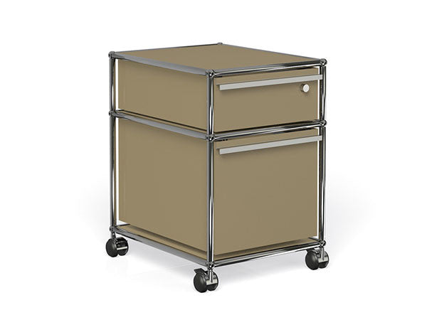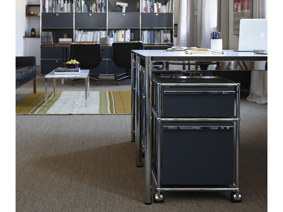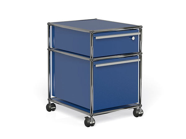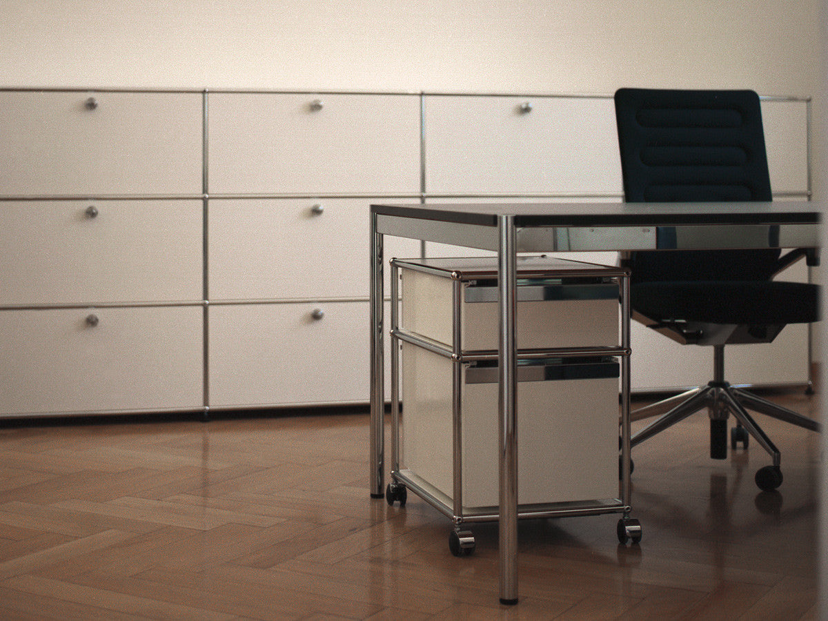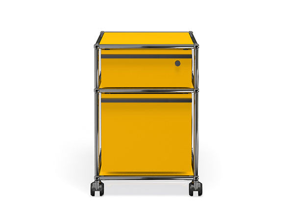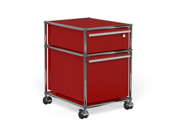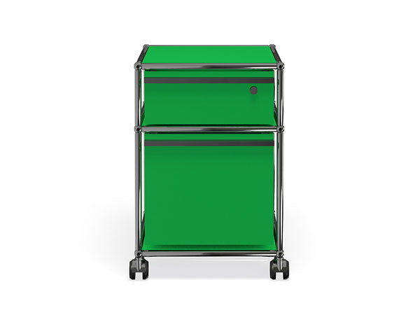 キャスター付きの2段ワゴン。デスク横に一台置くだけで、ワークスペースを機能的にするアイテムです。上段にはステーショナリーや小物類を整理して収納できる便利なトレーが付属します。下段はA4ファイルを横向きで収めることができ、ご自宅の書類収納庫としても便利です。ご自宅からオフィス空間、あるいはクリニックなどのバックオフィスまで、あらゆるワークスペースで活躍します。本商品は上段のみ鍵付きです。USMモジュラーファニチャーは、リビングルームやオフィスを機能美あふれる空間に仕立てるオーダーメイドのシステムファニチャーです。時代と共に変化するユーザーのニーズにも対応できるシンプルかつ柔軟なデザインは普及のデザインとして認められ、2001年にニューヨーク近代美術館の永久コレクションとなりました。販売から50年を経過した今では、世界40か国以上で愛用されています。