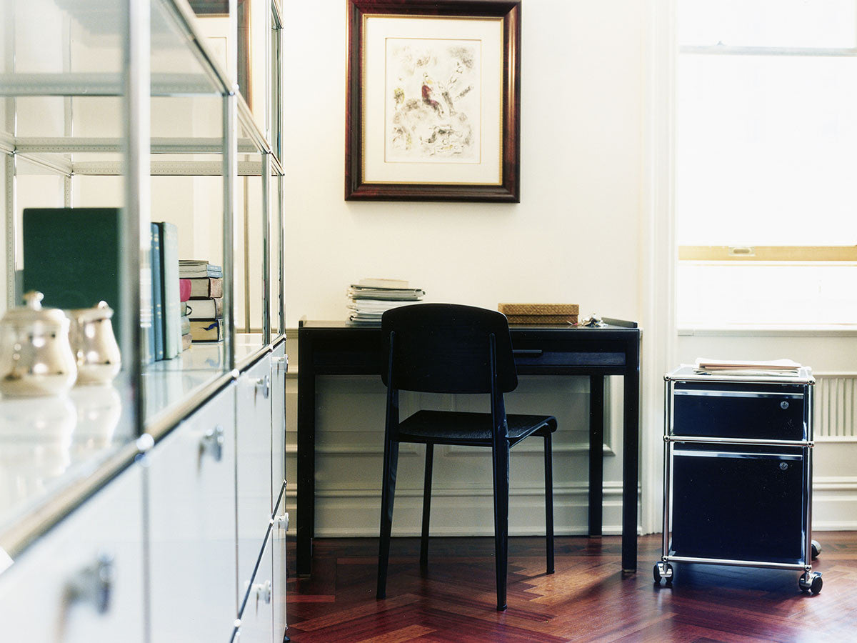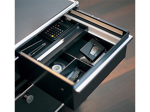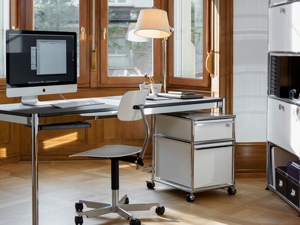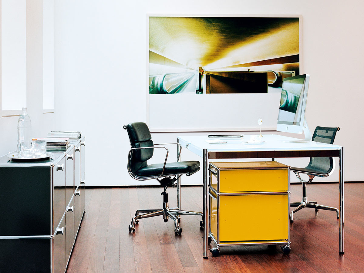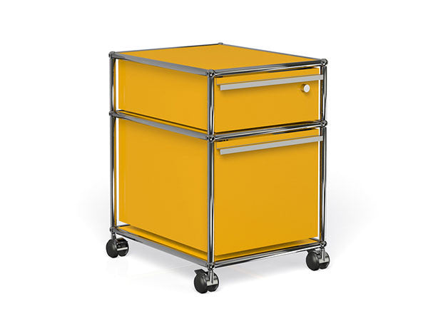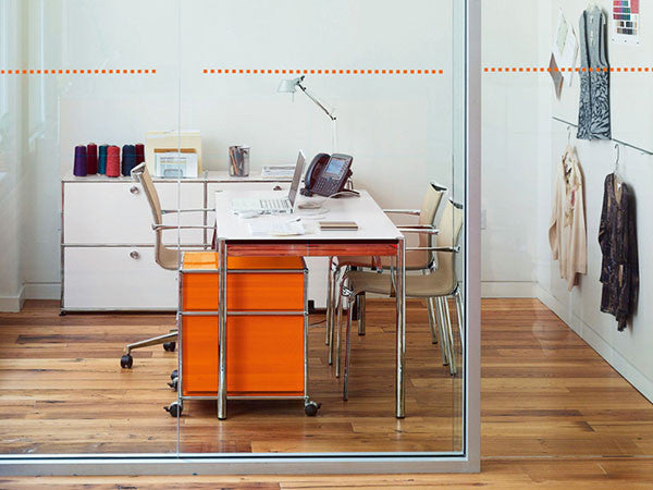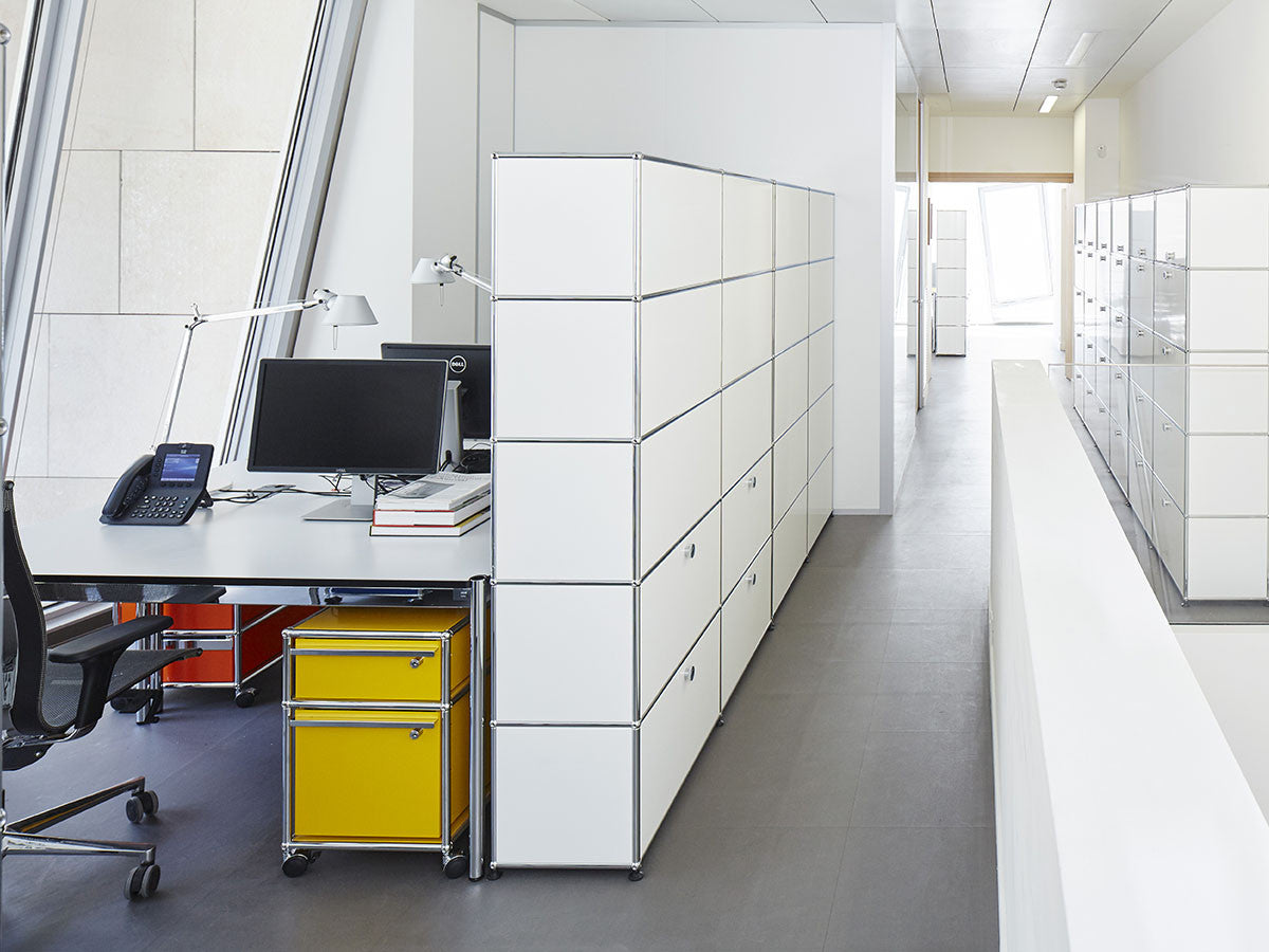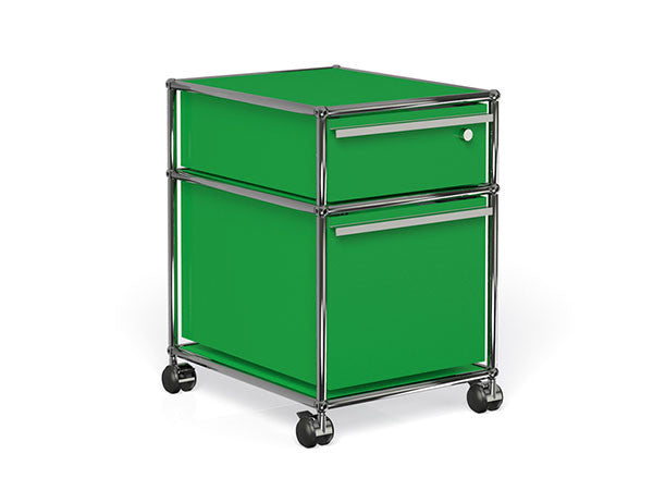 キャスター付きの2段ワゴン。デスク横に一台置くだけで、ワークスペースを機能的にするアイテムです。上段にはステーショナリーや小物類を整理して収納できる便利なトレーが付属します。下段はA4ファイルを横向きで収めることができ、ご自宅の書類収納庫としても便利です。ご自宅からオフィス空間、あるいはクリニックなどのバックオフィスまで、あらゆるワークスペースで活躍します。本商品は上段のみ鍵付きです。USMモジュラーファニチャーは、リビングルームやオフィスを機能美あふれる空間に仕立てるオーダーメイドのシステムファニチャーです。時代と共に変化するユーザーのニーズにも対応できるシンプルかつ柔軟なデザインは普及のデザインとして認められ、2001年にニューヨーク近代美術館の永久コレクションとなりました。販売から50年を経過した今では、世界40か国以上で愛用されています。