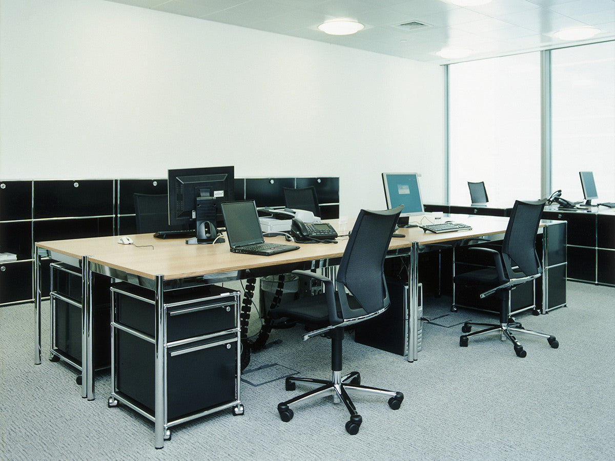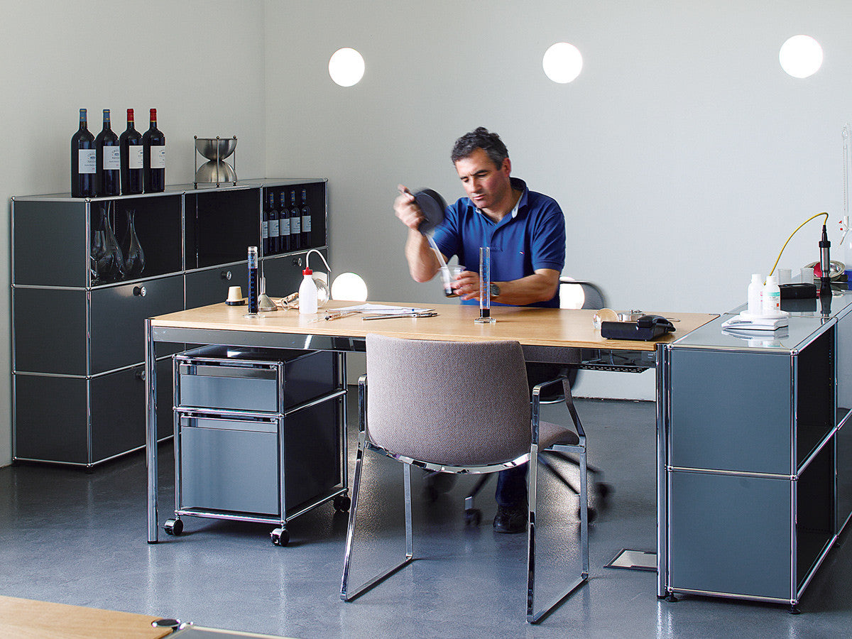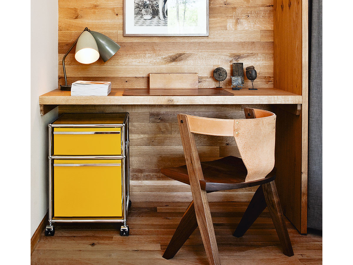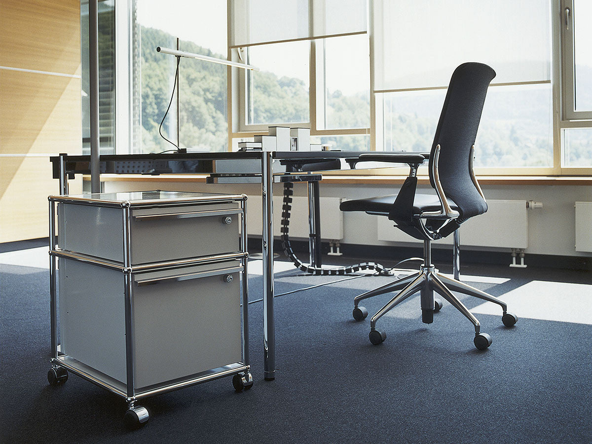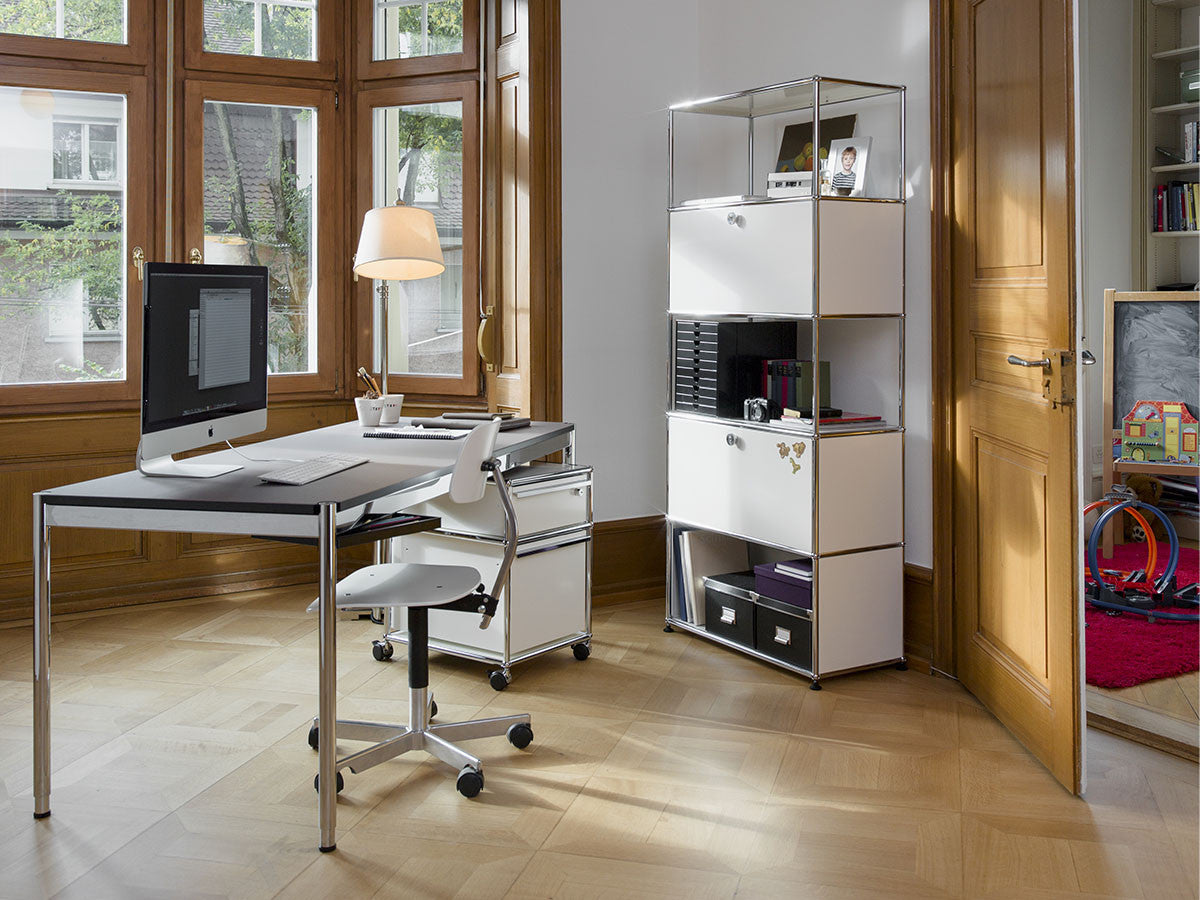 キャスター付きの2段ワゴン。デスク横に一台置くだけで、ワークスペースを機能的にするアイテムです。上段にはステーショナリーや小物類を整理して収納できる便利なトレーが付属します。下段はA4ファイルを横向きで収めることができ、ご自宅の書類収納庫としても便利です。ご自宅からオフィス空間、あるいはクリニックなどのバックオフィスまで、あらゆるワークスペースで活躍します。本商品は上段のみ鍵付きです。USMモジュラーファニチャーは、リビングルームやオフィスを機能美あふれる空間に仕立てるオーダーメイドのシステムファニチャーです。時代と共に変化するユーザーのニーズにも対応できるシンプルかつ柔軟なデザインは普及のデザインとして認められ、2001年にニューヨーク近代美術館の永久コレクションとなりました。販売から50年を経過した今では、世界40か国以上で愛用されています。