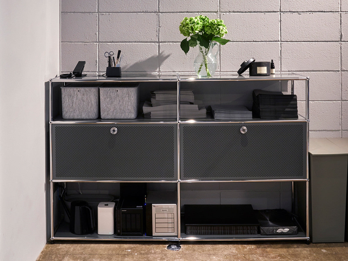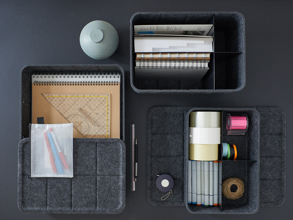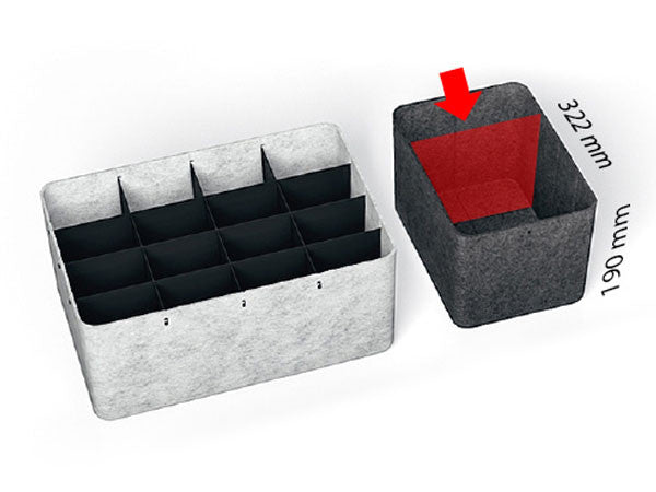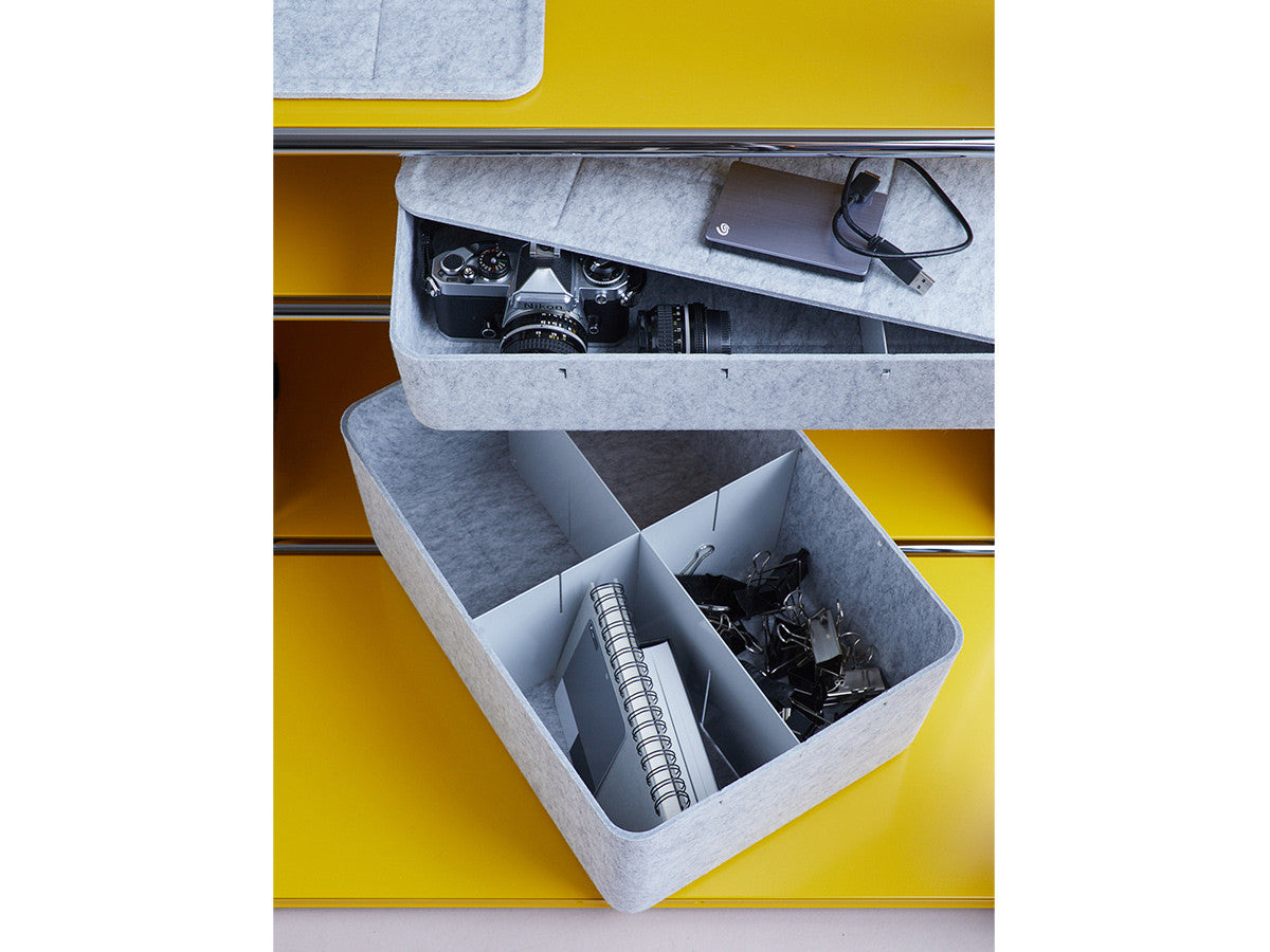 USMハラーのユニットに最適なサイズの収納アクセサリー。フリース素材のボックスには、衣類やデリケートな小物から、ハードな工具や靴に至るまで、整理整頓しながらしまうことができます。用途に応じて大小サイズを組み合わせてお使いいただけます。本商品は「ハイボックス 250」です。仕切りとなるディバイダーはスチール製。短辺用と長辺用がありますので、それぞれ必要な数量をお選びください。