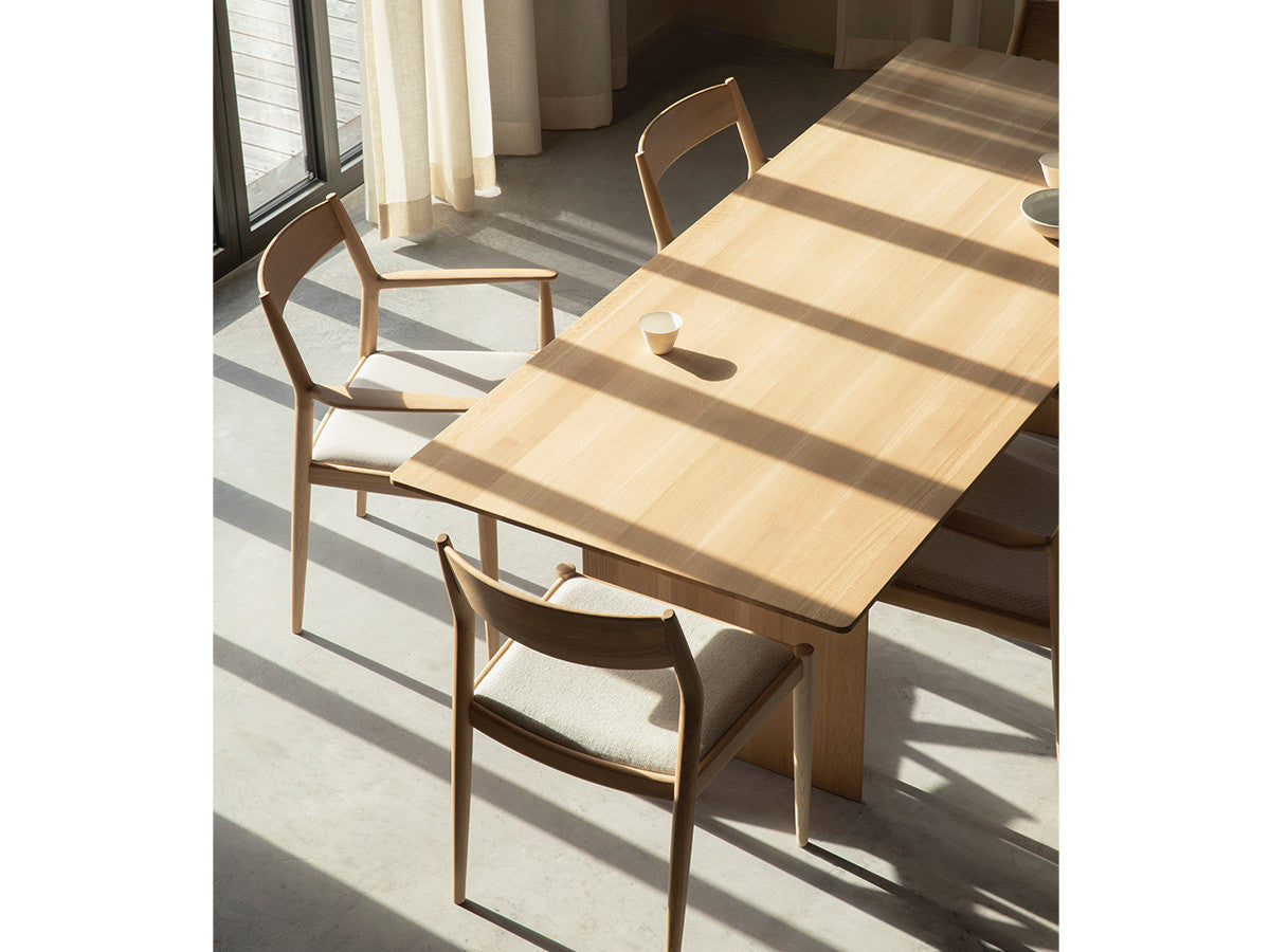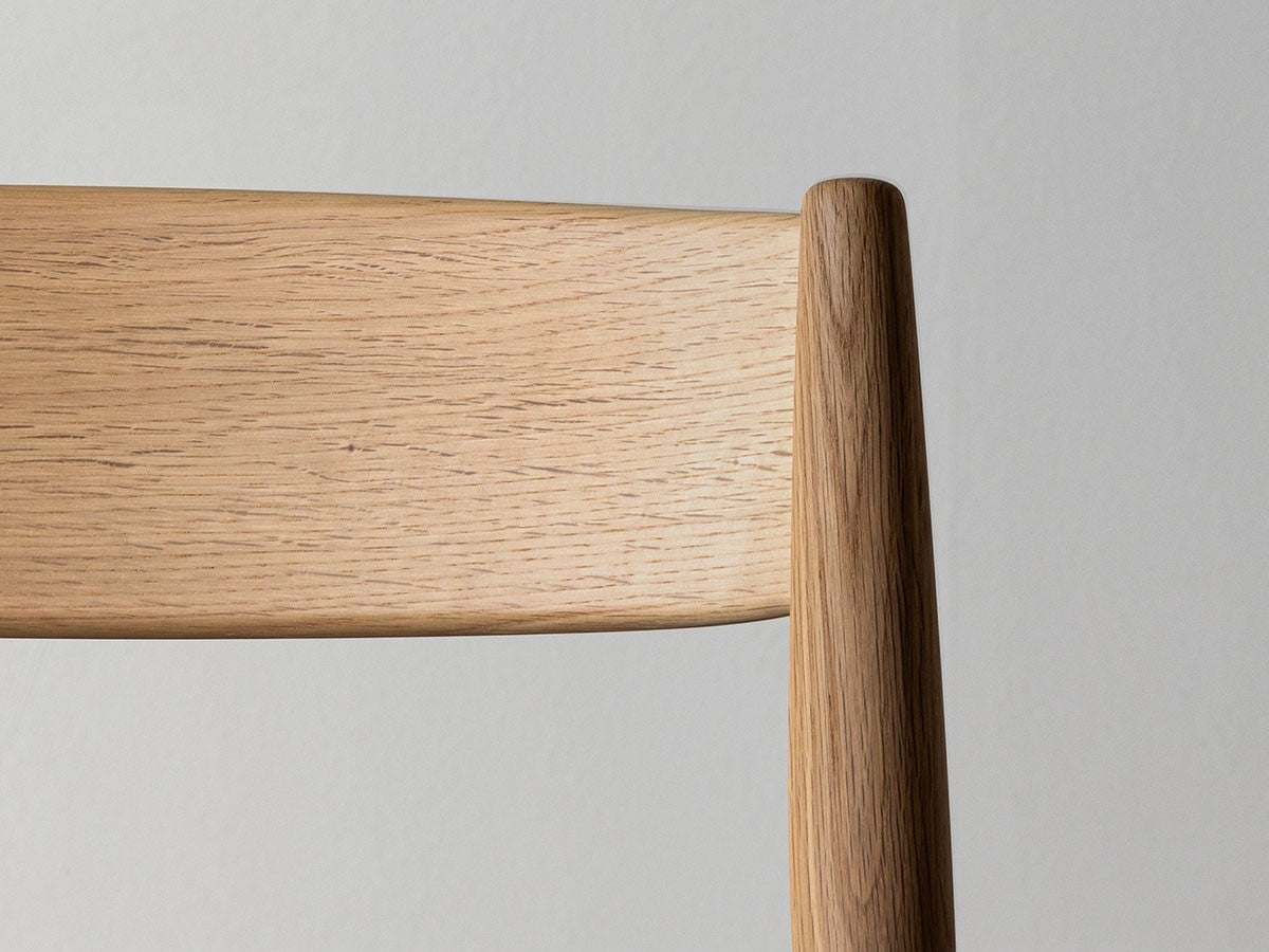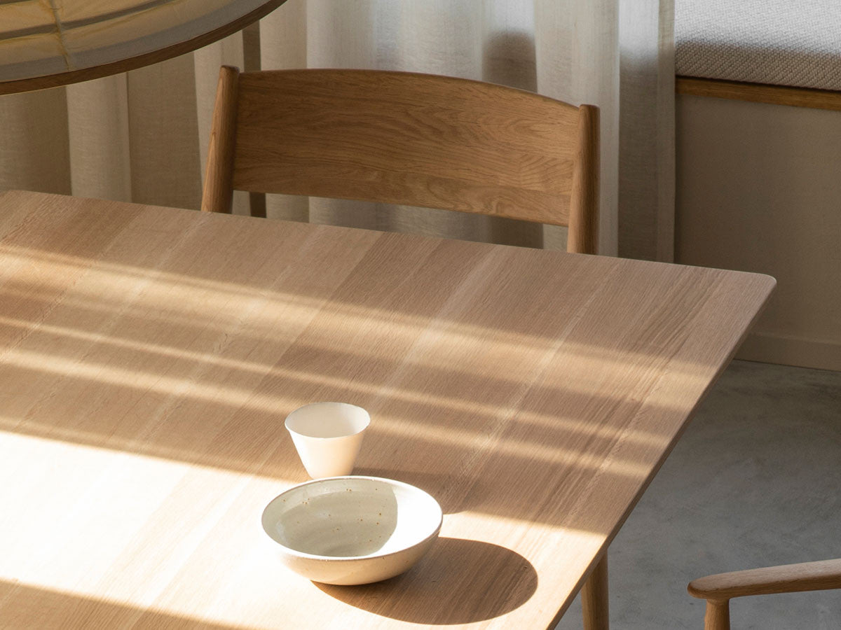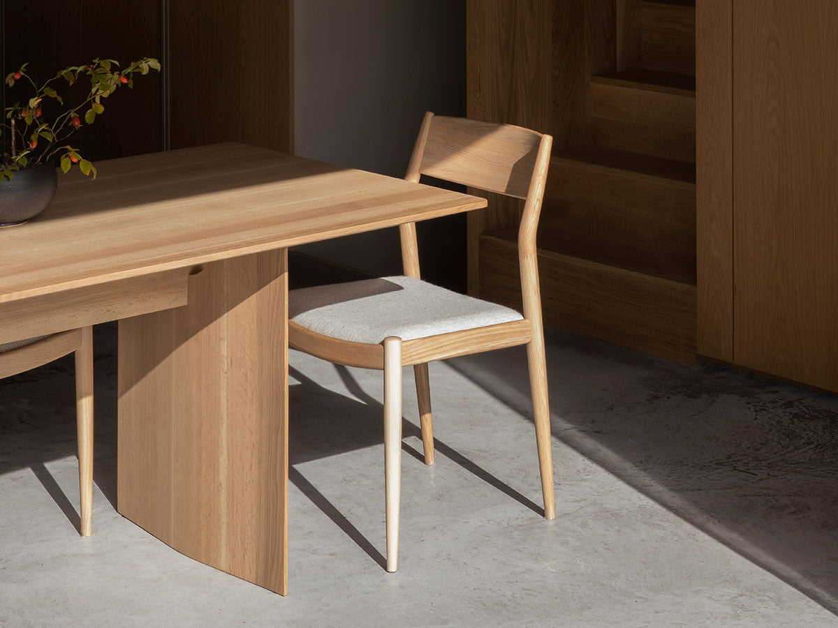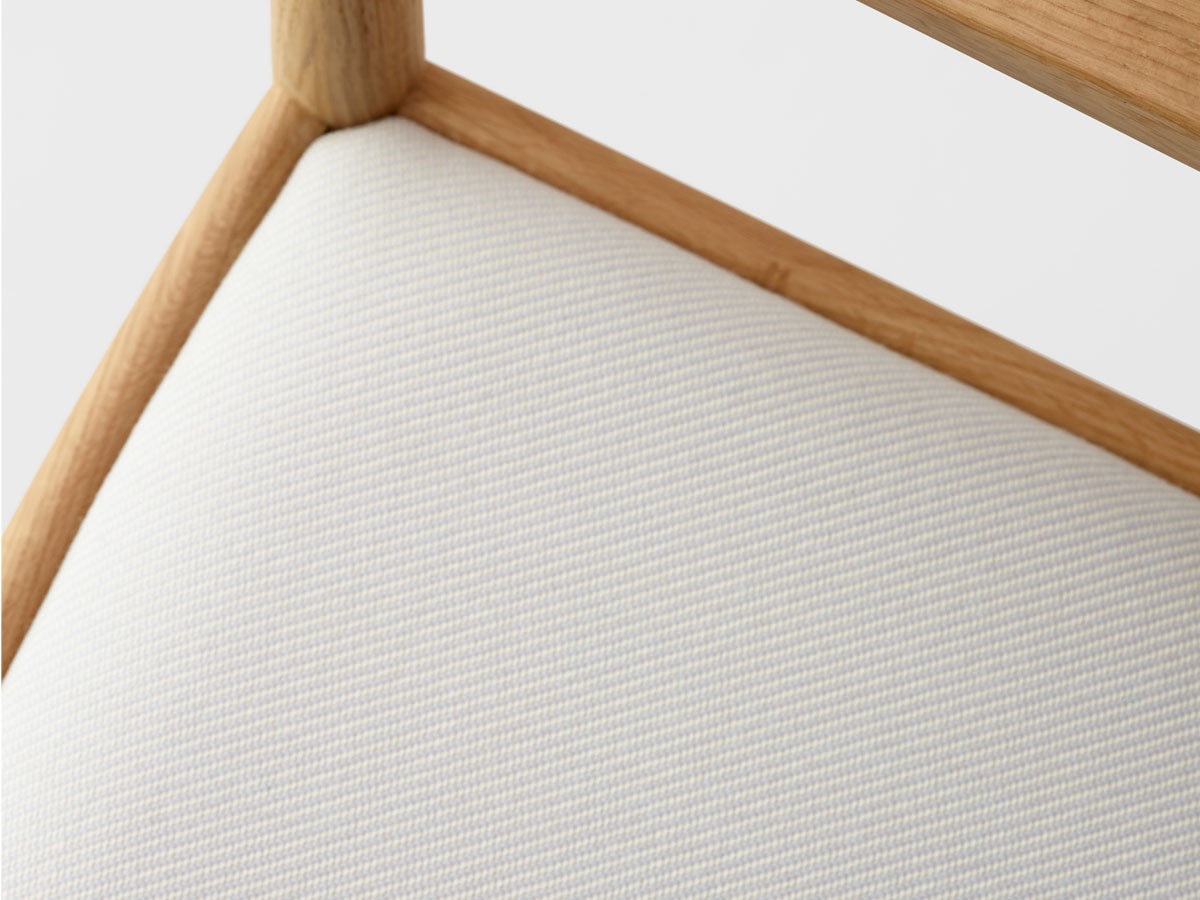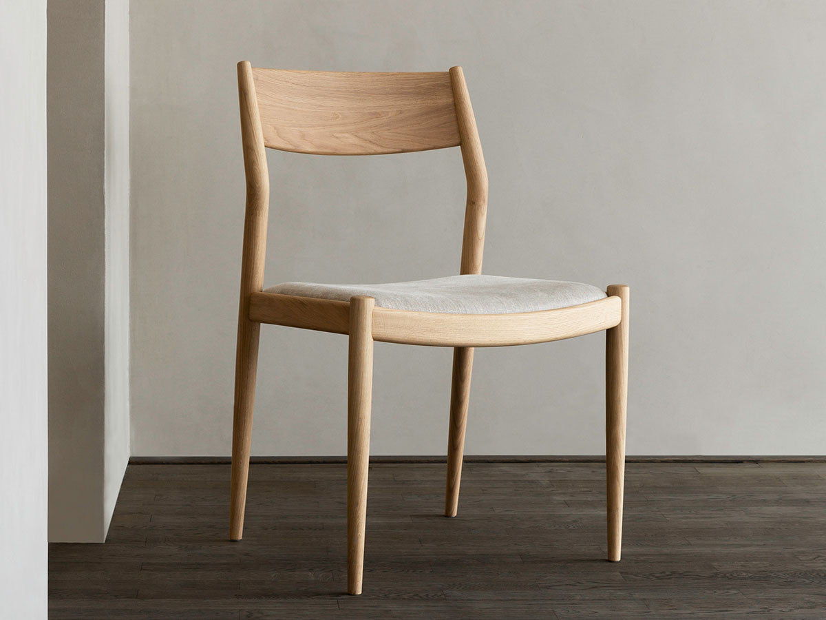 どの方向から見ても、加える要素も削る要素もない、ソフトミニマリズムを体現した緻密なデザイン。このダイニングチェアはデザイナーがカリモクの工場を視察し、職人と現場でワークショップを行った結果生まれたピースです。既存のパーツをアップデートすることで、日本とスカンジナビアのデザインが持つ審美性を融合。構造はシンプルながらも、暖かく、親しみやすい、クラシックチェアを生み出しました。非常に線が細く緻密なディテールを形にするために木工技術の限界に挑み、求めるデザイン性と強度との両立を実現しています。アームチェア(N-DC01)よりも少し背もたれの幅が広く、全体の幅感をコンパクトに調整されています。デンマークと日本、両国の相互的な敬意から生まれたカリモクケースには、両国のデザインの伝統に明白に息づく自然とのつながりが感じられます。現在、都市生活者の間では、天然の素材で作られた環境に囲まれた、感性を刺激する空間としての自宅に対するニーズが高まっています。これは自然とのつながりを再び持ちたいという願望を反映しています。カリモクケースでは、自宅に良質で自然を感じさせるカリモクデザインを採用することで、シンプルかつ効果的に生活の質を高めることができると考えています。
