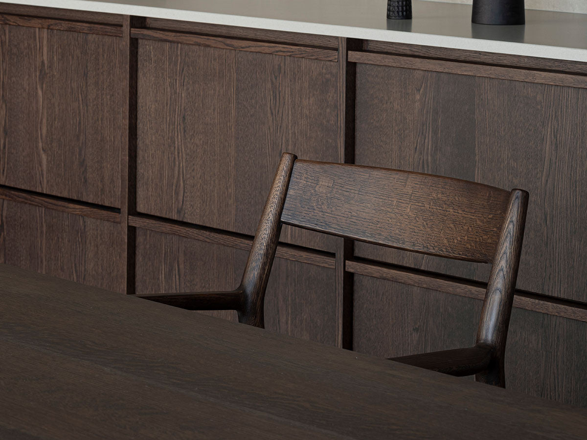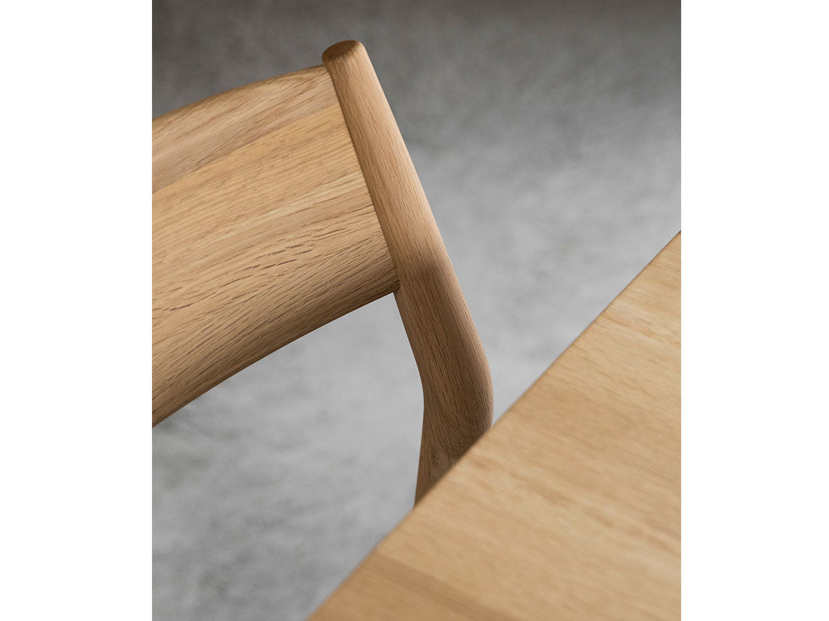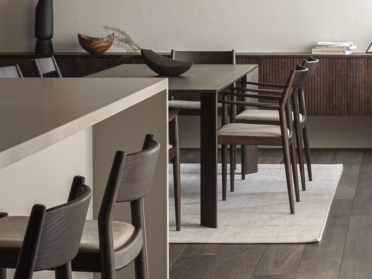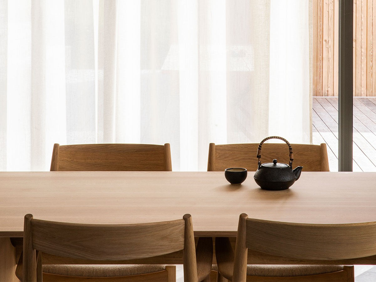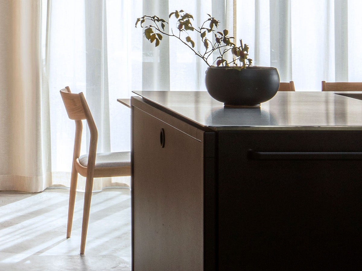 どの方向から見ても、加える要素も削る要素もない、ソフトミニマリズムを体現した緻密なデザイン。このダイニングチェアはデザイナーがカリモクの工場を視察し、職人と現場でワークショップを行った結果生まれたピースです。既存のパーツをアップデートすることで、日本とスカンジナビアのデザインが持つ審美性を融合。構造はシンプルながらも、暖かく、親しみやすい、クラシックチェアを生み出しました。非常に線が細く緻密なディテールを形にするために木工技術の限界に挑み、求めるデザイン性と強度との両立を実現しています。アームチェア(N-DC01)よりも少し背もたれの幅が広く、全体の幅感をコンパクトに調整されています。デンマークと日本、両国の相互的な敬意から生まれたカリモクケースには、両国のデザインの伝統に明白に息づく自然とのつながりが感じられます。現在、都市生活者の間では、天然の素材で作られた環境に囲まれた、感性を刺激する空間としての自宅に対するニーズが高まっています。これは自然とのつながりを再び持ちたいという願望を反映しています。カリモクケースでは、自宅に良質で自然を感じさせるカリモクデザインを採用することで、シンプルかつ効果的に生活の質を高めることができると考えています。