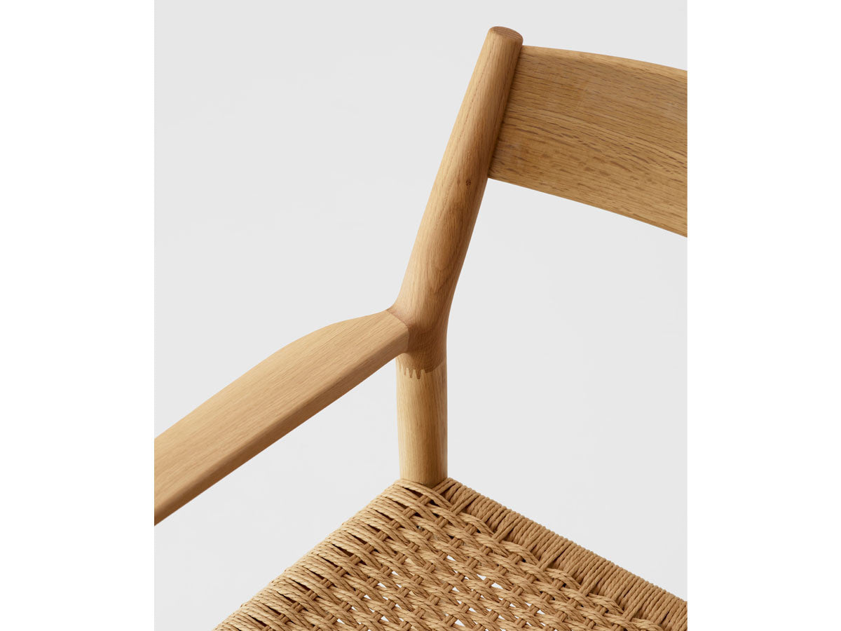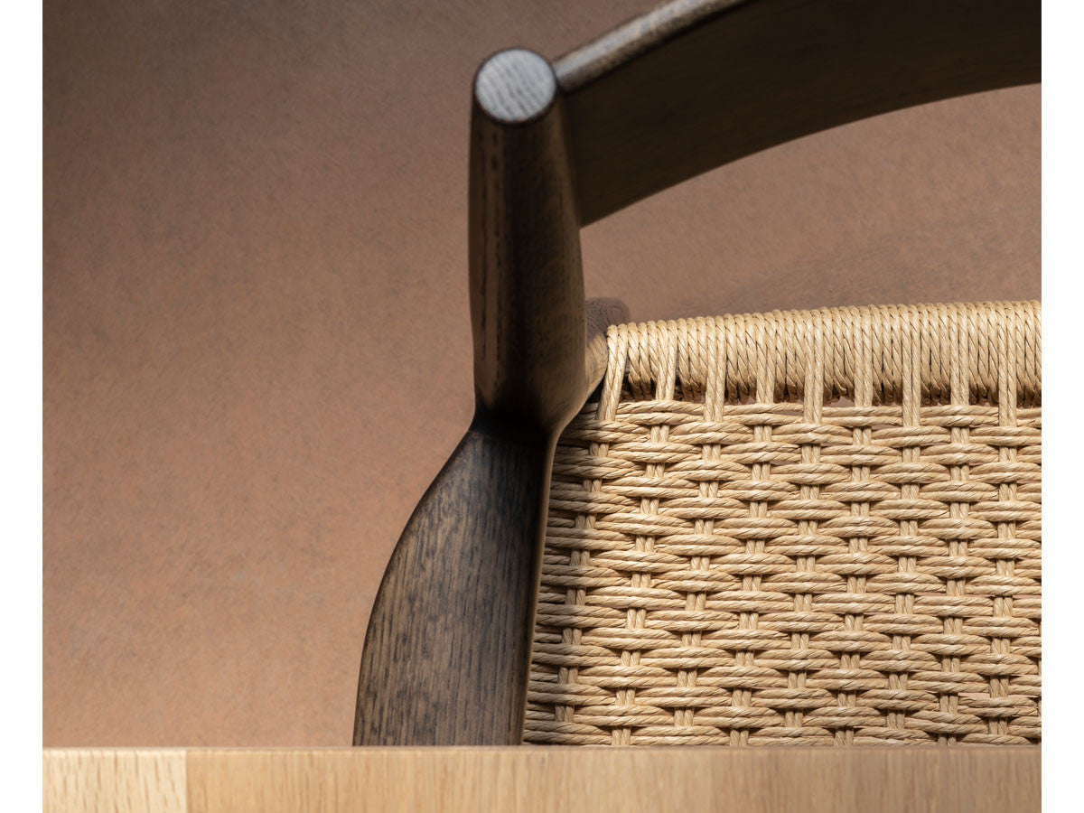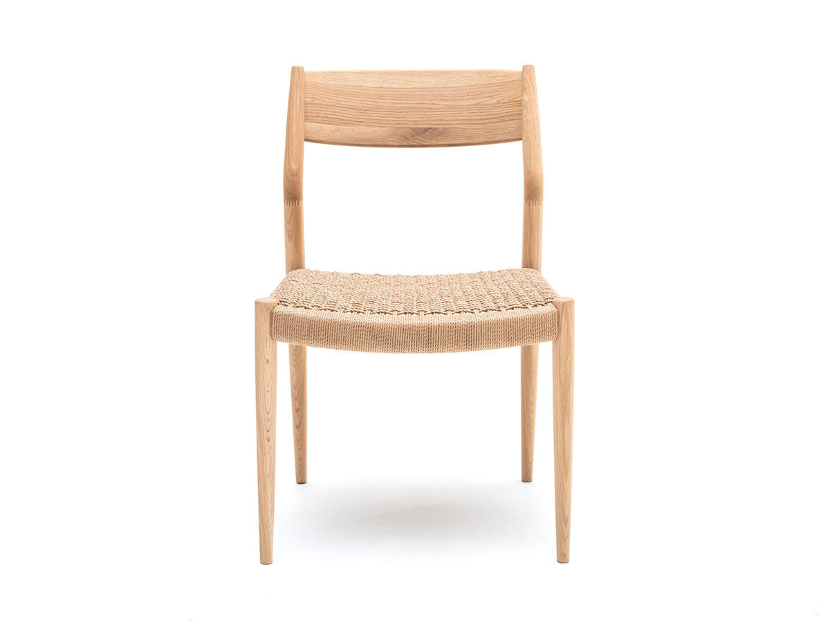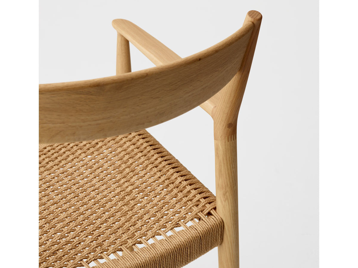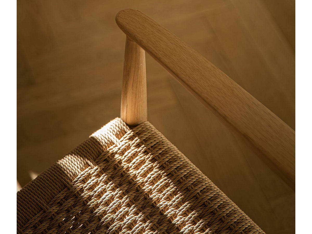 どの方向から見ても、加える要素も削る要素もない、ソフトミニマリズムを体現した緻密なデザイン。このダイニングチェアはデザイナーがカリモクの工場を視察し、職人と現場でワークショップを行った結果生まれたピースです。既存のパーツをアップデートすることで、日本とスカンジナビアのデザインが持つ審美性を融合。構造はシンプルながらも、暖かく、親しみやすい、クラシックチェアを生み出しました。非常に線が細く緻密なディテールを形にするために木工技術の限界に挑み、求めるデザイン性と強度との両立を実現しています。アームチェア(N-DC01)よりも少し背もたれの幅が広く、全体の幅感をコンパクトに調整されています。リサイクルペーパー素材を採用したペーパーコードは、木繊維のような上質な質感が特徴。お届けした当初の反発するような座り心地から、使い込んでいくうちに座る人に馴染んでいきます。通気性が良いため夏は涼しく、冬は冷たく感じない、一年を通して快適さを提供する素材です。オリジナル開発した補強金具を構造体に採用し、高い強度を保っています。デンマークと日本、両国の相互的な敬意から生まれたカリモクケースには、両国のデザインの伝統に明白に息づく自然とのつながりが感じられます。現在、都市生活者の間では、天然の素材で作られた環境に囲まれた、感性を刺激する空間としての自宅に対するニーズが高まっています。これは自然とのつながりを再び持ちたいという願望を反映しています。カリモクケースでは、自宅に良質で自然を感じさせるカリモクデザインを採用することで、シンプルかつ効果的に生活の質を高めることができると考えています。