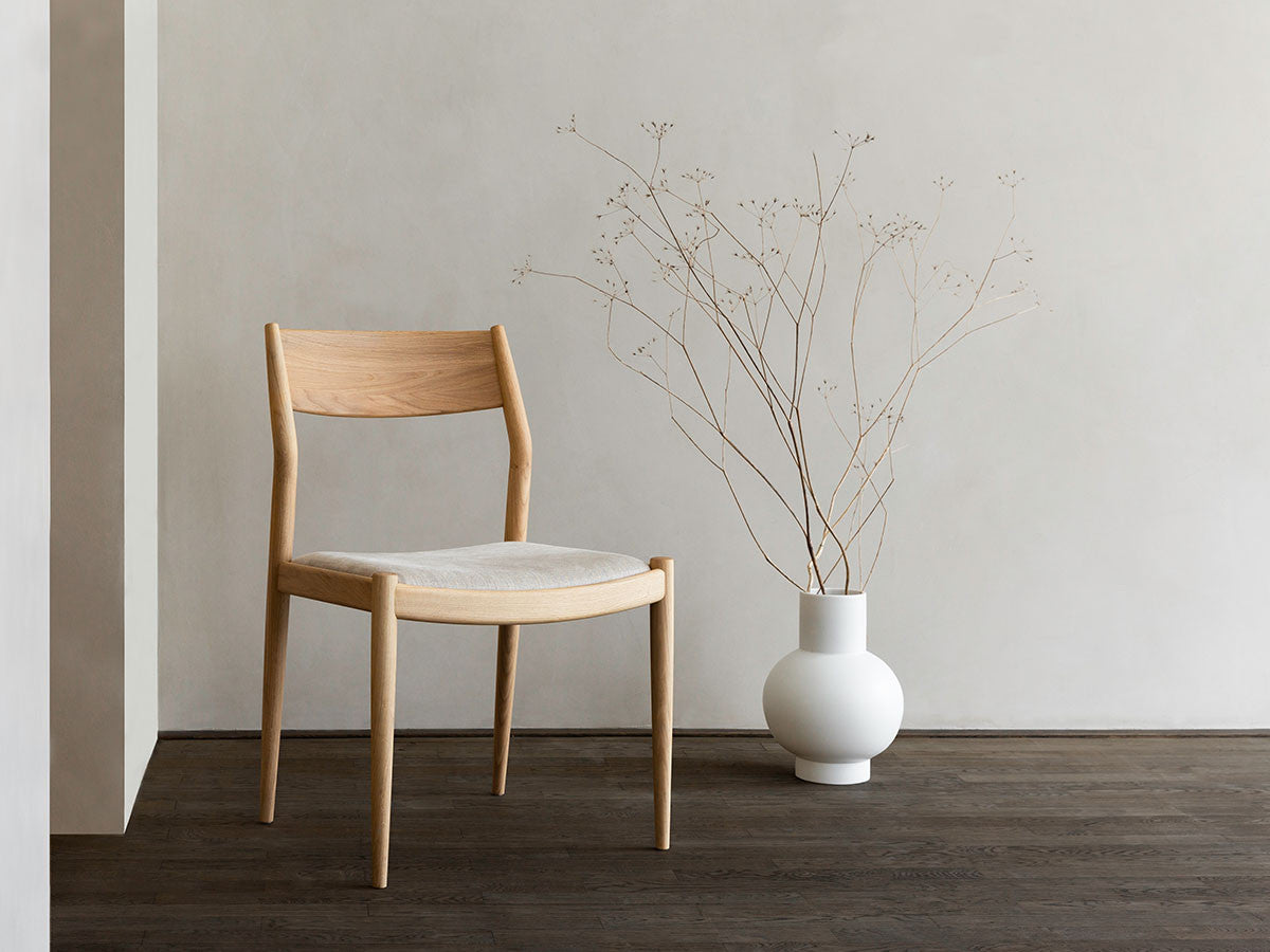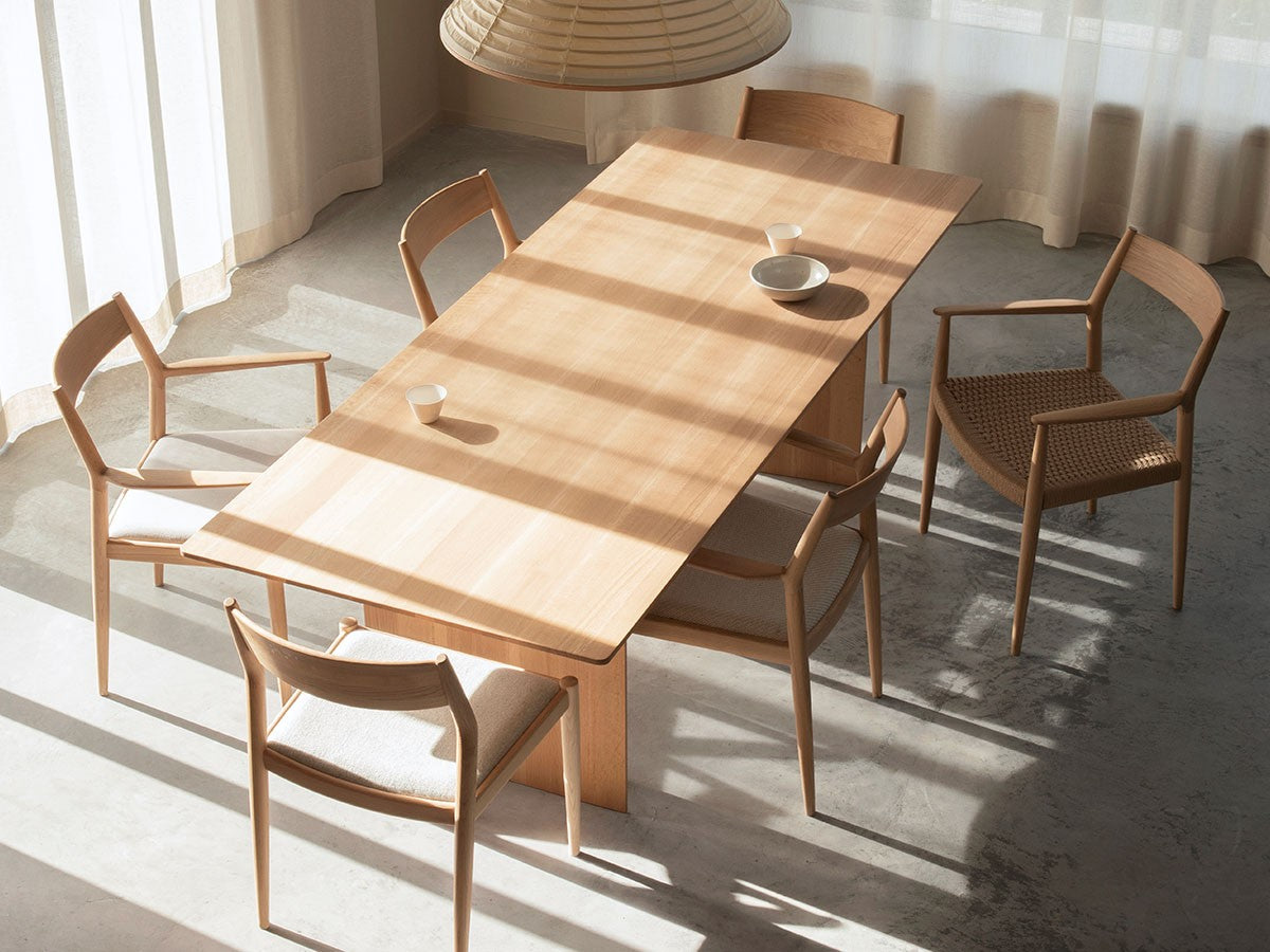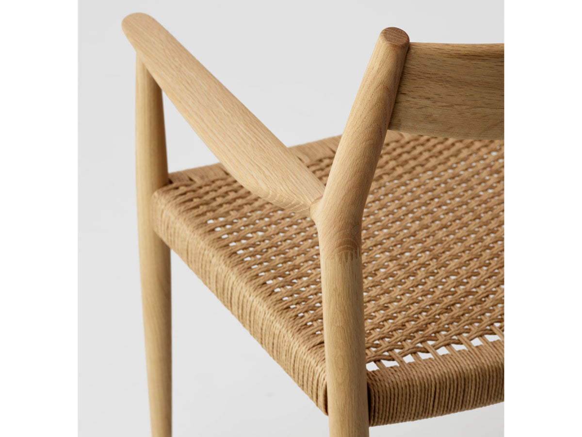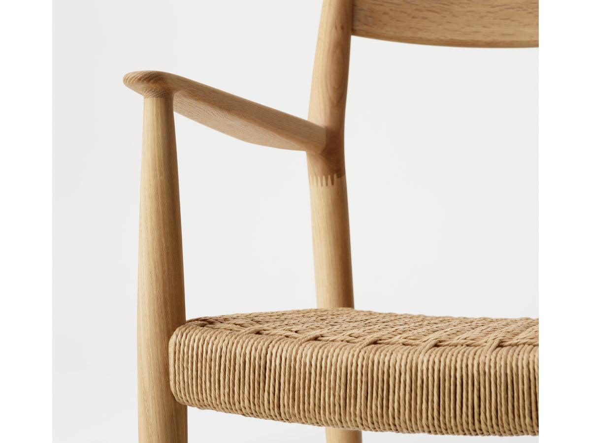 どの方向から見ても、加える要素も削る要素もない、ソフトミニマリズムを体現した緻密なデザイン。このダイニングチェアはデザイナーがカリモクの工場を視察し、職人と現場でワークショップを行った結果生まれたピースです。既存のパーツをアップデートすることで、日本とスカンジナビアのデザインが持つ審美性を融合。構造はシンプルながらも、暖かく、親しみやすい、クラシックチェアを生み出しました。非常に線が細く緻密なディテールを形にするために木工技術の限界に挑み、求めるデザイン性と強度との両立を実現しています。アームチェア(N-DC01)よりも少し背もたれの幅が広く、全体の幅感をコンパクトに調整されています。リサイクルペーパー素材を採用したペーパーコードは、木繊維のような上質な質感が特徴。お届けした当初の反発するような座り心地から、使い込んでいくうちに座る人に馴染んでいきます。通気性が良いため夏は涼しく、冬は冷たく感じない、一年を通して快適さを提供する素材です。オリジナル開発した補強金具を構造体に採用し、高い強度を保っています。デンマークと日本、両国の相互的な敬意から生まれたカリモクケースには、両国のデザインの伝統に明白に息づく自然とのつながりが感じられます。現在、都市生活者の間では、天然の素材で作られた環境に囲まれた、感性を刺激する空間としての自宅に対するニーズが高まっています。これは自然とのつながりを再び持ちたいという願望を反映しています。カリモクケースでは、自宅に良質で自然を感じさせるカリモクデザインを採用することで、シンプルかつ効果的に生活の質を高めることができると考えています。