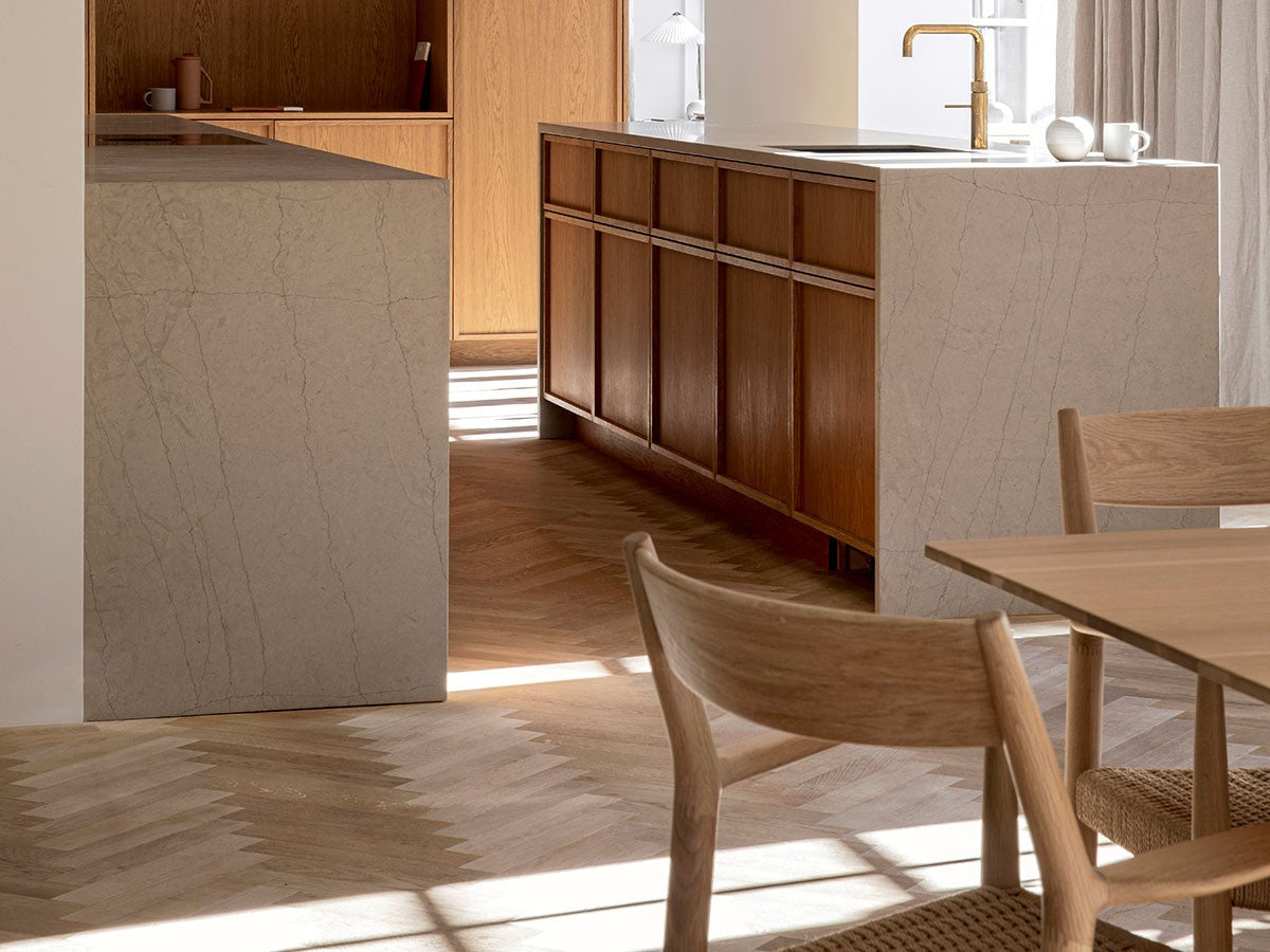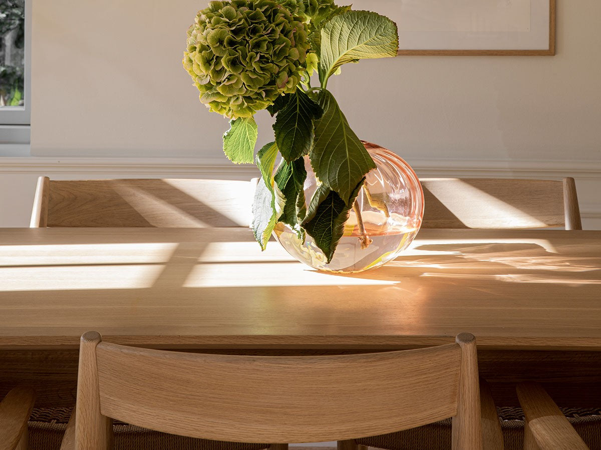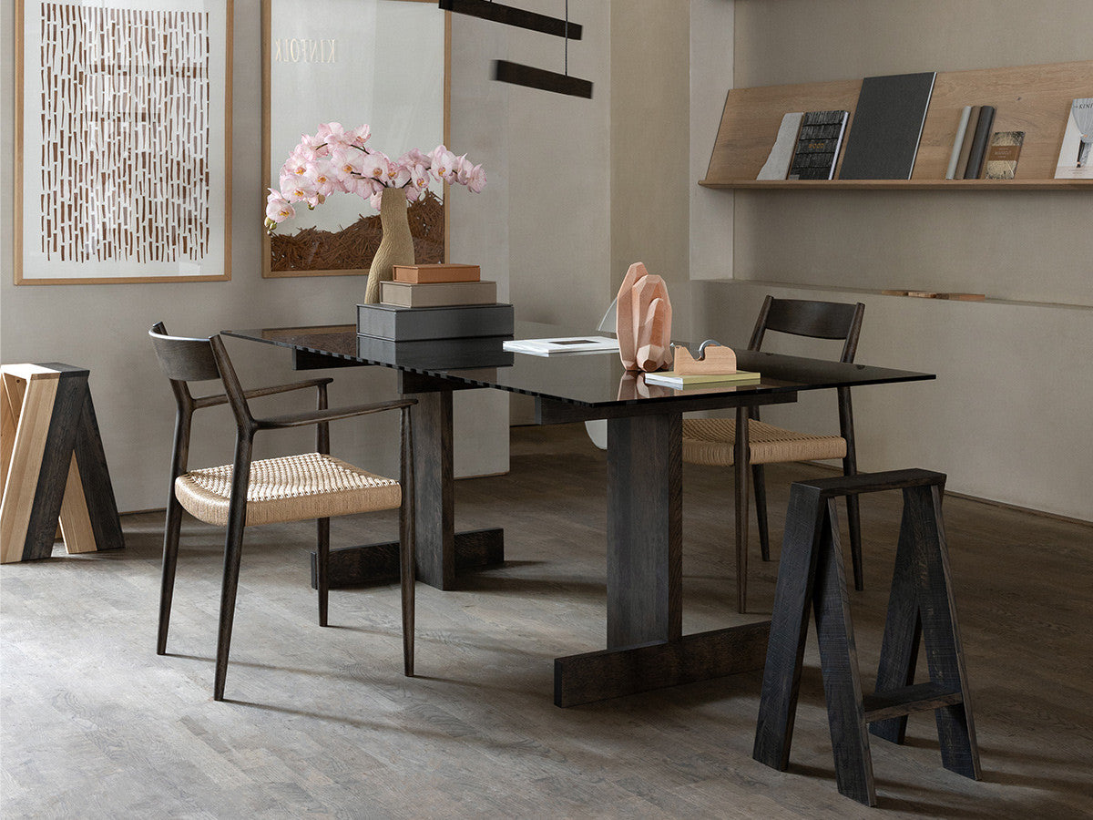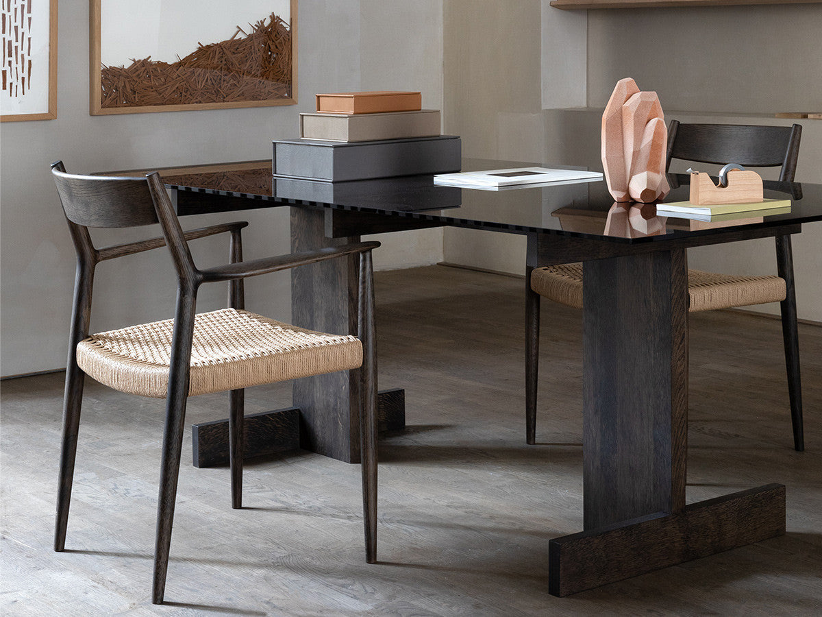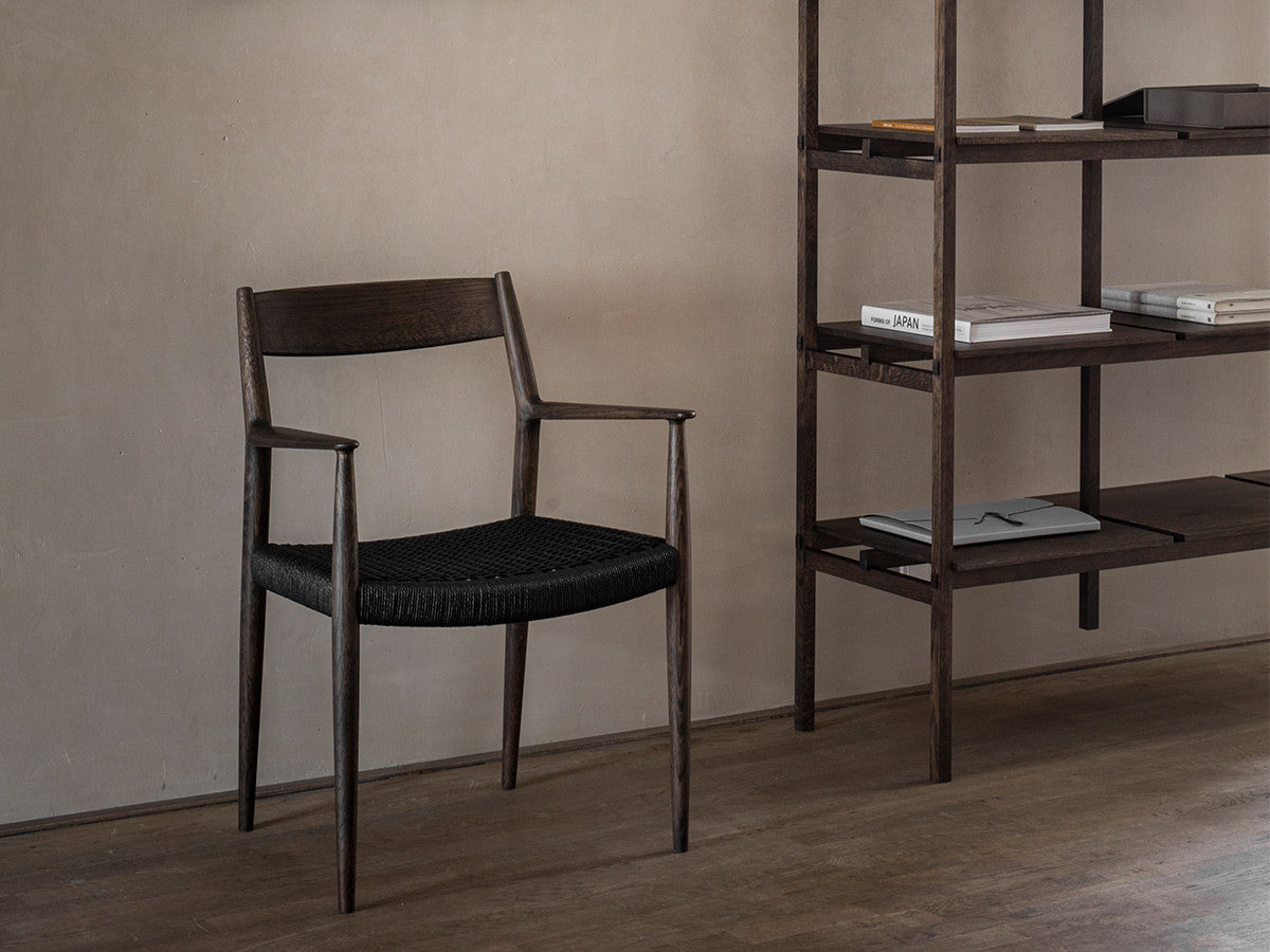 どの方向から見ても、加える要素も削る要素もない、ソフトミニマリズムを体現した緻密なデザイン。このダイニングチェアはデザイナーがカリモクの工場を視察し、職人と現場でワークショップを行った結果生まれたピースです。既存のパーツをアップデートすることで、日本とスカンジナビアのデザインが持つ審美性を融合。構造はシンプルながらも、暖かく、親しみやすい、クラシックチェアを生み出しました。非常に線が細く緻密なディテールを形にするために木工技術の限界に挑み、求めるデザイン性と強度との両立を実現しています。アームチェア(N-DC01)よりも少し背もたれの幅が広く、全体の幅感をコンパクトに調整されています。リサイクルペーパー素材を採用したペーパーコードは、木繊維のような上質な質感が特徴。お届けした当初の反発するような座り心地から、使い込んでいくうちに座る人に馴染んでいきます。通気性が良いため夏は涼しく、冬は冷たく感じない、一年を通して快適さを提供する素材です。オリジナル開発した補強金具を構造体に採用し、高い強度を保っています。デンマークと日本、両国の相互的な敬意から生まれたカリモクケースには、両国のデザインの伝統に明白に息づく自然とのつながりが感じられます。現在、都市生活者の間では、天然の素材で作られた環境に囲まれた、感性を刺激する空間としての自宅に対するニーズが高まっています。これは自然とのつながりを再び持ちたいという願望を反映しています。カリモクケースでは、自宅に良質で自然を感じさせるカリモクデザインを採用することで、シンプルかつ効果的に生活の質を高めることができると考えています。