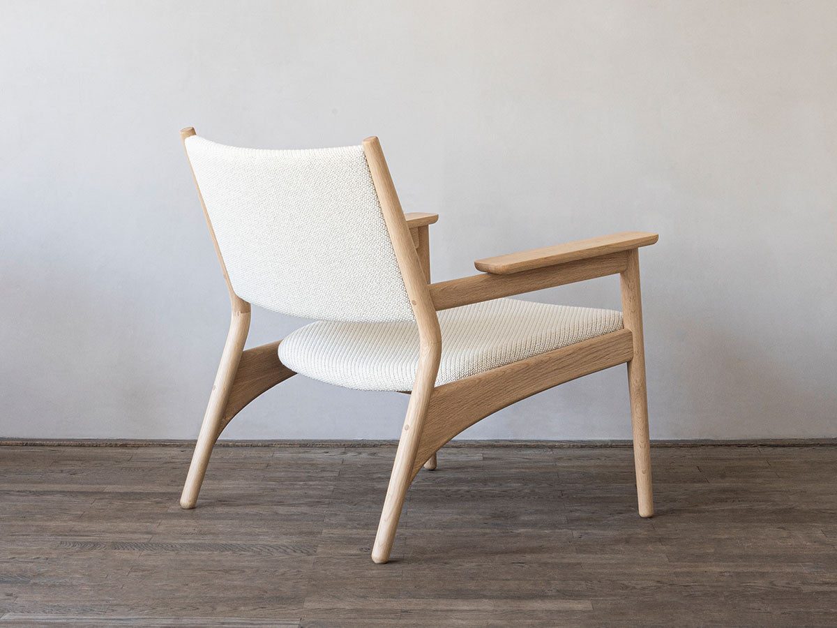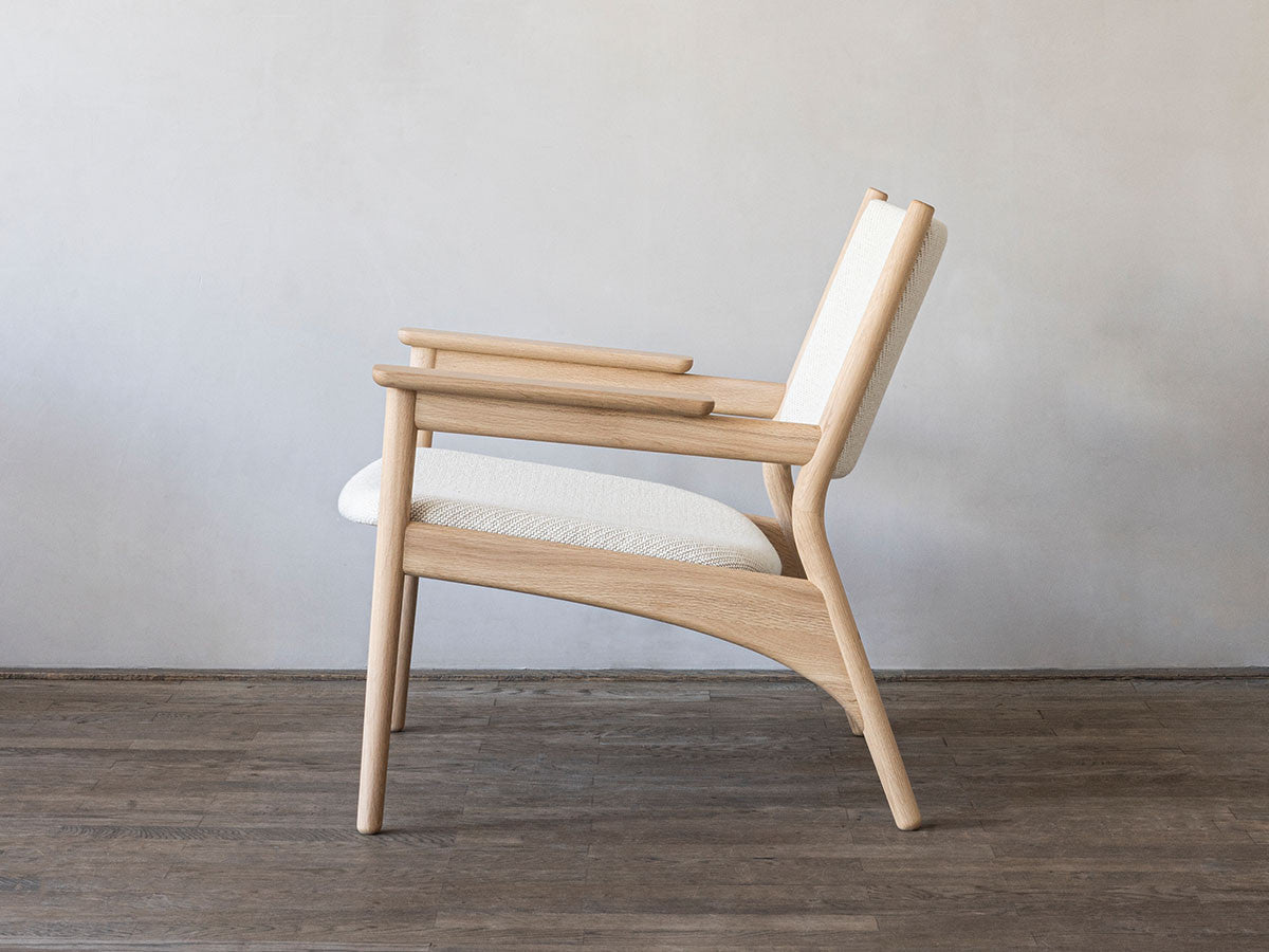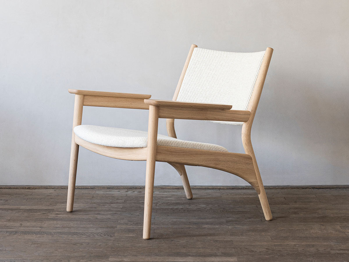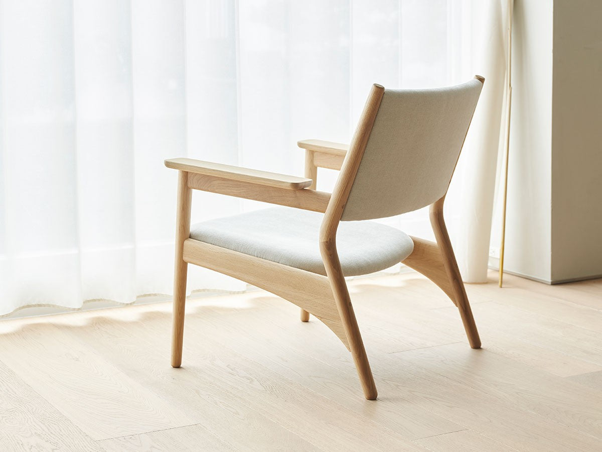 1950年代の伝統的なデンマークの家具デザインからインスピレーションを得た、ダイニングチェアとソファのハイブリッドのようなラウンジチェア。ソファのように広々としながら、ダイニングチェアのような洗練された軽さが特徴的です。本商品は張込シートタイプ(N-LC01)です。ハンモックシートタイプ(N-LC02)と同デザインに見えますが、それぞれのシートの性質に合わせた精細なバランスチューニングがなされています。いずれもセッティングスペースを要さないコンパクトなサイズ性ですが、掛けてみるとしっくり落ち着く完成度の高いラウンジチェアに仕上がっています。木部に比べて傷みやすいシートやバックレストのオーバーホールが可能なロングライフに配慮された構造です。バックレストは本体フレームに張込まれたきれいな仕上がりに見えますが、実は丸ごとユニット交換も可能です。