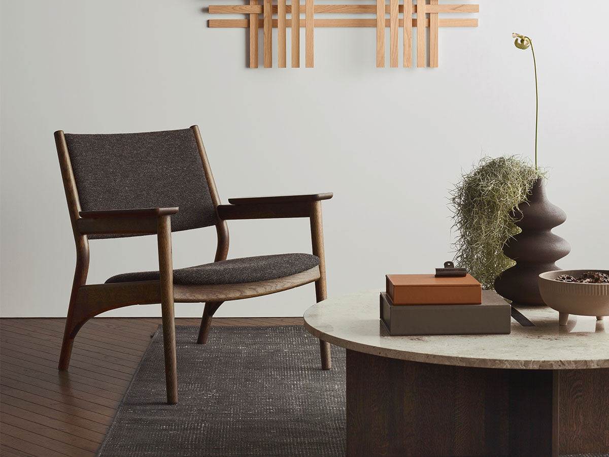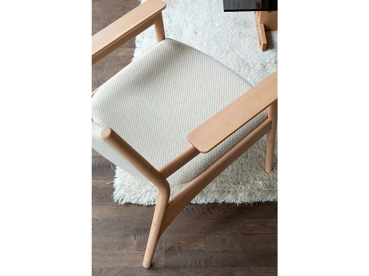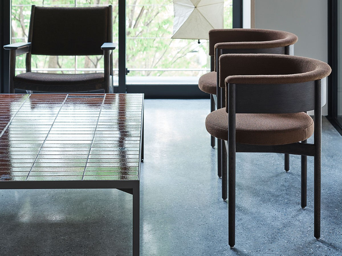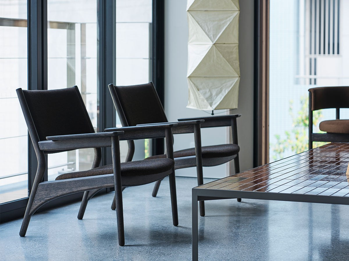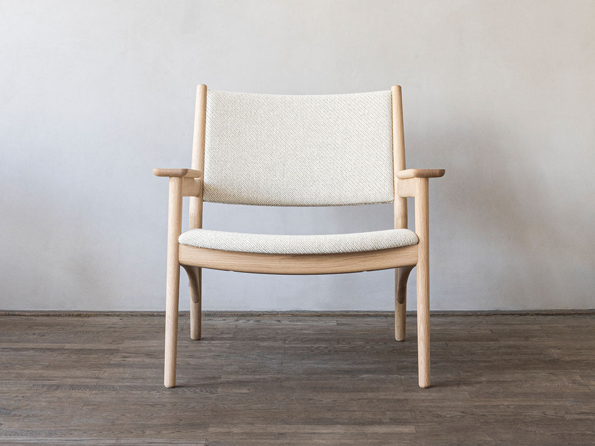1950年代の伝統的なデンマークの家具デザインからインスピレーションを得た、ダイニングチェアとソファのハイブリッドのようなラウンジチェア。ソファのように広々としながら、ダイニングチェアのような洗練された軽さが特徴的です。本商品は張込シートタイプ(N-LC01)です。ハンモックシートタイプ(N-LC02)と同デザインに見えますが、それぞれのシートの性質に合わせた精細なバランスチューニングがなされています。いずれもセッティングスペースを要さないコンパクトなサイズ性ですが、掛けてみるとしっくり落ち着く完成度の高いラウンジチェアに仕上がっています。木部に比べて傷みやすいシートやバックレストのオーバーホールが可能なロングライフに配慮された構造です。バックレストは本体フレームに張込まれたきれいな仕上がりに見えますが、実は丸ごとユニット交換も可能です。