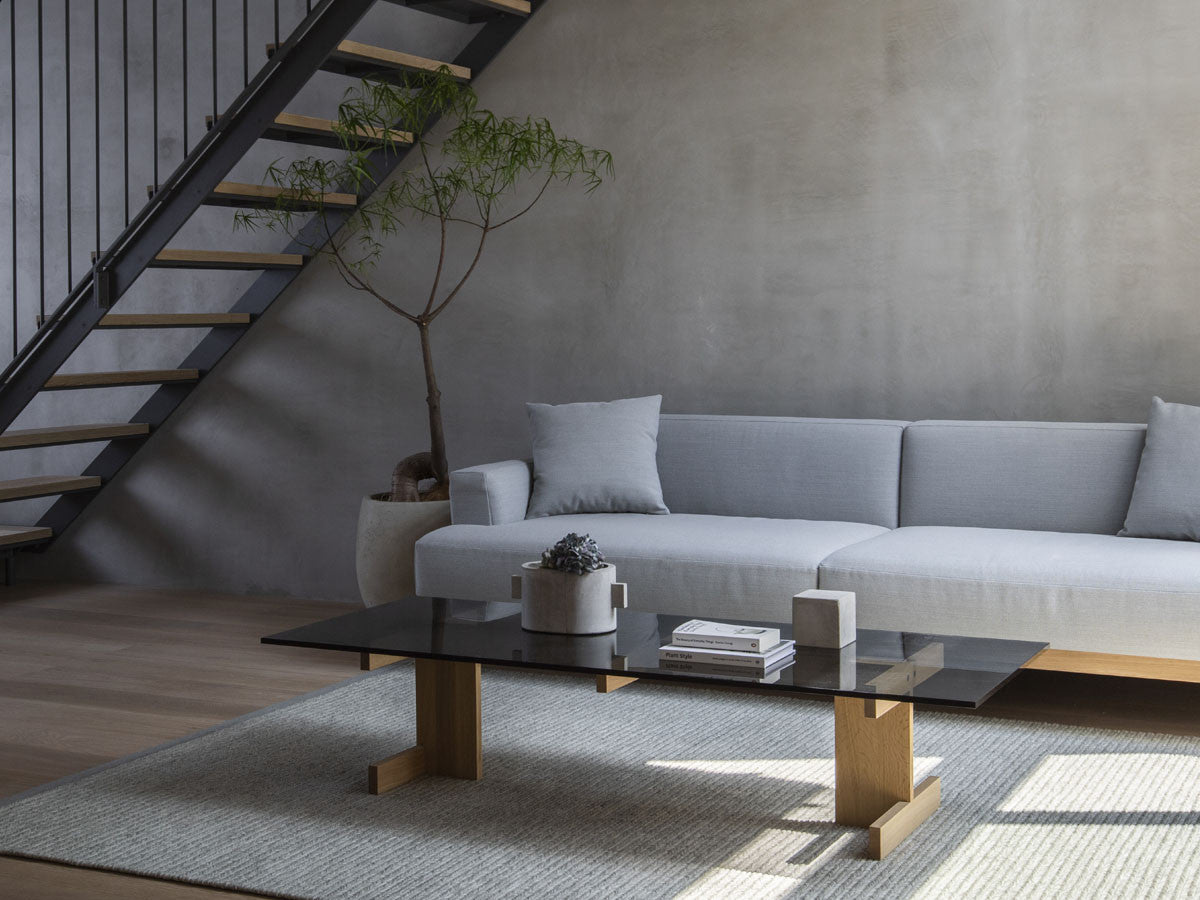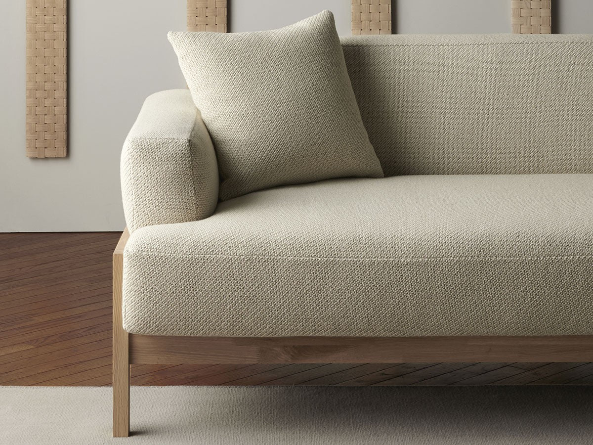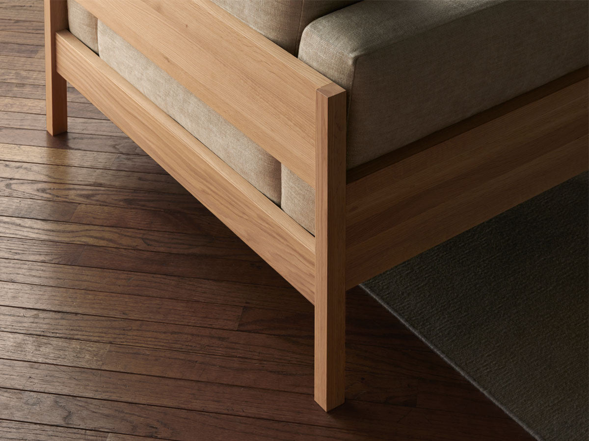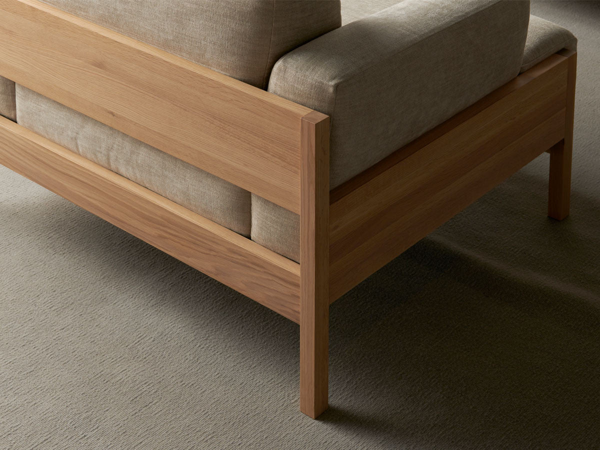 日本建築に見られる水平と垂直のラインをデザインに活かしたロー&ワイドソファ。テーブルと同じ構造をソファにも活用し、彫刻的な美しさとリラックスした雰囲気を持たせています。ハイテクな木工技術と職人の手仕事との融合が水平ラインと垂直ラインの美をより際立たせます。座面クッション下の木桟は積層巾剥集成材を採用し、縦継ぎ目のない美しい素材使いです。高さを空間にあわせて低めに設定しているため、圧迫感を感じさせません。座面は、着座時の感触にもこだわったウレタンフォーム・綿の6層構造。メンテナンスが可能なカバーリング仕様です。