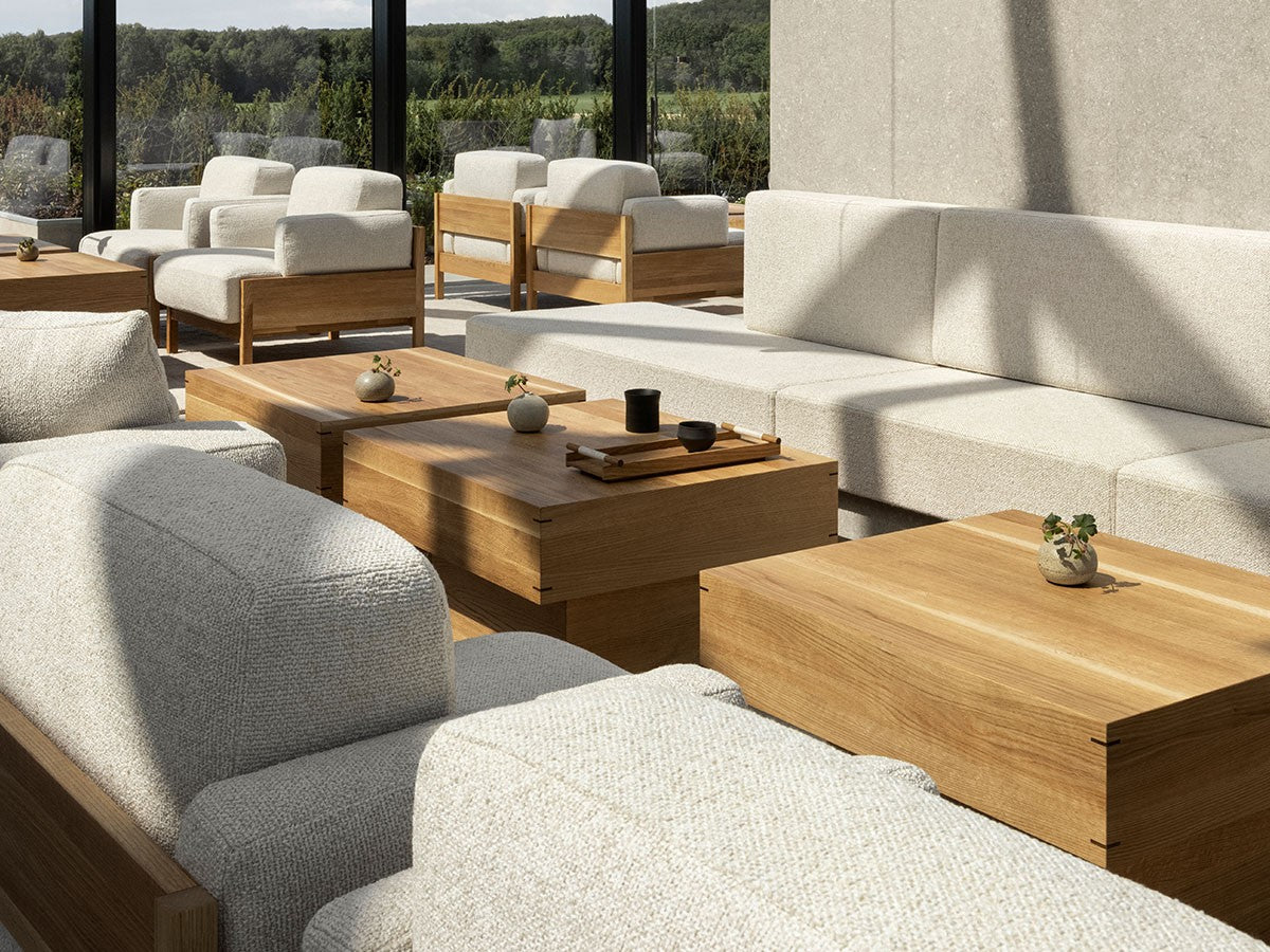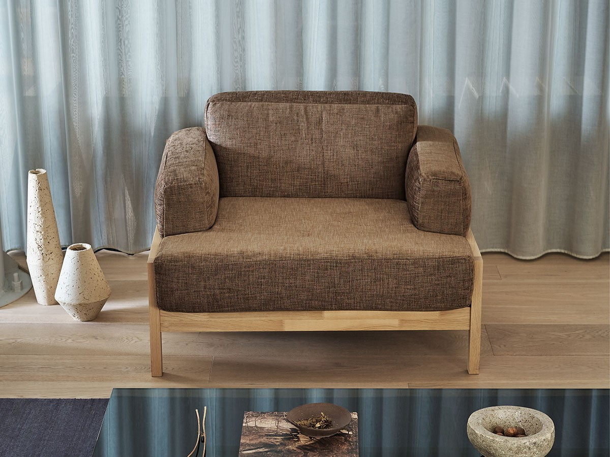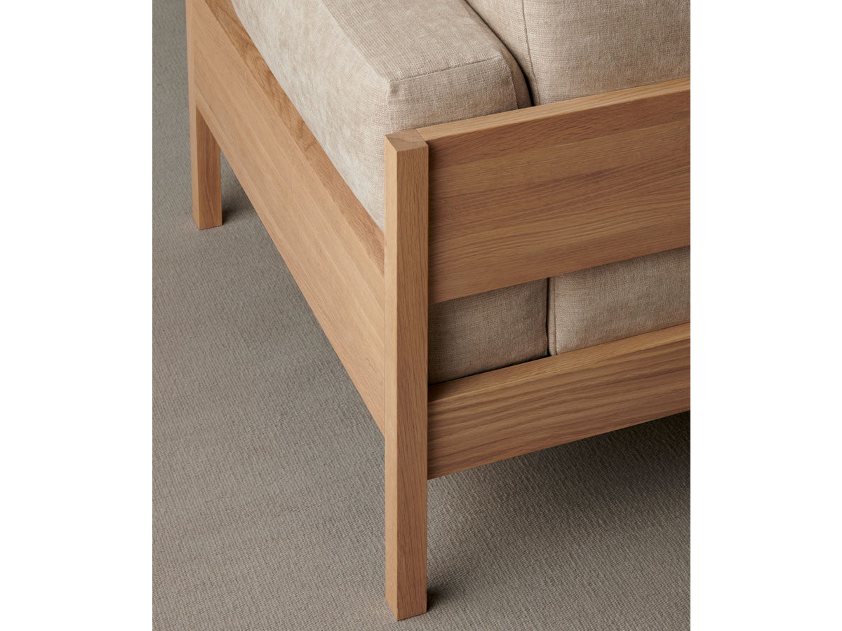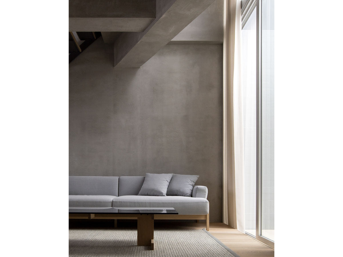日本建築に見られる水平と垂直のラインをデザインに活かしたロー&ワイドソファ。テーブルと同じ構造をソファにも活用し、彫刻的な美しさとリラックスした雰囲気を持たせています。ハイテクな木工技術と職人の手仕事との融合が水平ラインと垂直ラインの美をより際立たせます。座面クッション下の木桟は積層巾剥集成材を採用し、縦継ぎ目のない美しい素材使いです。高さを空間にあわせて低めに設定しているため、圧迫感を感じさせません。座面は、着座時の感触にもこだわったウレタンフォーム・綿の6層構造。メンテナンスが可能なカバーリング仕様です。