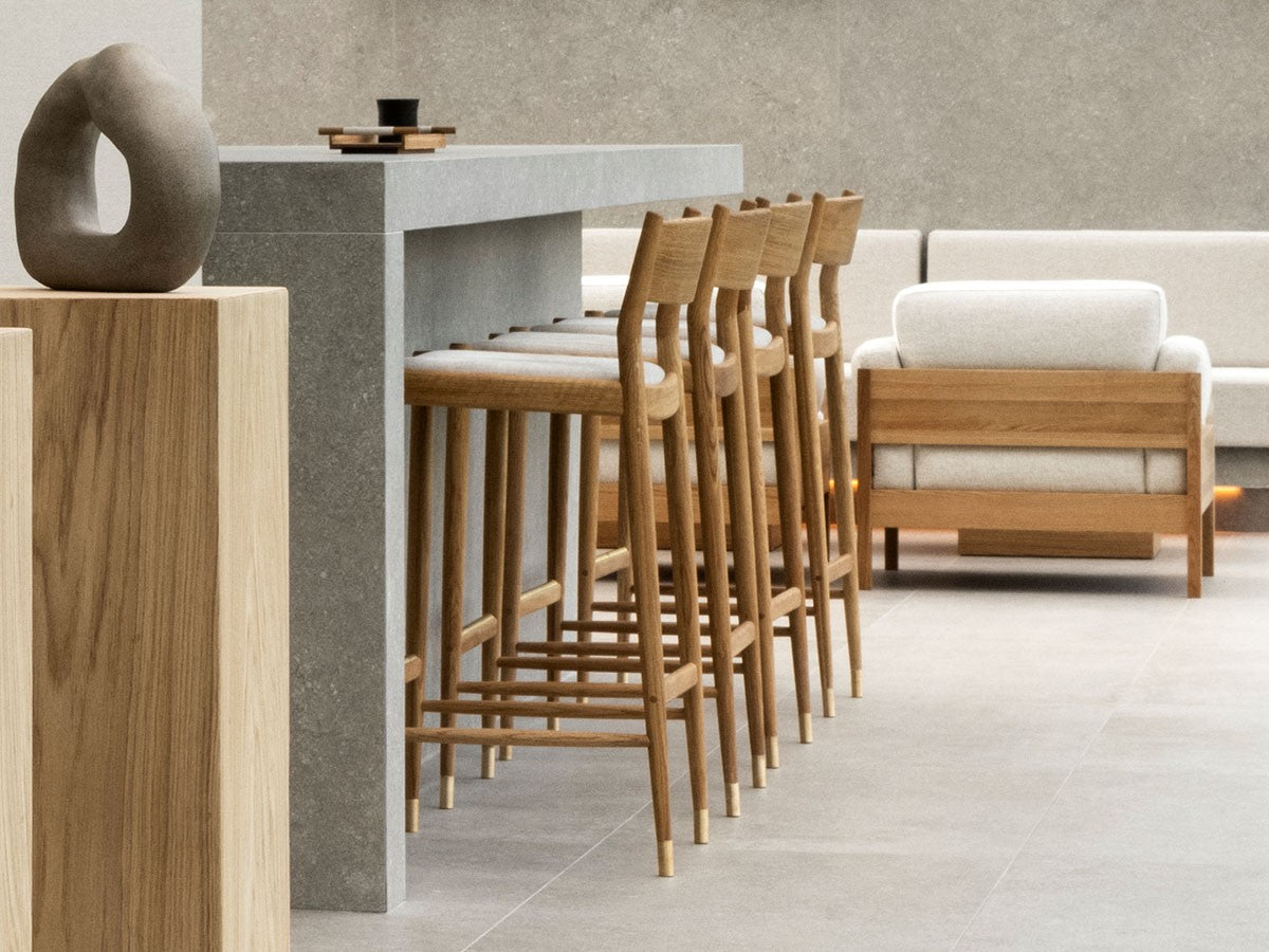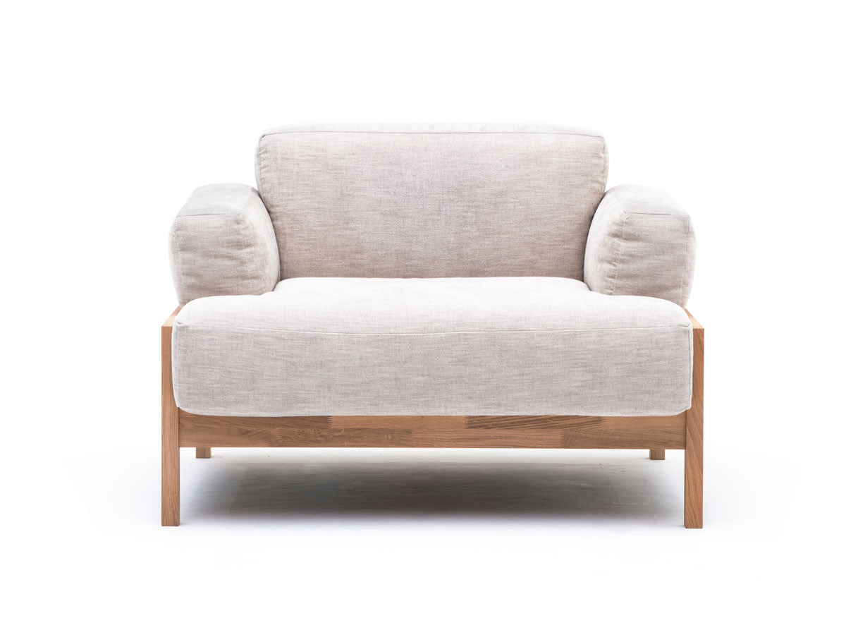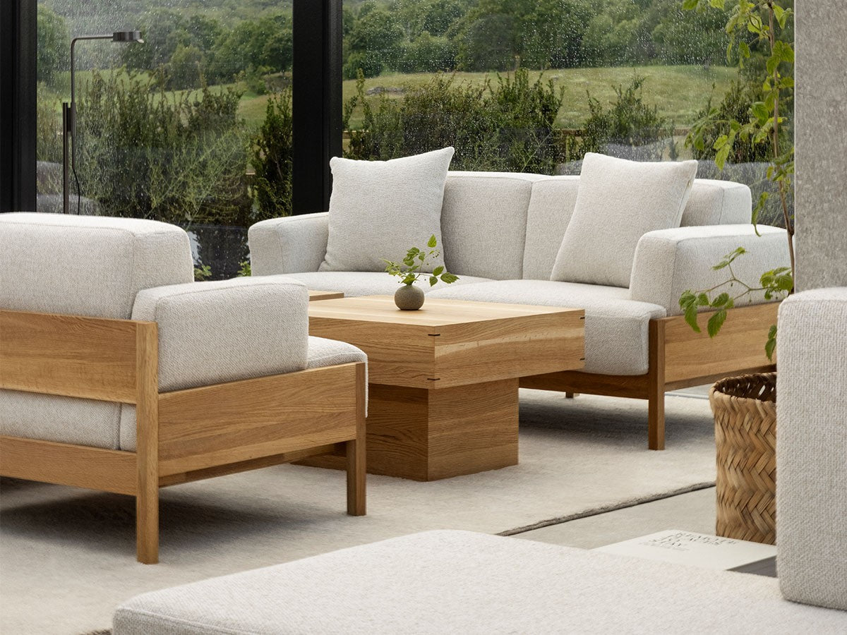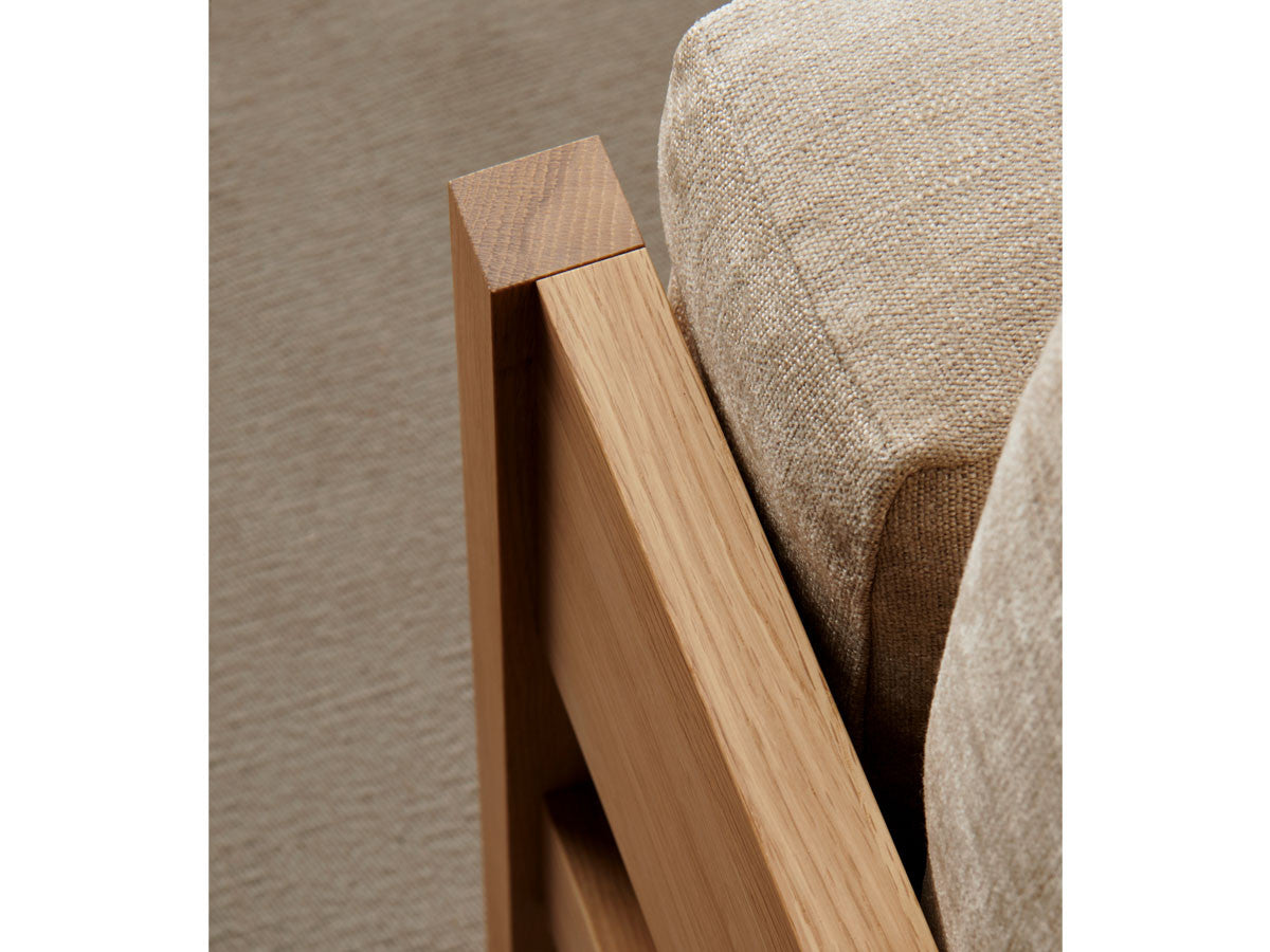 日本建築に見られる水平と垂直のラインをデザインに活かしたロー&ワイドソファ。テーブルと同じ構造をソファにも活用し、彫刻的な美しさとリラックスした雰囲気を持たせています。ハイテクな木工技術と職人の手仕事との融合が水平ラインと垂直ラインの美をより際立たせます。座面クッション下の木桟は積層巾剥集成材を採用し、縦継ぎ目のない美しい素材使いです。高さを空間にあわせて低めに設定しているため、圧迫感を感じさせません。座面は、着座時の感触にもこだわったウレタンフォーム・綿の6層構造。メンテナンスが可能なカバーリング仕様です。