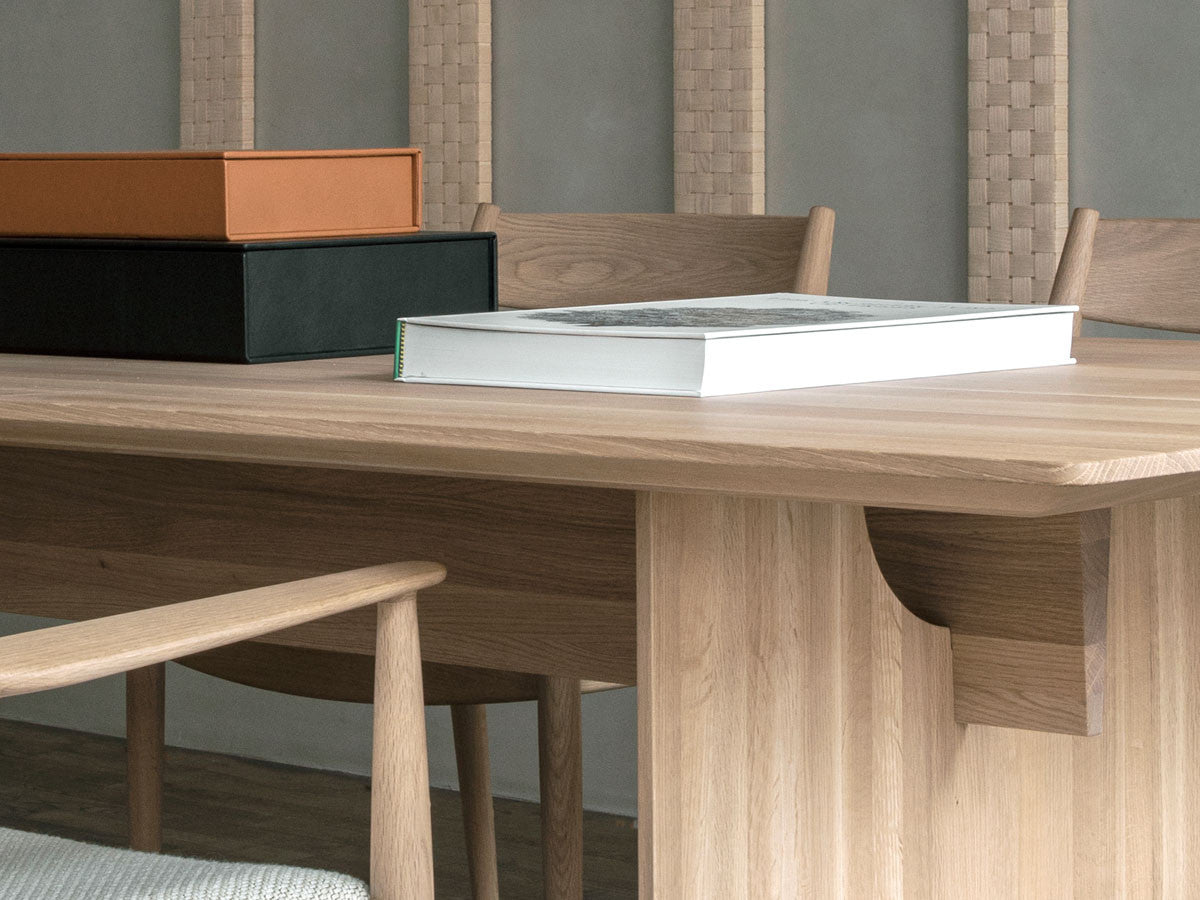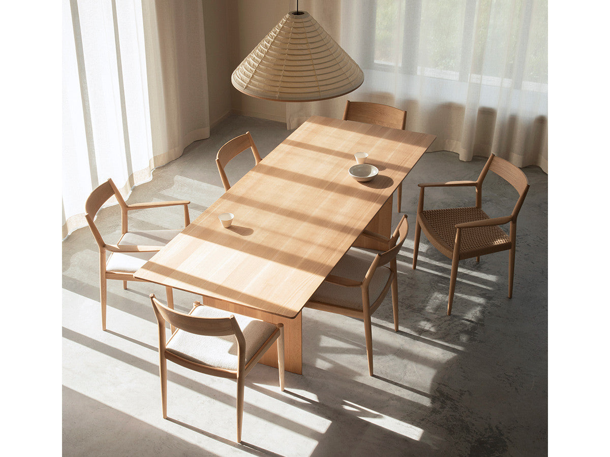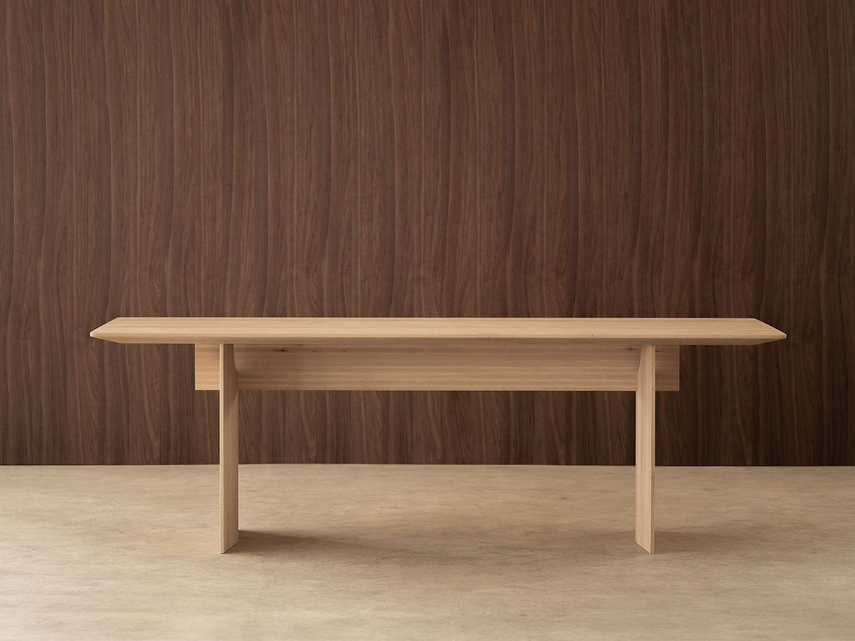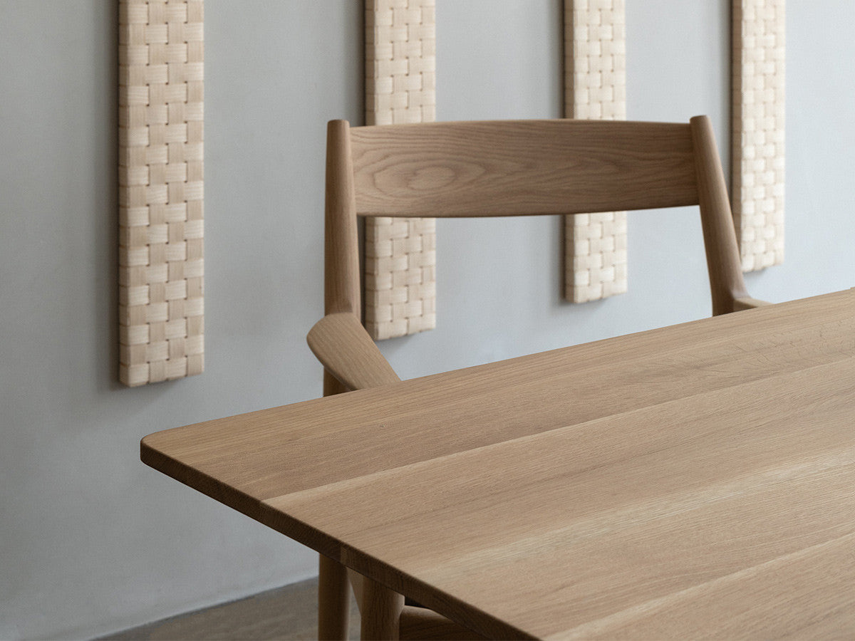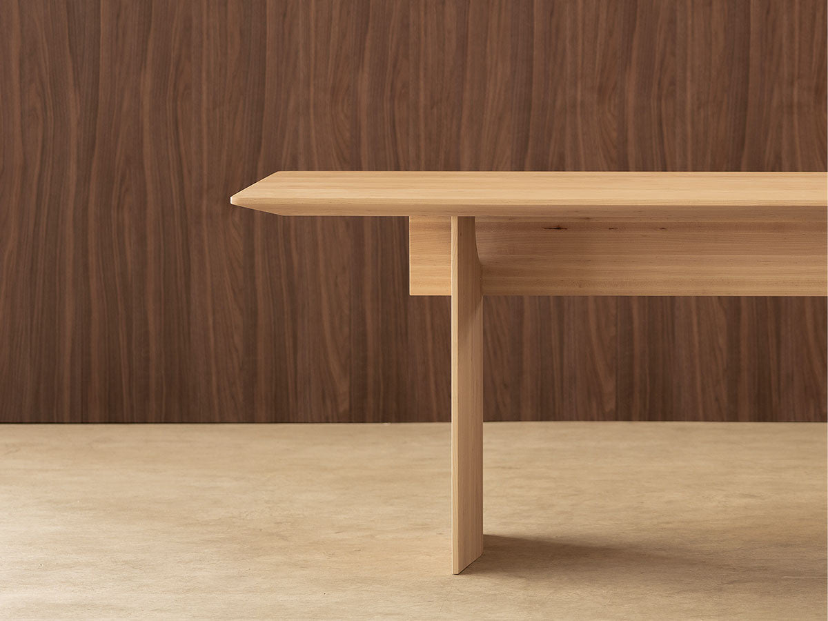 軽さと重さを感じさせるそれぞれの要素のバランスが美しい、木の枝を想起させるダイニングテーブルです。特定の角度から見れば薄く軽い印象を与えますが、機能的で頑丈な側面も感じさせます。ノーム・アーキテクツの他の建築と同様に、影が描き出す空間が意識されています。家具の中に光が差し込むことで、素材やディテールが強調されます。天板は巾剥集成材のナチュラルな素材感を重視。脚部分は、組立金具を表面に見せないこだわりの組構造を採用しています。ご自宅からオフィスシーンまで幅広く対応する4サイズ展開です。
