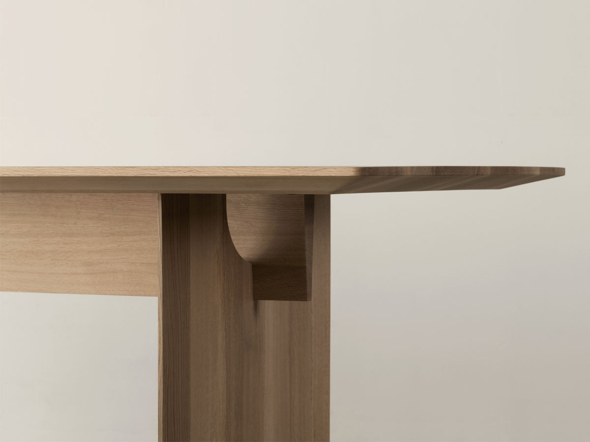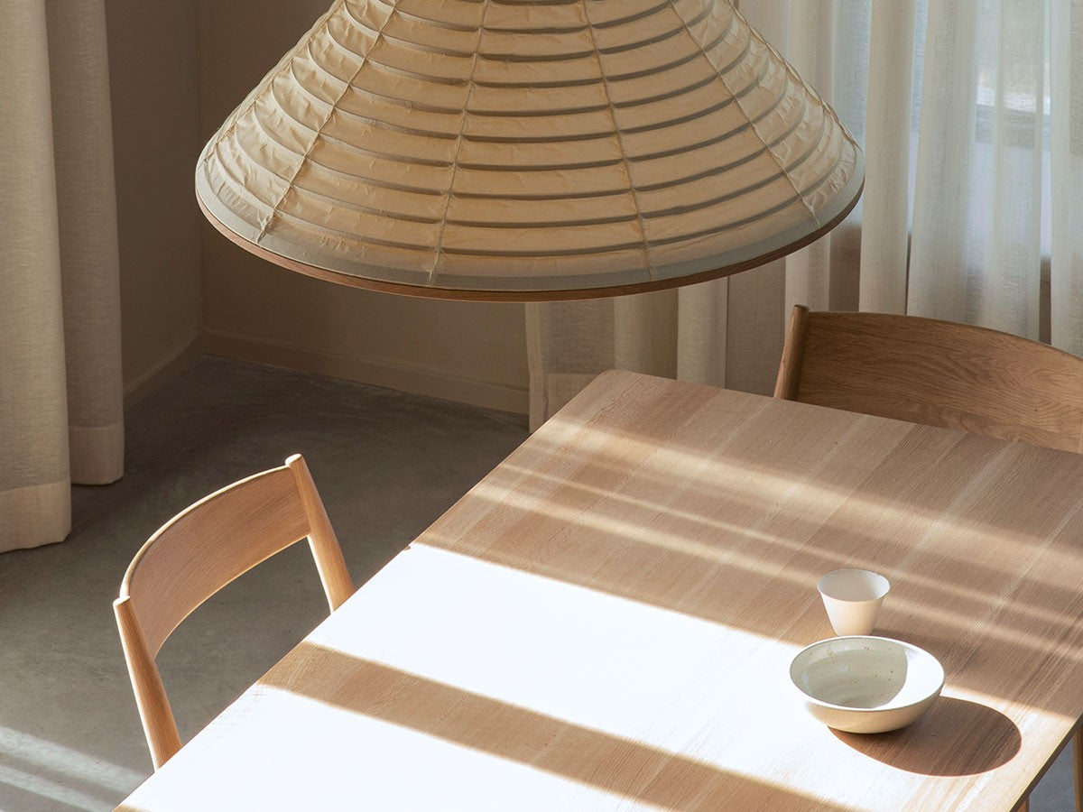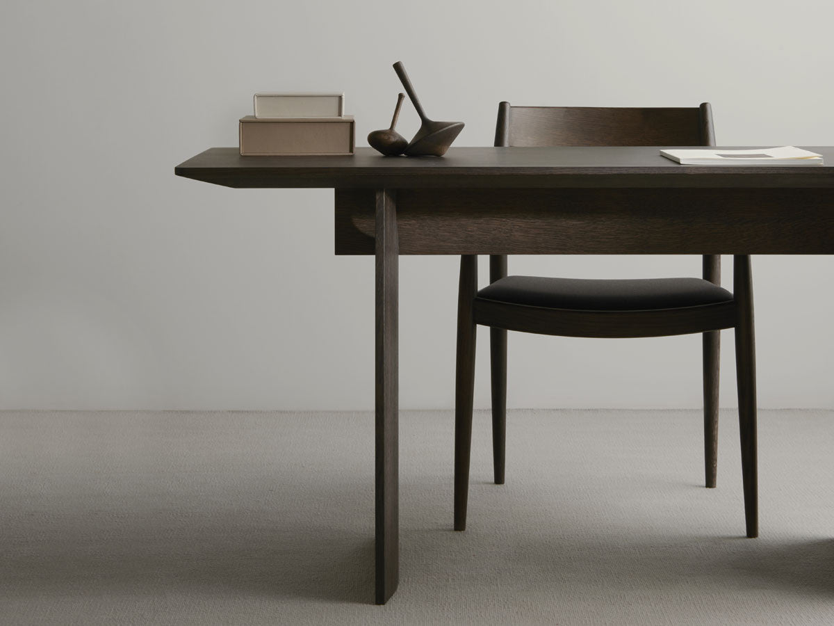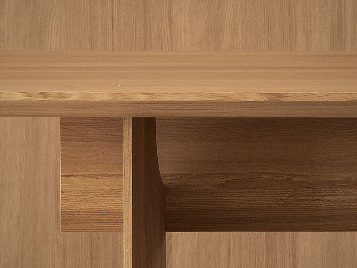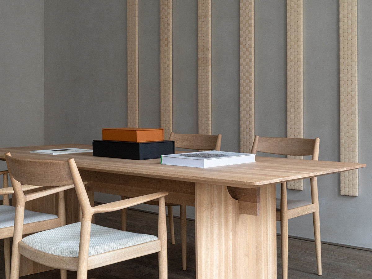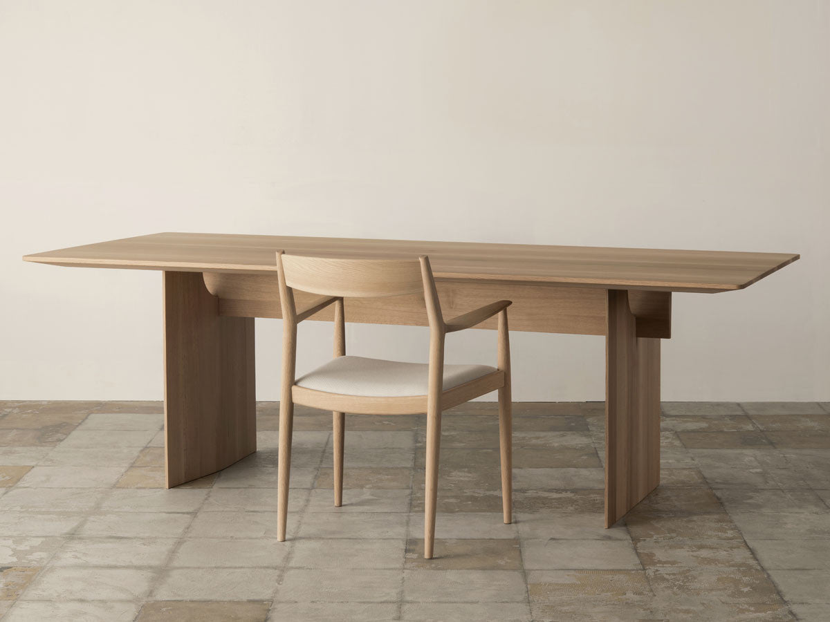 軽さと重さを感じさせるそれぞれの要素のバランスが美しい、木の枝を想起させるダイニングテーブルです。特定の角度から見れば薄く軽い印象を与えますが、機能的で頑丈な側面も感じさせます。ノーム・アーキテクツの他の建築と同様に、影が描き出す空間が意識されています。家具の中に光が差し込むことで、素材やディテールが強調されます。天板は巾剥集成材のナチュラルな素材感を重視。脚部分は、組立金具を表面に見せないこだわりの組構造を採用しています。ご自宅からオフィスシーンまで幅広く対応する4サイズ展開です。