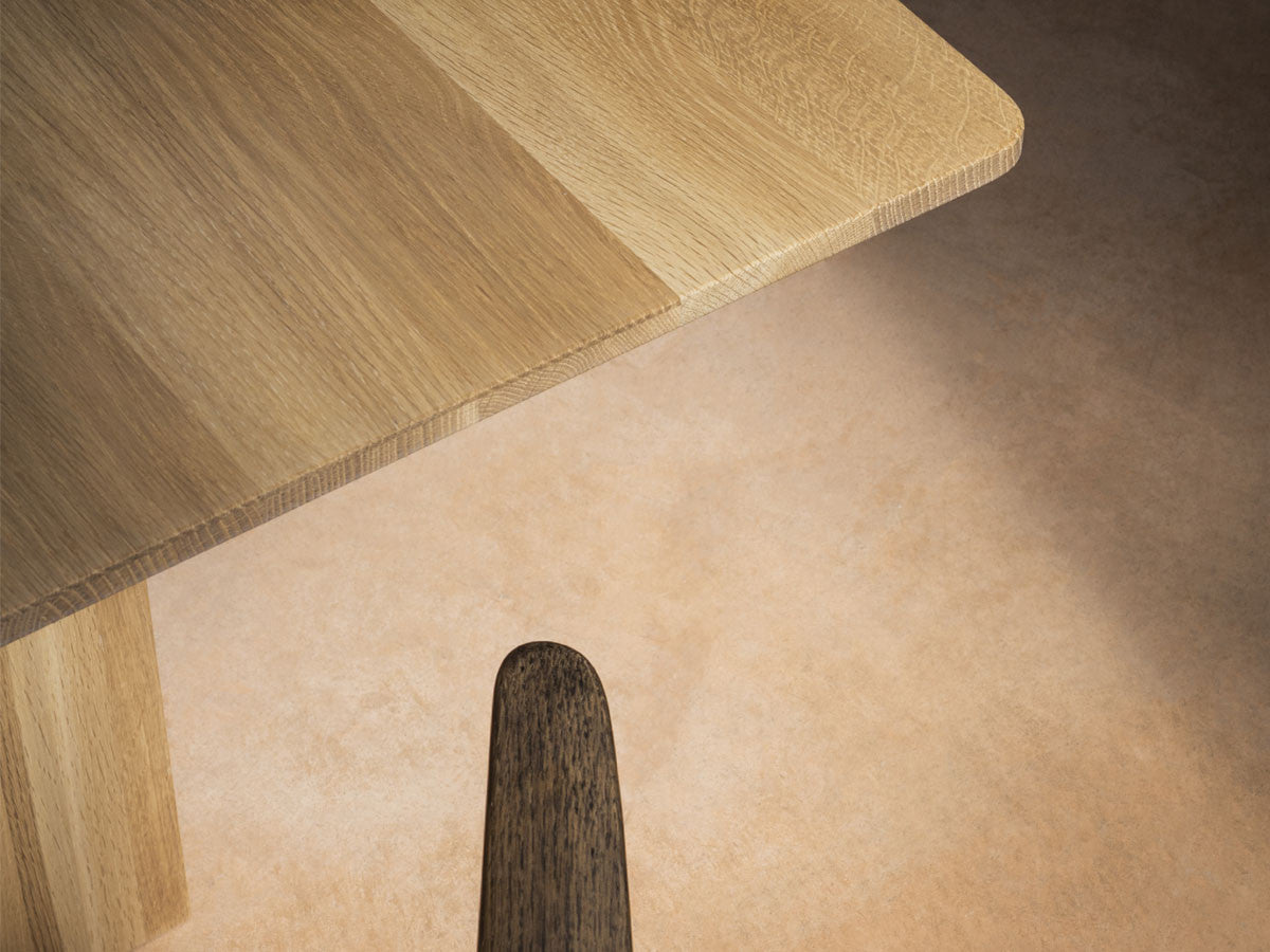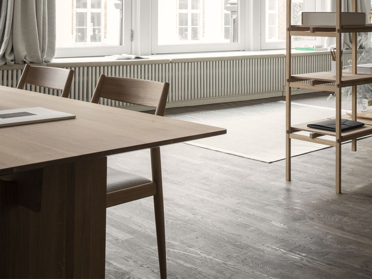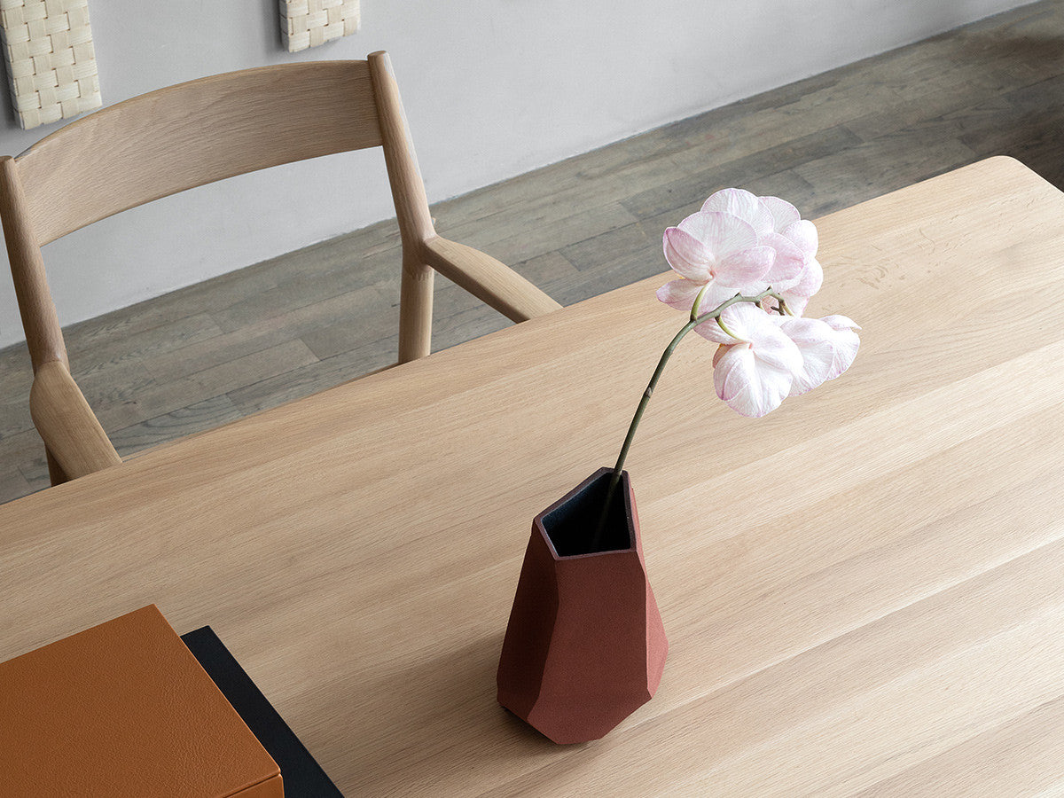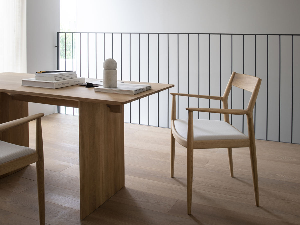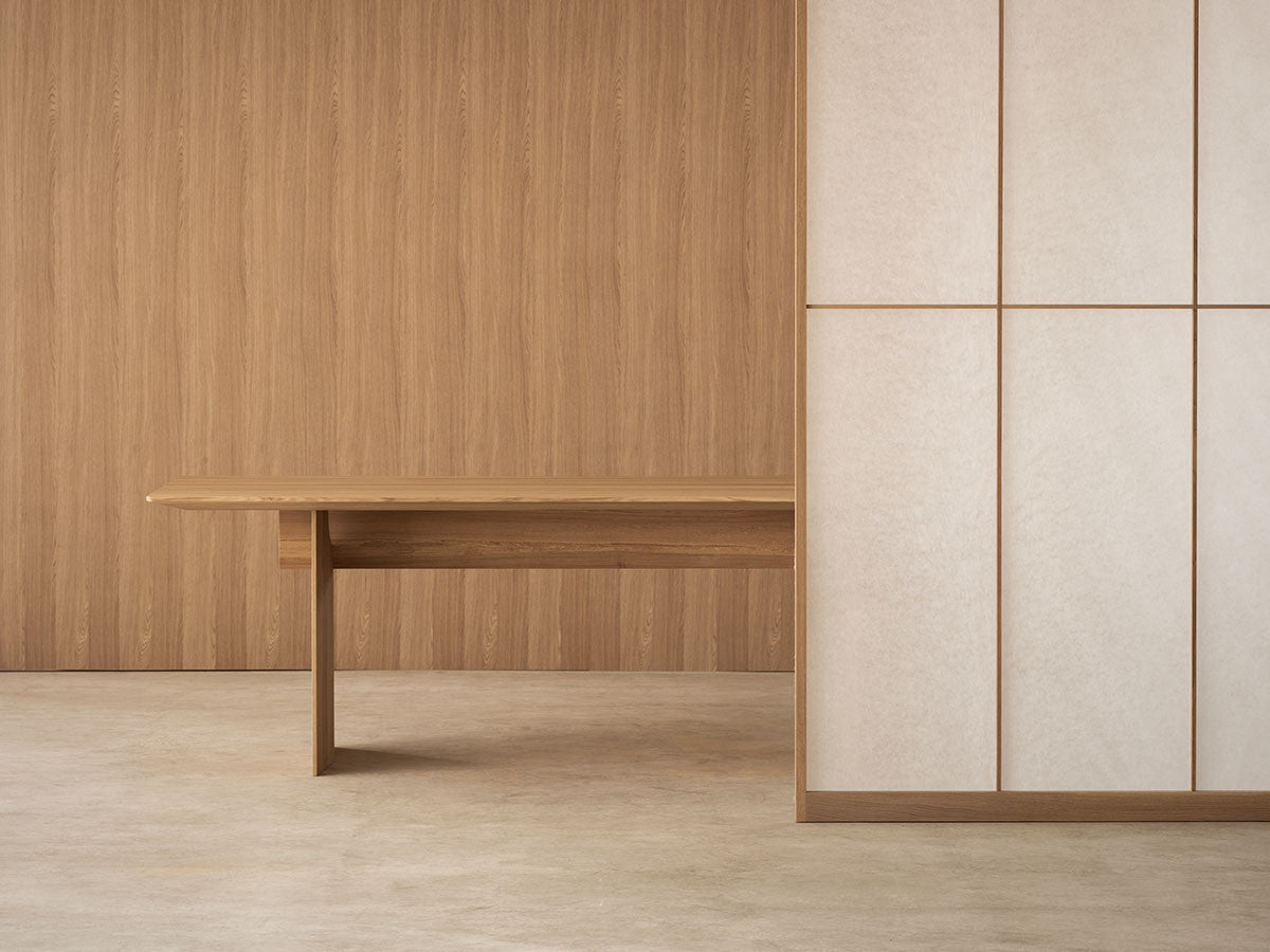 軽さと重さを感じさせるそれぞれの要素のバランスが美しい、木の枝を想起させるダイニングテーブルです。特定の角度から見れば薄く軽い印象を与えますが、機能的で頑丈な側面も感じさせます。ノーム・アーキテクツの他の建築と同様に、影が描き出す空間が意識されています。家具の中に光が差し込むことで、素材やディテールが強調されます。天板は巾剥集成材のナチュラルな素材感を重視。脚部分は、組立金具を表面に見せないこだわりの組構造を採用しています。ご自宅からオフィスシーンまで幅広く対応する4サイズ展開です。
