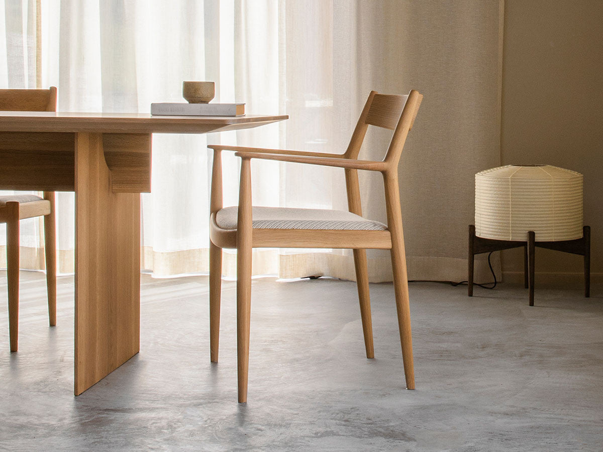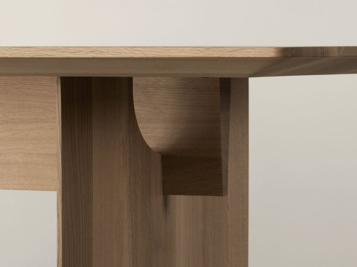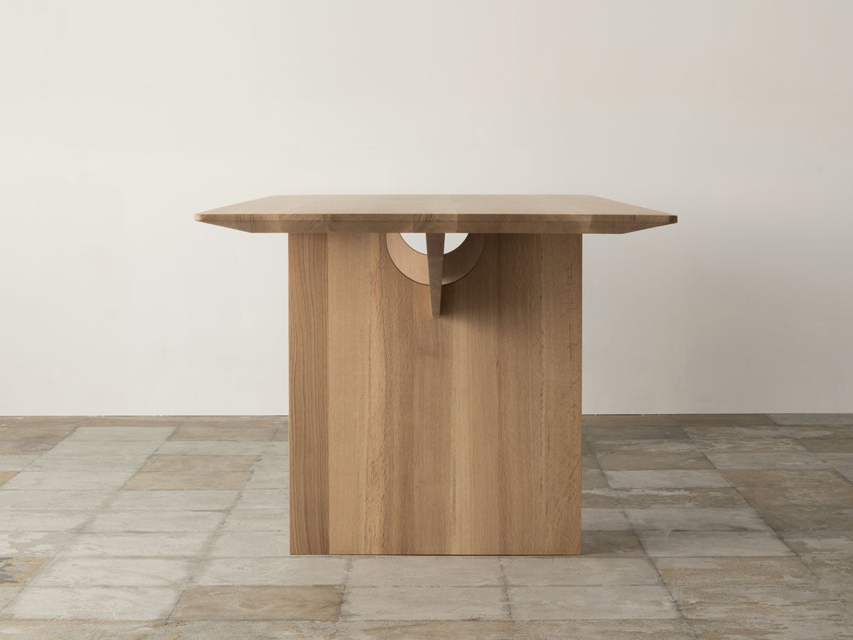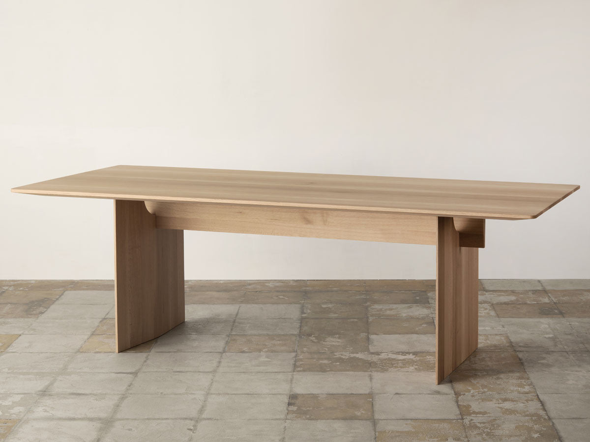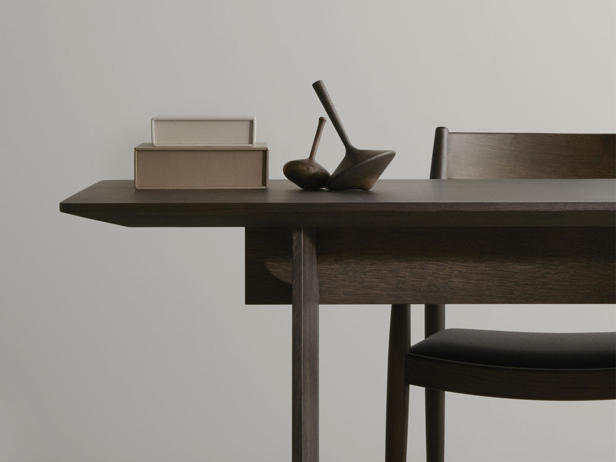 軽さと重さを感じさせるそれぞれの要素のバランスが美しい、木の枝を想起させるダイニングテーブルです。特定の角度から見れば薄く軽い印象を与えますが、機能的で頑丈な側面も感じさせます。ノーム・アーキテクツの他の建築と同様に、影が描き出す空間が意識されています。家具の中に光が差し込むことで、素材やディテールが強調されます。天板は巾剥集成材のナチュラルな素材感を重視。脚部分は、組立金具を表面に見せないこだわりの組構造を採用しています。ご自宅からオフィスシーンまで幅広く対応する4サイズ展開です。