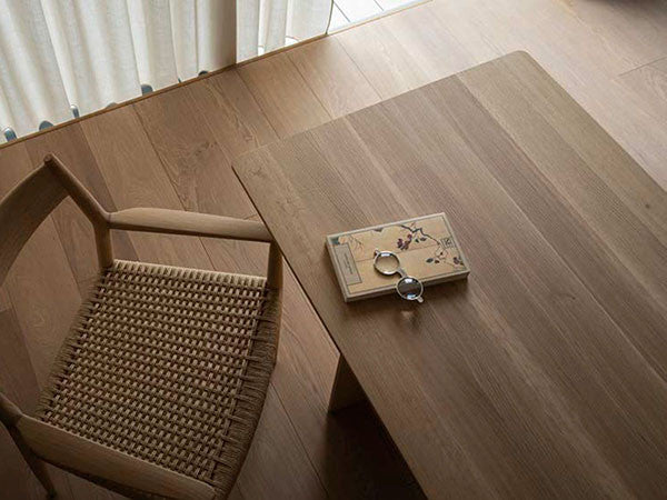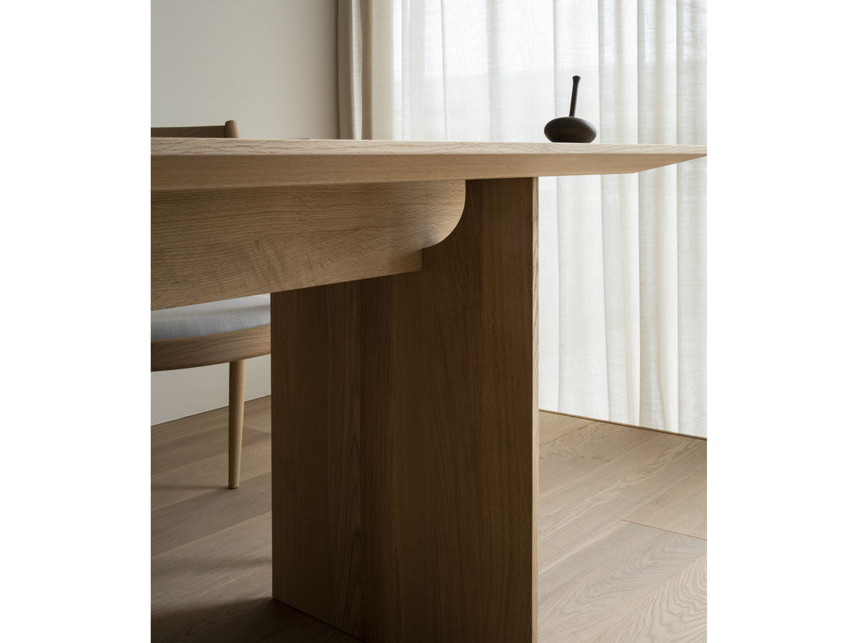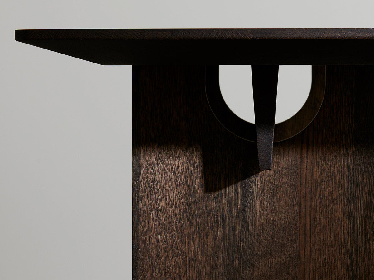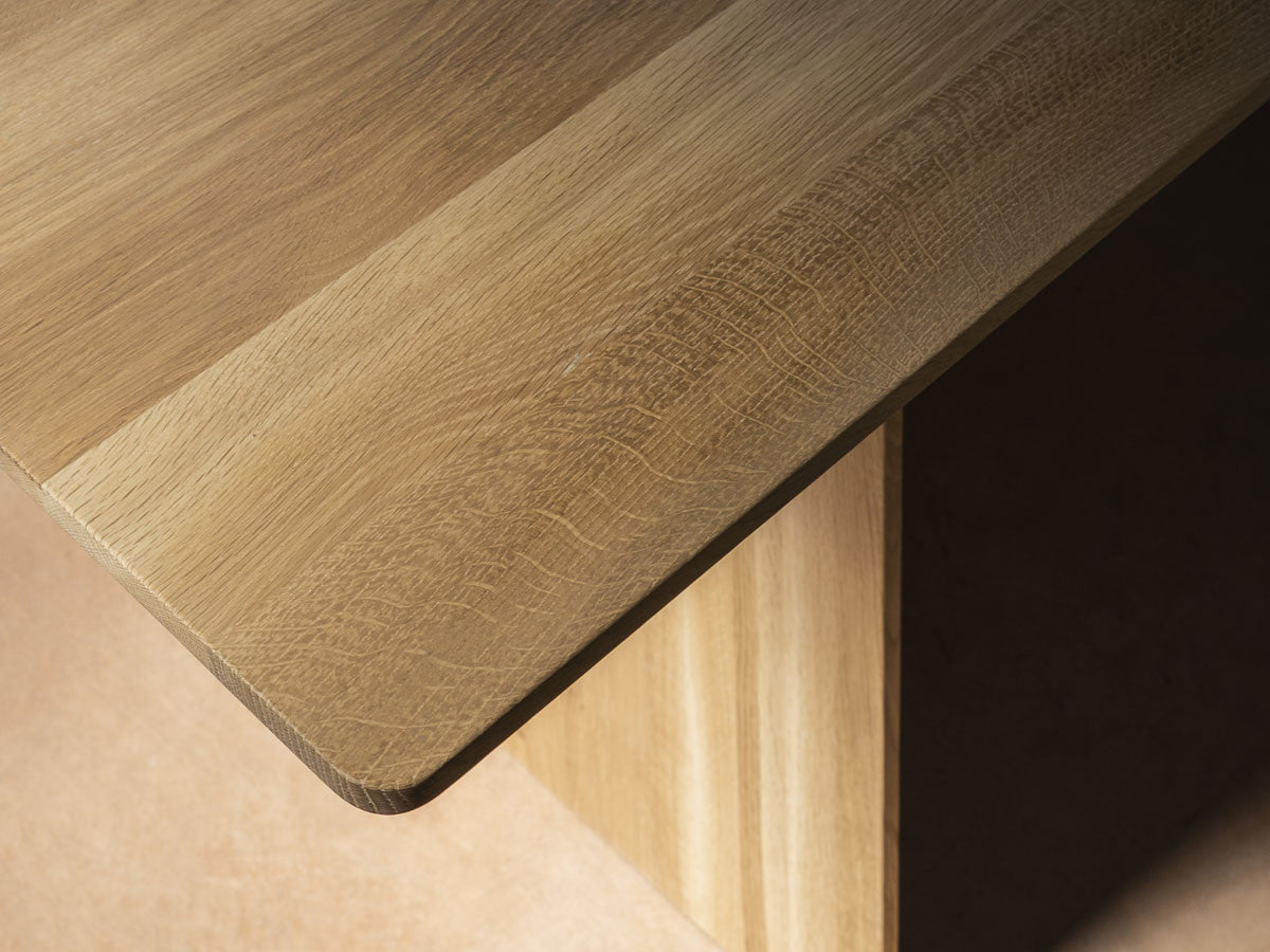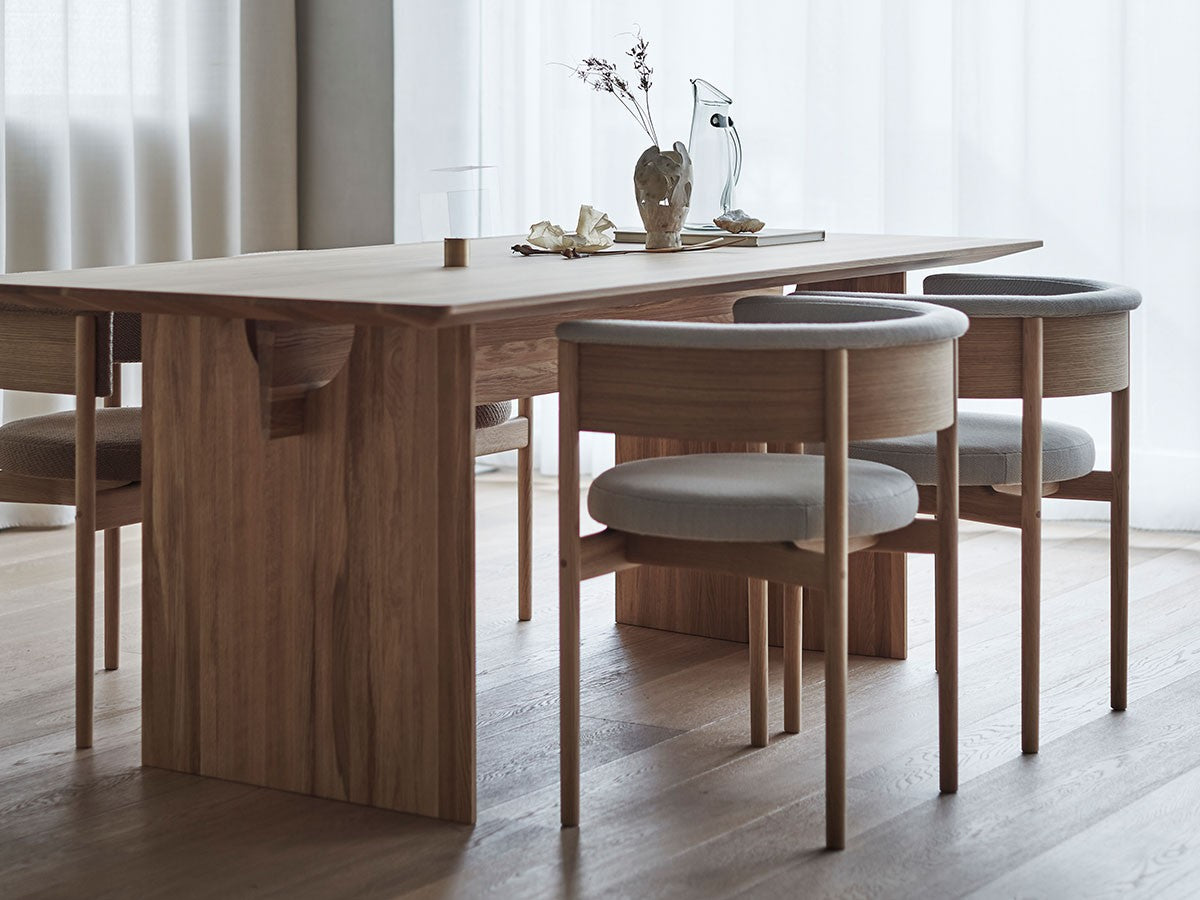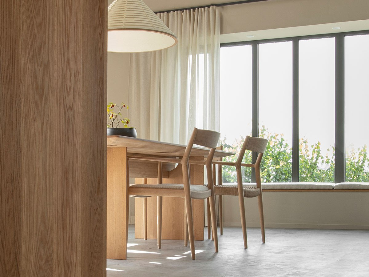 軽さと重さを感じさせるそれぞれの要素のバランスが美しい、木の枝を想起させるダイニングテーブルです。特定の角度から見れば薄く軽い印象を与えますが、機能的で頑丈な側面も感じさせます。ノーム・アーキテクツの他の建築と同様に、影が描き出す空間が意識されています。家具の中に光が差し込むことで、素材やディテールが強調されます。天板は巾剥集成材のナチュラルな素材感を重視。脚部分は、組立金具を表面に見せないこだわりの組構造を採用しています。ご自宅からオフィスシーンまで幅広く対応する4サイズ展開です。