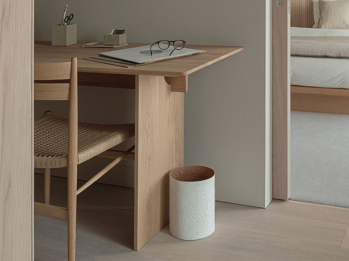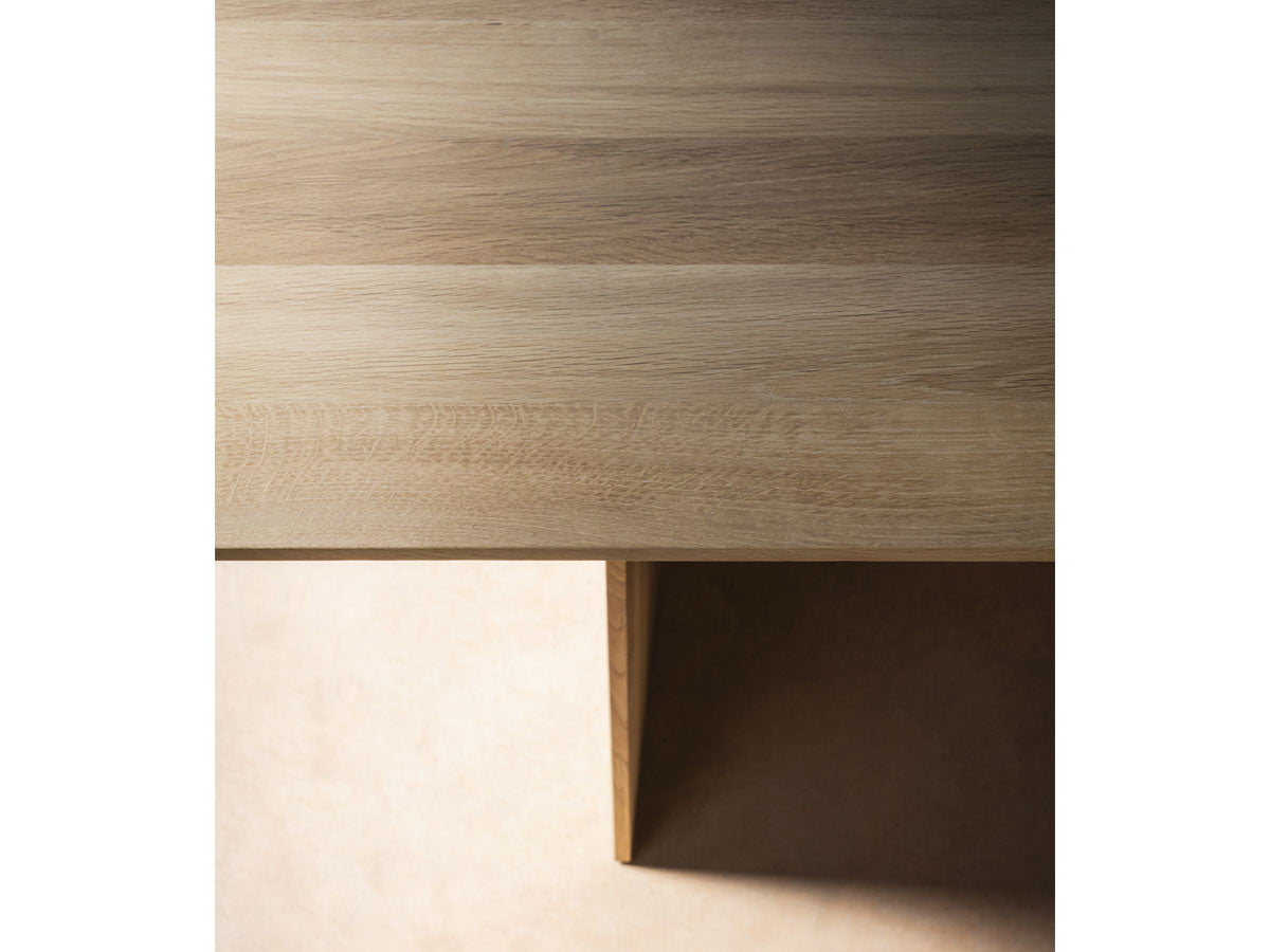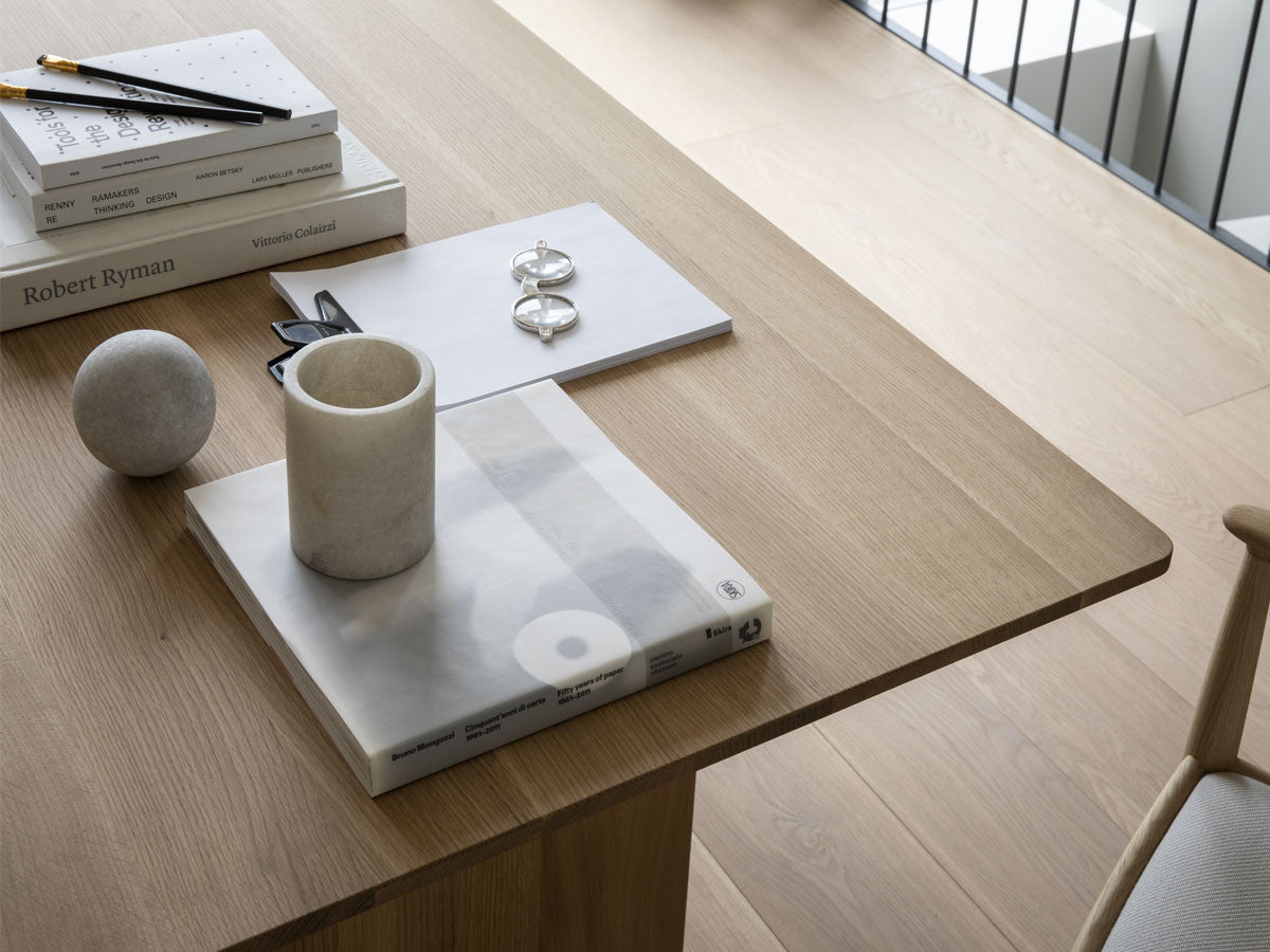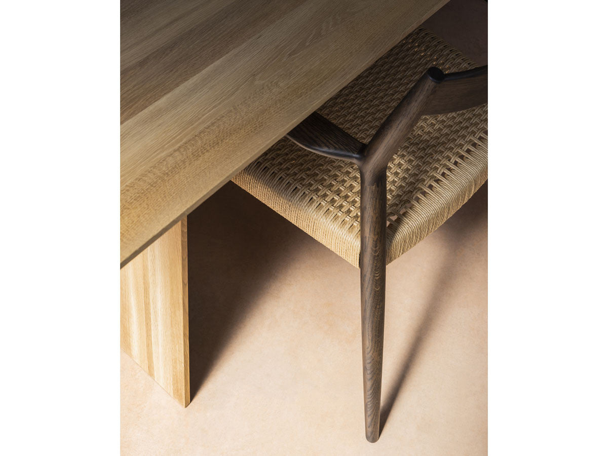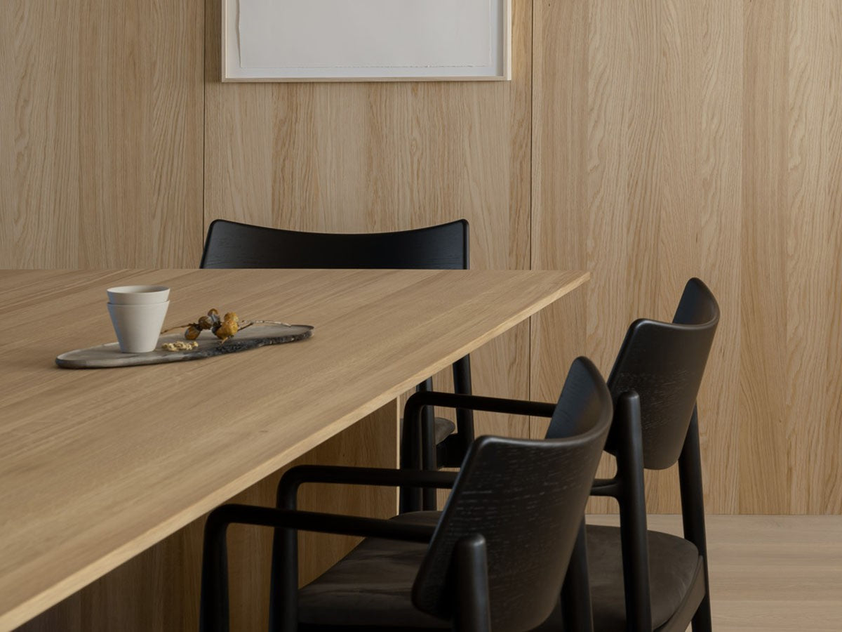 軽さと重さを感じさせるそれぞれの要素のバランスが美しい、木の枝を想起させるダイニングテーブルです。特定の角度から見れば薄く軽い印象を与えますが、機能的で頑丈な側面も感じさせます。ノーム・アーキテクツの他の建築と同様に、影が描き出す空間が意識されています。家具の中に光が差し込むことで、素材やディテールが強調されます。天板は巾剥集成材のナチュラルな素材感を重視。脚部分は、組立金具を表面に見せないこだわりの組構造を採用しています。ご自宅からオフィスシーンまで幅広く対応する4サイズ展開です。