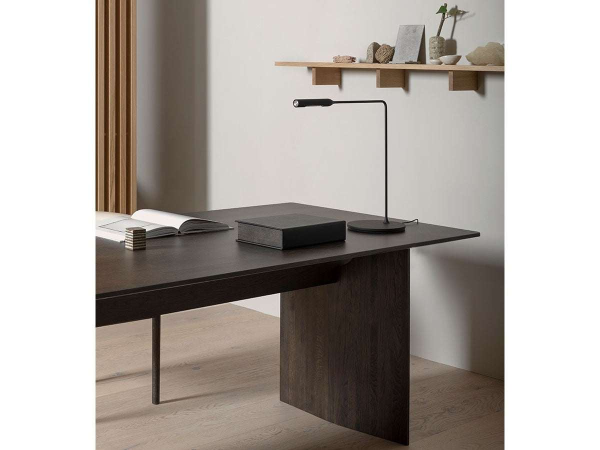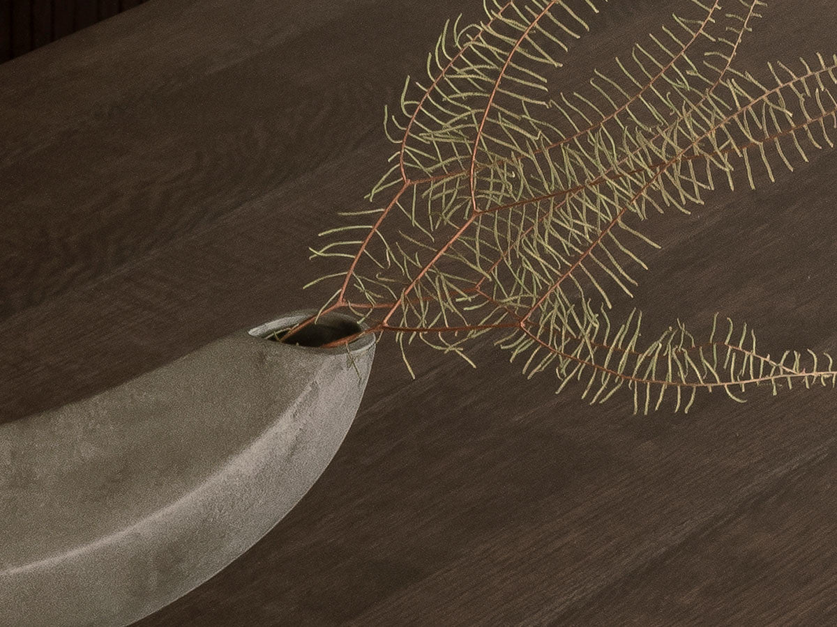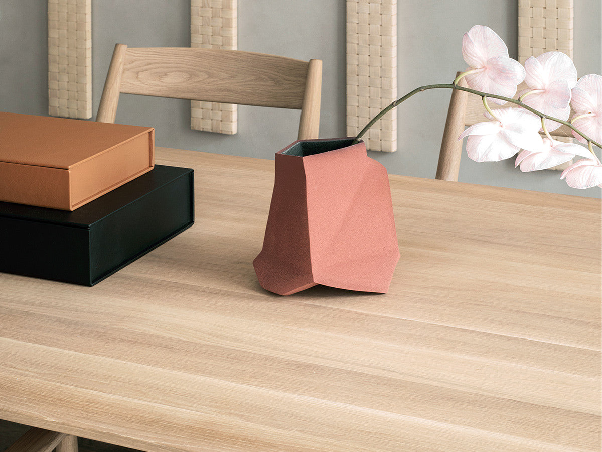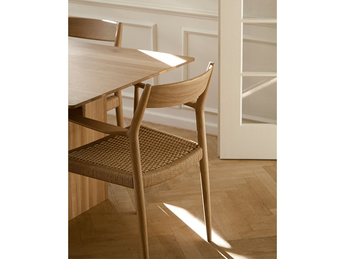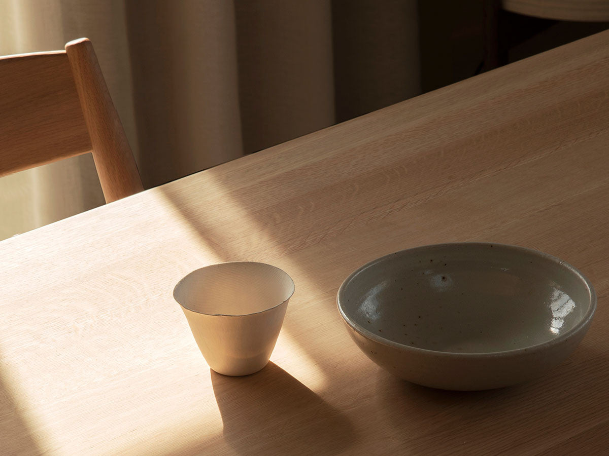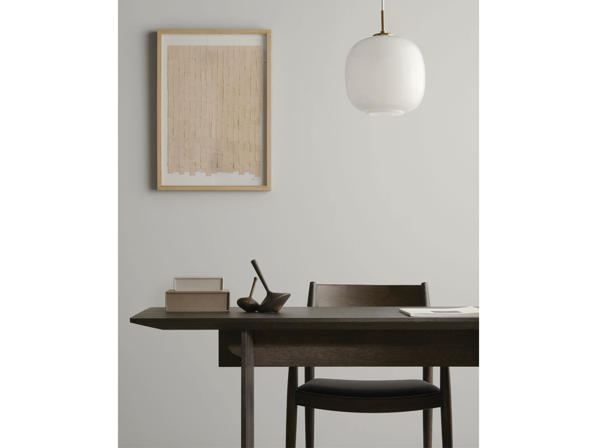 軽さと重さを感じさせるそれぞれの要素のバランスが美しい、木の枝を想起させるダイニングテーブルです。特定の角度から見れば薄く軽い印象を与えますが、機能的で頑丈な側面も感じさせます。ノーム・アーキテクツの他の建築と同様に、影が描き出す空間が意識されています。家具の中に光が差し込むことで、素材やディテールが強調されます。天板は巾剥集成材のナチュラルな素材感を重視。脚部分は、組立金具を表面に見せないこだわりの組構造を採用しています。ご自宅からオフィスシーンまで幅広く対応する4サイズ展開です。
