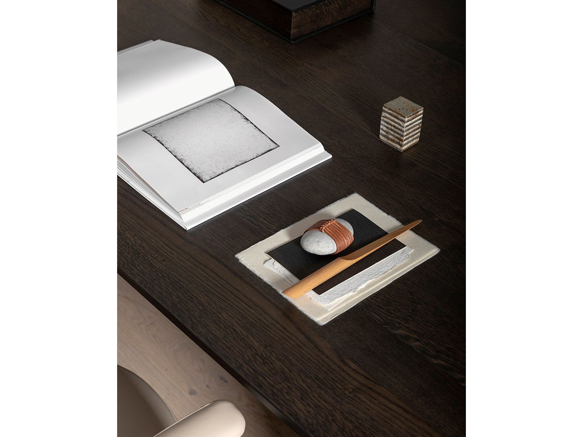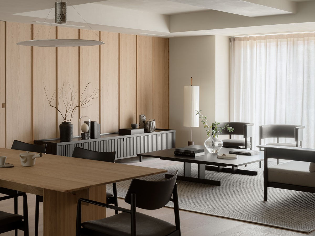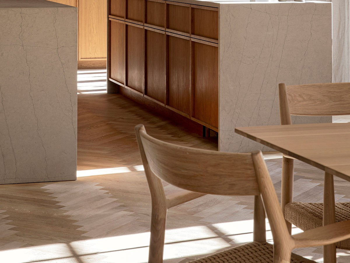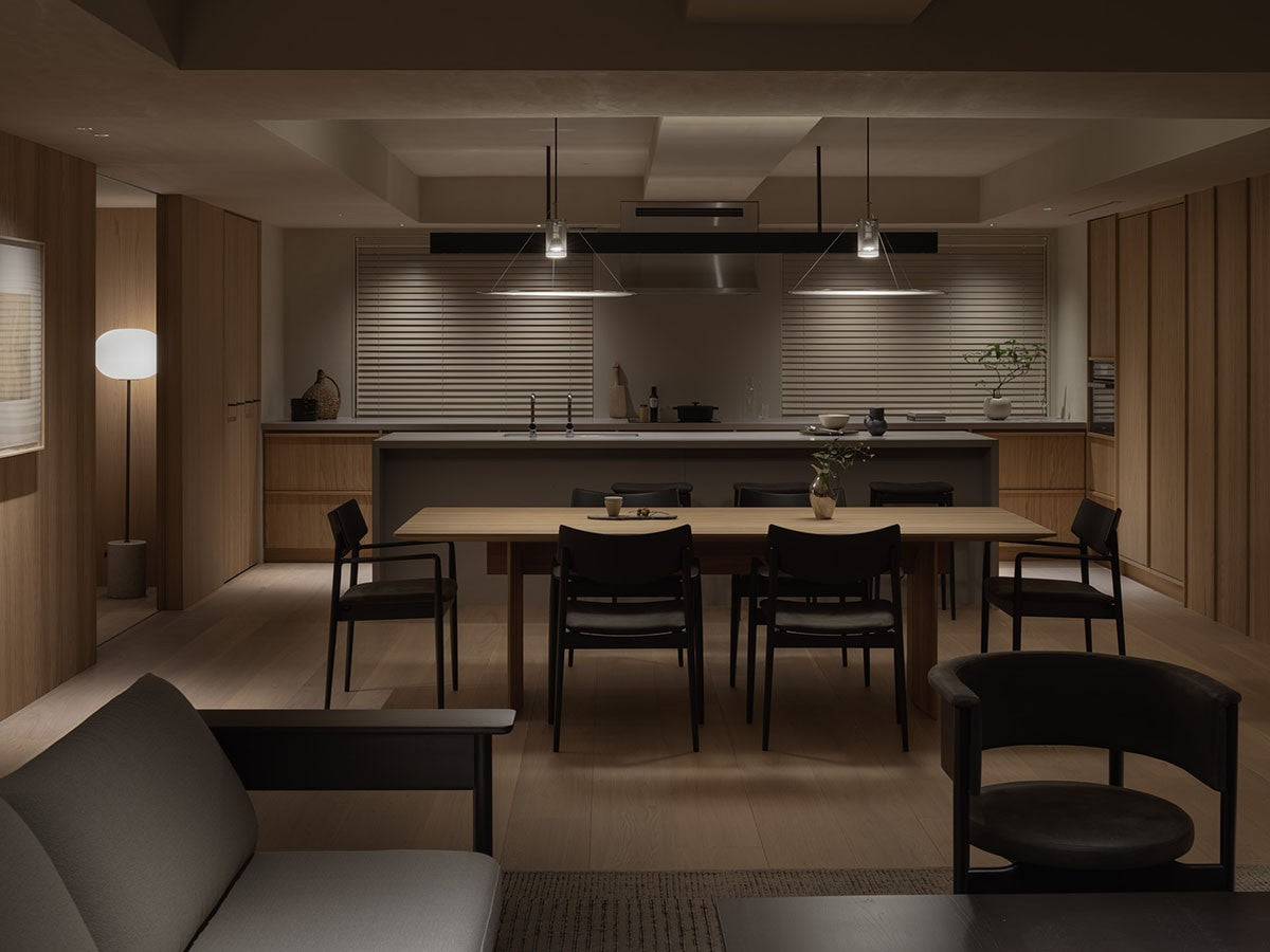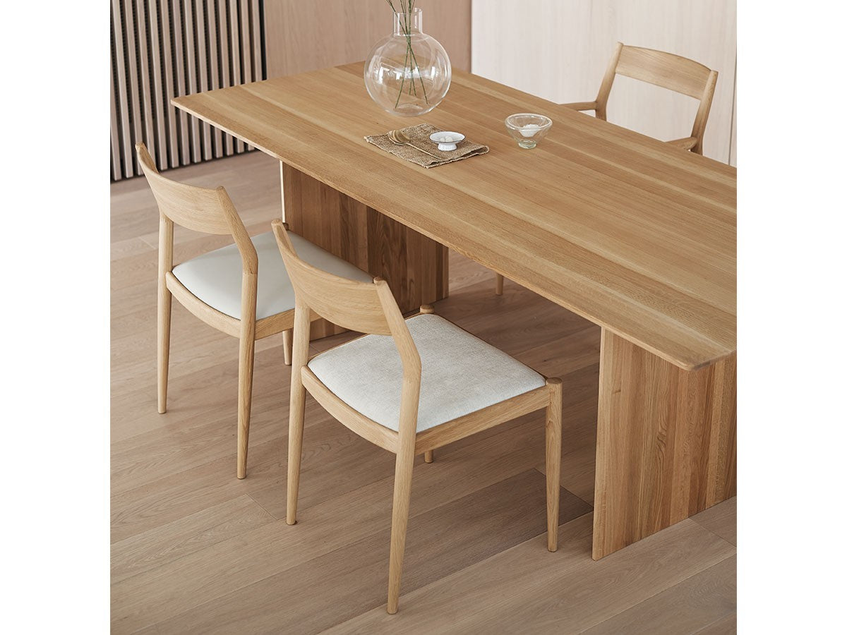 軽さと重さを感じさせるそれぞれの要素のバランスが美しい、木の枝を想起させるダイニングテーブルです。特定の角度から見れば薄く軽い印象を与えますが、機能的で頑丈な側面も感じさせます。ノーム・アーキテクツの他の建築と同様に、影が描き出す空間が意識されています。家具の中に光が差し込むことで、素材やディテールが強調されます。天板は巾剥集成材のナチュラルな素材感を重視。脚部分は、組立金具を表面に見せないこだわりの組構造を採用しています。ご自宅からオフィスシーンまで幅広く対応する4サイズ展開です。