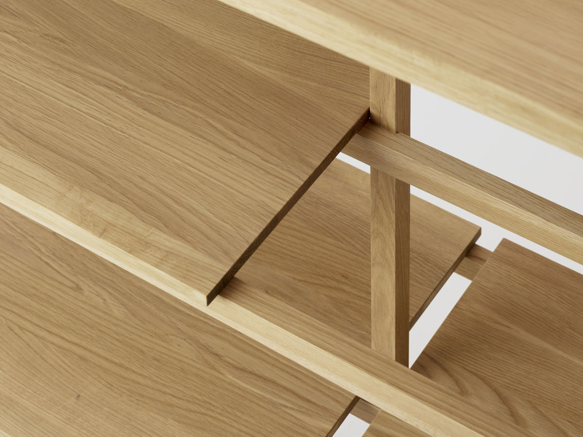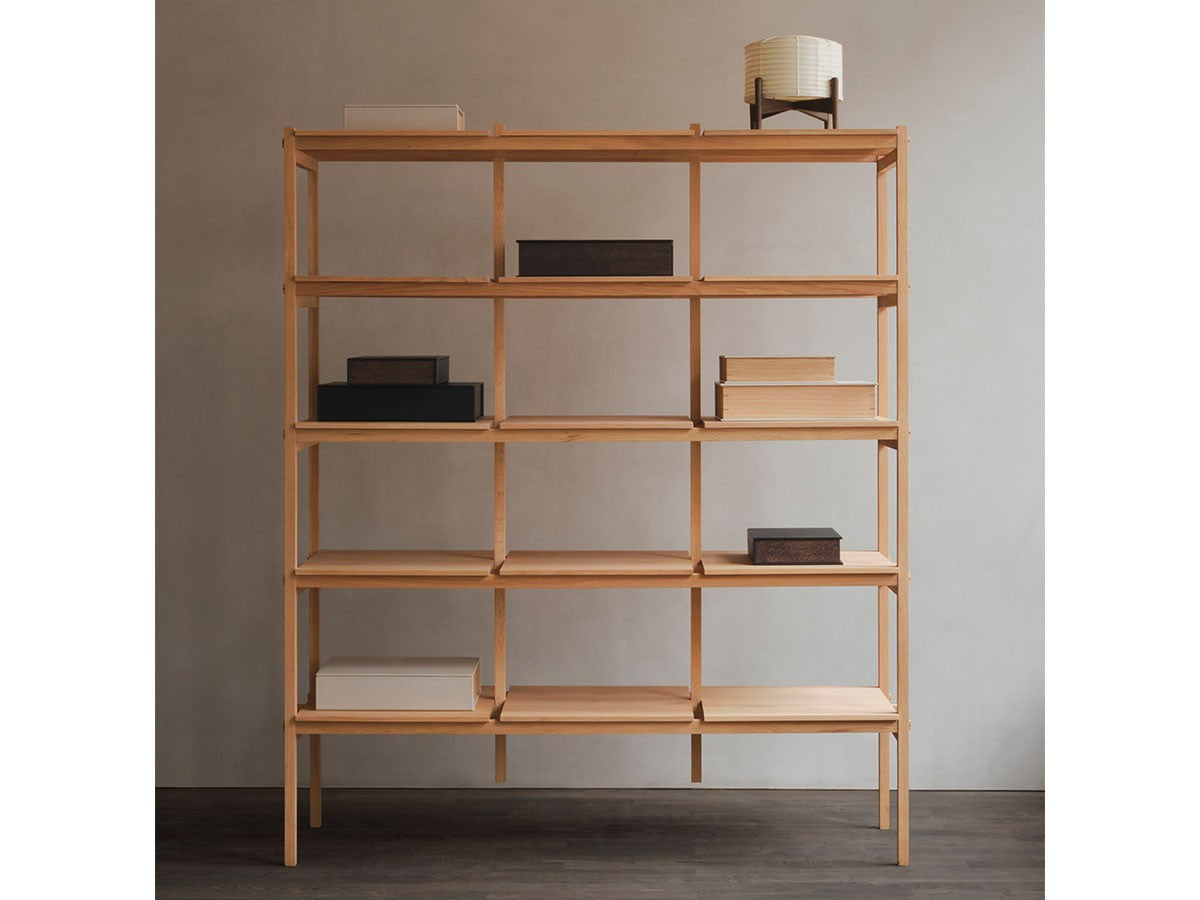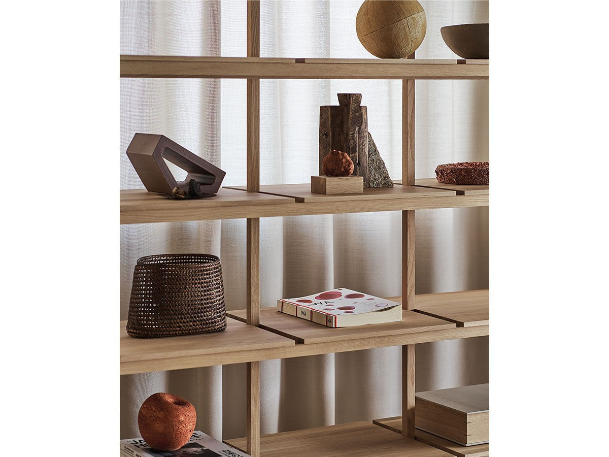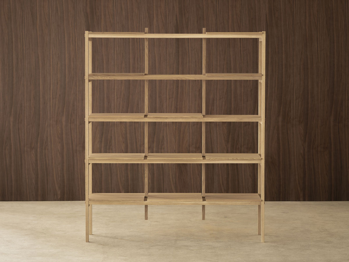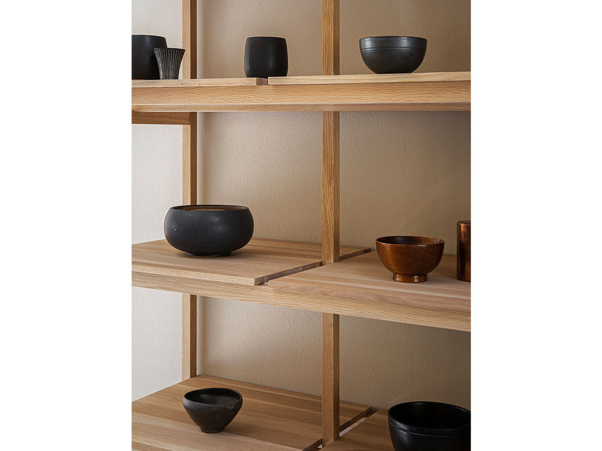 寺社仏閣の入り口に置かれた傘立てや下駄箱からインスピレーションを得て制作されたシェルフです。日本の伝統的な構造技術を活用し、一見しただけでは存在に気付きにくいブックエンドや取り外し可能な棚といった機能をさり気なく備えたシステムを実現しました。4箇所の固定棚以外は、すべて取り外しできる可動棚となっているため、デコレーションに変化をつけることができます。カリモクの精緻な木工技術により、可動棚は棚ダボなど金具を使用しない木組構造となっています。構造に光があたることによって、時間と共に空間に変化をつくり出します。噛み合わせた垂直と水平の桟組構造体がシェルフで発生しやすい揺れを防ぎ、強度を保ちます。