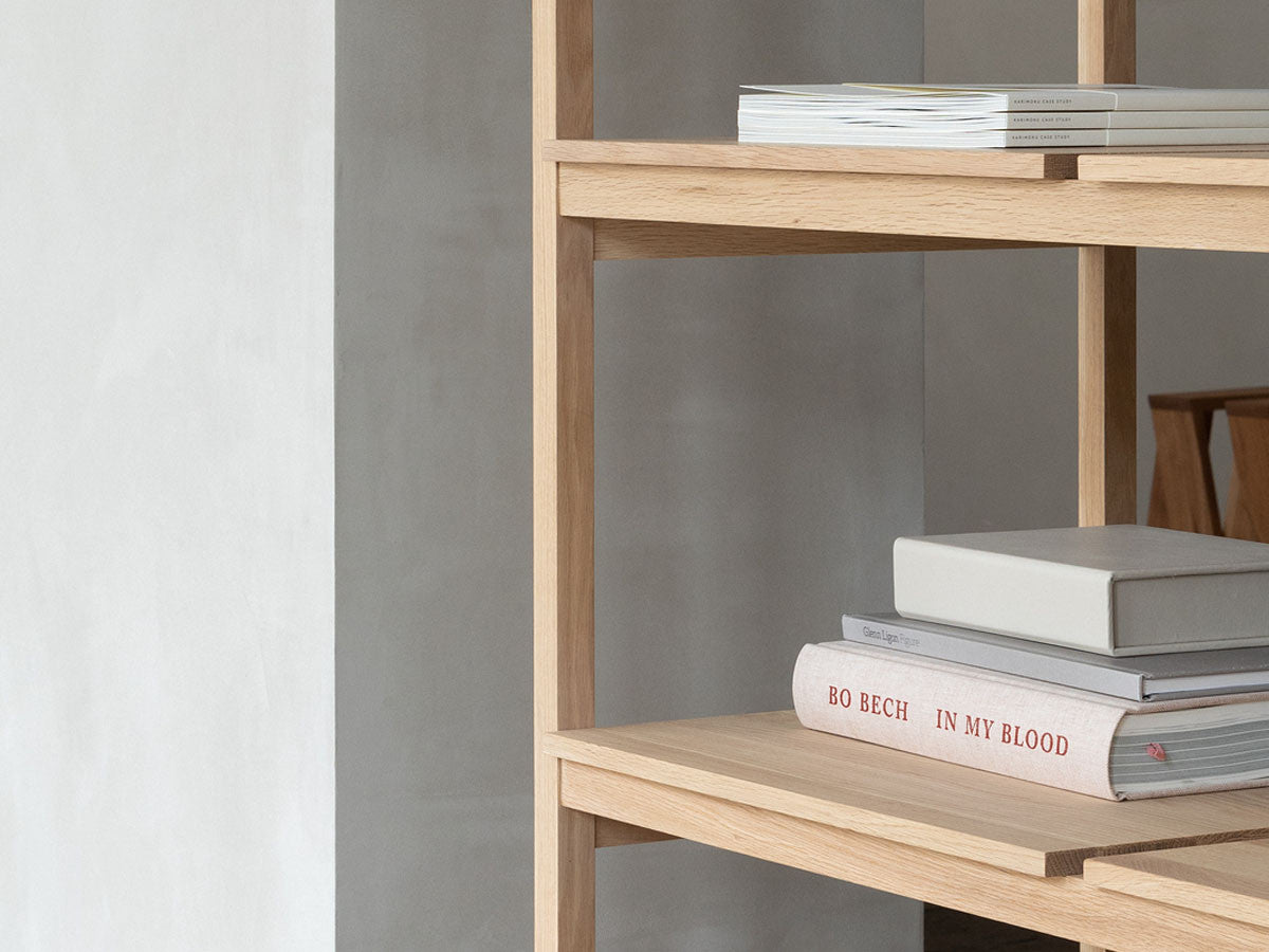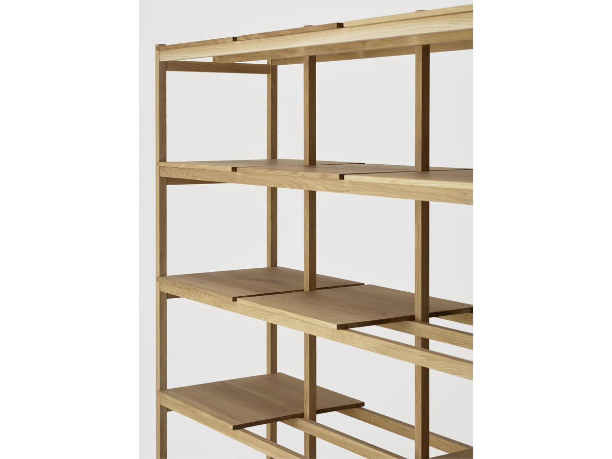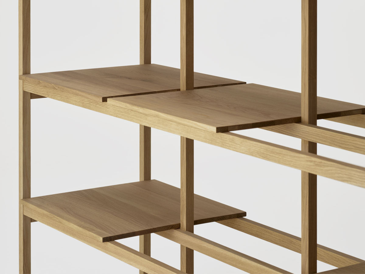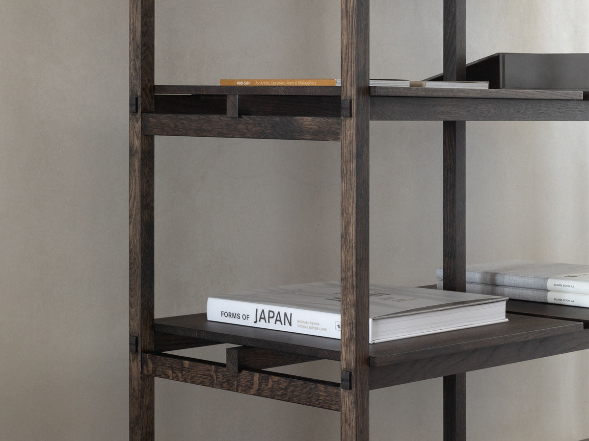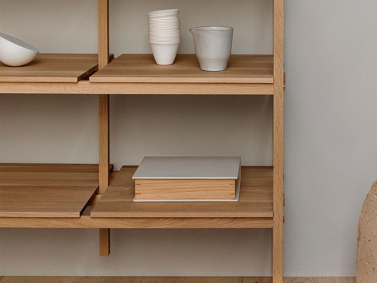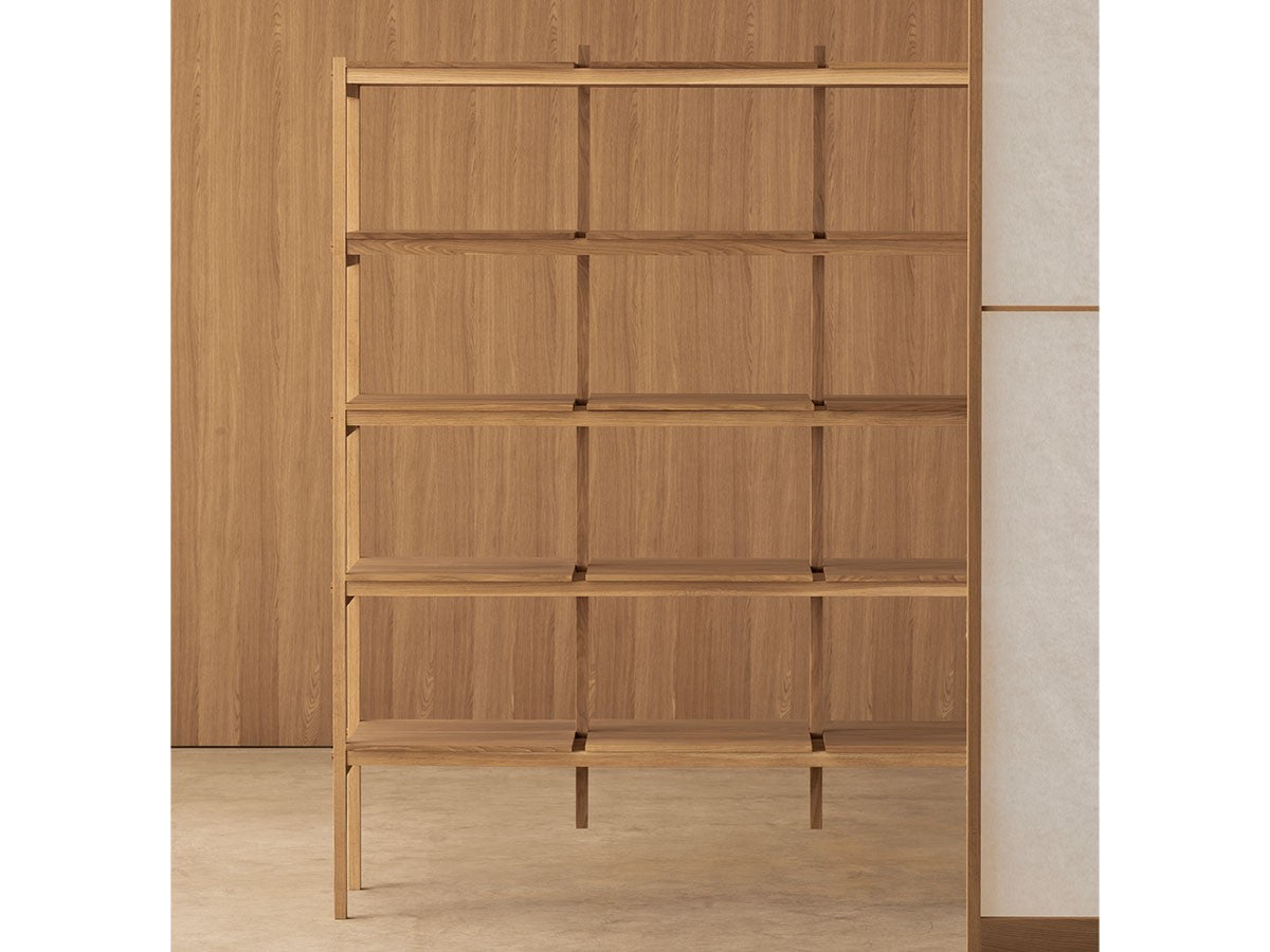寺社仏閣の入り口に置かれた傘立てや下駄箱からインスピレーションを得て制作されたシェルフです。日本の伝統的な構造技術を活用し、一見しただけでは存在に気付きにくいブックエンドや取り外し可能な棚といった機能をさり気なく備えたシステムを実現しました。4箇所の固定棚以外は、すべて取り外しできる可動棚となっているため、デコレーションに変化をつけることができます。カリモクの精緻な木工技術により、可動棚は棚ダボなど金具を使用しない木組構造となっています。構造に光があたることによって、時間と共に空間に変化をつくり出します。噛み合わせた垂直と水平の桟組構造体がシェルフで発生しやすい揺れを防ぎ、強度を保ちます。