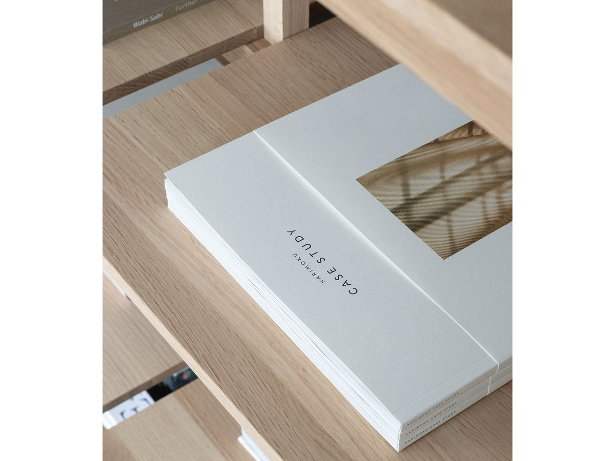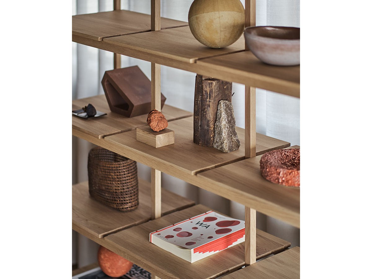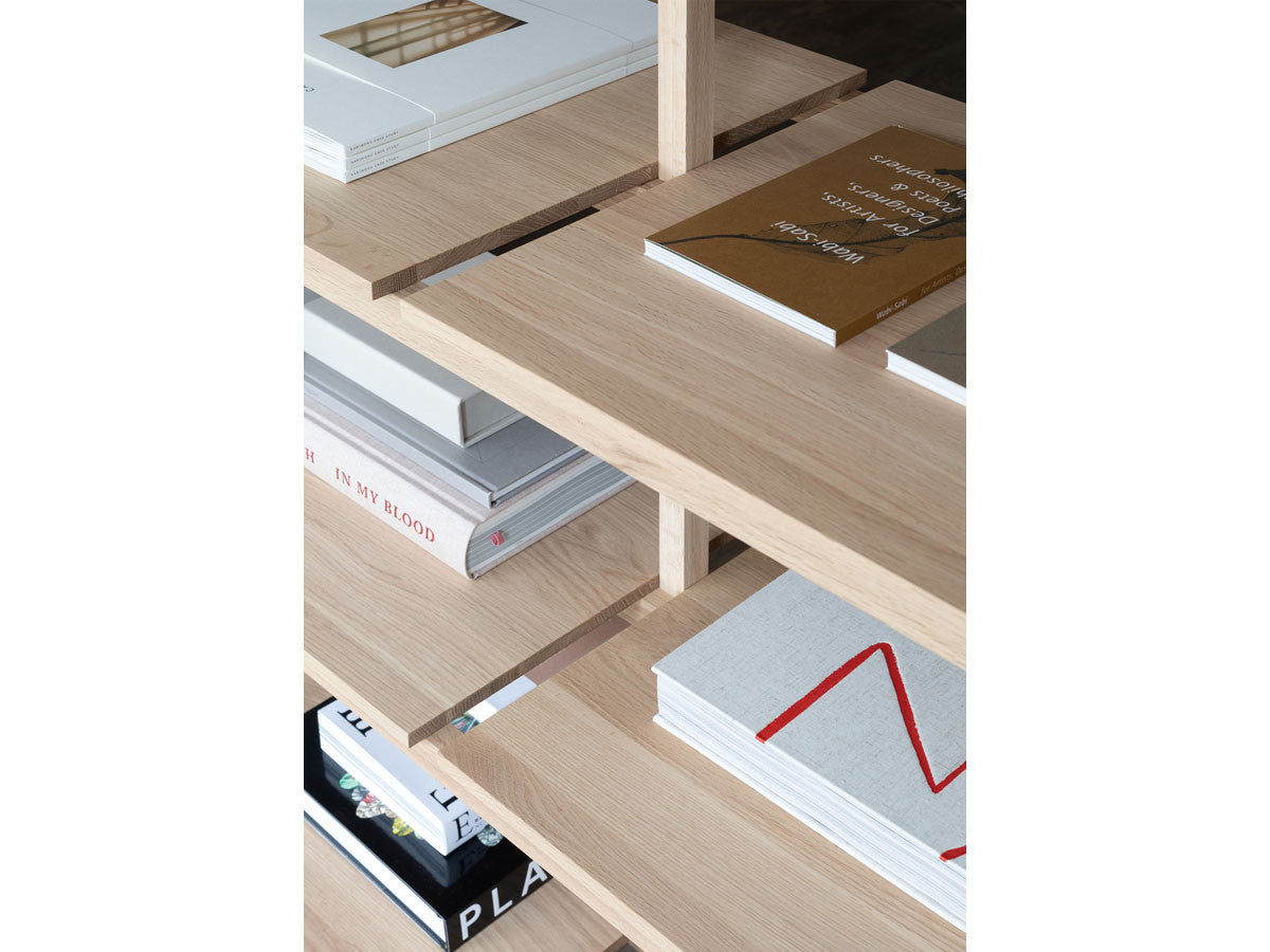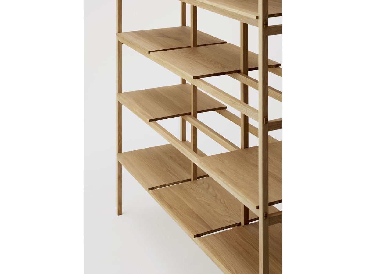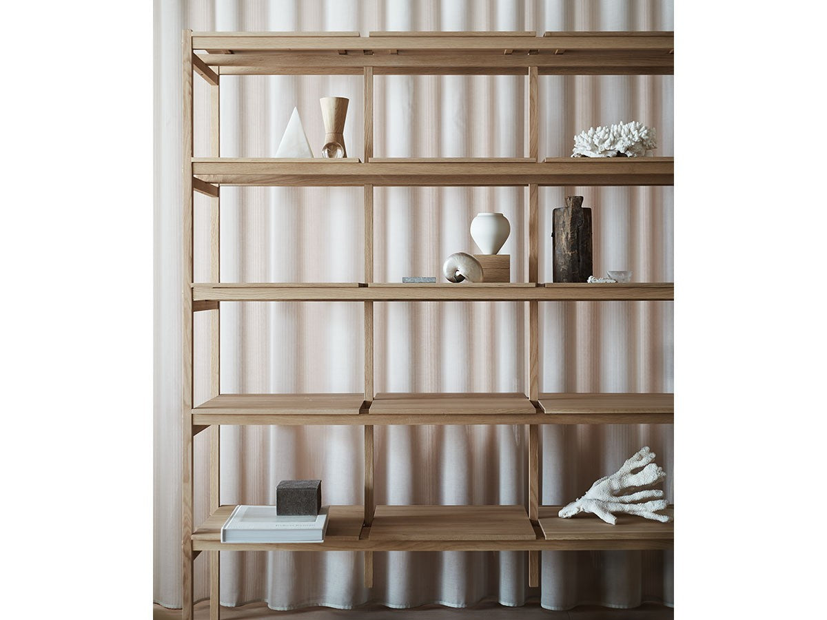 寺社仏閣の入り口に置かれた傘立てや下駄箱からインスピレーションを得て制作されたシェルフです。日本の伝統的な構造技術を活用し、一見しただけでは存在に気付きにくいブックエンドや取り外し可能な棚といった機能をさり気なく備えたシステムを実現しました。4箇所の固定棚以外は、すべて取り外しできる可動棚となっているため、デコレーションに変化をつけることができます。カリモクの精緻な木工技術により、可動棚は棚ダボなど金具を使用しない木組構造となっています。構造に光があたることによって、時間と共に空間に変化をつくり出します。噛み合わせた垂直と水平の桟組構造体がシェルフで発生しやすい揺れを防ぎ、強度を保ちます。