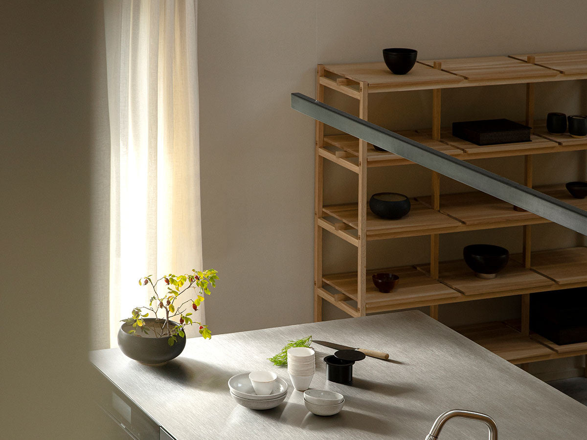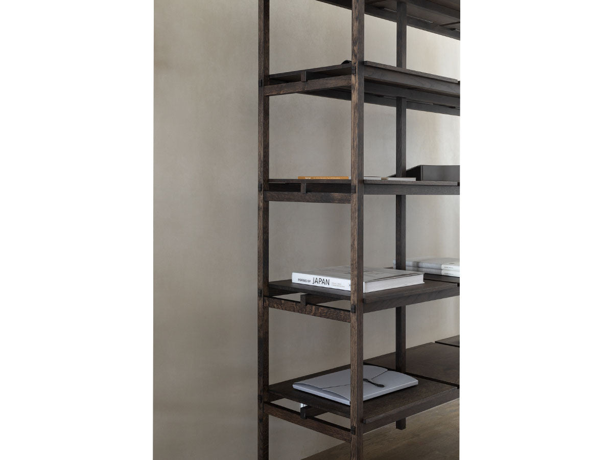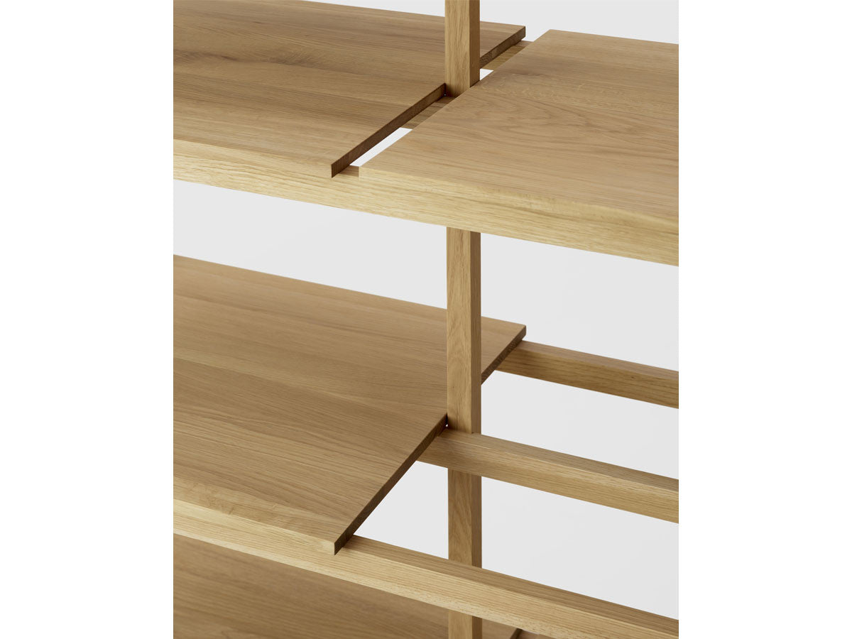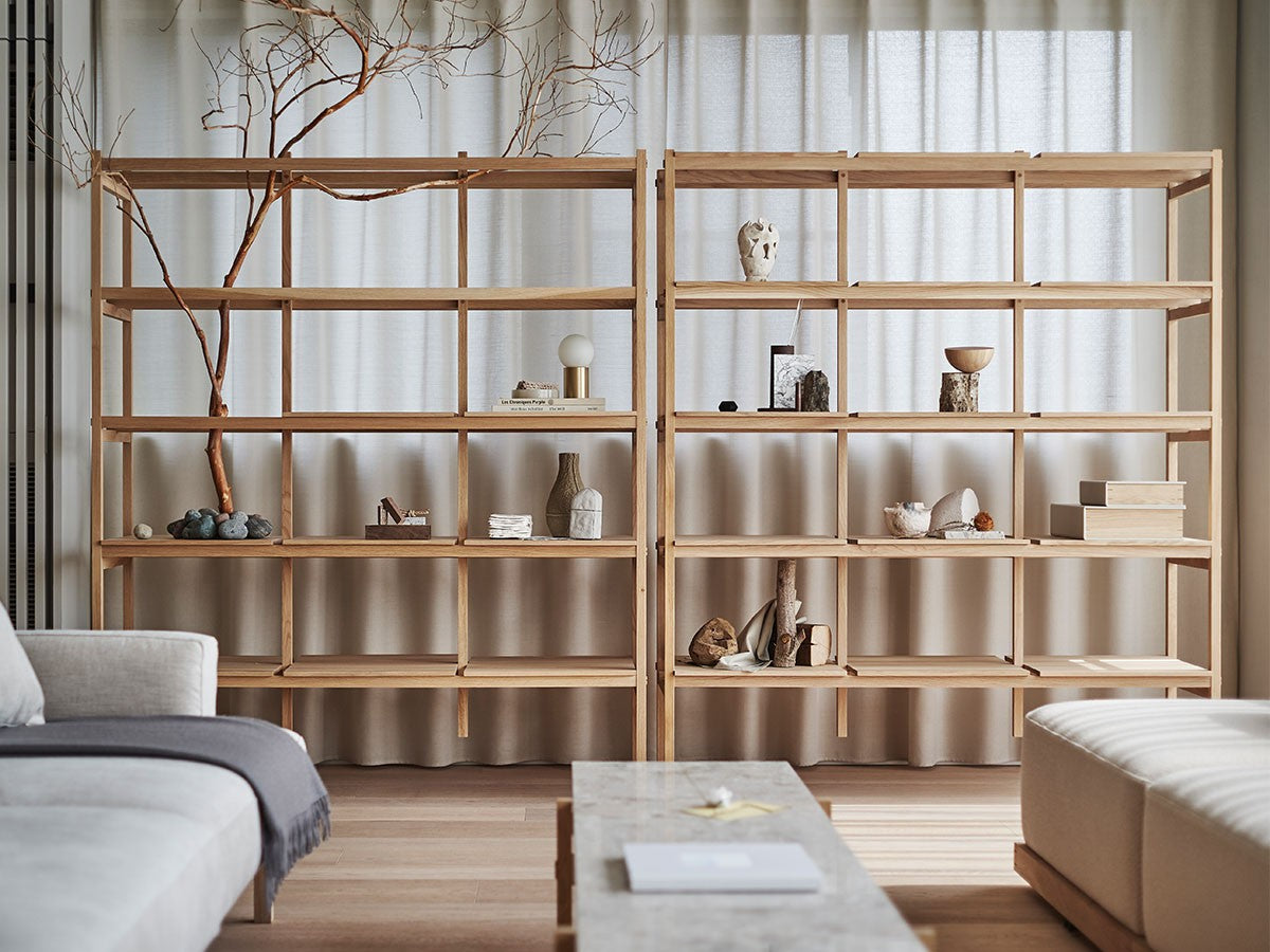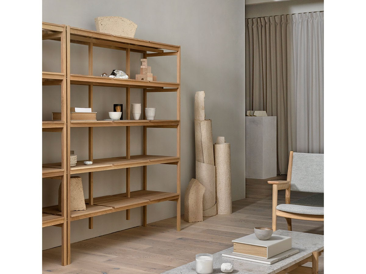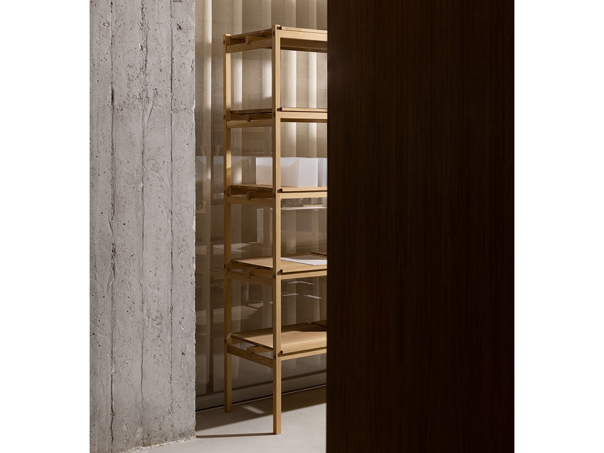 寺社仏閣の入り口に置かれた傘立てや下駄箱からインスピレーションを得て制作されたシェルフです。日本の伝統的な構造技術を活用し、一見しただけでは存在に気付きにくいブックエンドや取り外し可能な棚といった機能をさり気なく備えたシステムを実現しました。4箇所の固定棚以外は、すべて取り外しできる可動棚となっているため、デコレーションに変化をつけることができます。カリモクの精緻な木工技術により、可動棚は棚ダボなど金具を使用しない木組構造となっています。構造に光があたることによって、時間と共に空間に変化をつくり出します。噛み合わせた垂直と水平の桟組構造体がシェルフで発生しやすい揺れを防ぎ、強度を保ちます。