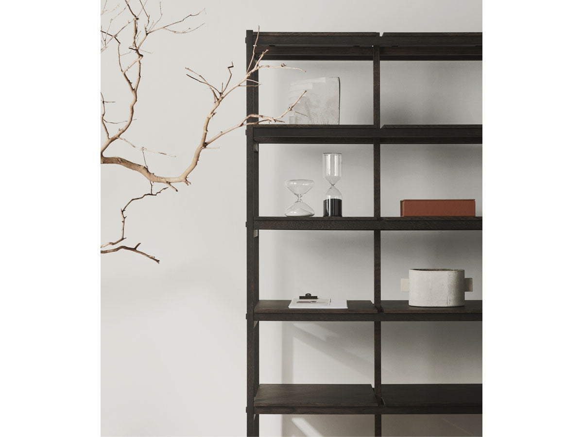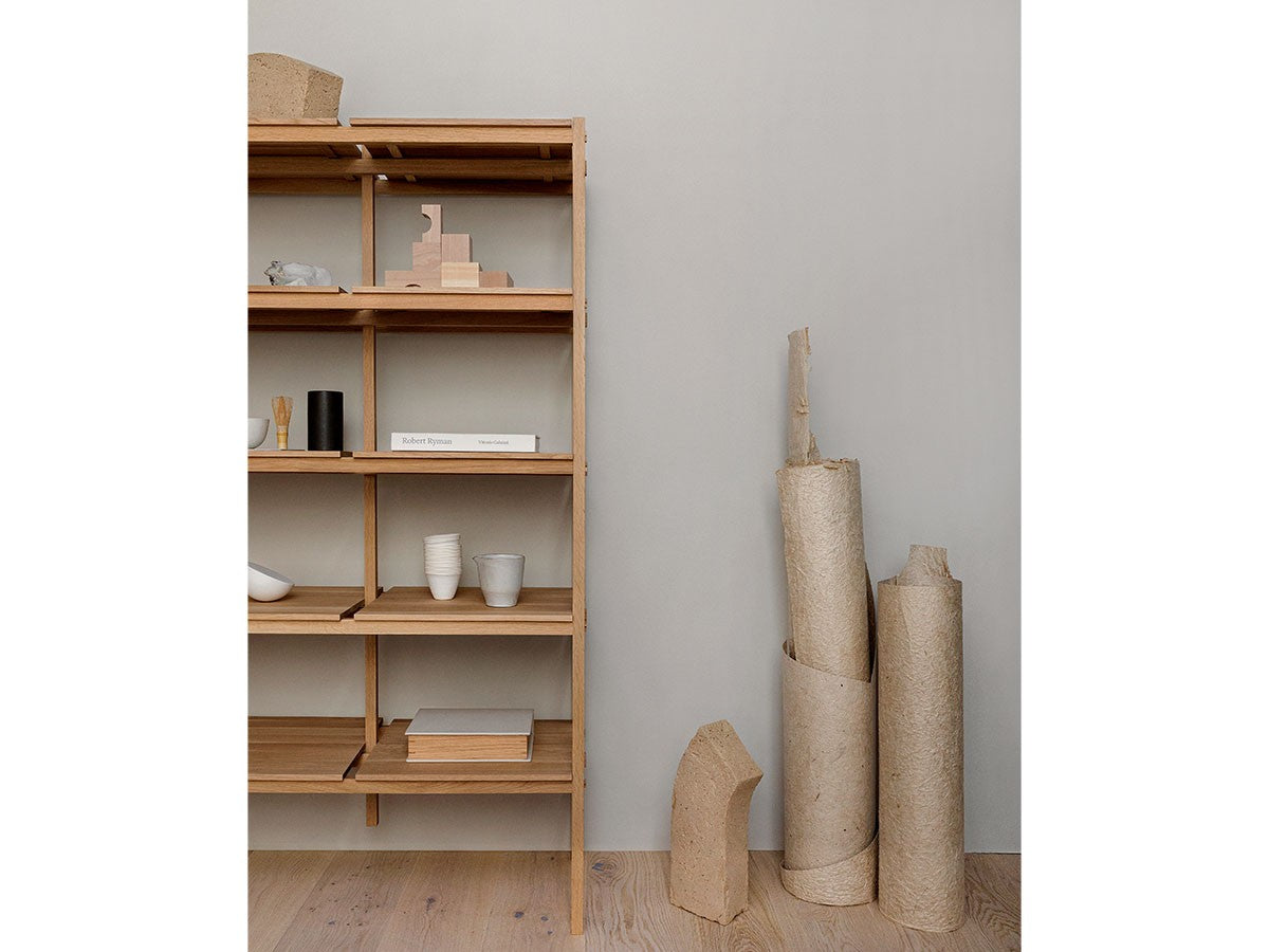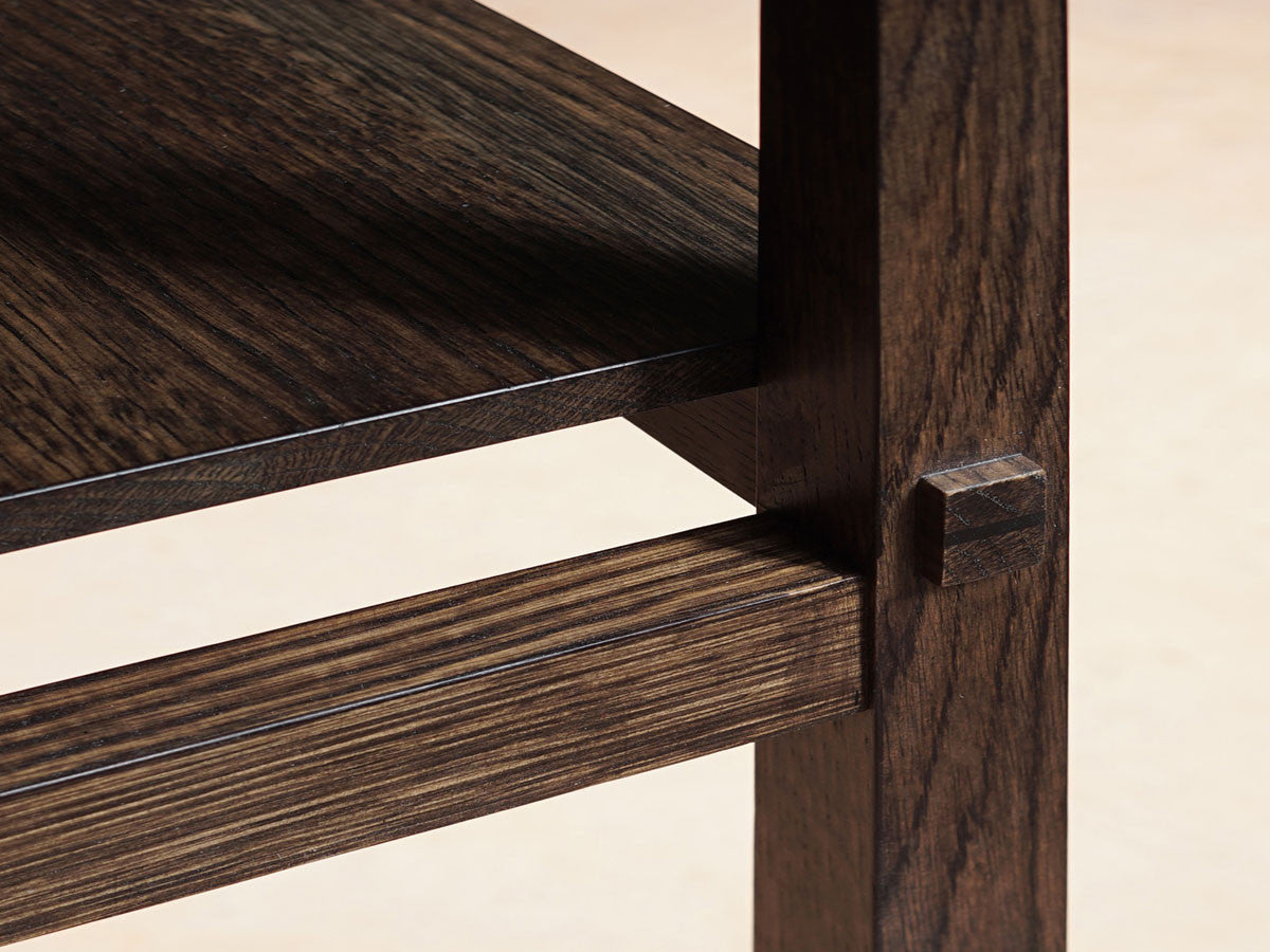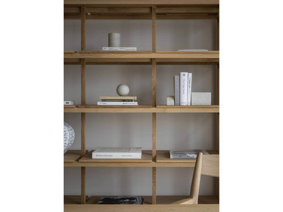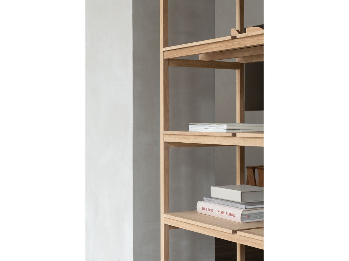 寺社仏閣の入り口に置かれた傘立てや下駄箱からインスピレーションを得て制作されたシェルフです。日本の伝統的な構造技術を活用し、一見しただけでは存在に気付きにくいブックエンドや取り外し可能な棚といった機能をさり気なく備えたシステムを実現しました。4箇所の固定棚以外は、すべて取り外しできる可動棚となっているため、デコレーションに変化をつけることができます。カリモクの精緻な木工技術により、可動棚は棚ダボなど金具を使用しない木組構造となっています。構造に光があたることによって、時間と共に空間に変化をつくり出します。噛み合わせた垂直と水平の桟組構造体がシェルフで発生しやすい揺れを防ぎ、強度を保ちます。