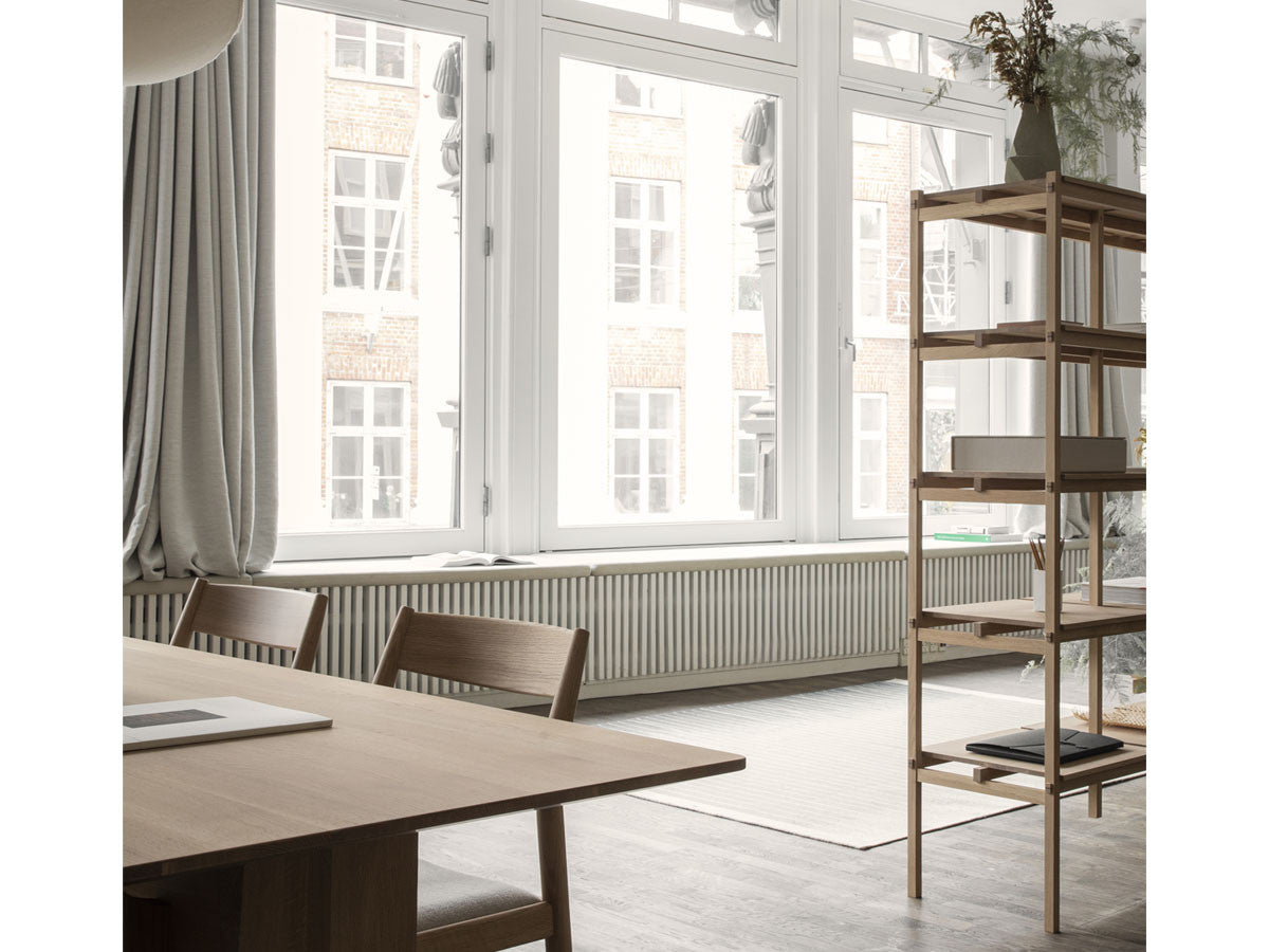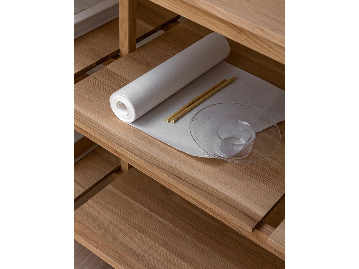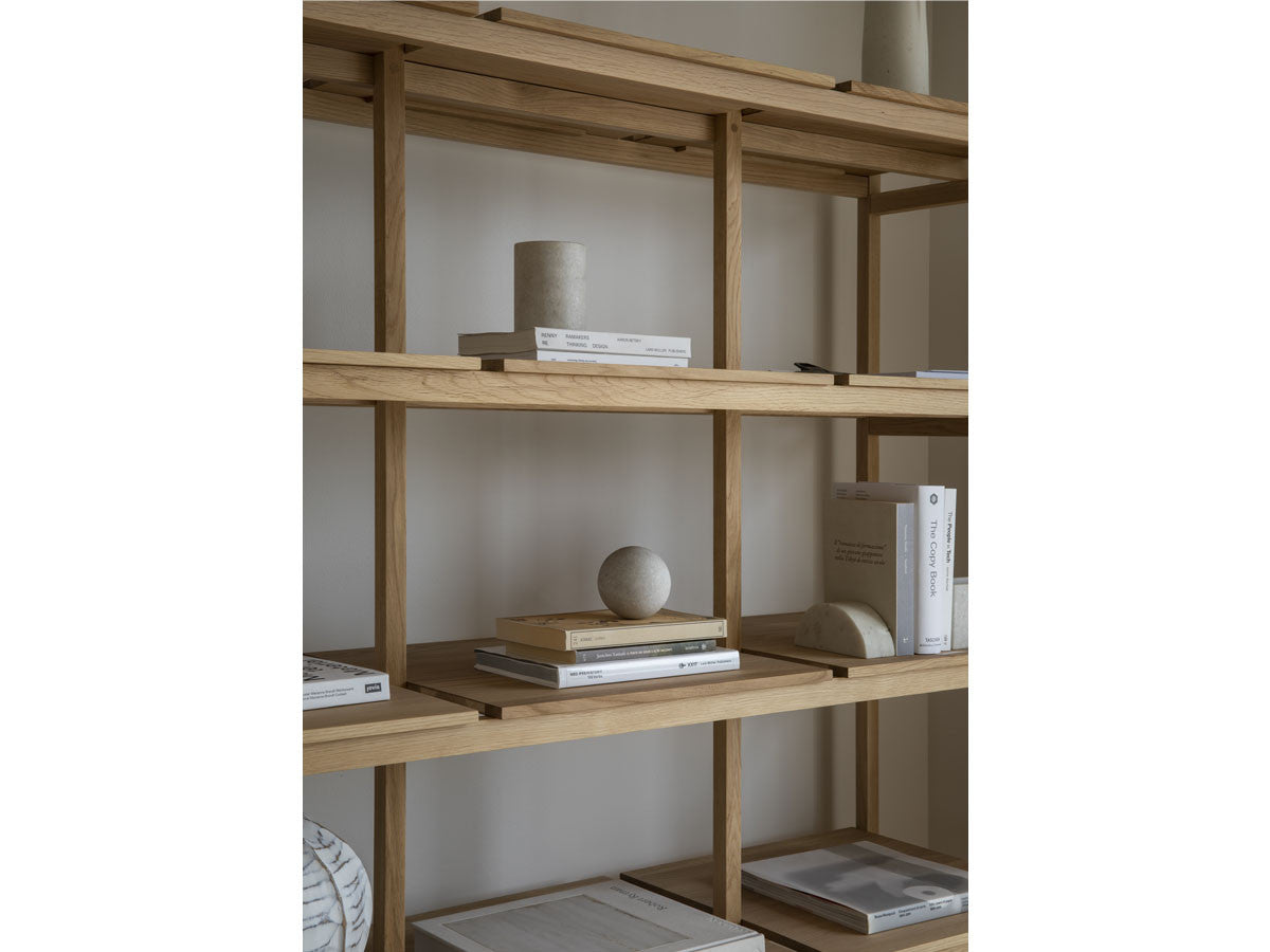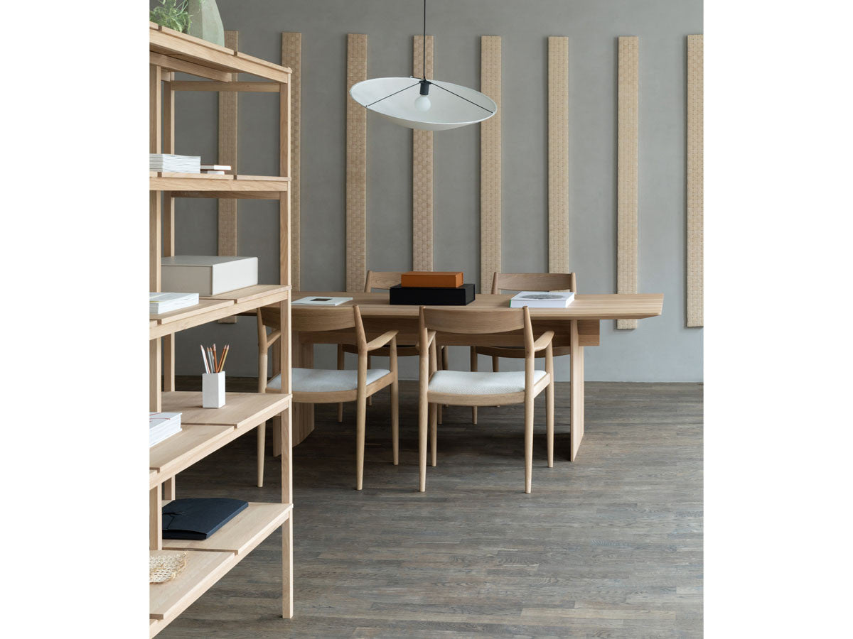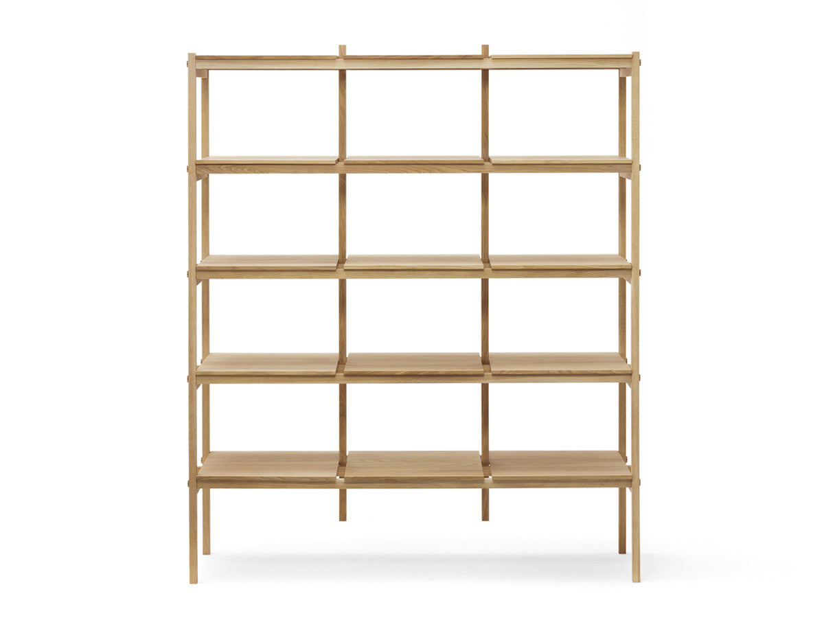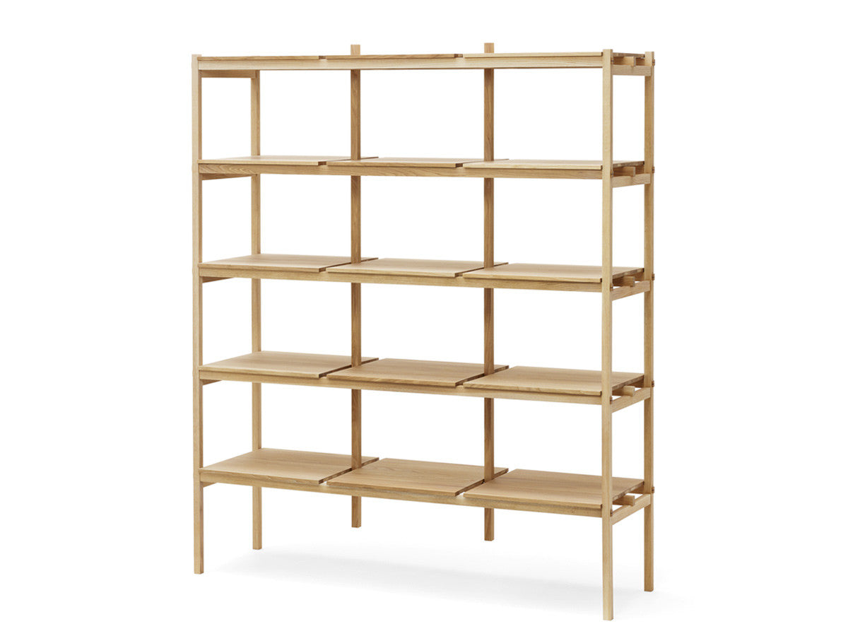 寺社仏閣の入り口に置かれた傘立てや下駄箱からインスピレーションを得て制作されたシェルフです。日本の伝統的な構造技術を活用し、一見しただけでは存在に気付きにくいブックエンドや取り外し可能な棚といった機能をさり気なく備えたシステムを実現しました。4箇所の固定棚以外は、すべて取り外しできる可動棚となっているため、デコレーションに変化をつけることができます。カリモクの精緻な木工技術により、可動棚は棚ダボなど金具を使用しない木組構造となっています。構造に光があたることによって、時間と共に空間に変化をつくり出します。噛み合わせた垂直と水平の桟組構造体がシェルフで発生しやすい揺れを防ぎ、強度を保ちます。