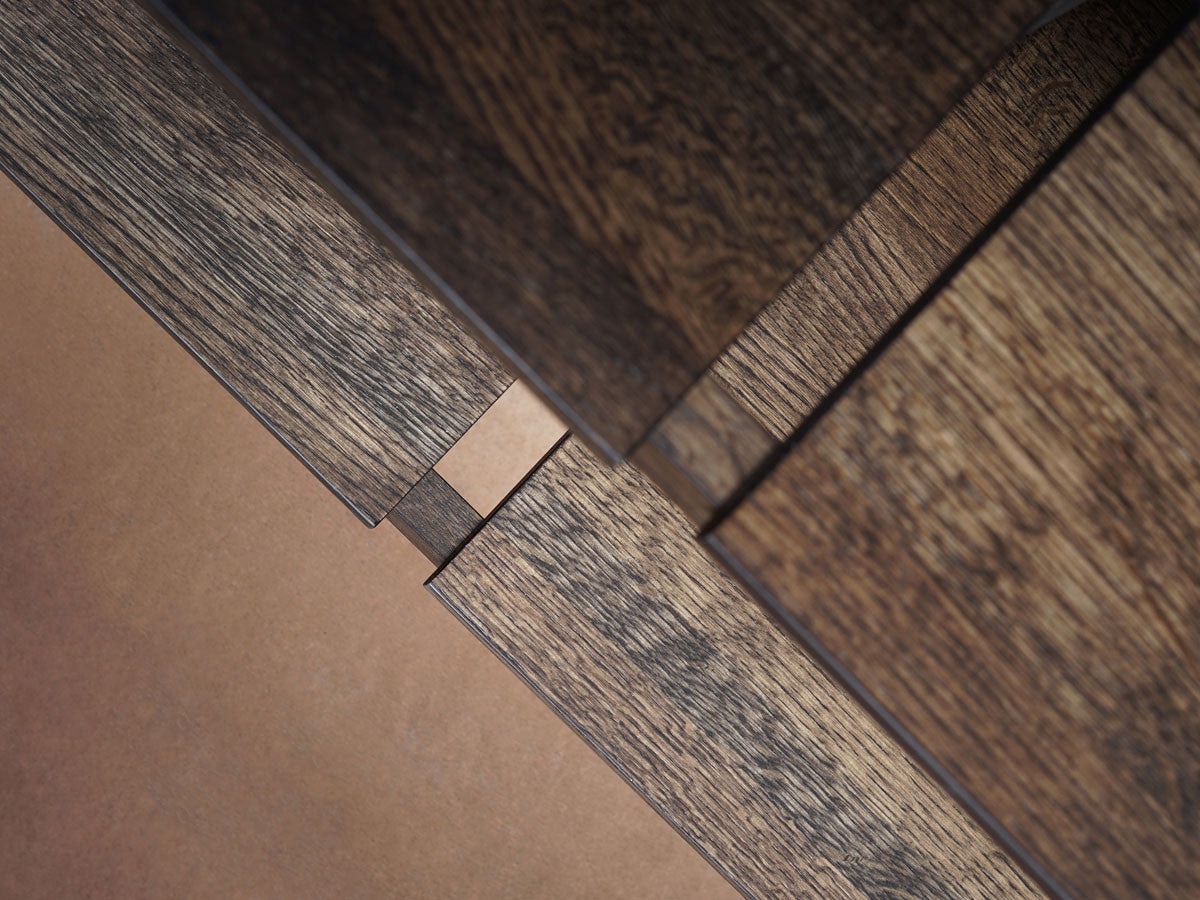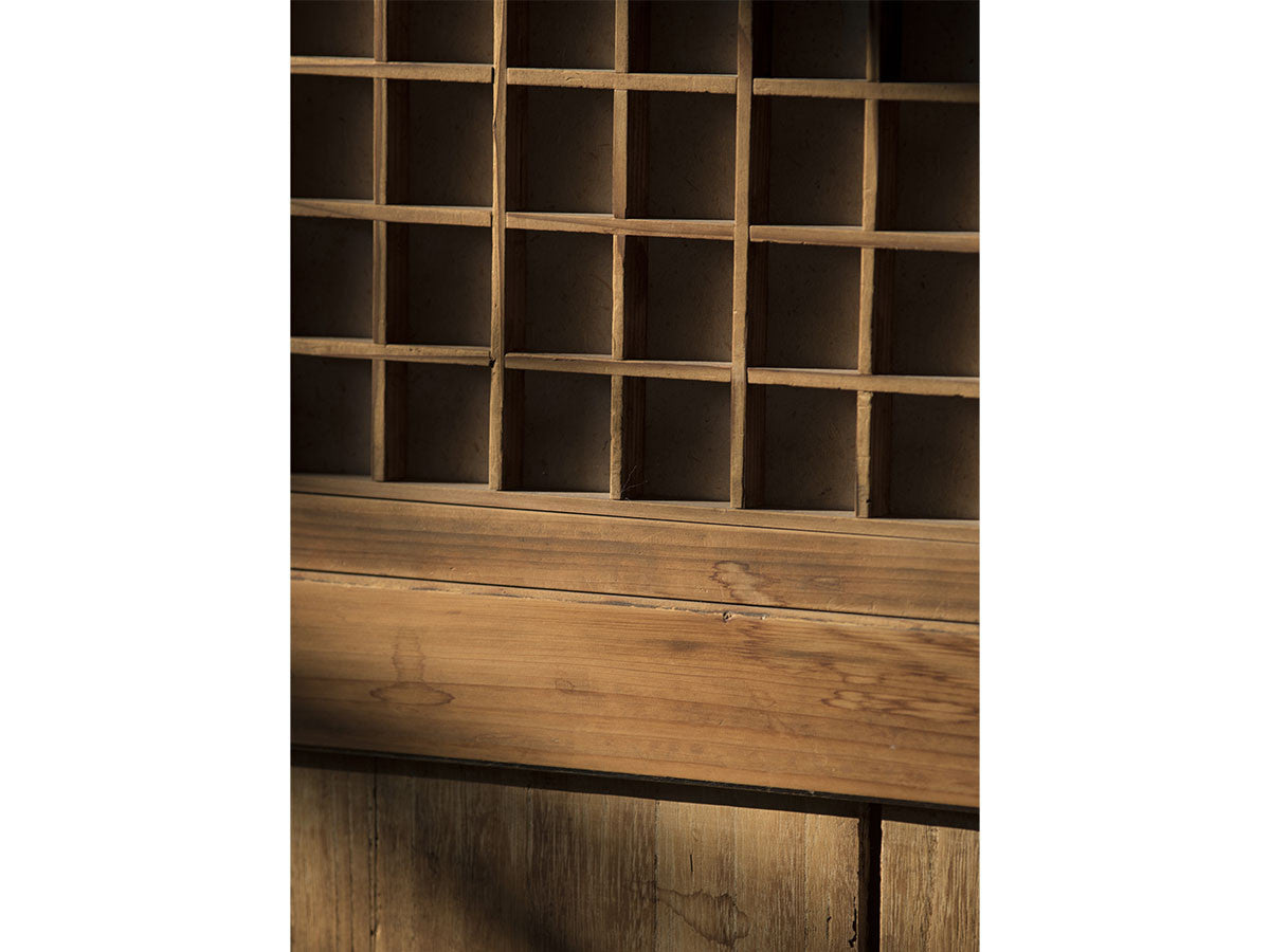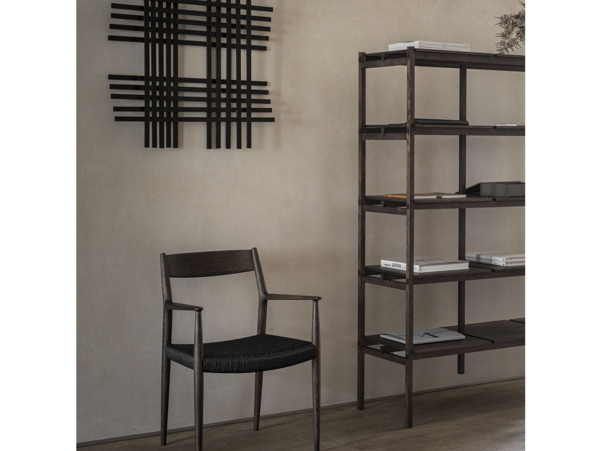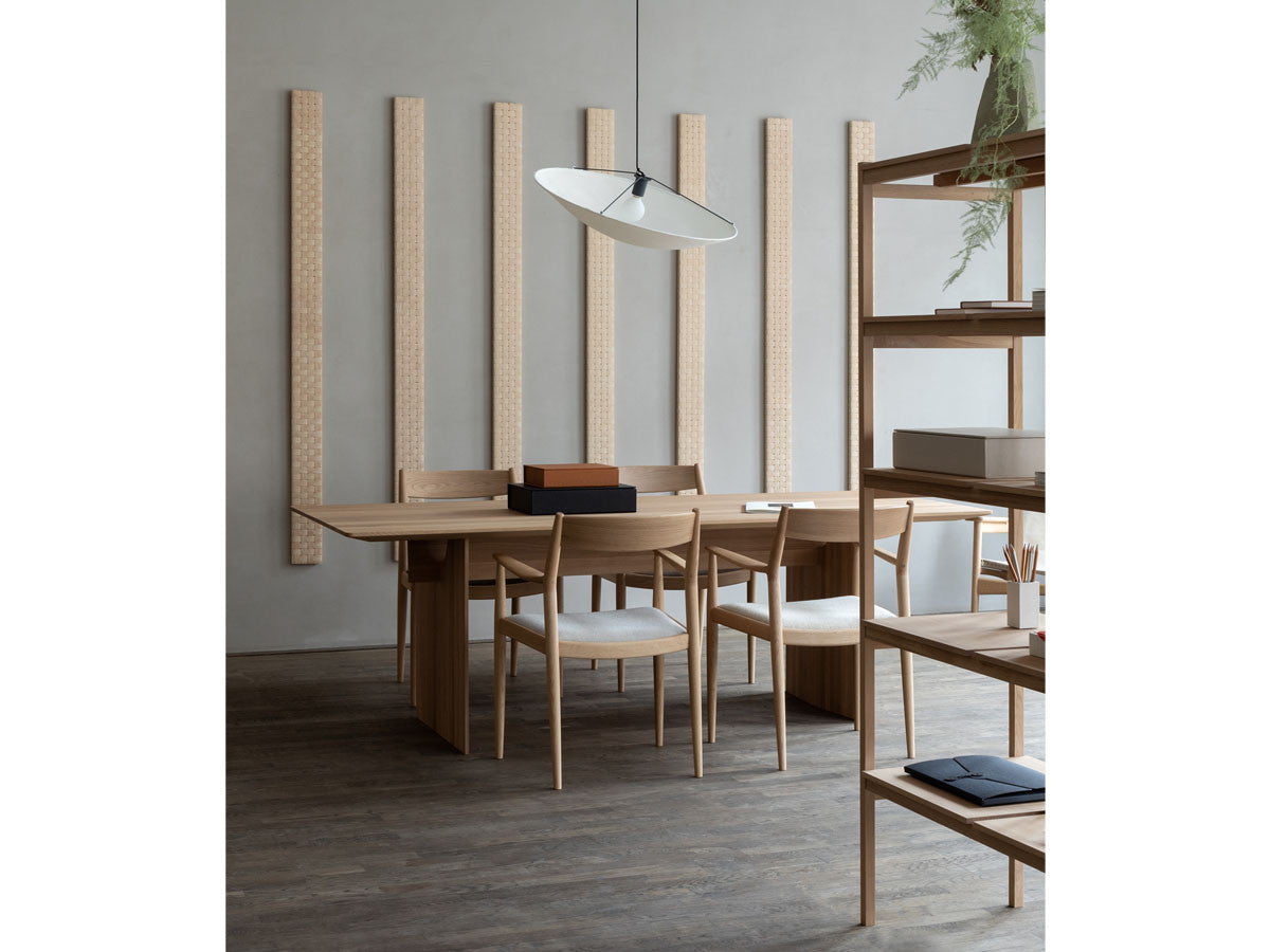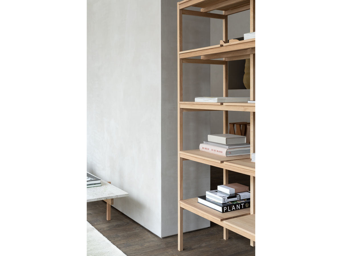 寺社仏閣の入り口に置かれた傘立てや下駄箱からインスピレーションを得て制作されたシェルフです。日本の伝統的な構造技術を活用し、一見しただけでは存在に気付きにくいブックエンドや取り外し可能な棚といった機能をさり気なく備えたシステムを実現しました。4箇所の固定棚以外は、すべて取り外しできる可動棚となっているため、デコレーションに変化をつけることができます。カリモクの精緻な木工技術により、可動棚は棚ダボなど金具を使用しない木組構造となっています。構造に光があたることによって、時間と共に空間に変化をつくり出します。噛み合わせた垂直と水平の桟組構造体がシェルフで発生しやすい揺れを防ぎ、強度を保ちます。
