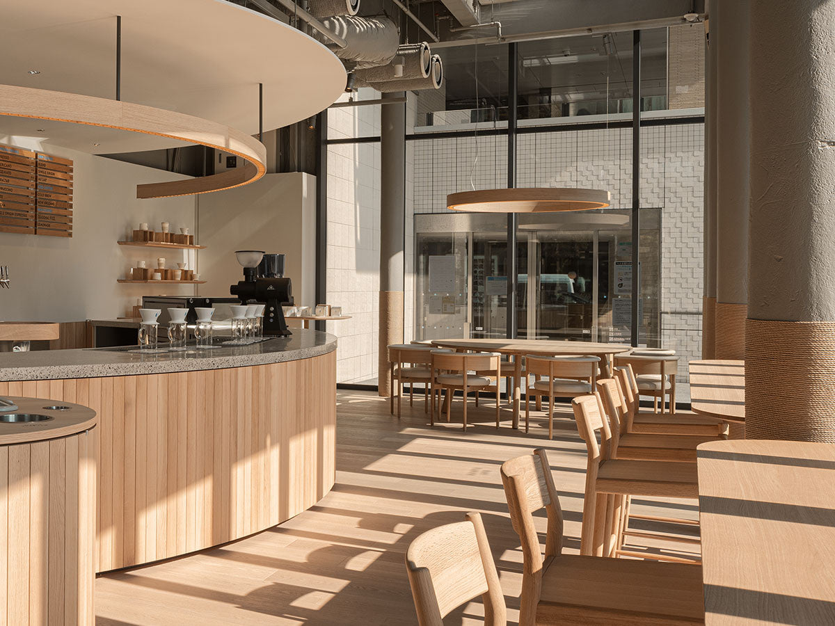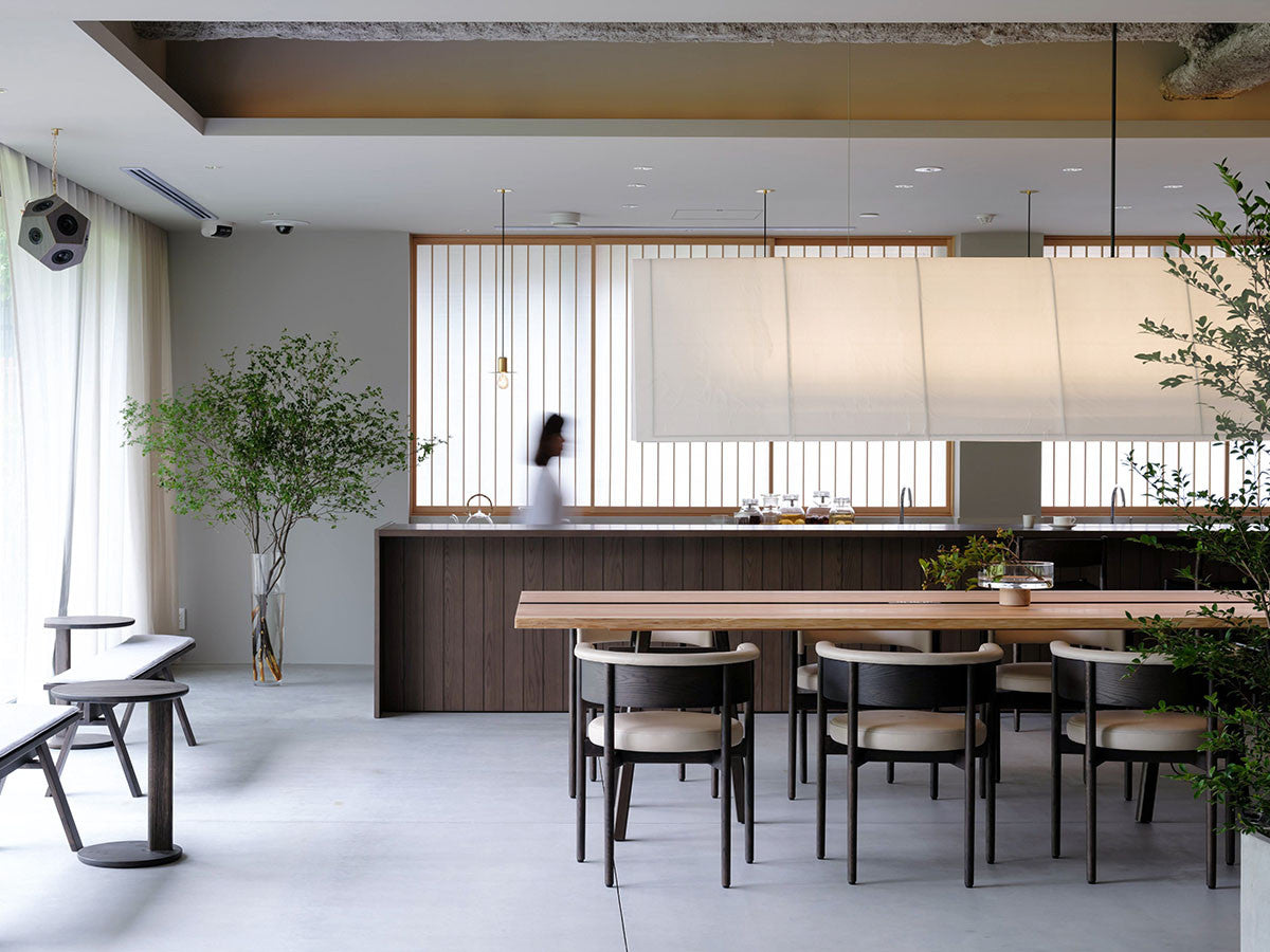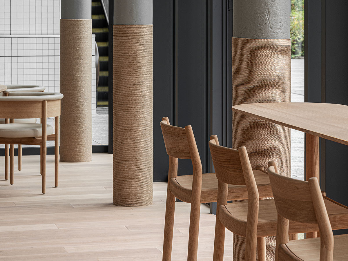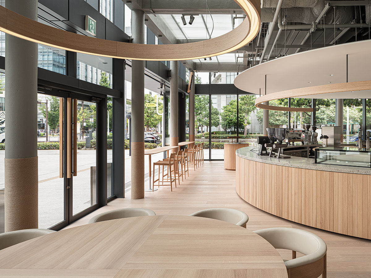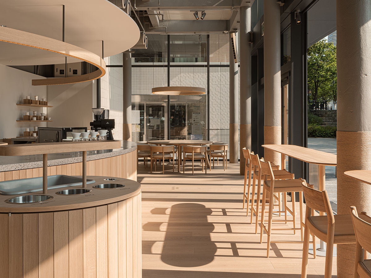 クリーンなフォルムと新鮮さのあるデザインランゲージ、またソフトで快適性のある座面は、ブルーボトルコーヒーみなとみらいのインテリアエレメンツにインスパイアされてデザインされました。低めに設定された背面とコンパクトにまとまった脚部により、ダイニングチェアでもスツールでもない、それぞれの良さを兼ね揃えた機能性豊かなチェアに仕上げられています。MINATOMIRAI CAFEみなとみらいコレクションは、横浜のみなとみらいにある「ブルーボトルコーヒー みなとみらいカフェ」に備え付けられることを想定し、つくられたコレクションです。公園に隣接し、ガラス張りの開放的な空間と曲線や木の素材使いによる柔らかさが心地よいブルーボトルコーヒー みなとみらいカフェ。カフェ全体のデザインは芦沢啓治建築設計事務所が担当し、カフェを構成する要素としてテイラーメイドの木製インテリアと家具が制作されました。テーブルやチェアなどの家具は、ノーム・アーキテクツと協働でデザインされたもので、その一部がカリモクケースのセカンドコレクションを構成しています。