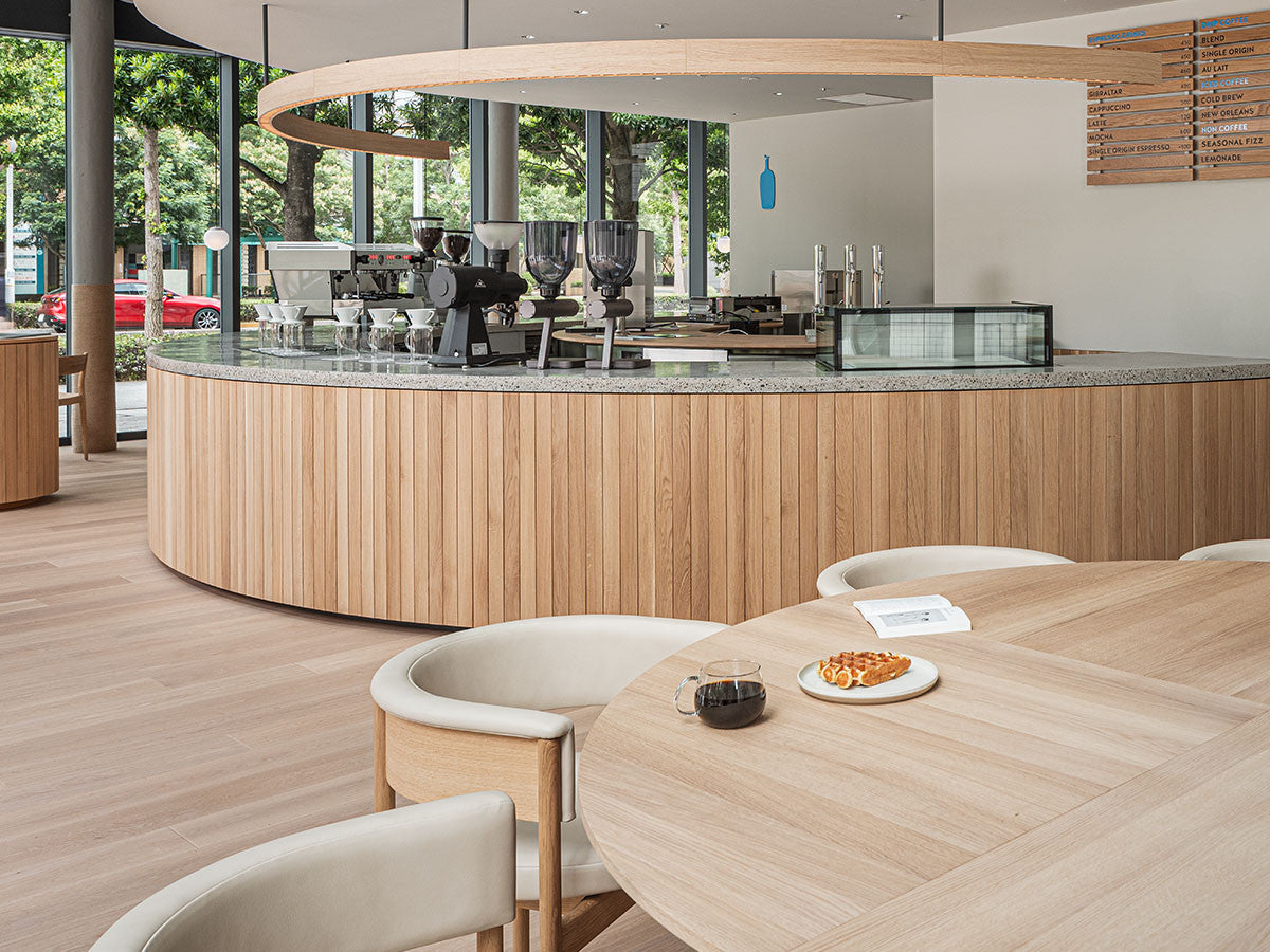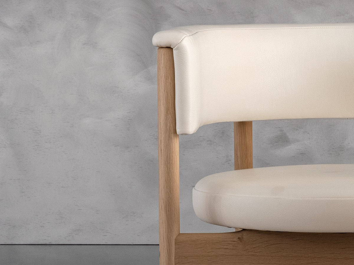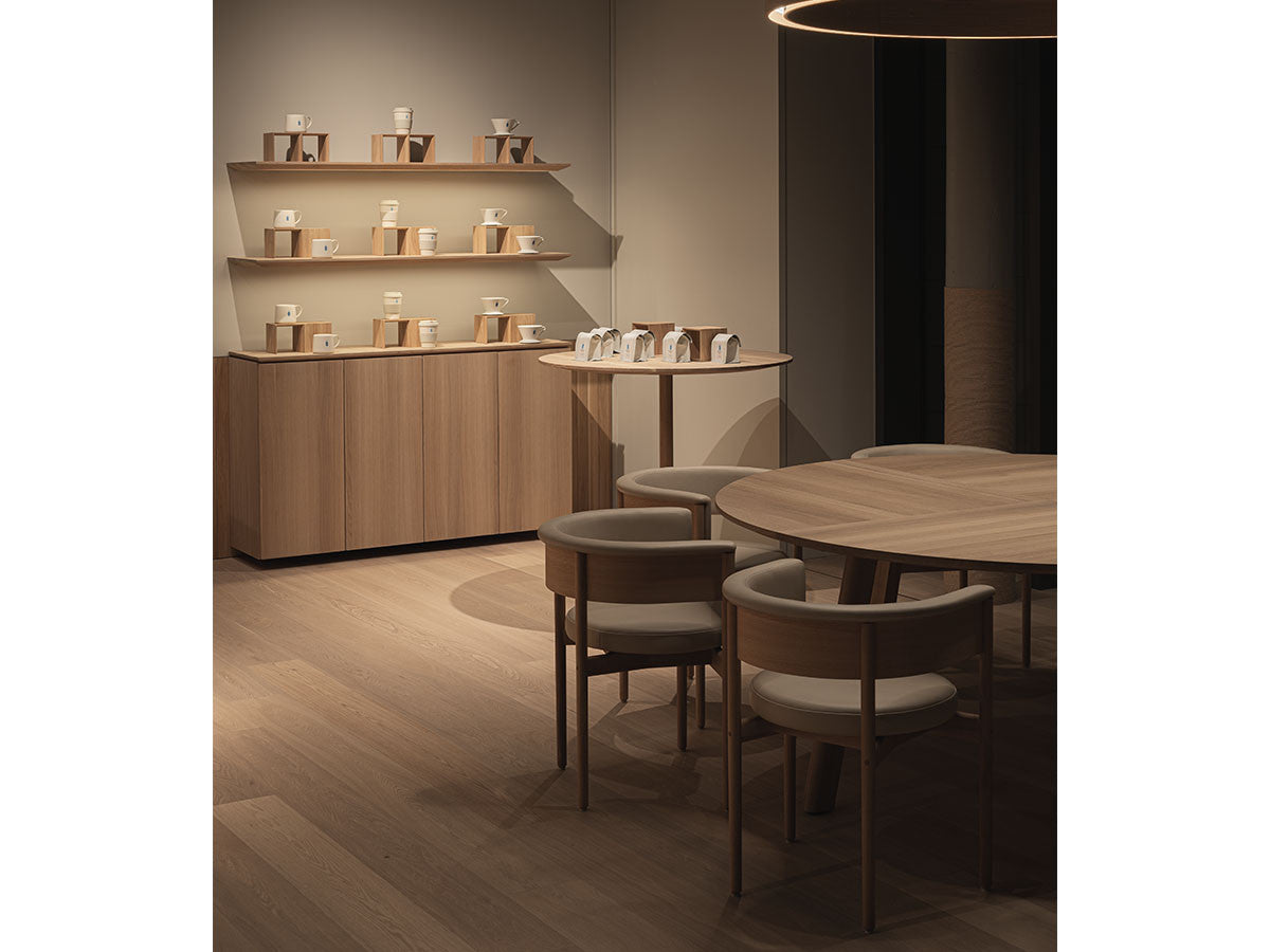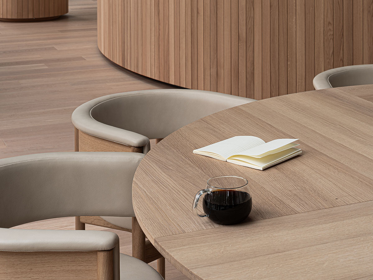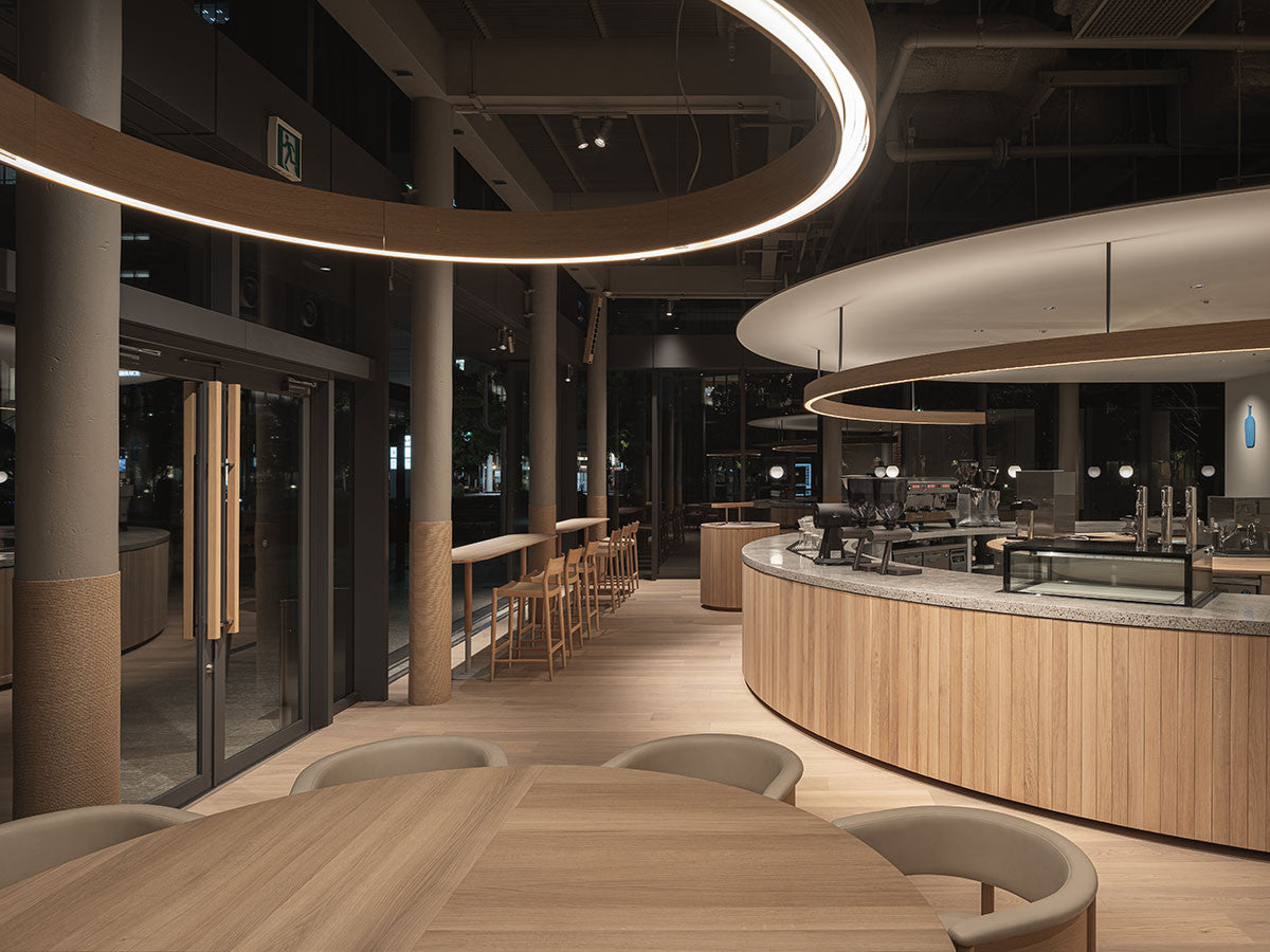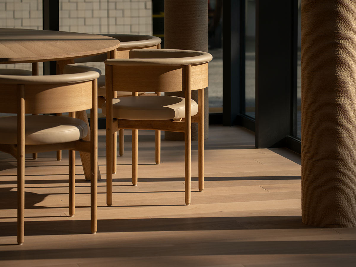 クリーンなフォルムと新鮮さのあるデザインランゲージ、またソフトで快適性のある座面は、ブルーボトルコーヒーみなとみらいのインテリアエレメンツにインスパイアされてデザインされました。低めに設定された背面とコンパクトにまとまった脚部により、ダイニングチェアでもスツールでもない、それぞれの良さを兼ね揃えた機能性豊かなチェアに仕上げられています。MINATOMIRAI CAFEみなとみらいコレクションは、横浜のみなとみらいにある「ブルーボトルコーヒー みなとみらいカフェ」に備え付けられることを想定し、つくられたコレクションです。公園に隣接し、ガラス張りの開放的な空間と曲線や木の素材使いによる柔らかさが心地よいブルーボトルコーヒー みなとみらいカフェ。カフェ全体のデザインは芦沢啓治建築設計事務所が担当し、カフェを構成する要素としてテイラーメイドの木製インテリアと家具が制作されました。テーブルやチェアなどの家具は、ノーム・アーキテクツと協働でデザインされたもので、その一部がカリモクケースのセカンドコレクションを構成しています。