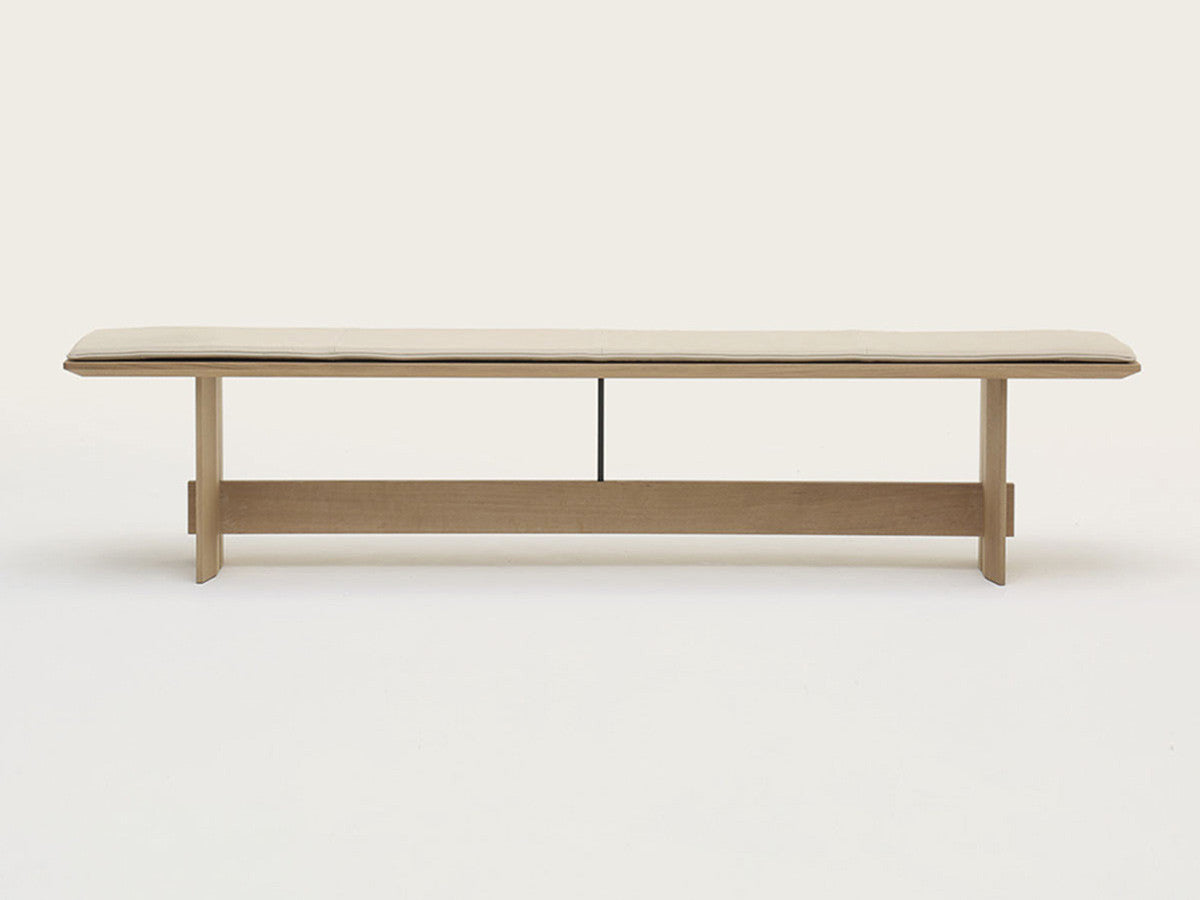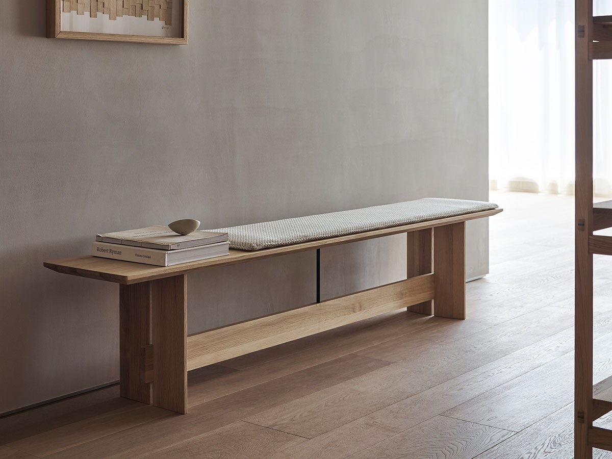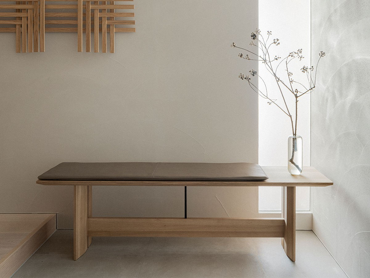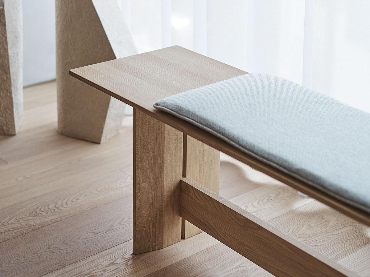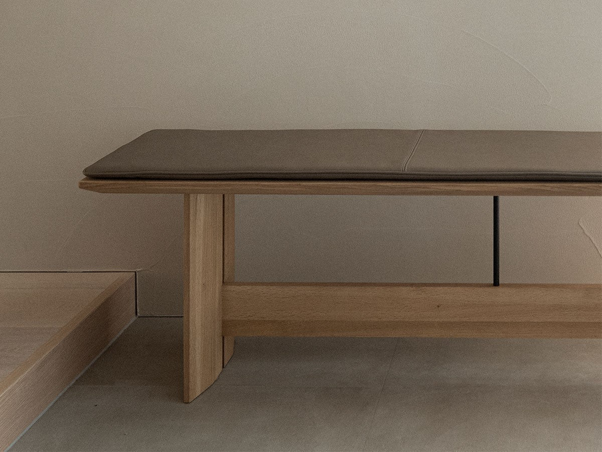 閑静な住宅街にひっそりと佇む、1988年に建てられた高級マンションの一室のリノベーションプロジェクトのためにつくられたコレクション。このベンチはエントリースペースに設置することを想定し、ベンチとして座れる機能性だけでなく飾り台としても使える形です。座面と脚のエッジを薄く見せることで生まれる軽やかさと、角材をそのまま使ったような貫材の力強さを繊細なスチールのロッドで接続し、全体のハーモニーをつくり出しています。別売で専用クッションも展開しています。