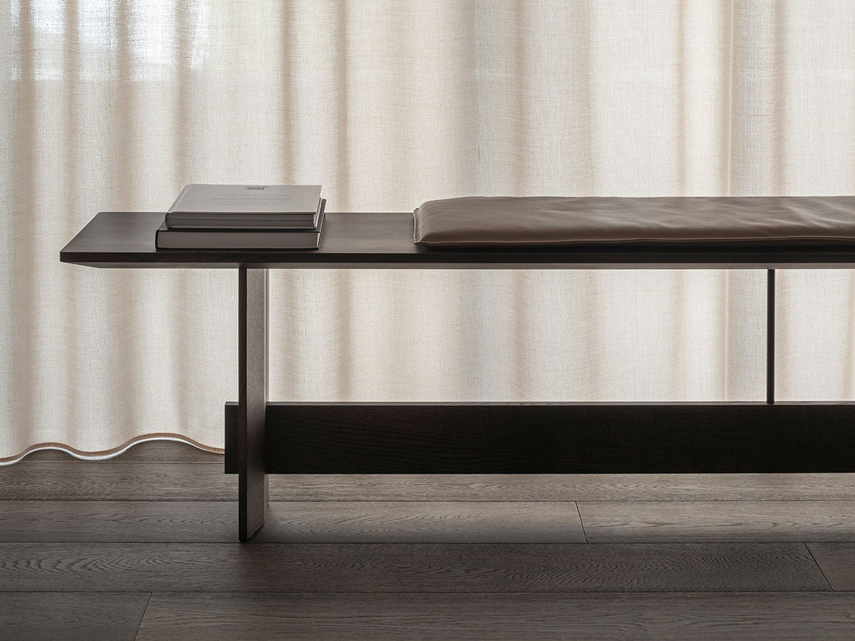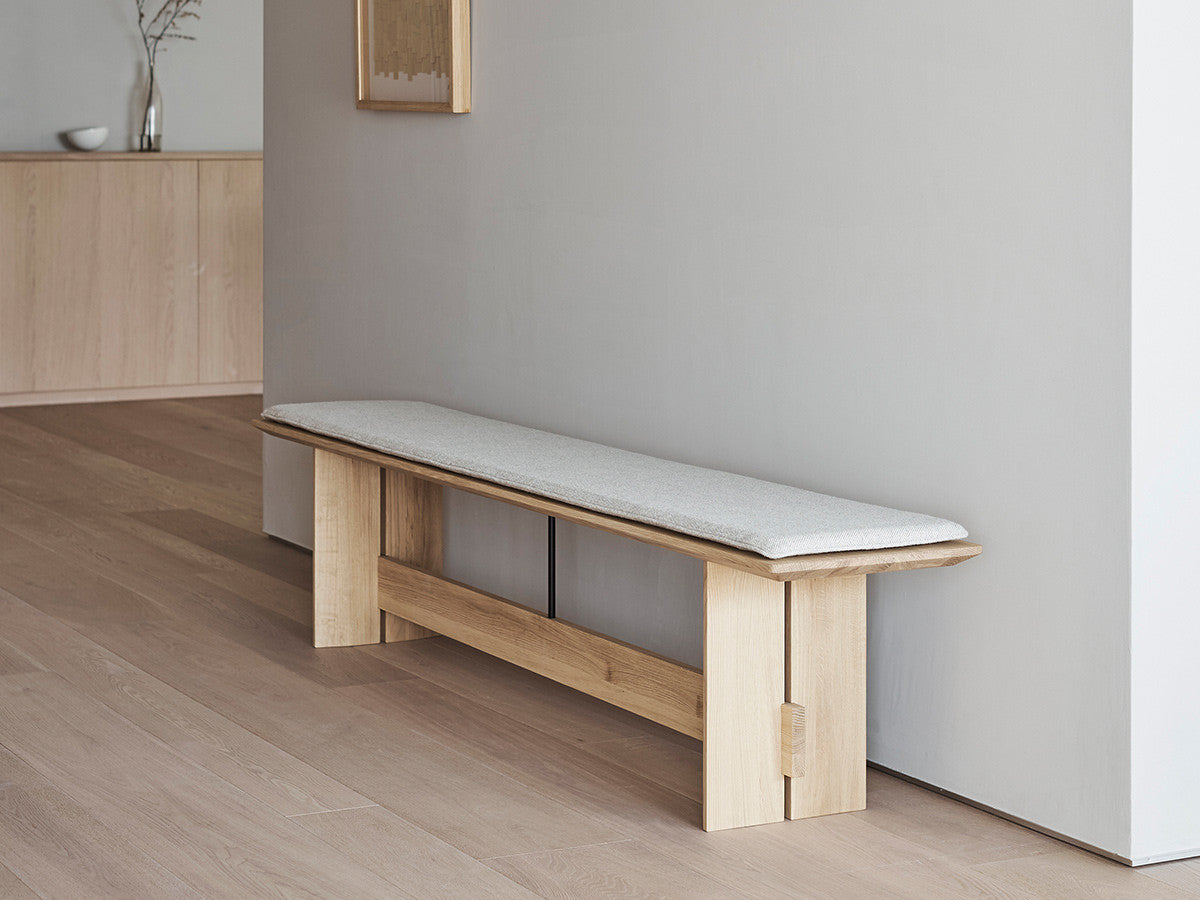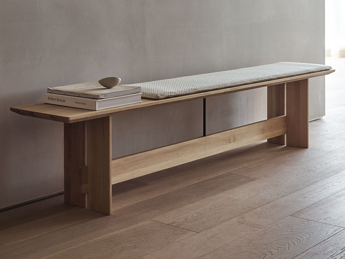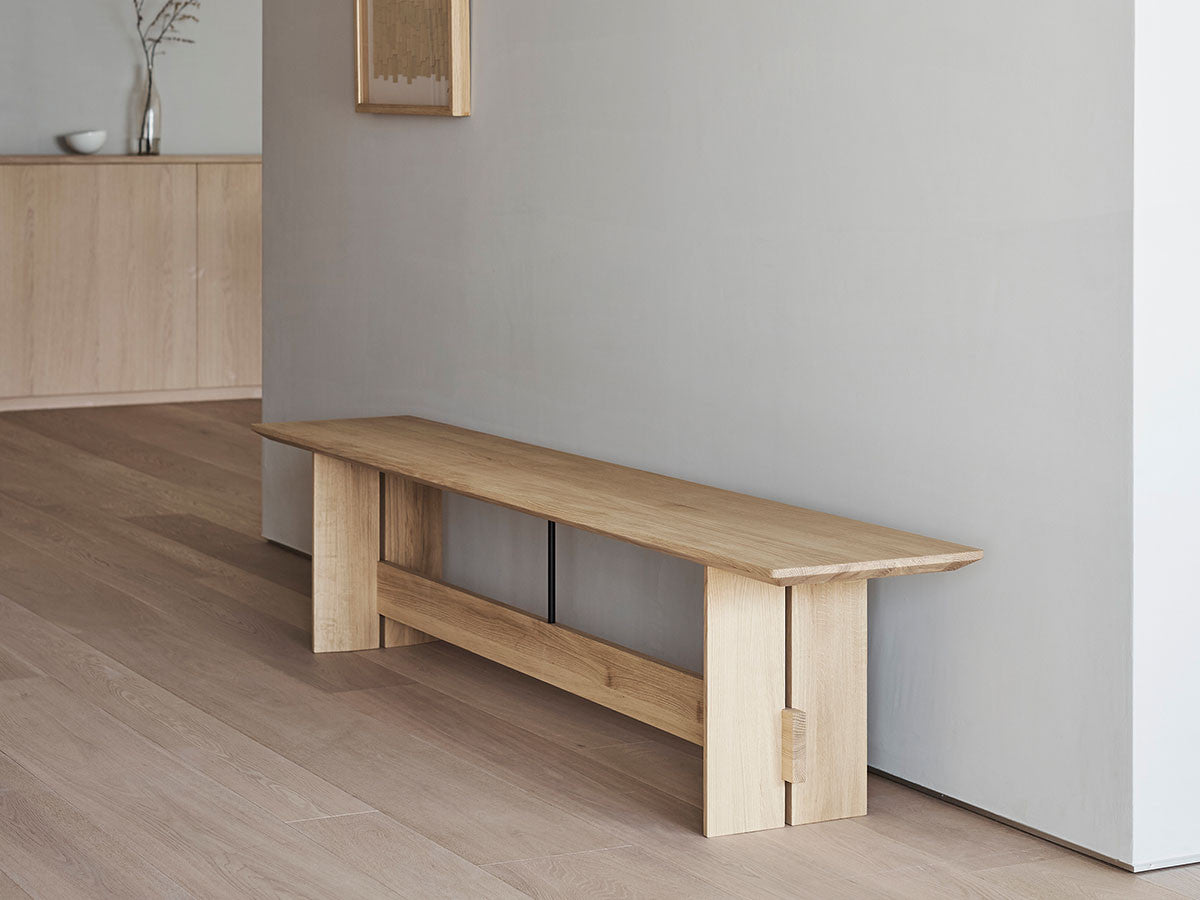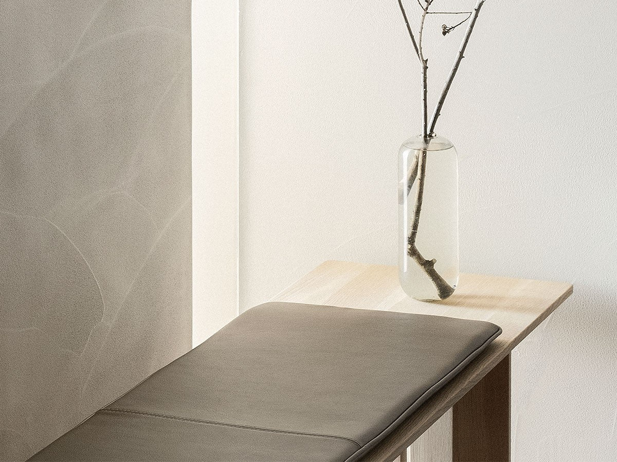 閑静な住宅街にひっそりと佇む、1988年に建てられた高級マンションの一室のリノベーションプロジェクトのためにつくられたコレクション。このベンチはエントリースペースに設置することを想定し、ベンチとして座れる機能性だけでなく飾り台としても使える形です。座面と脚のエッジを薄く見せることで生まれる軽やかさと、角材をそのまま使ったような貫材の力強さを繊細なスチールのロッドで接続し、全体のハーモニーをつくり出しています。別売で専用クッションも展開しています。