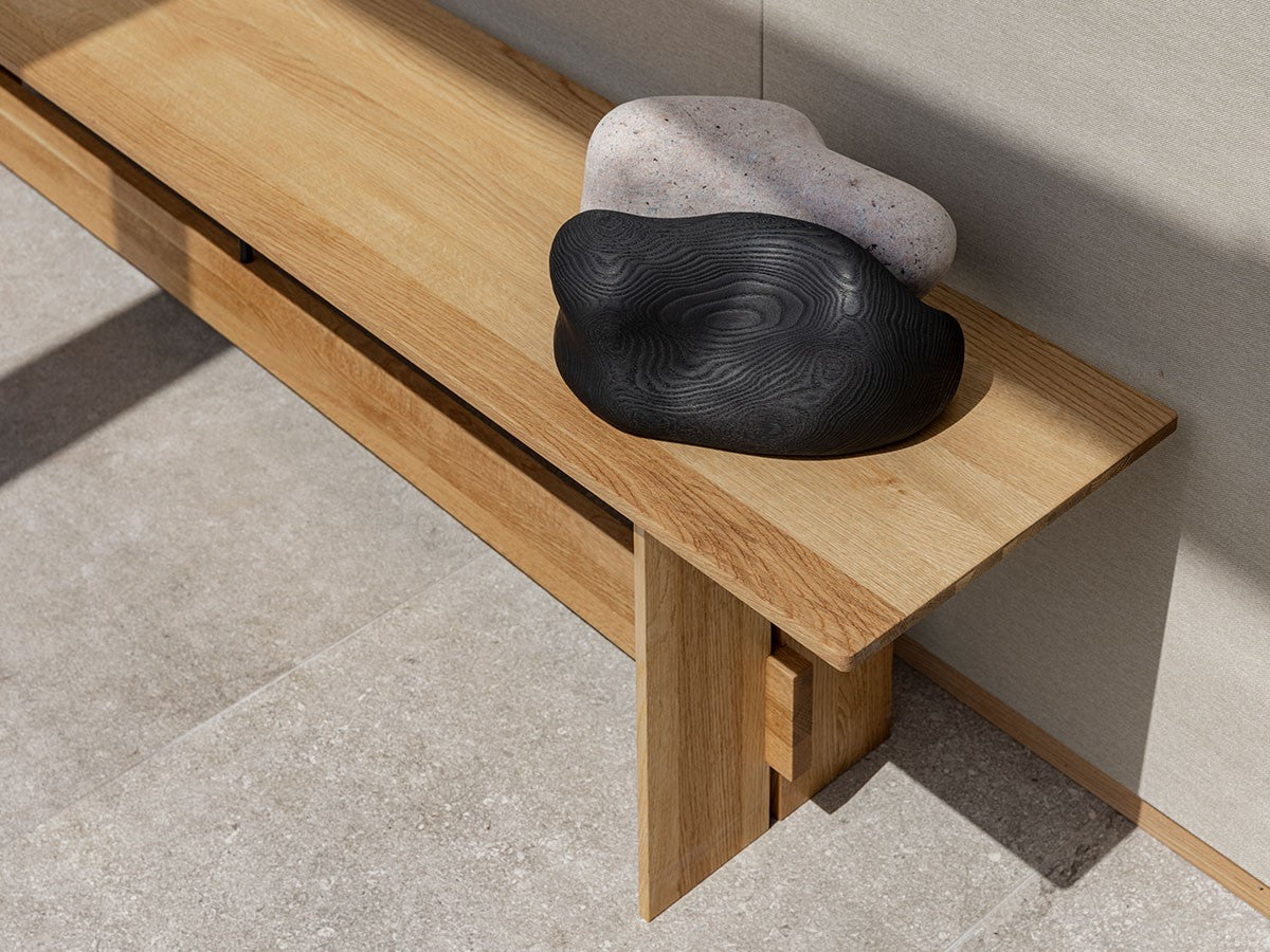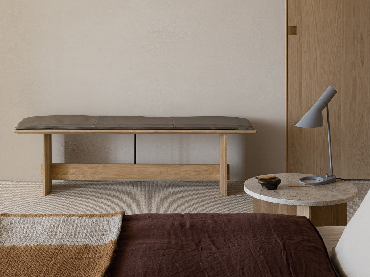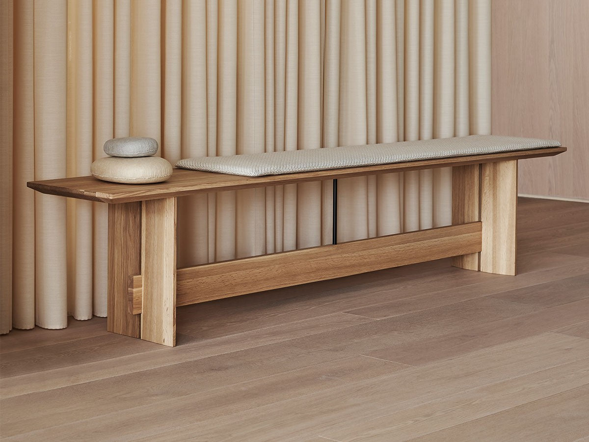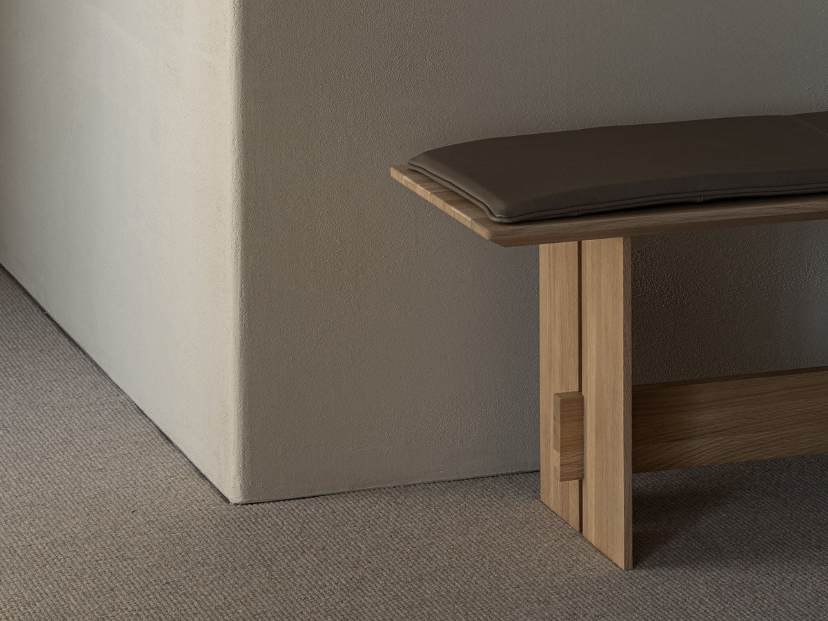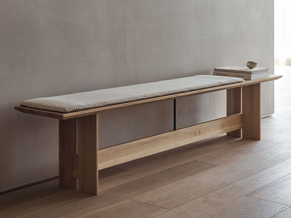閑静な住宅街にひっそりと佇む、1988年に建てられた高級マンションの一室のリノベーションプロジェクトのためにつくられたコレクション。このベンチはエントリースペースに設置することを想定し、ベンチとして座れる機能性だけでなく飾り台としても使える形です。座面と脚のエッジを薄く見せることで生まれる軽やかさと、角材をそのまま使ったような貫材の力強さを繊細なスチールのロッドで接続し、全体のハーモニーをつくり出しています。別売で専用クッションも展開しています。