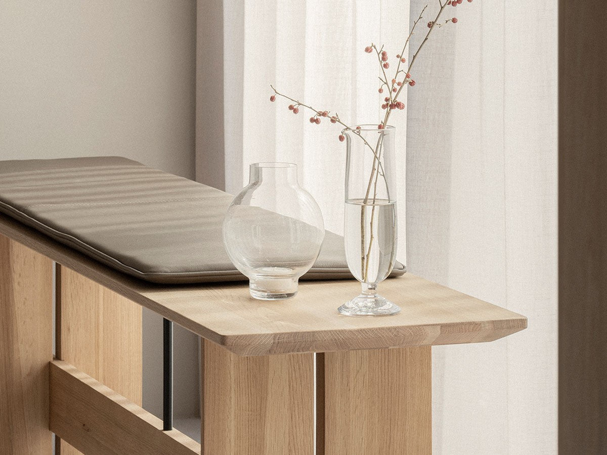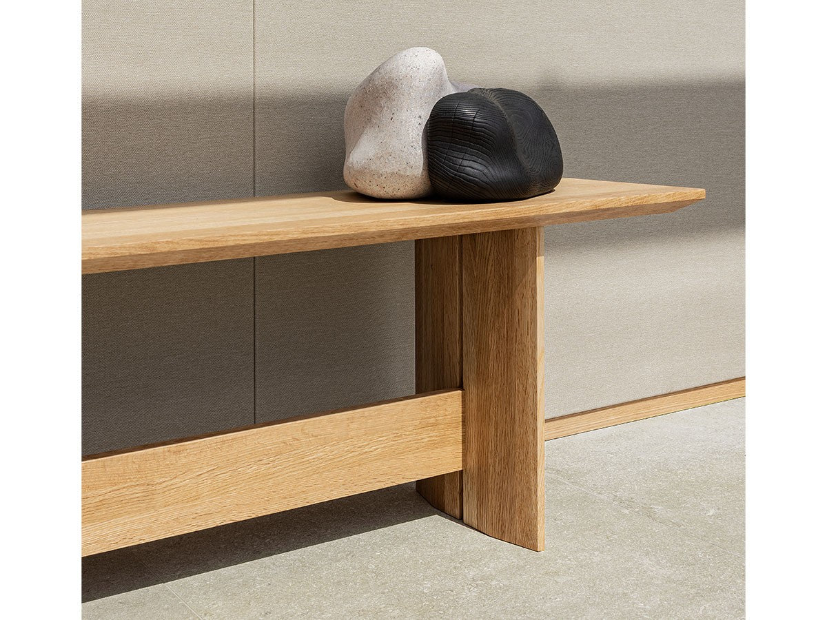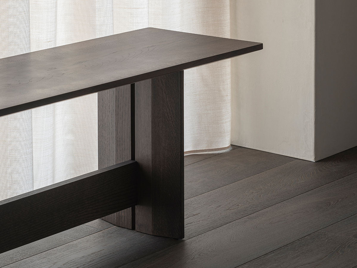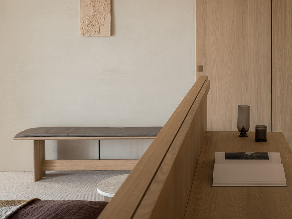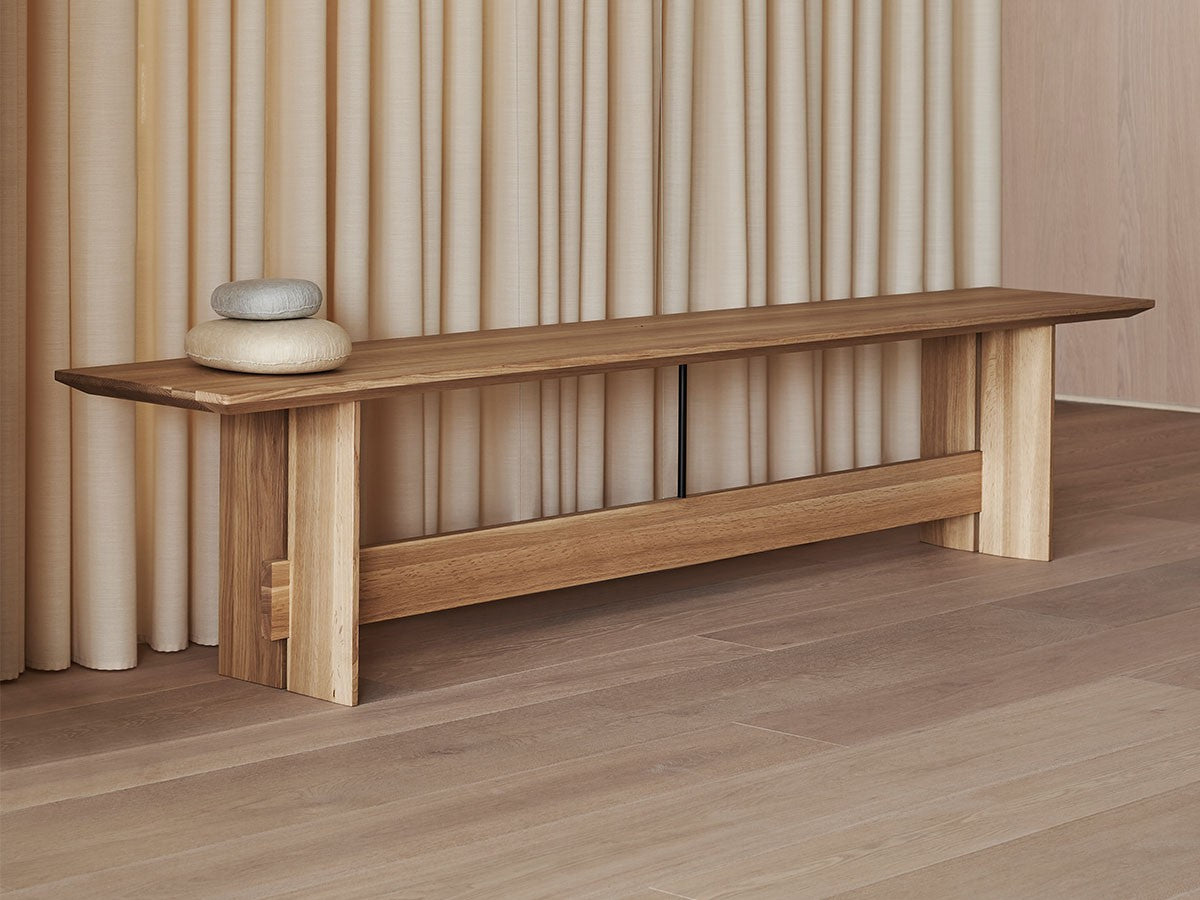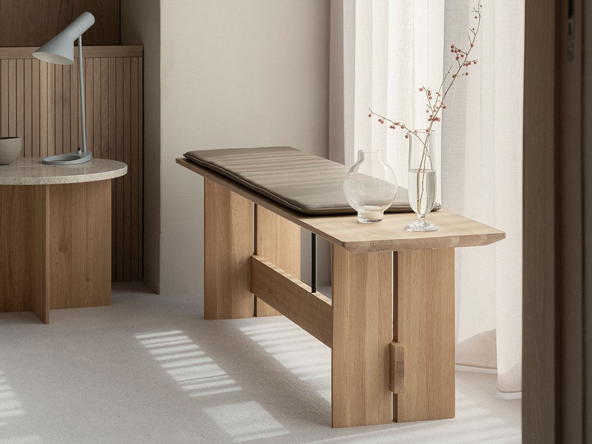 閑静な住宅街にひっそりと佇む、1988年に建てられた高級マンションの一室のリノベーションプロジェクトのためにつくられたコレクション。このベンチはエントリースペースに設置することを想定し、ベンチとして座れる機能性だけでなく飾り台としても使える形です。座面と脚のエッジを薄く見せることで生まれる軽やかさと、角材をそのまま使ったような貫材の力強さを繊細なスチールのロッドで接続し、全体のハーモニーをつくり出しています。別売で専用クッションも展開しています。