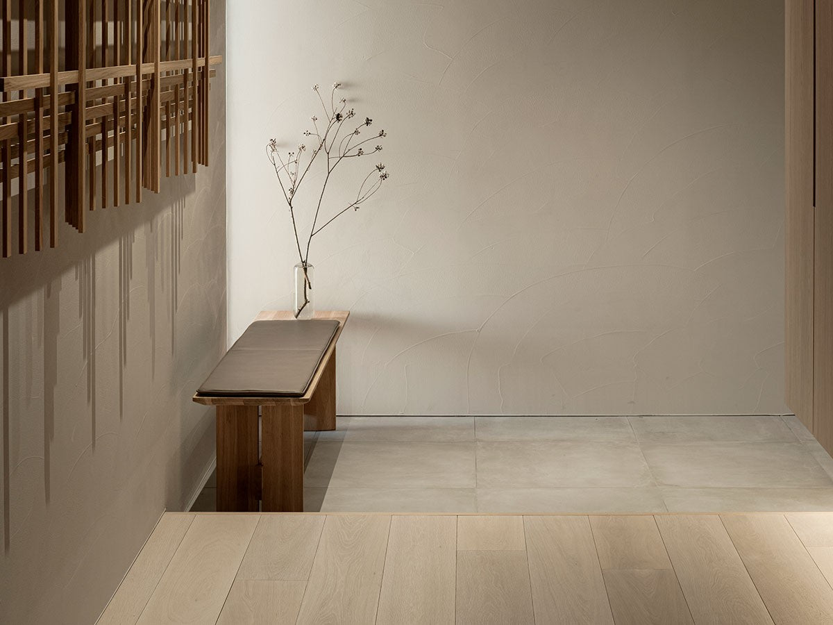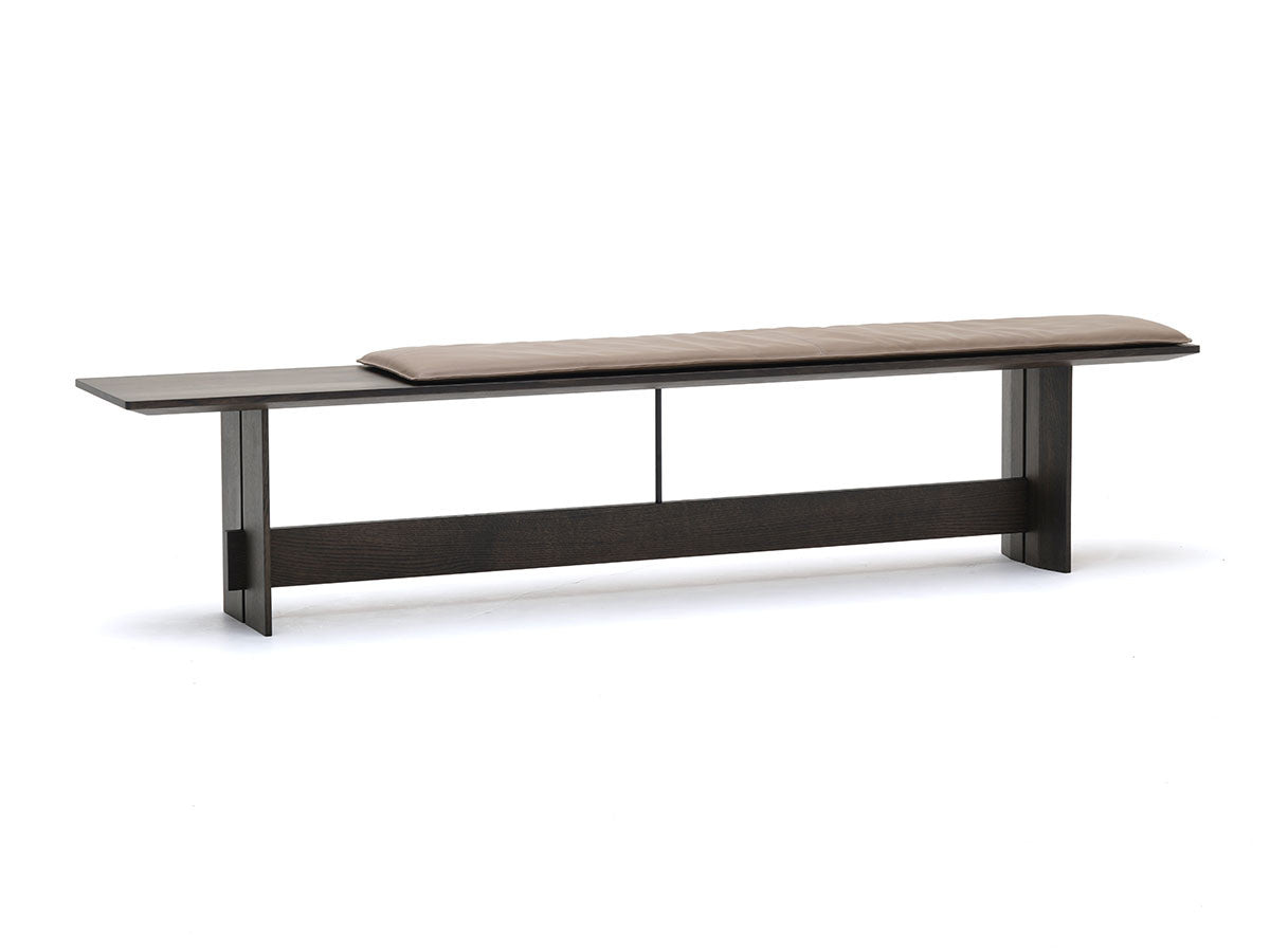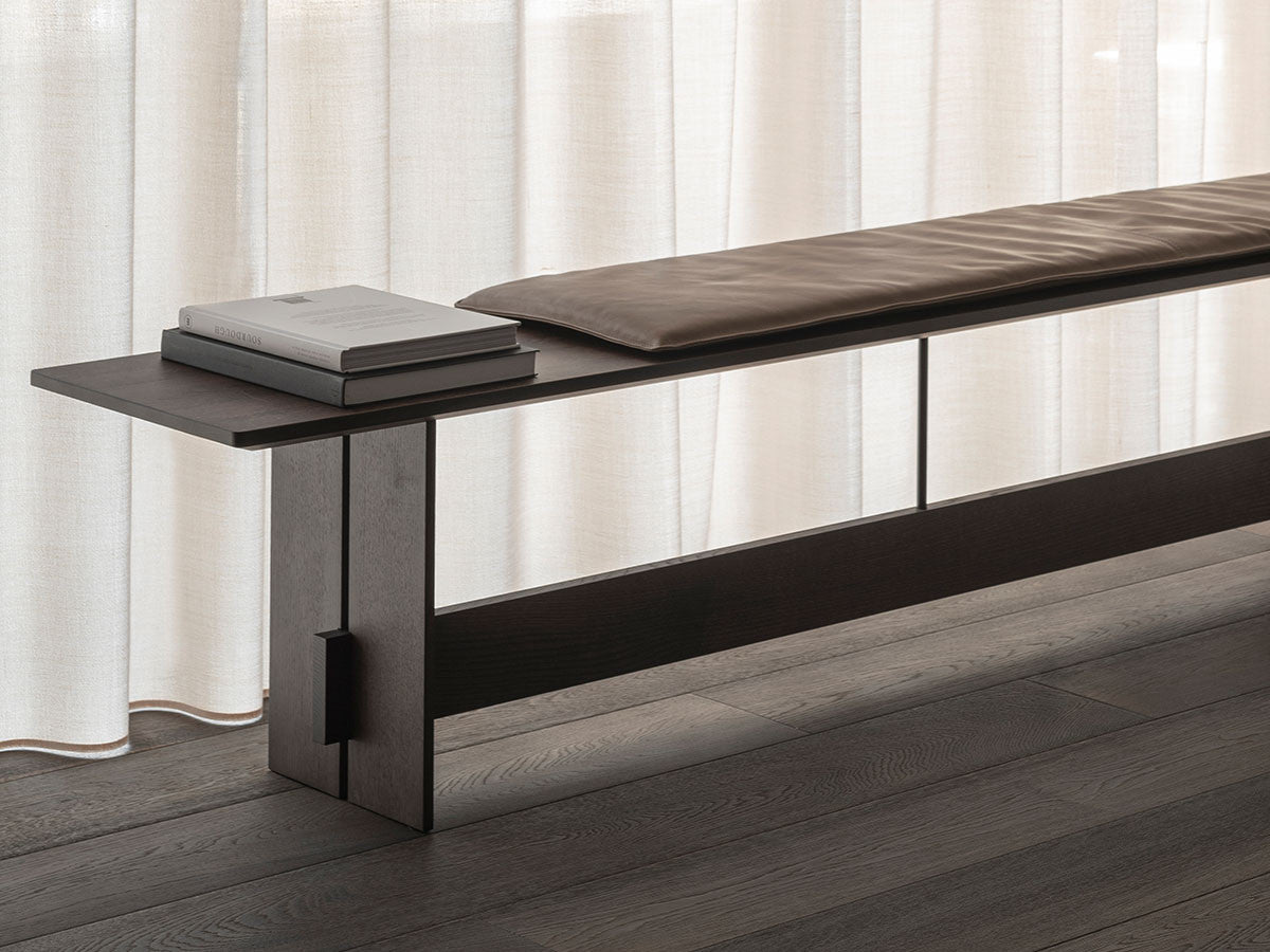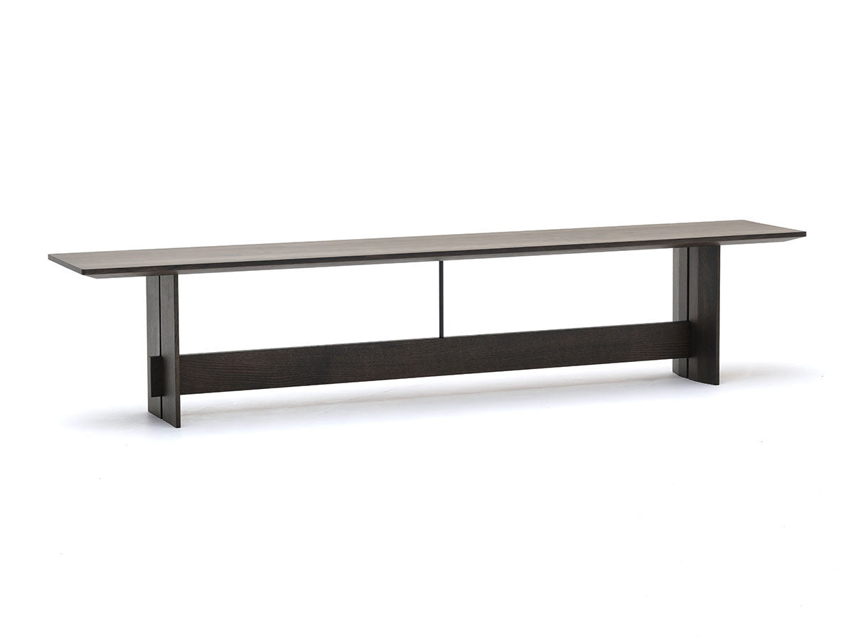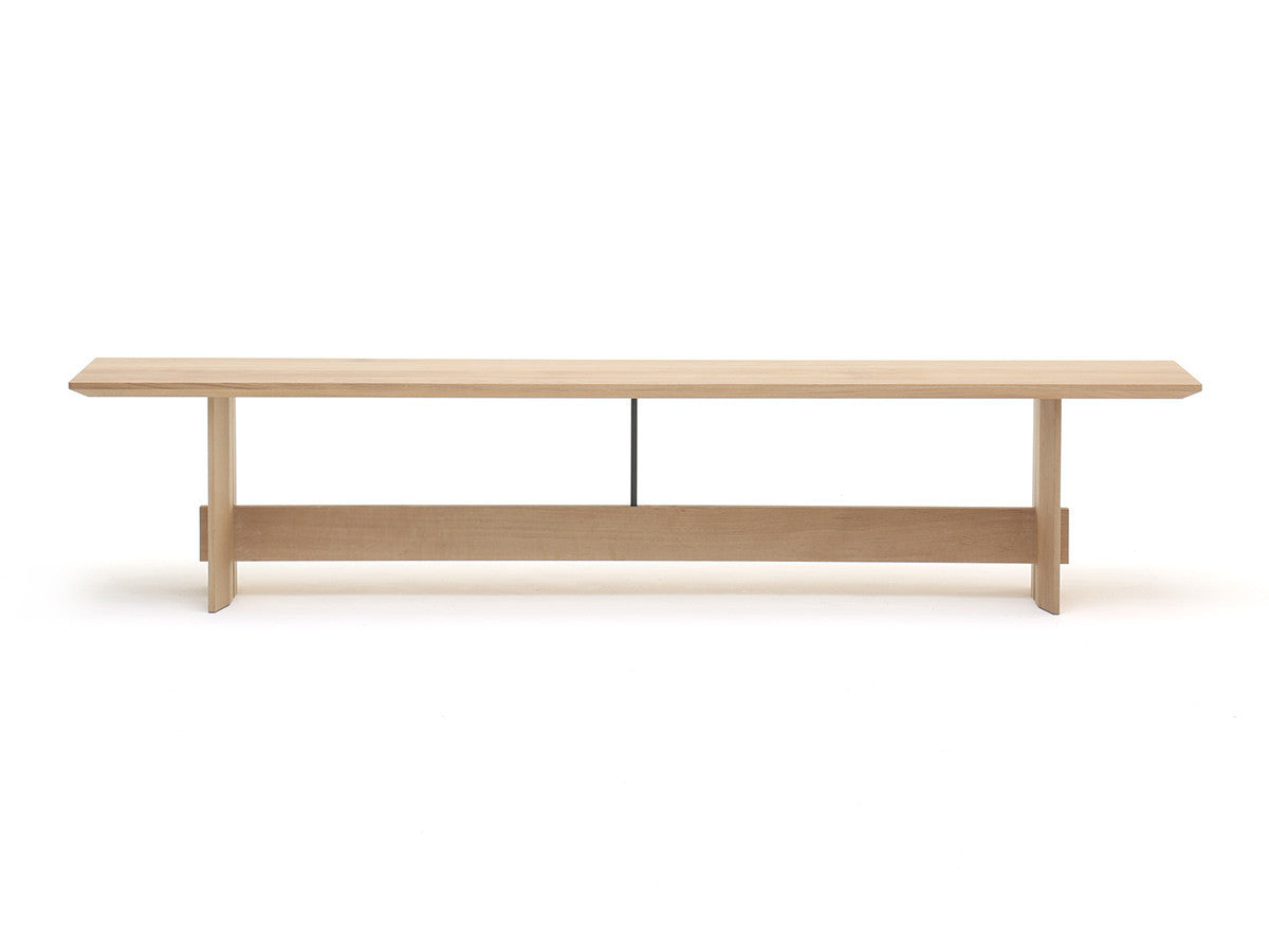 閑静な住宅街にひっそりと佇む、1988年に建てられた高級マンションの一室のリノベーションプロジェクトのためにつくられたコレクション。このベンチはエントリースペースに設置することを想定し、ベンチとして座れる機能性だけでなく飾り台としても使える形です。座面と脚のエッジを薄く見せることで生まれる軽やかさと、角材をそのまま使ったような貫材の力強さを繊細なスチールのロッドで接続し、全体のハーモニーをつくり出しています。別売で専用クッションも展開しています。