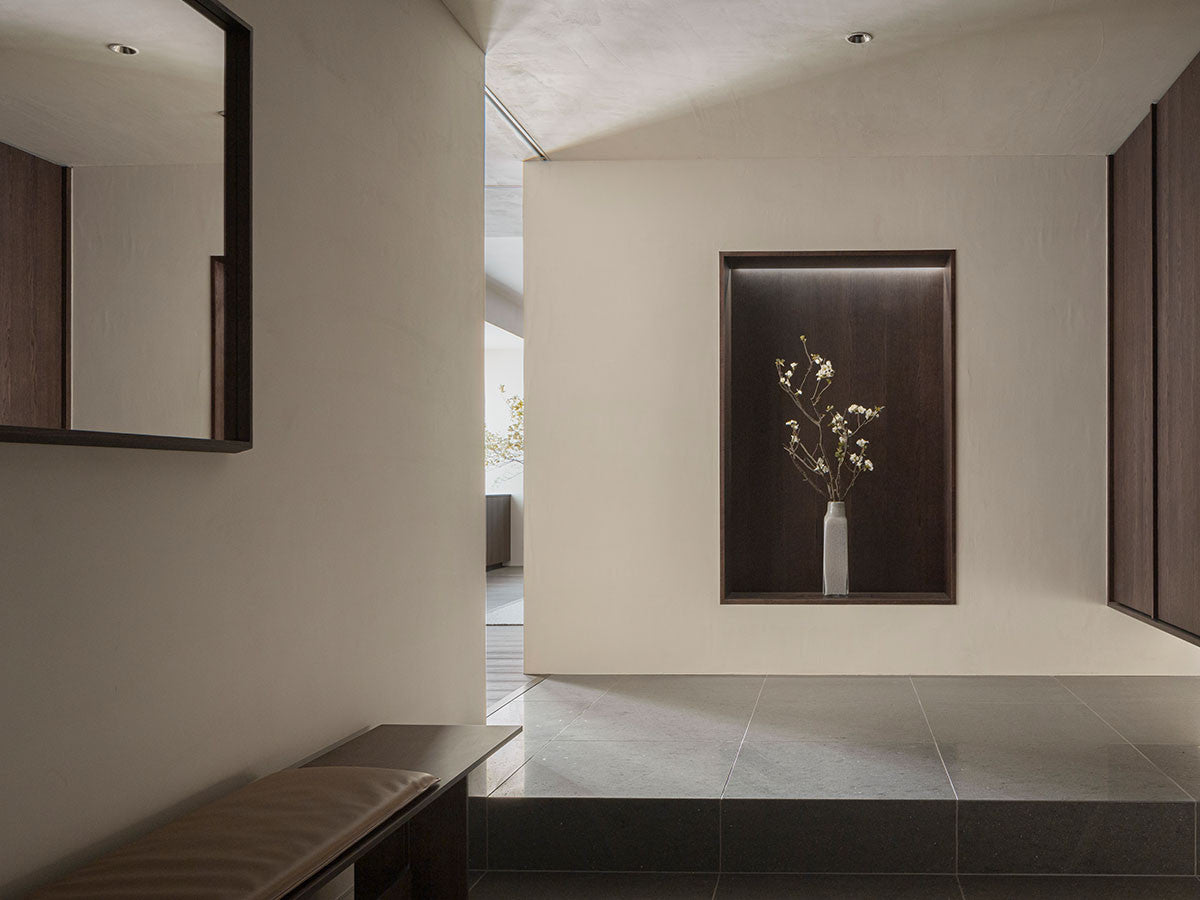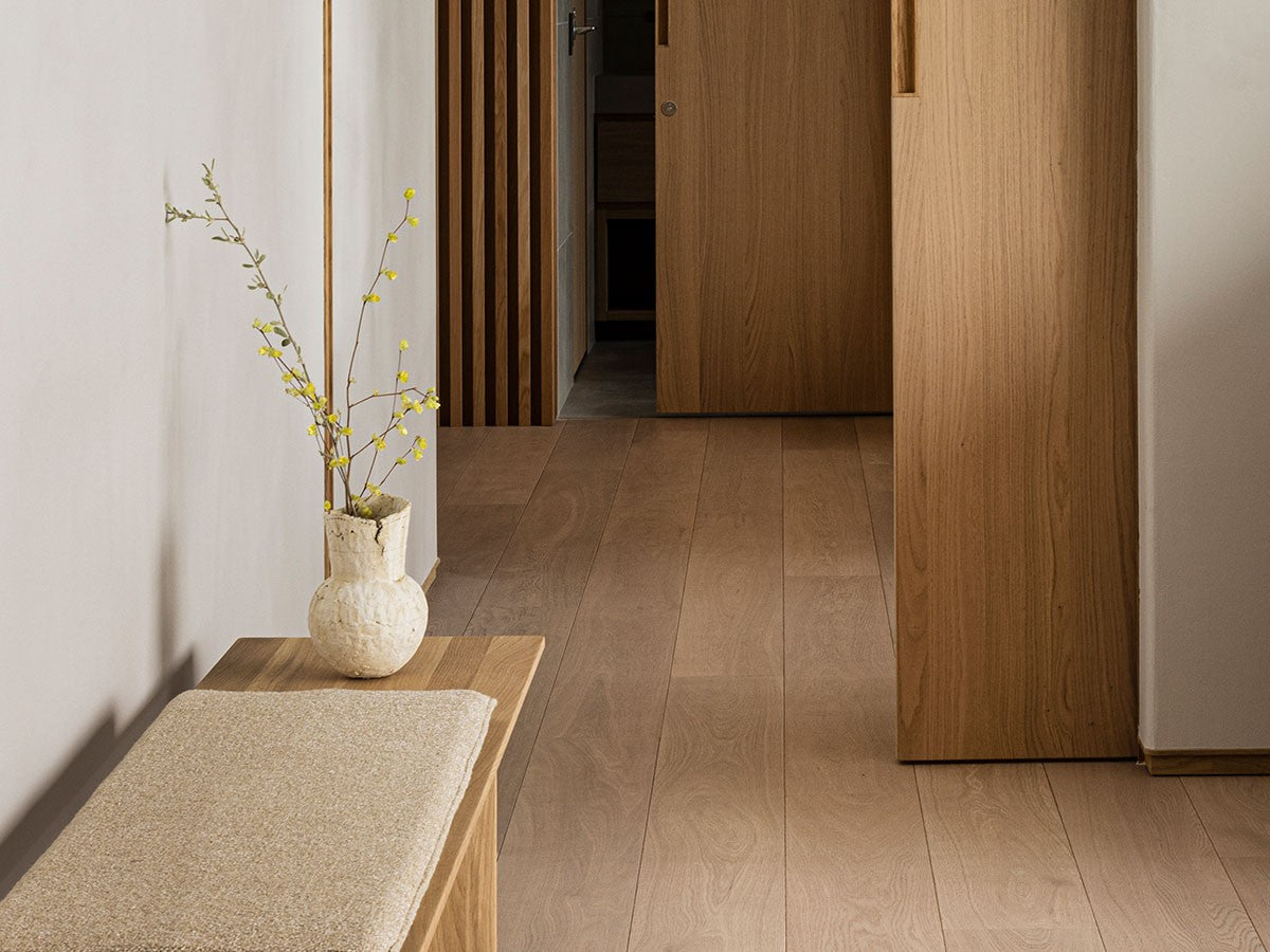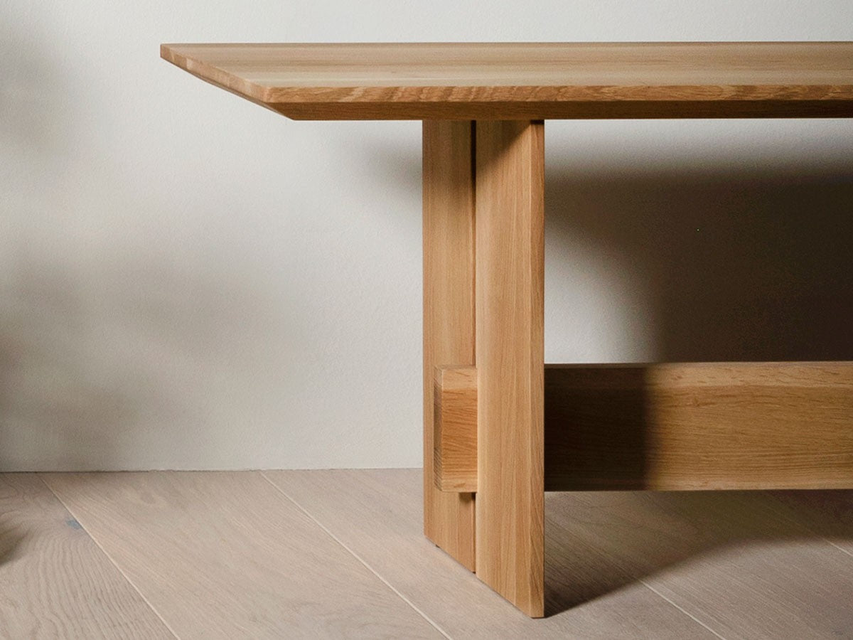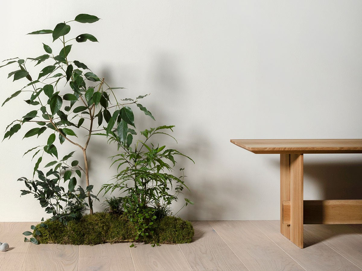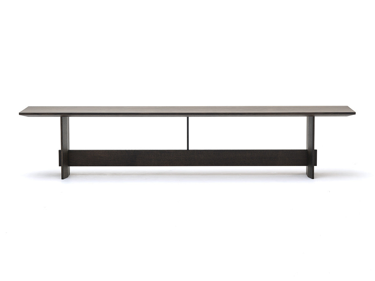 閑静な住宅街にひっそりと佇む、1988年に建てられた高級マンションの一室のリノベーションプロジェクトのためにつくられたコレクション。このベンチはエントリースペースに設置することを想定し、ベンチとして座れる機能性だけでなく飾り台としても使える形です。座面と脚のエッジを薄く見せることで生まれる軽やかさと、角材をそのまま使ったような貫材の力強さを繊細なスチールのロッドで接続し、全体のハーモニーをつくり出しています。別売で専用クッションも展開しています。