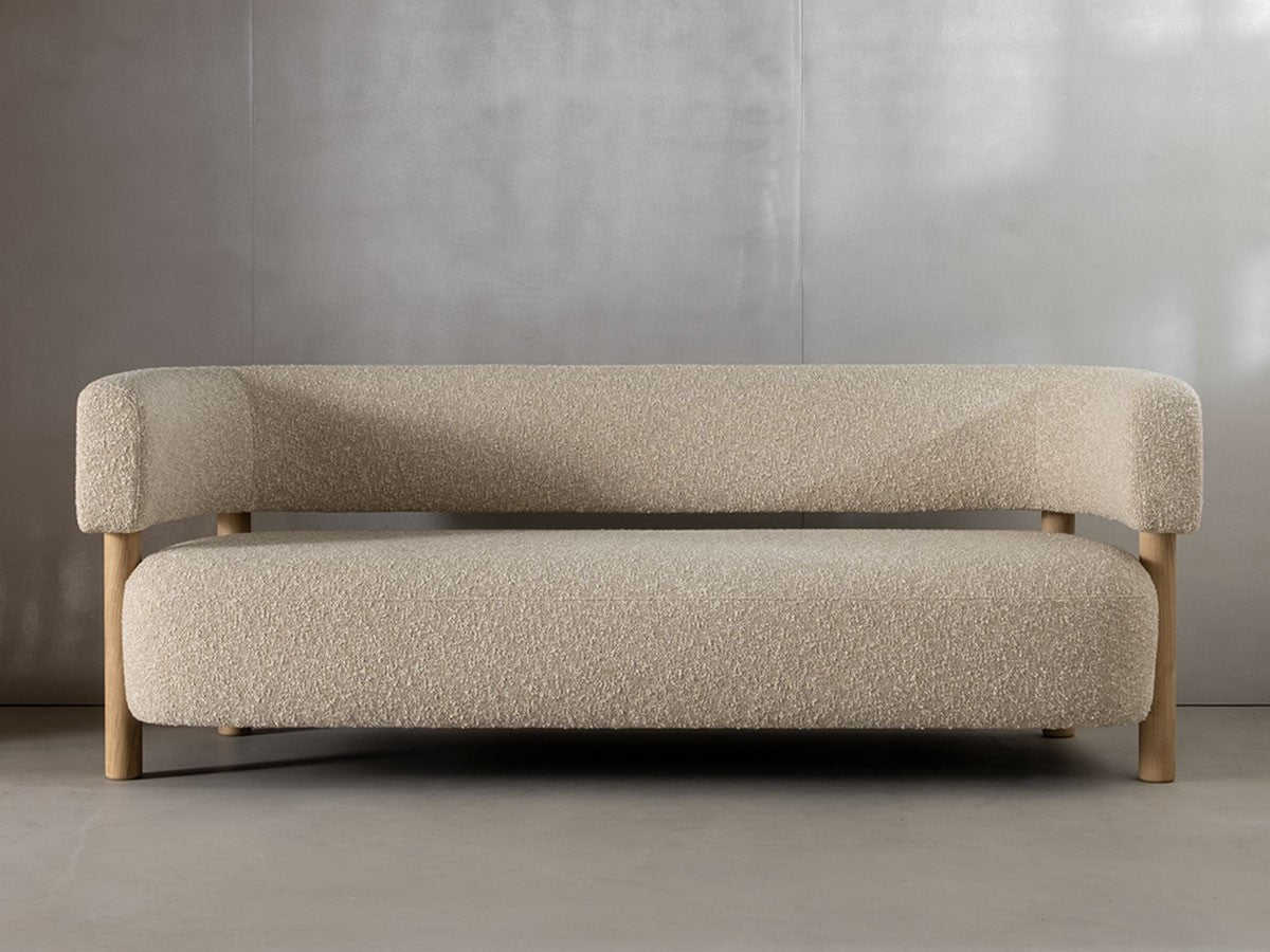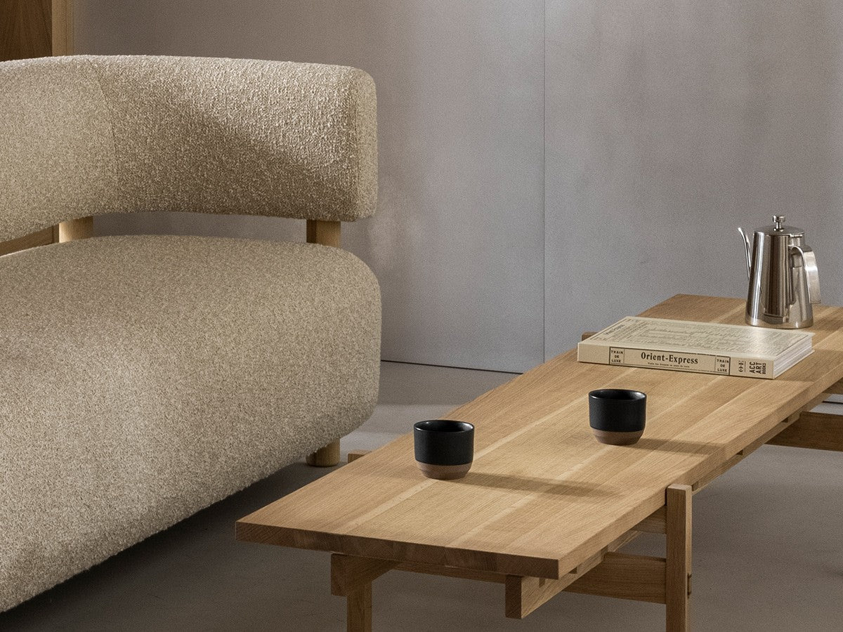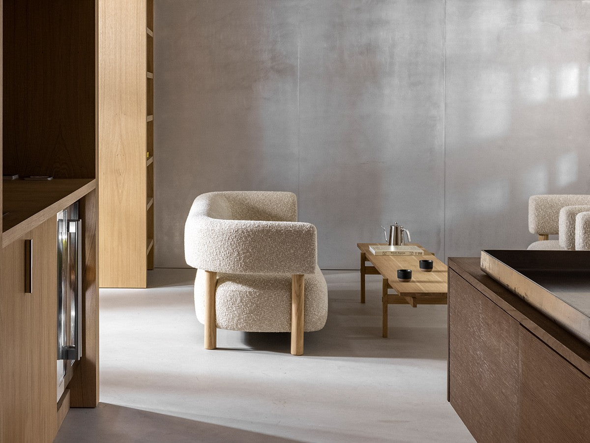 低めで柔らかく有機的な形状が、人の集まるにぎやかな部屋でも静謐で安心できる雰囲気をもたらすソファ。ロータイプのバックレストと有機的なシェイプが生み出すエレガントな快適さが、空間の大小や目的を選ばず、幅広いインテリアにマッチします。柔らかい張地のシートと無垢材で作られた円筒形の脚に支えられたバックレストの構成は、方向を制限せず、暖かい気配をもたらすデザインを実現しています。本コレクションは、コペンハーゲンの中心部に位置する、シューズブランド「ノータベネ」のフラッグシップストアに設えるため、ノーム・アーキテクツによってデザインされました。洗練された日本の家具製造技術が空間に入ることで、靴製造のプロセスの細やかさや精密さが強調されています。