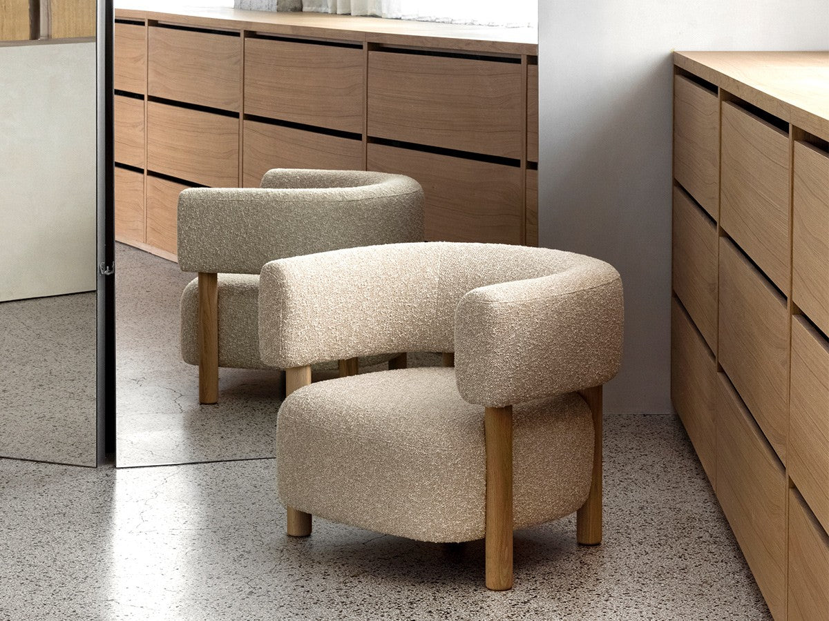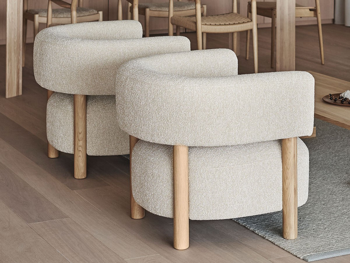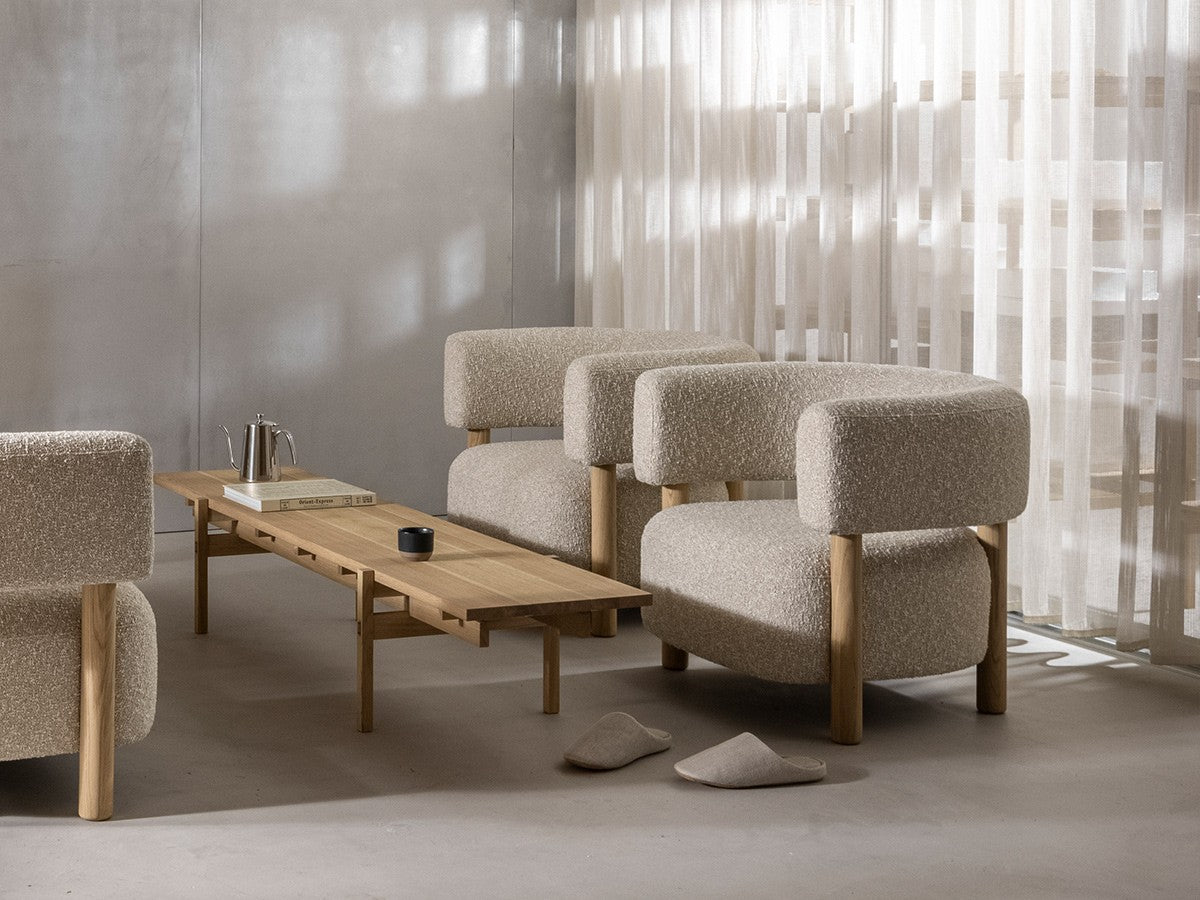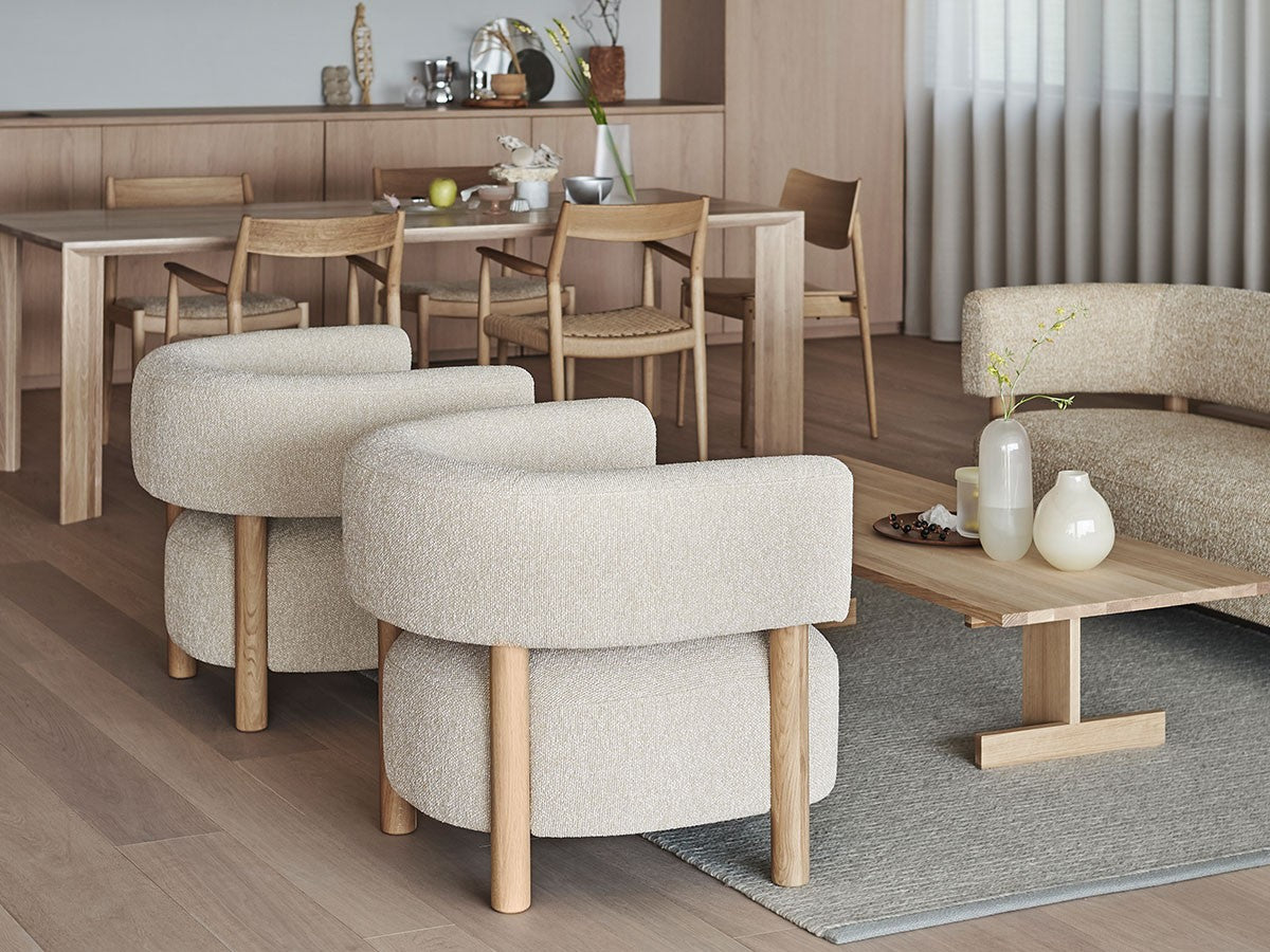 低めで柔らかく有機的な形状が、人の集まるにぎやかな部屋でも静謐で安心できる雰囲気をもたらすソファ。ロータイプのバックレストと有機的なシェイプが生み出すエレガントな快適さが、空間の大小や目的を選ばず、幅広いインテリアにマッチします。柔らかい張地のシートと無垢材で作られた円筒形の脚に支えられたバックレストの構成は、方向を制限せず、暖かい気配をもたらすデザインを実現しています。本コレクションは、コペンハーゲンの中心部に位置する、シューズブランド「ノータベネ」のフラッグシップストアに設えるため、ノーム・アーキテクツによってデザインされました。洗練された日本の家具製造技術が空間に入ることで、靴製造のプロセスの細やかさや精密さが強調されています。