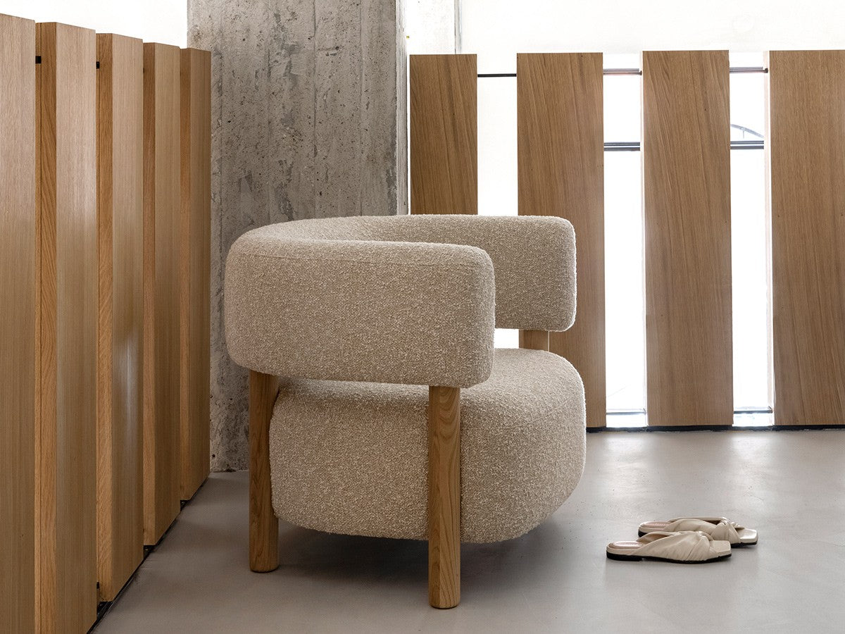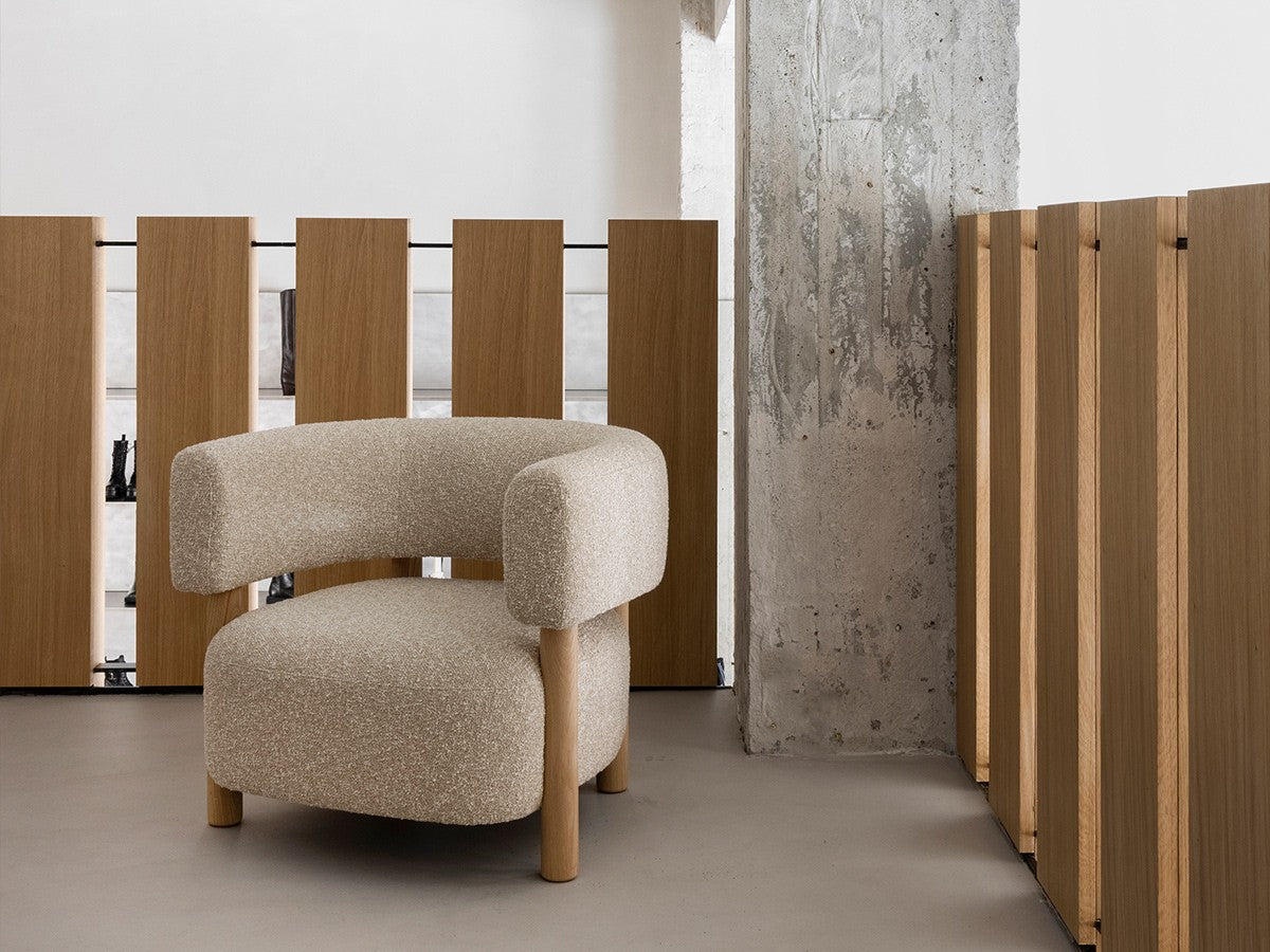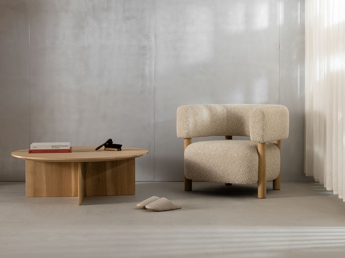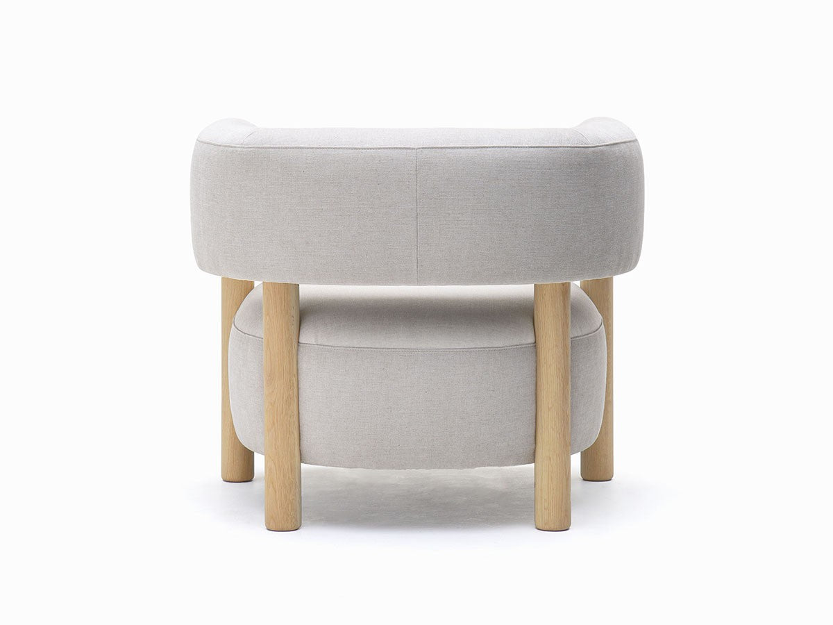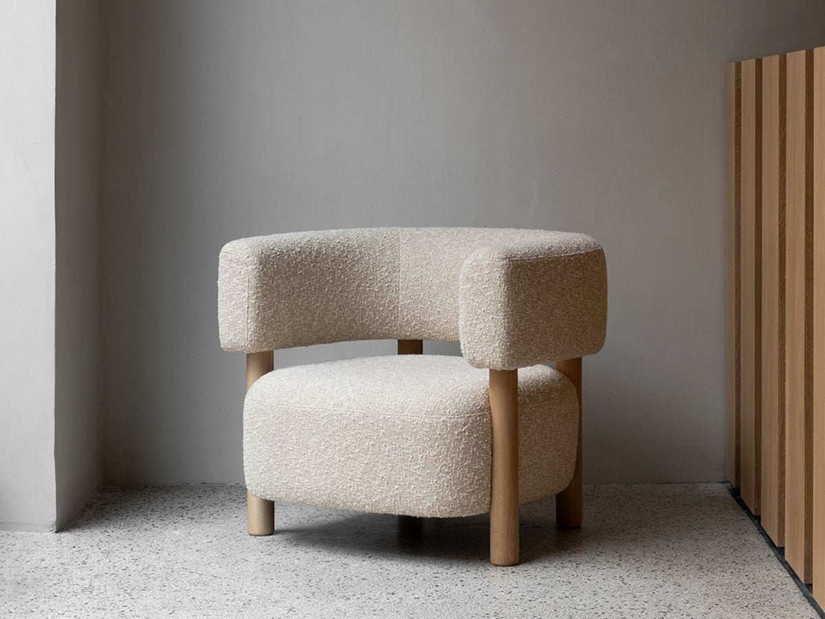 低めで柔らかく有機的な形状が、人の集まるにぎやかな部屋でも静謐で安心できる雰囲気をもたらすソファ。ロータイプのバックレストと有機的なシェイプが生み出すエレガントな快適さが、空間の大小や目的を選ばず、幅広いインテリアにマッチします。柔らかい張地のシートと無垢材で作られた円筒形の脚に支えられたバックレストの構成は、方向を制限せず、暖かい気配をもたらすデザインを実現しています。本コレクションは、コペンハーゲンの中心部に位置する、シューズブランド「ノータベネ」のフラッグシップストアに設えるため、ノーム・アーキテクツによってデザインされました。洗練された日本の家具製造技術が空間に入ることで、靴製造のプロセスの細やかさや精密さが強調されています。