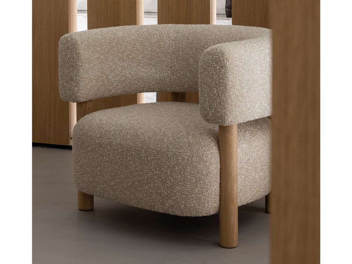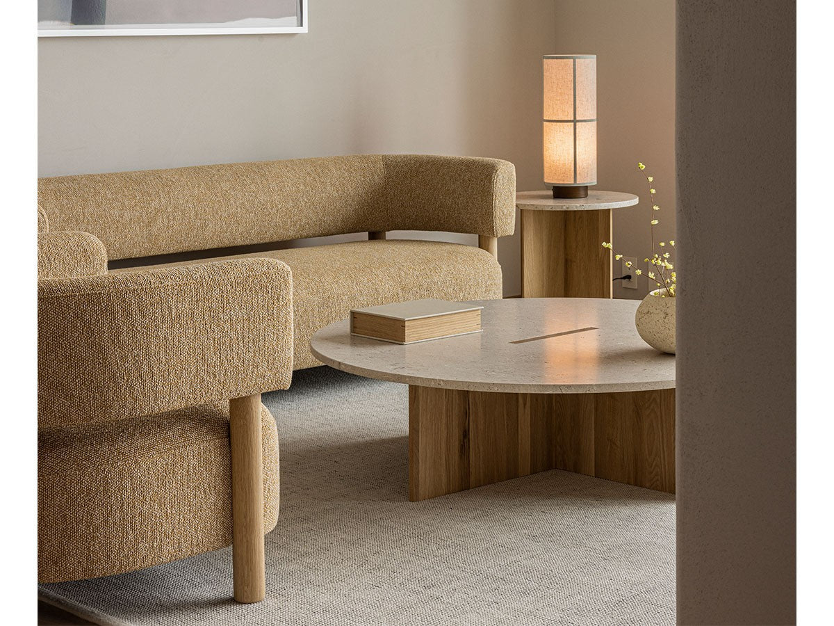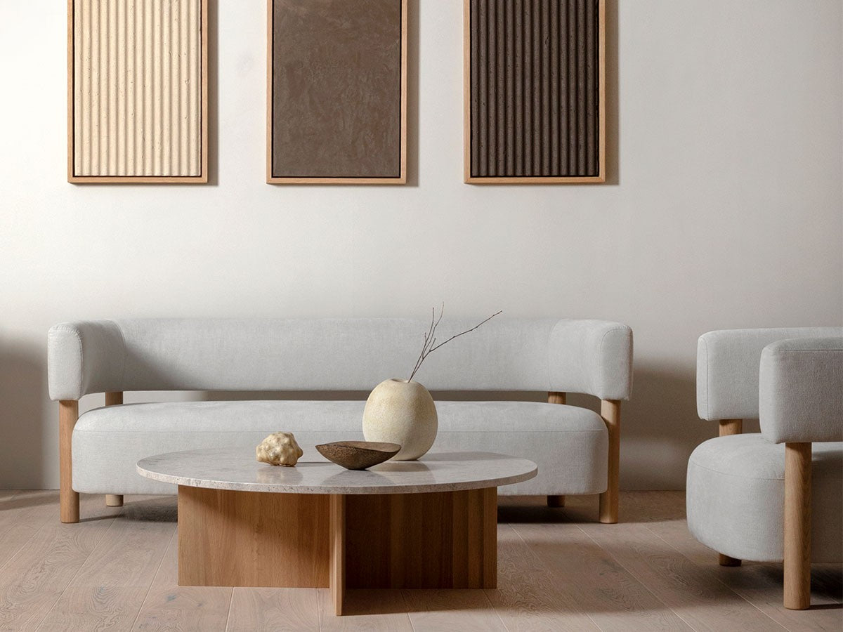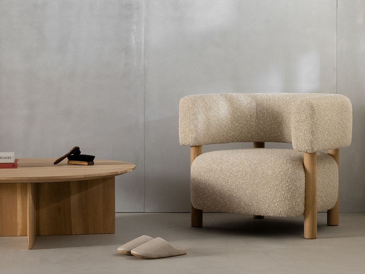 低めで柔らかく有機的な形状が、人の集まるにぎやかな部屋でも静謐で安心できる雰囲気をもたらすソファ。ロータイプのバックレストと有機的なシェイプが生み出すエレガントな快適さが、空間の大小や目的を選ばず、幅広いインテリアにマッチします。柔らかい張地のシートと無垢材で作られた円筒形の脚に支えられたバックレストの構成は、方向を制限せず、暖かい気配をもたらすデザインを実現しています。本コレクションは、コペンハーゲンの中心部に位置する、シューズブランド「ノータベネ」のフラッグシップストアに設えるため、ノーム・アーキテクツによってデザインされました。洗練された日本の家具製造技術が空間に入ることで、靴製造のプロセスの細やかさや精密さが強調されています。