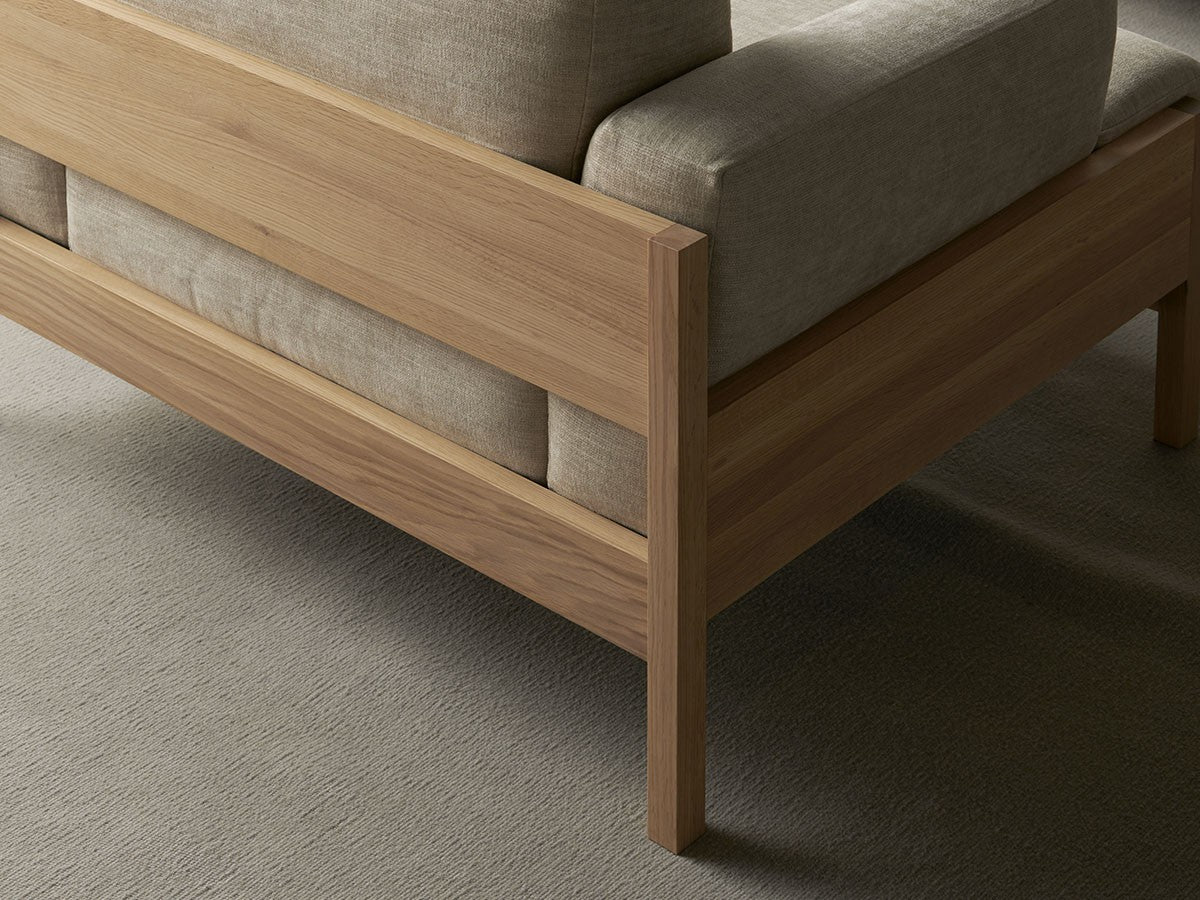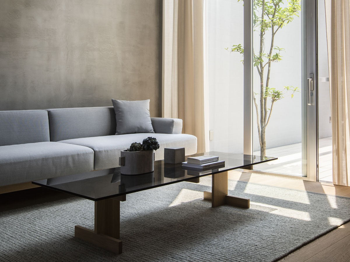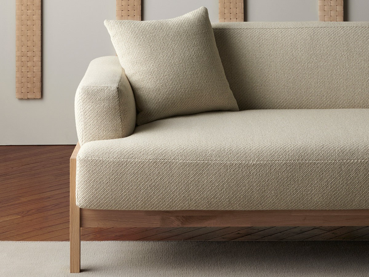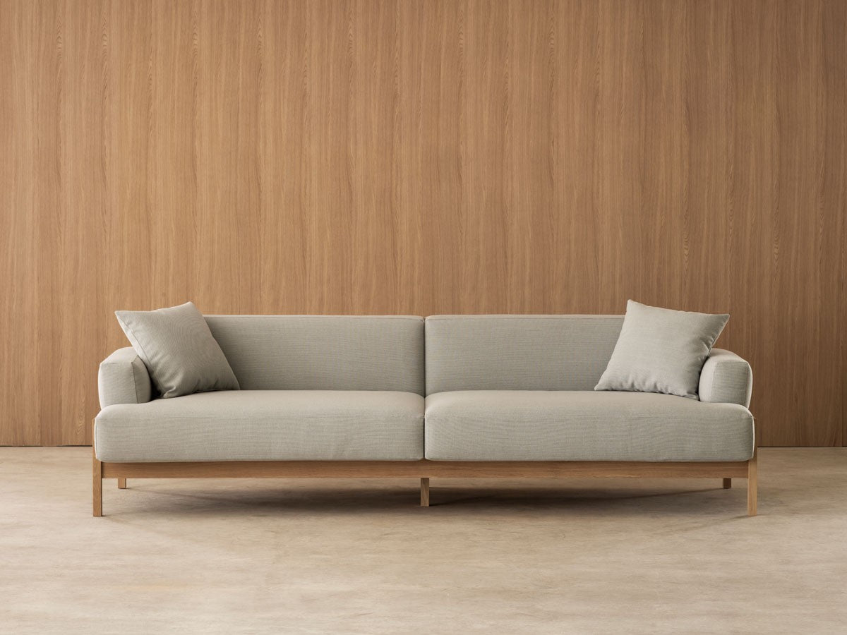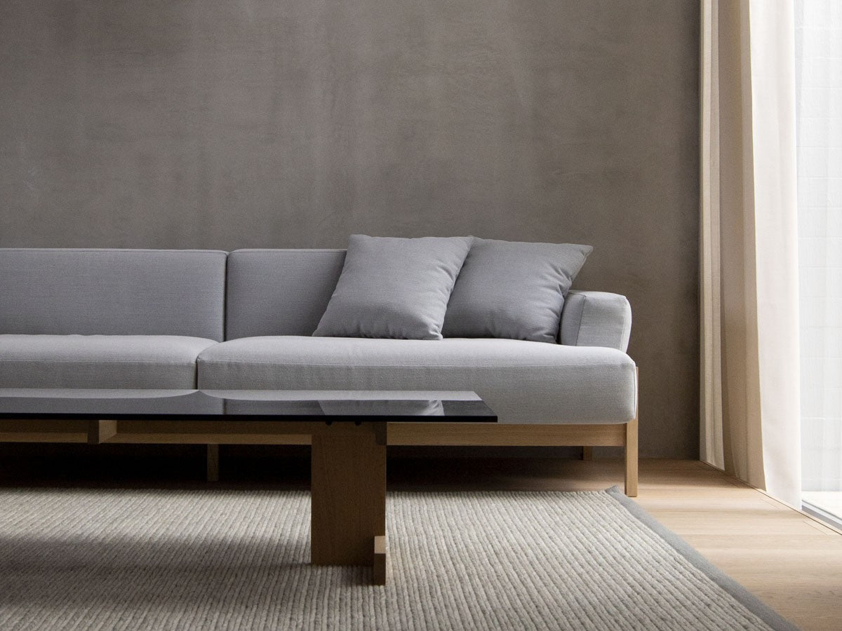 日本建築に見られる水平と垂直のラインをデザインに活かしたロー&ワイドソファ。テーブルと同じ構造をソファにも活用し、彫刻的な美しさとリラックスした雰囲気を持たせています。ハイテクな木工技術と職人の手仕事との融合が水平ラインと垂直ラインの美をより際立たせます。座面クッション下の木桟は積層巾剥集成材を採用し、縦継ぎ目のない美しい素材使いです。高さを空間にあわせて低めに設定しているため、圧迫感を感じさせません。座面は、着座時の感触にもこだわったウレタンフォーム・綿の6層構造。メンテナンスが可能なカバーリング仕様です。アームレストは枕としても使用でき、快適なデイベッドとしても利用できる多機能性を誇ります。