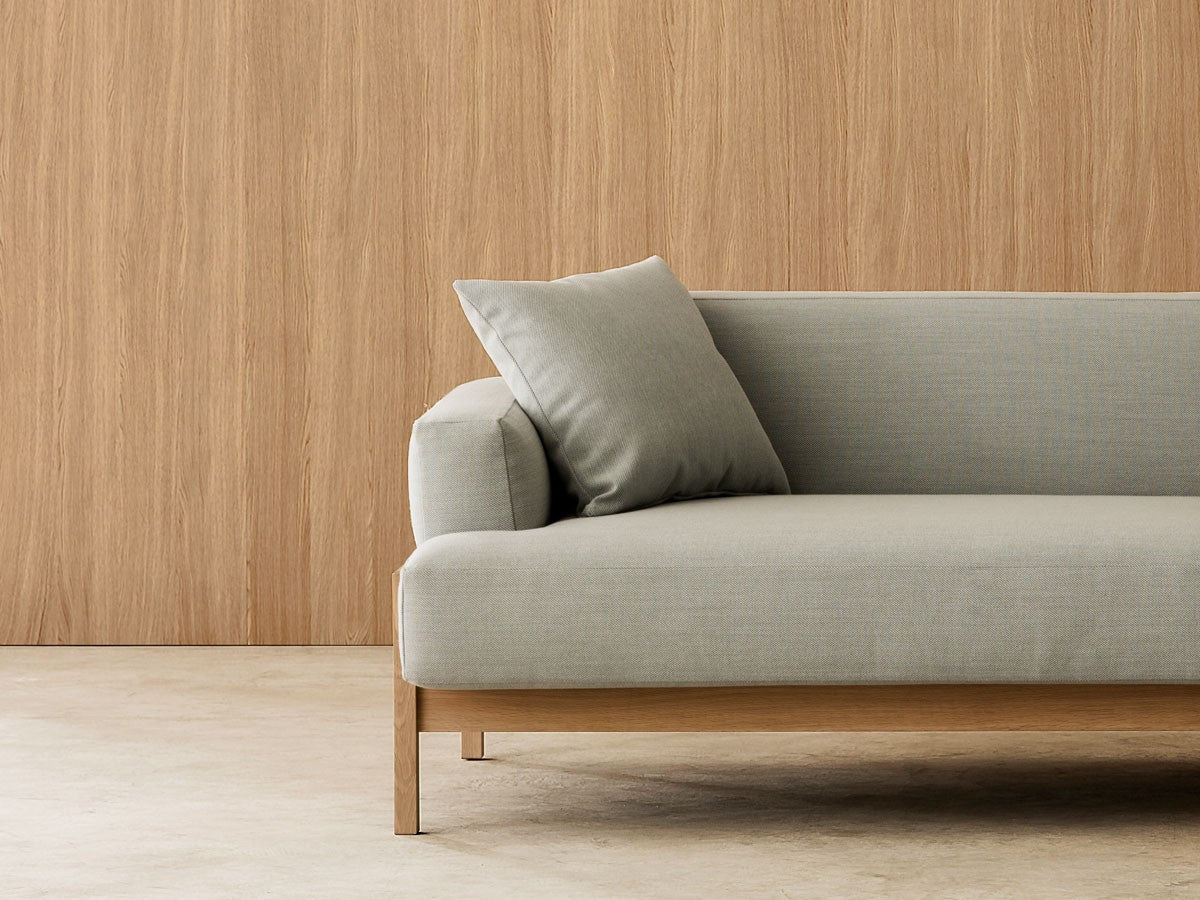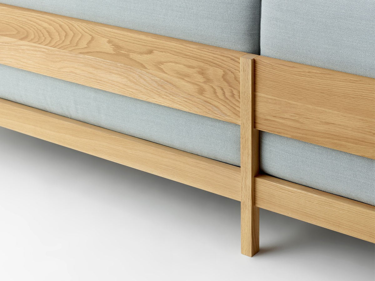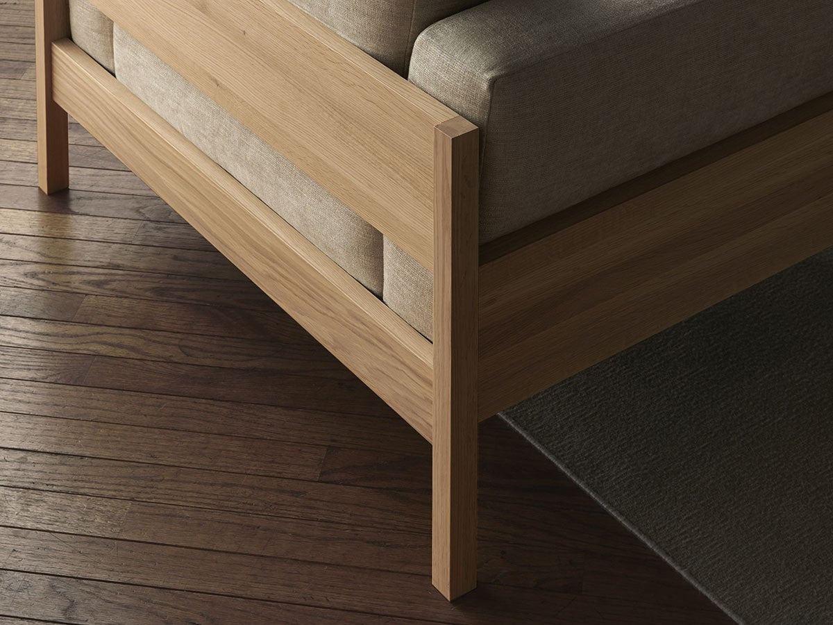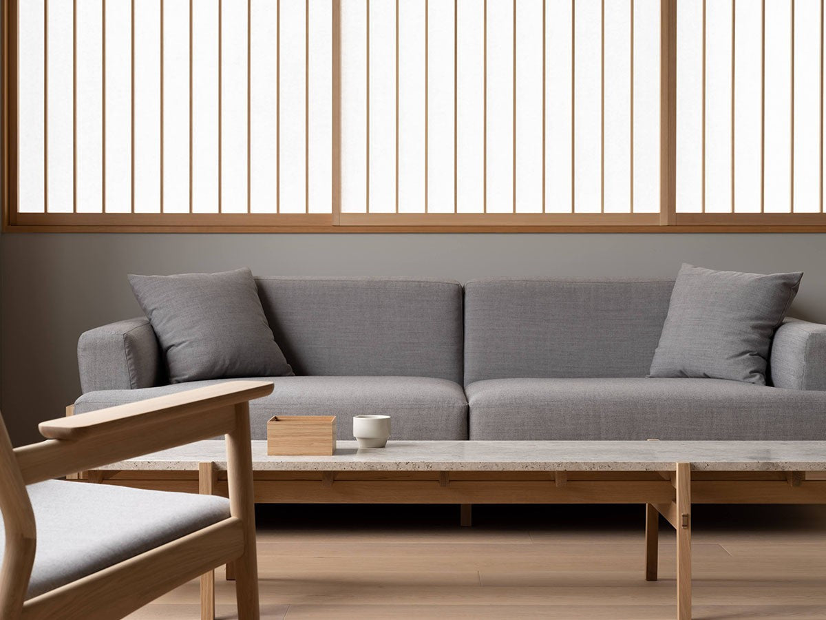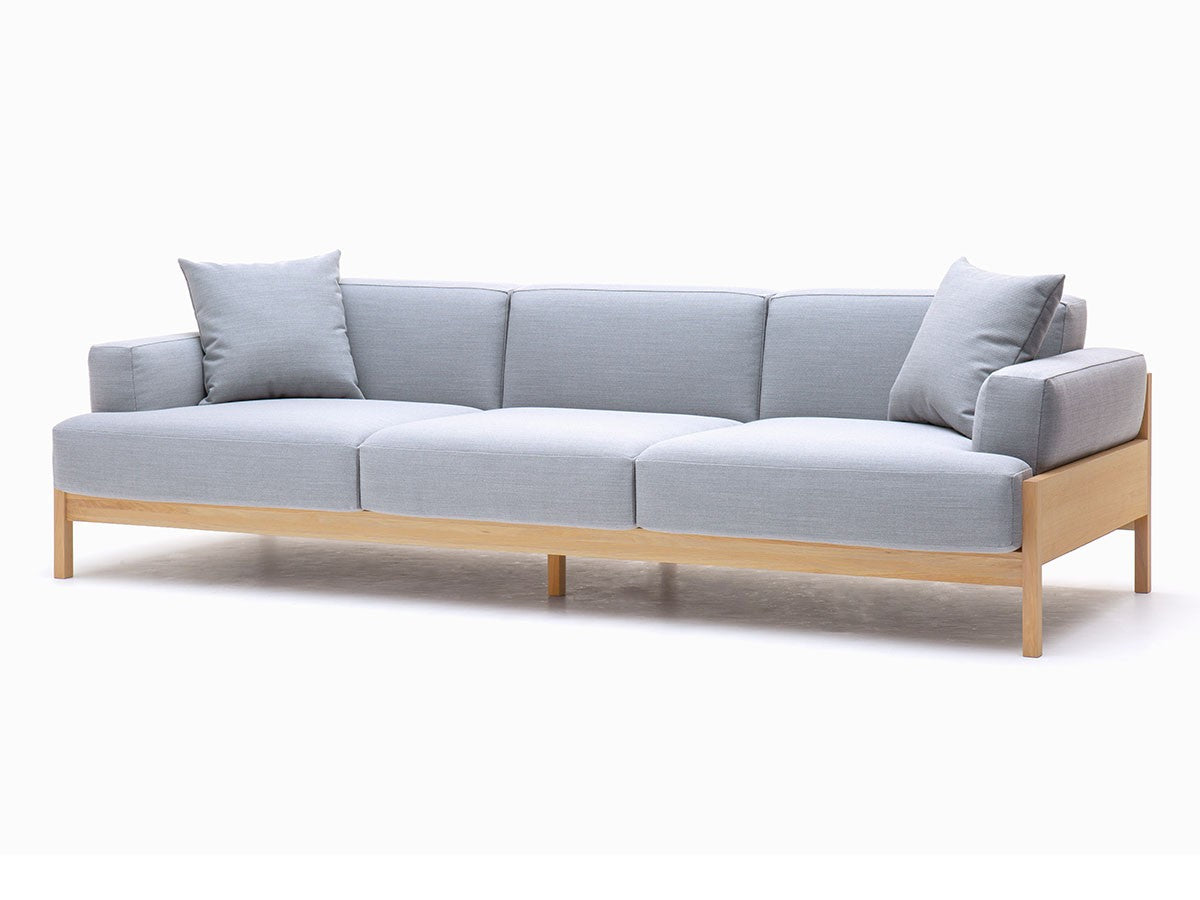 日本建築に見られる水平と垂直のラインをデザインに活かしたロー&ワイドソファ。テーブルと同じ構造をソファにも活用し、彫刻的な美しさとリラックスした雰囲気を持たせています。ハイテクな木工技術と職人の手仕事との融合が水平ラインと垂直ラインの美をより際立たせます。座面クッション下の木桟は積層巾剥集成材を採用し、縦継ぎ目のない美しい素材使いです。高さを空間にあわせて低めに設定しているため、圧迫感を感じさせません。座面は、着座時の感触にもこだわったウレタンフォーム・綿の6層構造。メンテナンスが可能なカバーリング仕様です。アームレストは枕としても使用でき、快適なデイベッドとしても利用できる多機能性を誇ります。